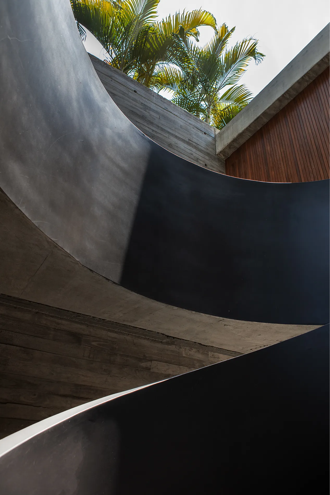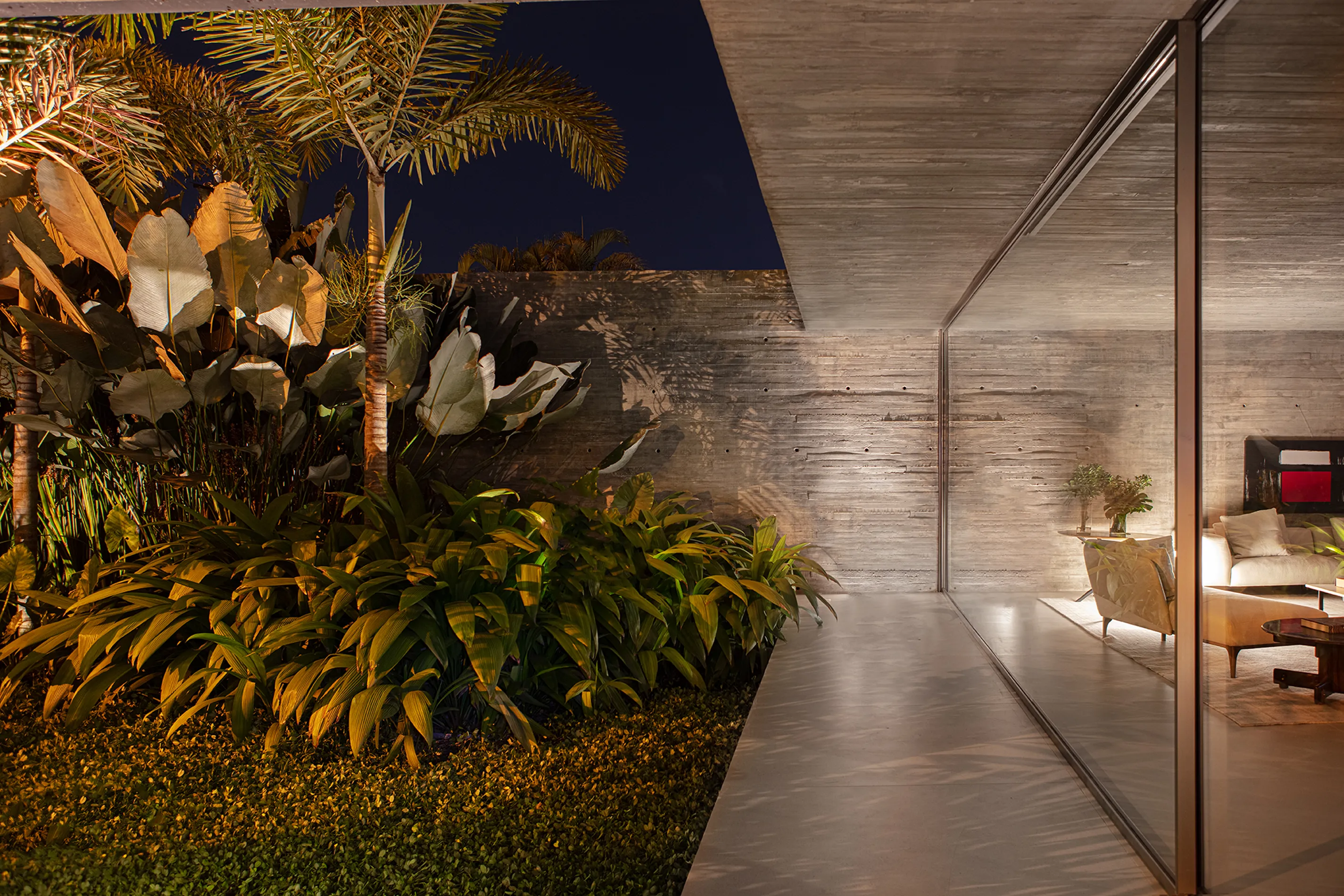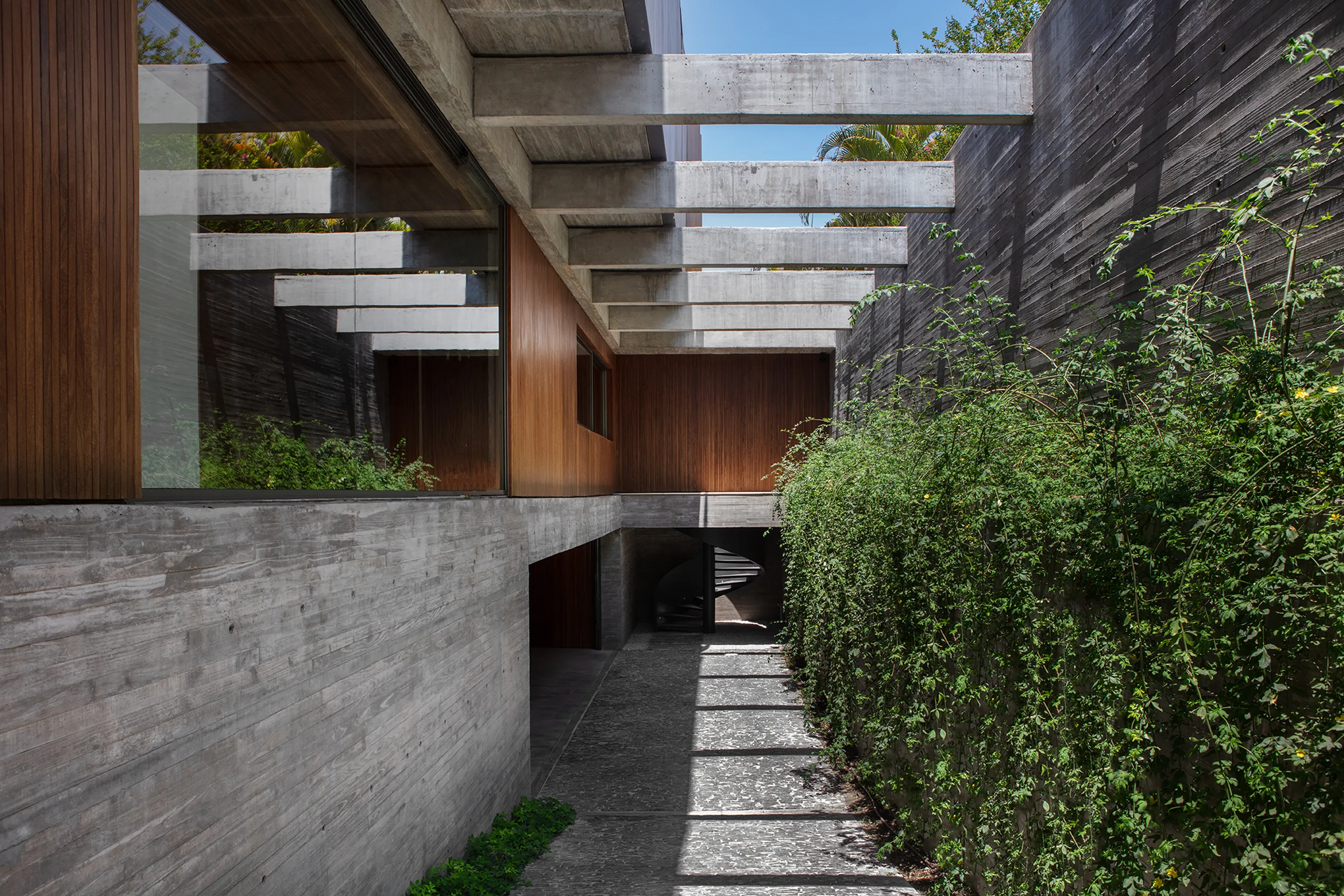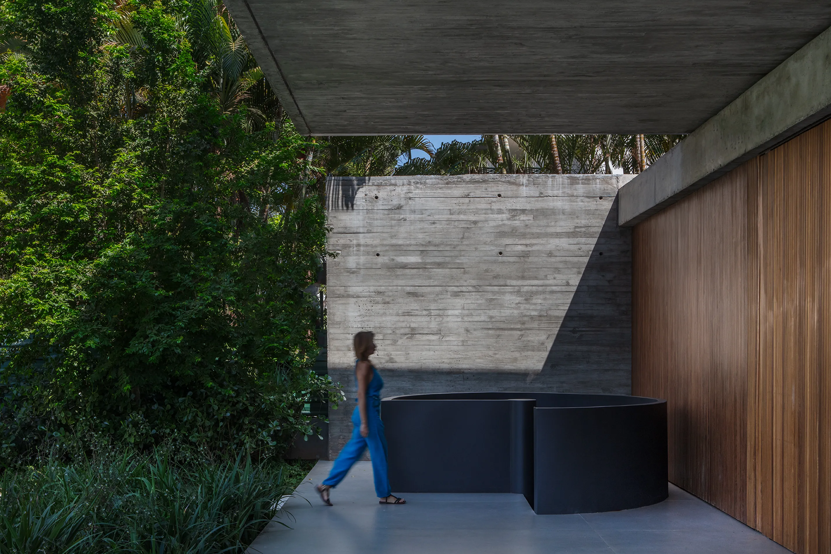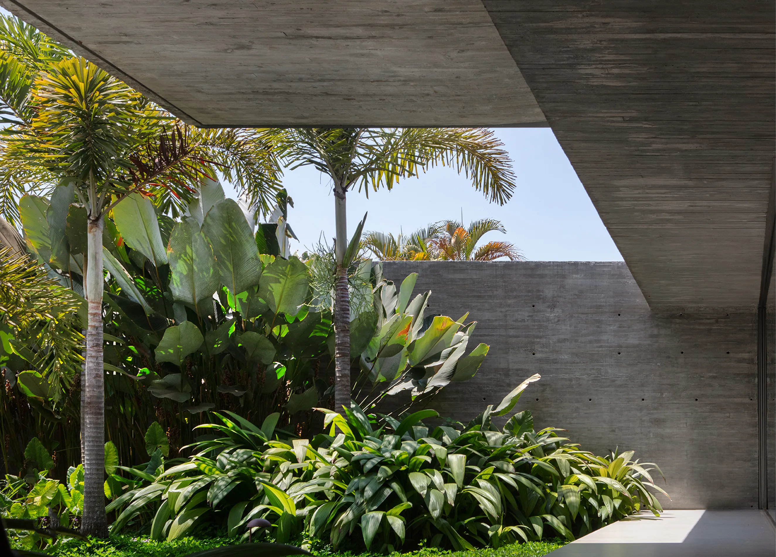 Distribuída em três pavimentos e implantada em um terreno de meio, com densa vegetação no entorno, a Casa ADA propõe uma convivência entre arquitetura brutalista e paisagem tropical.