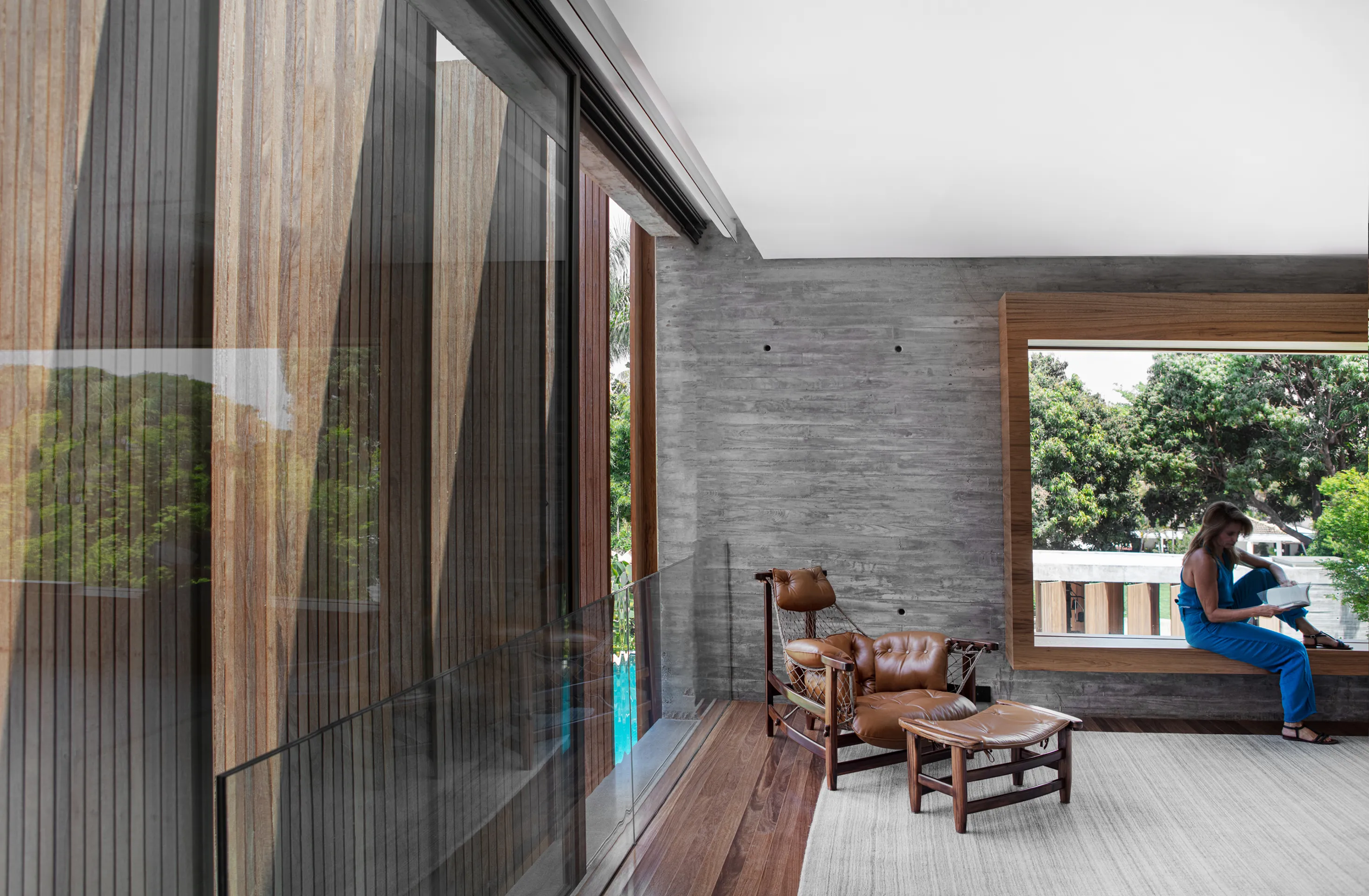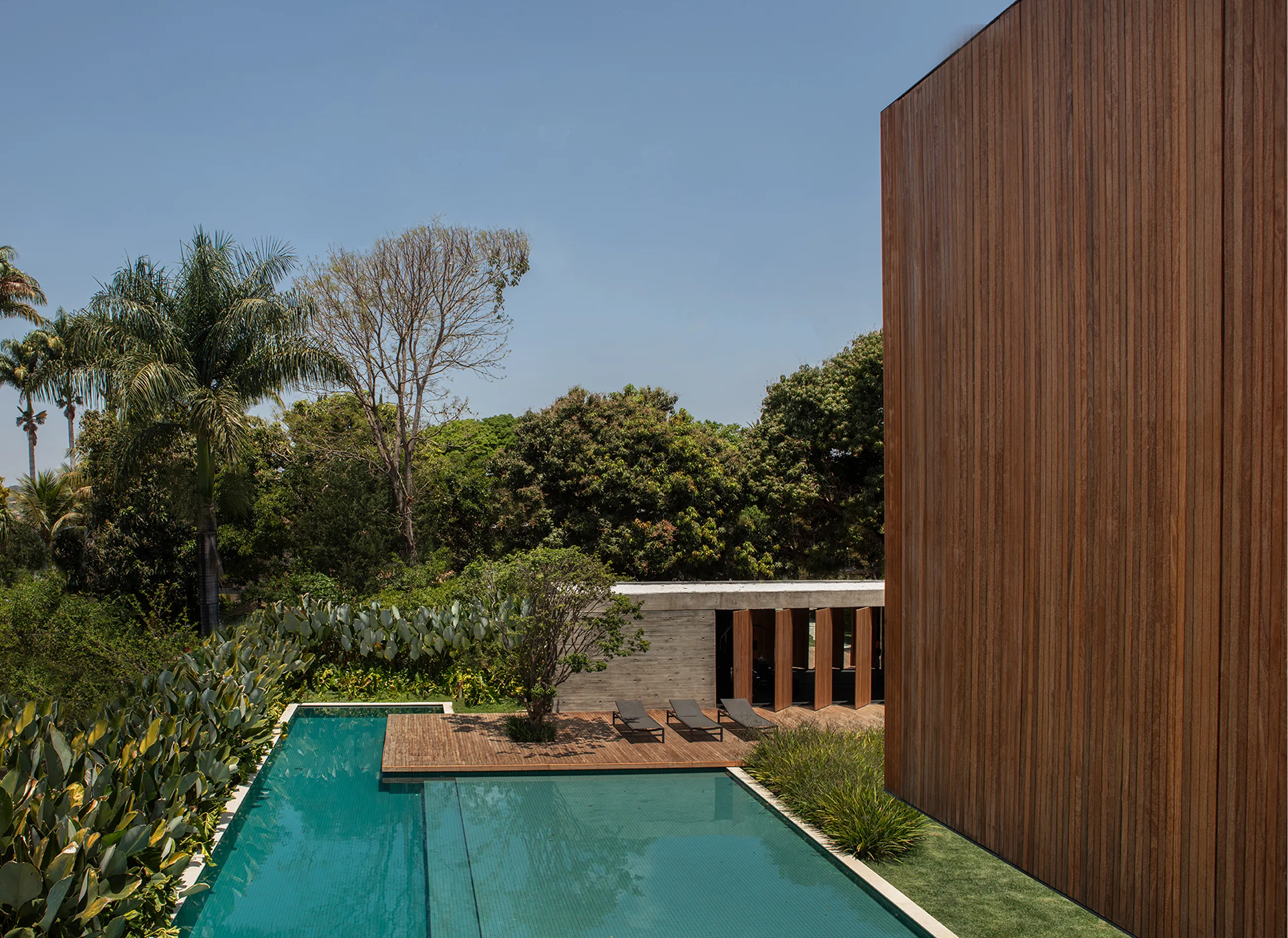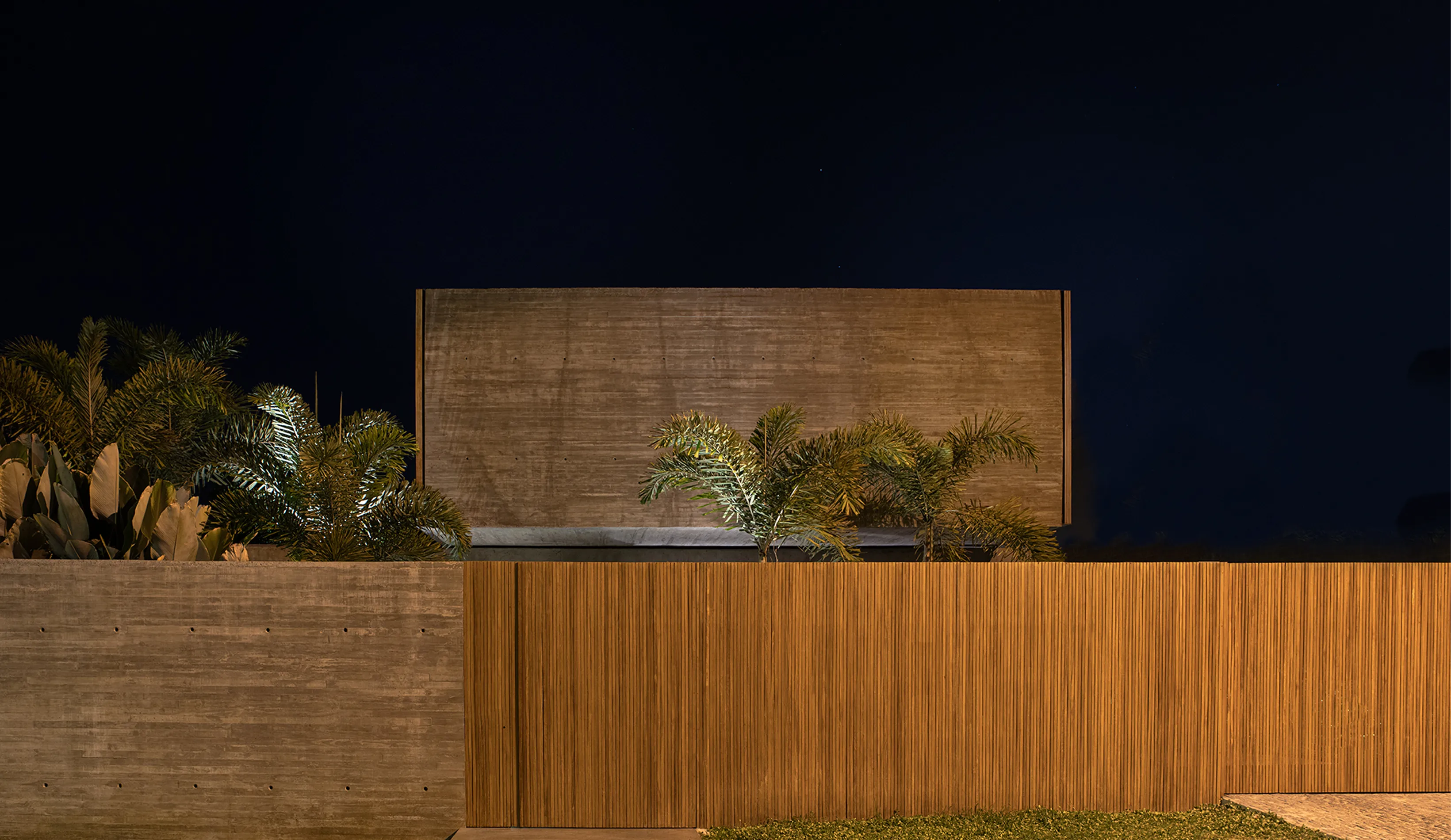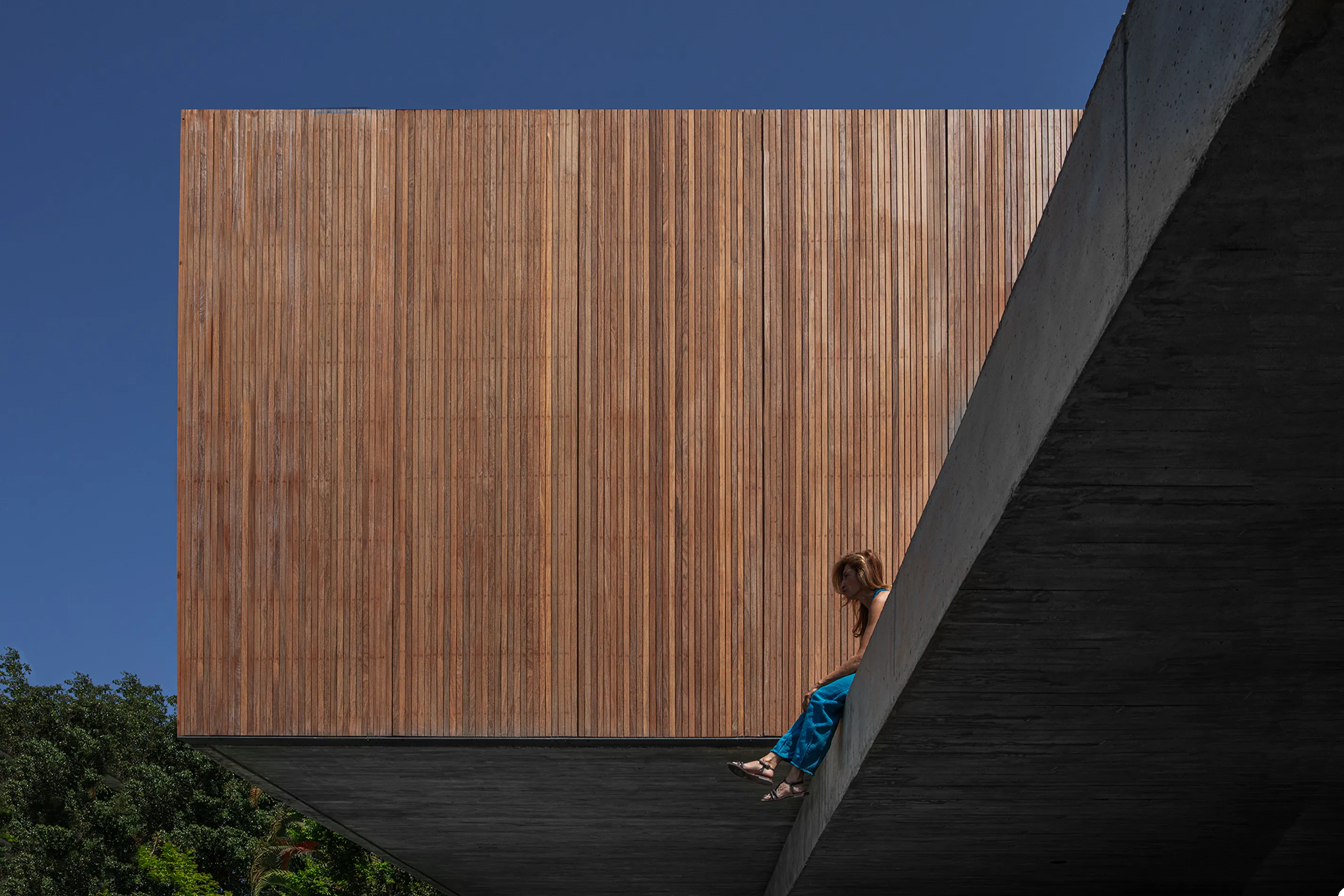 No volume superior, um corpo monolítico em madeira abriga a área íntima e se abre para uma grande varanda contínua voltada ao Lago Paranoá. Esse mirante linear emoldura a vista e garante proteção solar, ao mesmo tempo em que reforça o contraste entre opacidade e transparência — recurso central na composição da fachada. As lajes vazadas e o jogo entre luz e sombra acentuam o rigor construtivo e a leveza dos materiais.