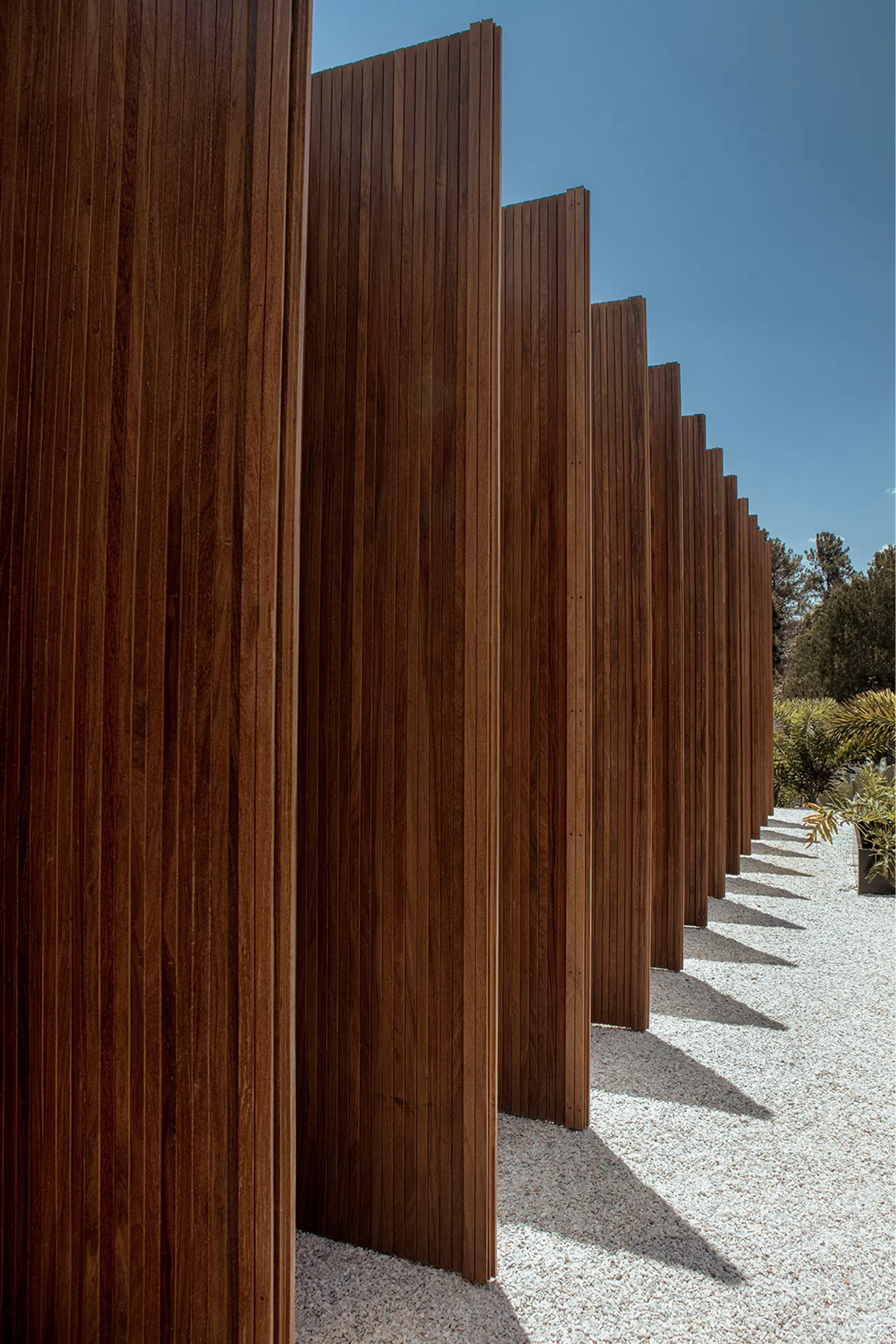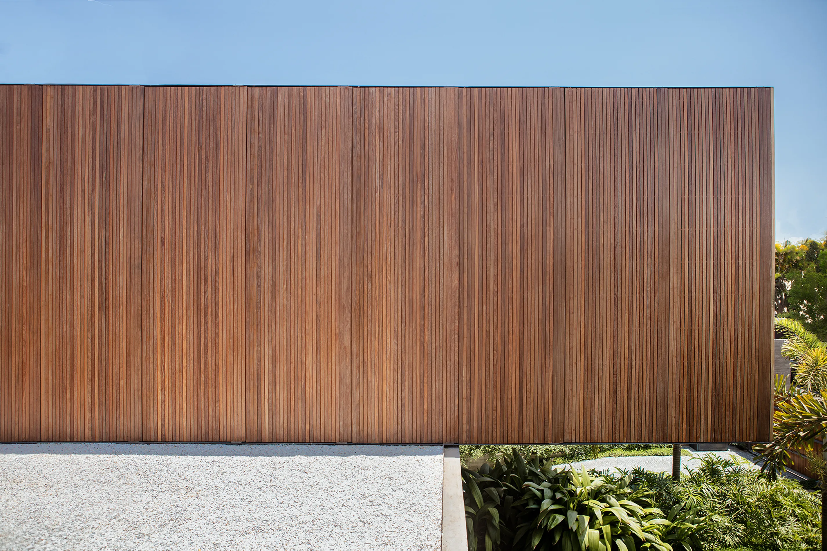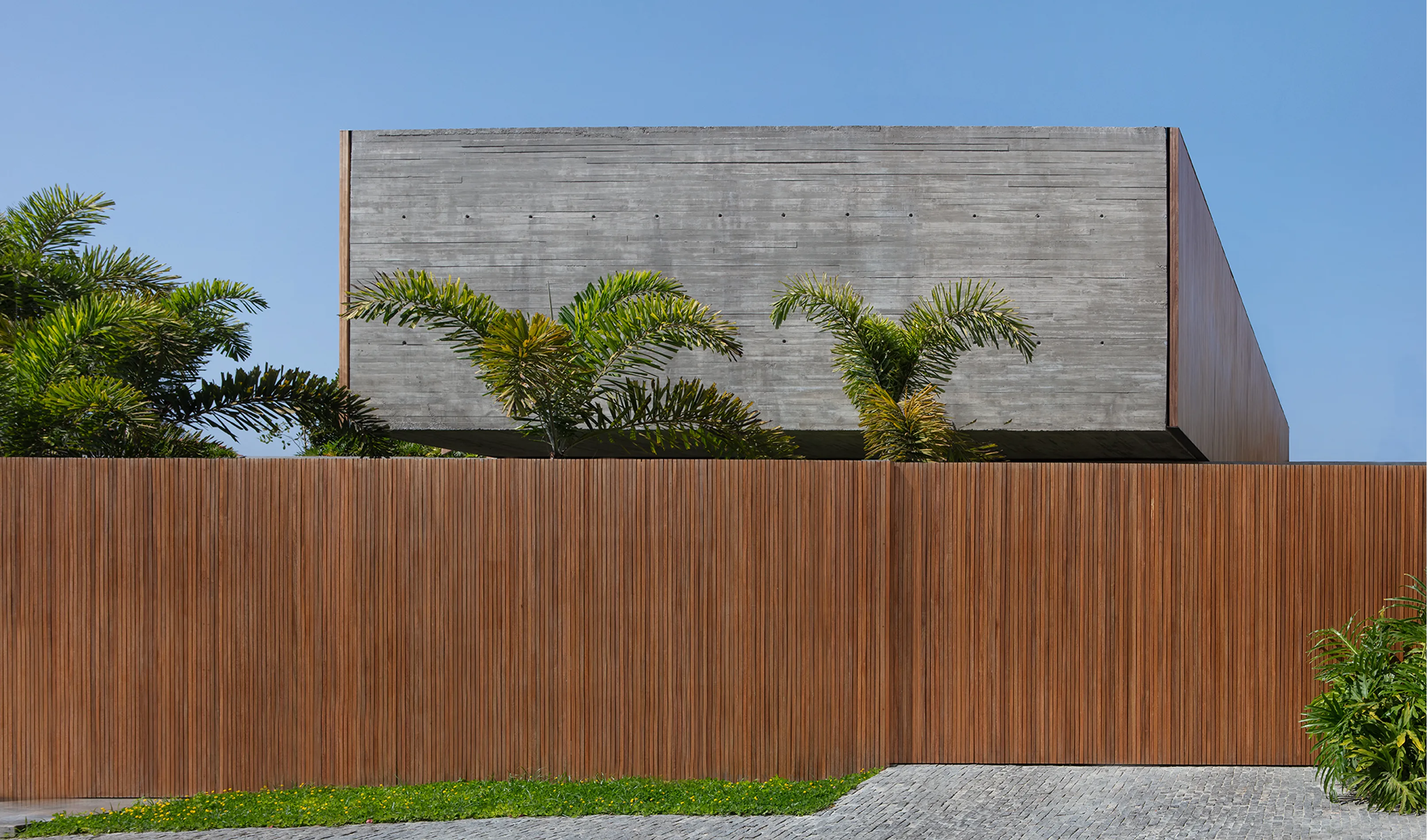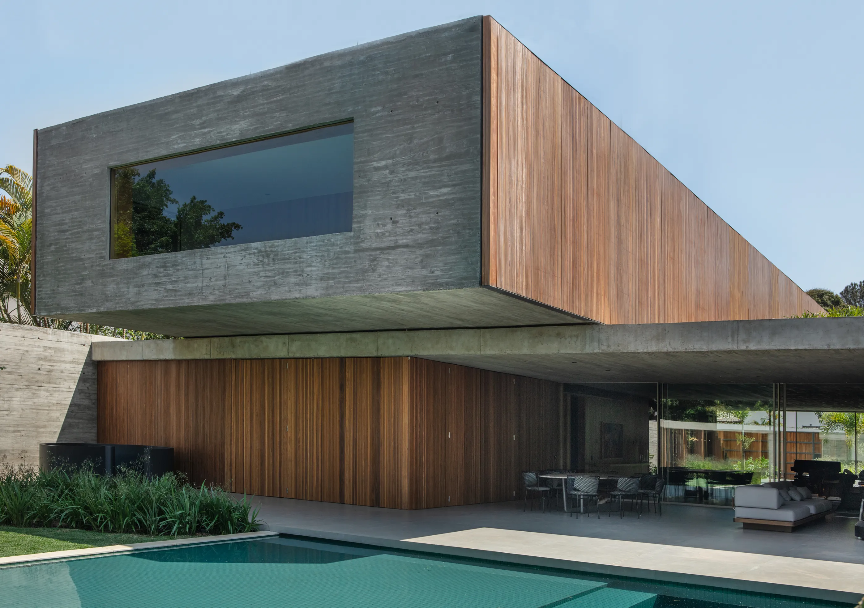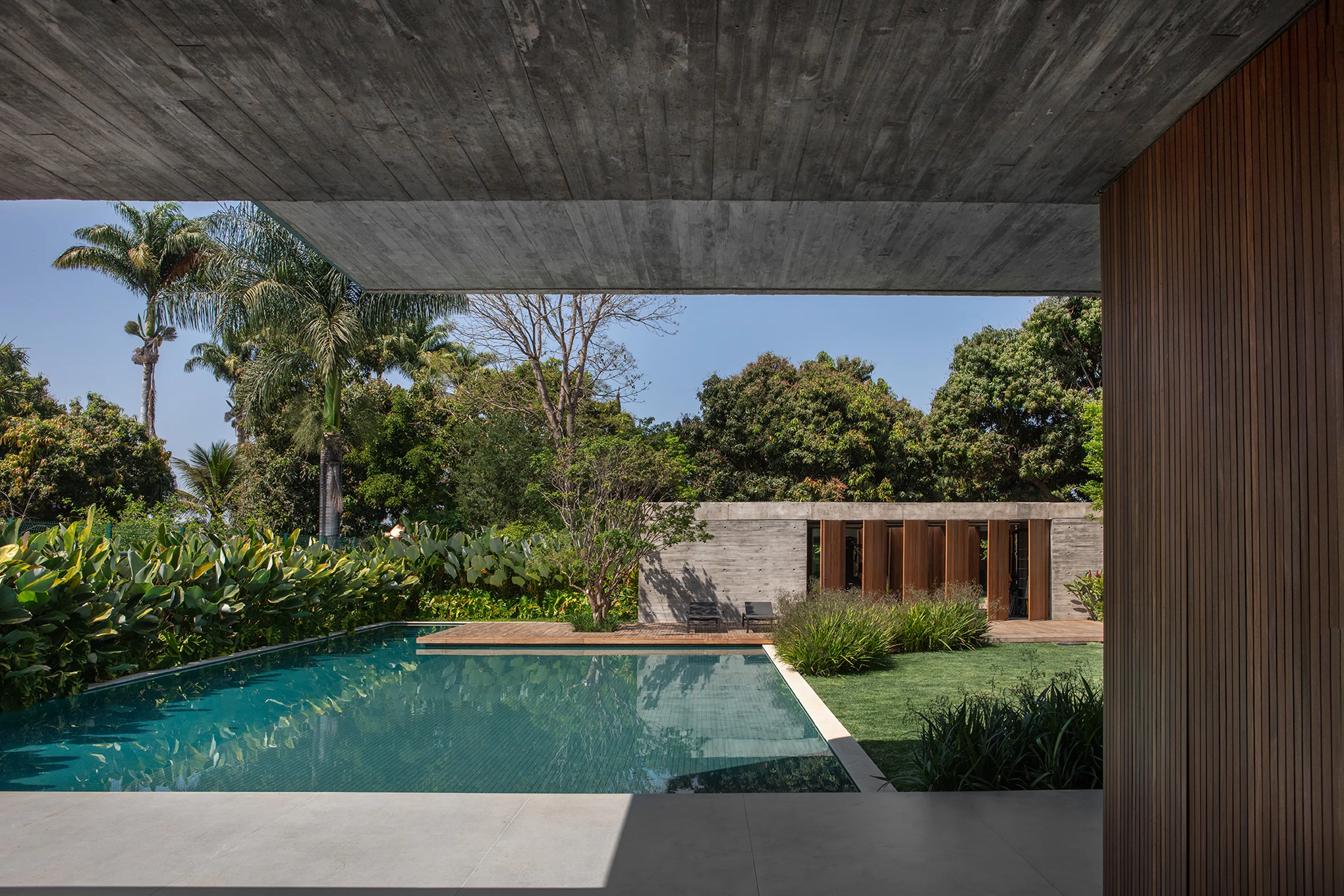 No volume superior, um corpo monolítico em madeira abriga a área íntima e se abre para uma grande varanda contínua voltada ao Lago Paranoá. Esse mirante linear emoldura a vista e garante proteção solar, ao mesmo tempo em que reforça o contraste entre opacidade e transparência — recurso central na composição da fachada. As lajes vazadas e o jogo entre luz e sombra acentuam o rigor construtivo e a leveza dos materiais.