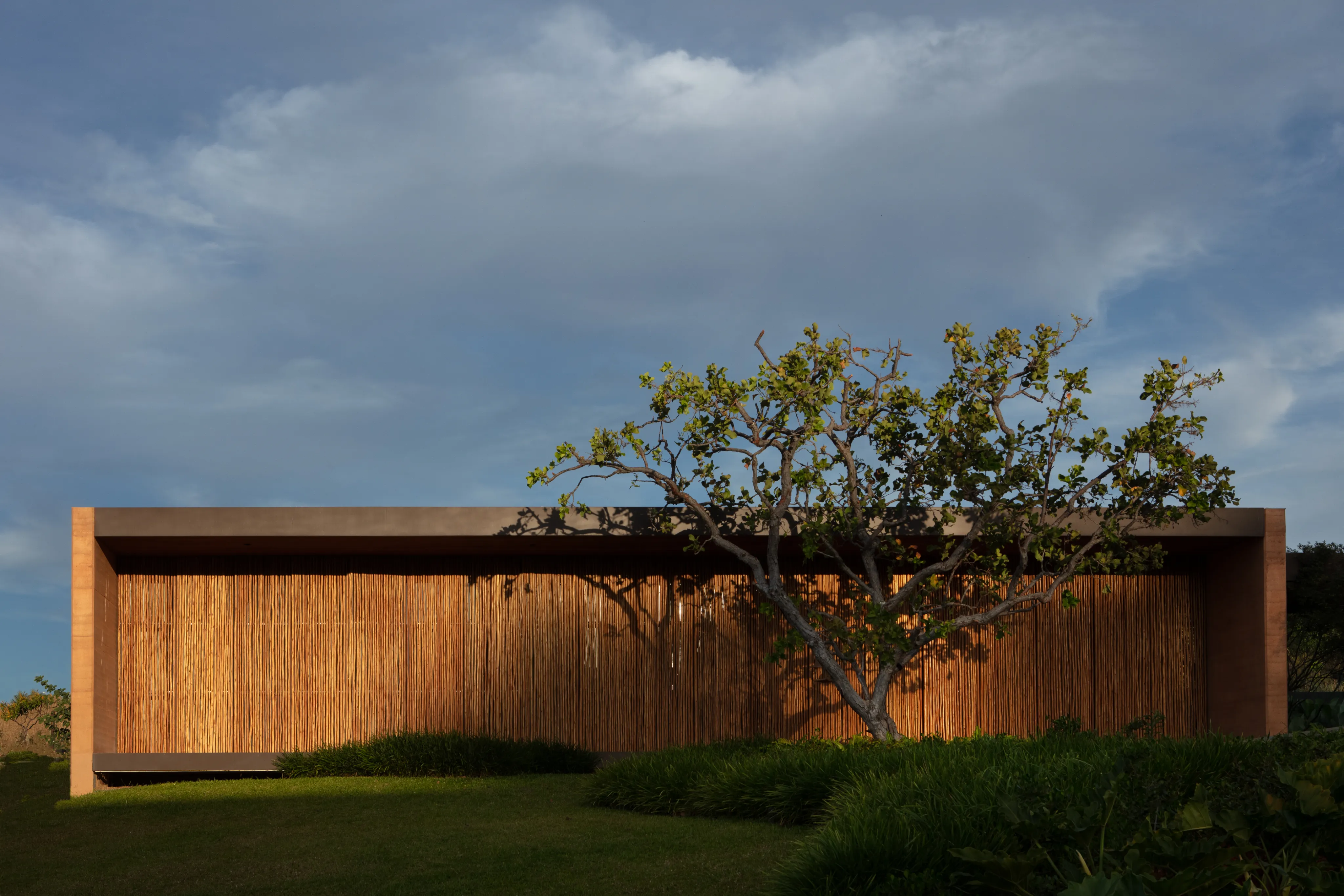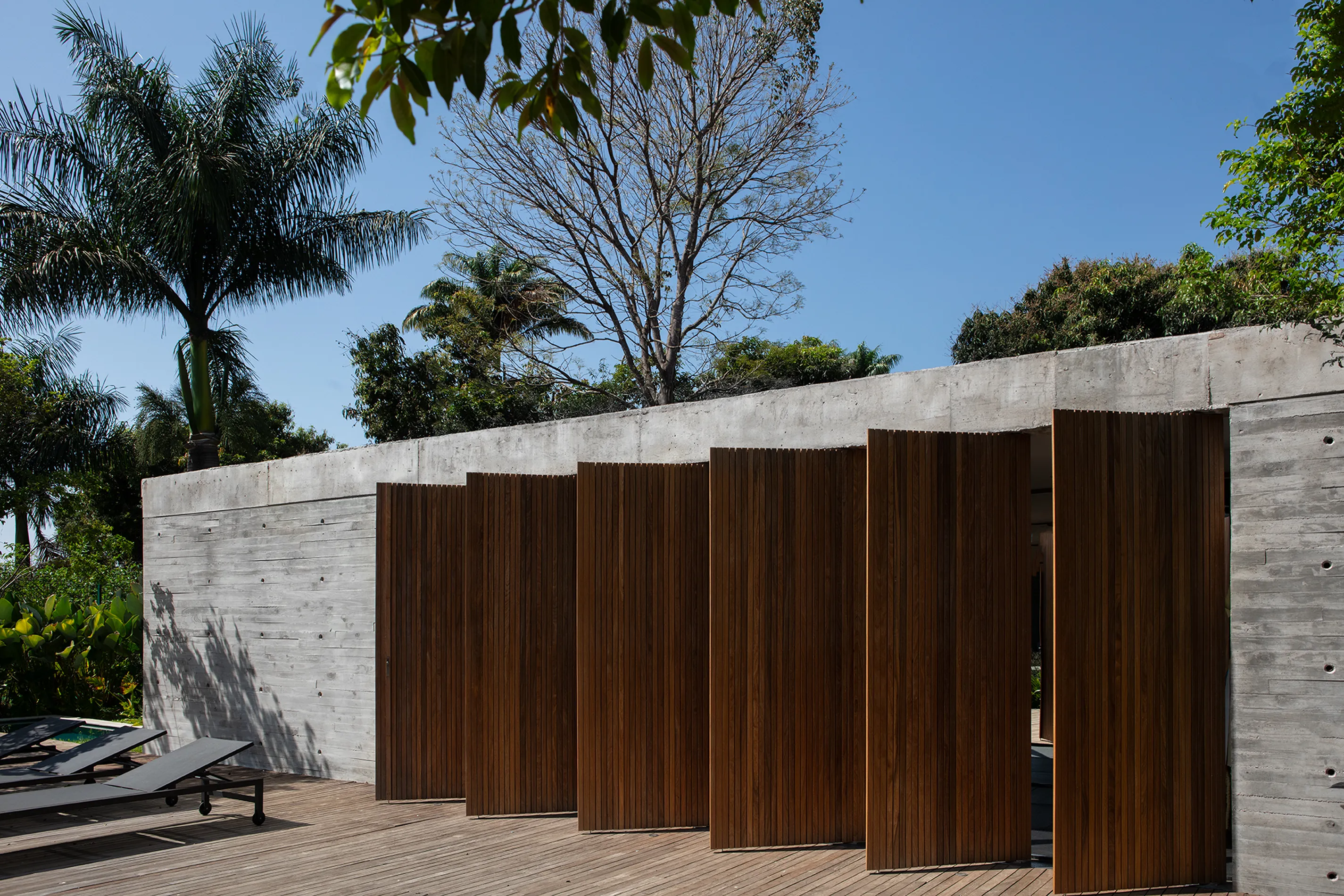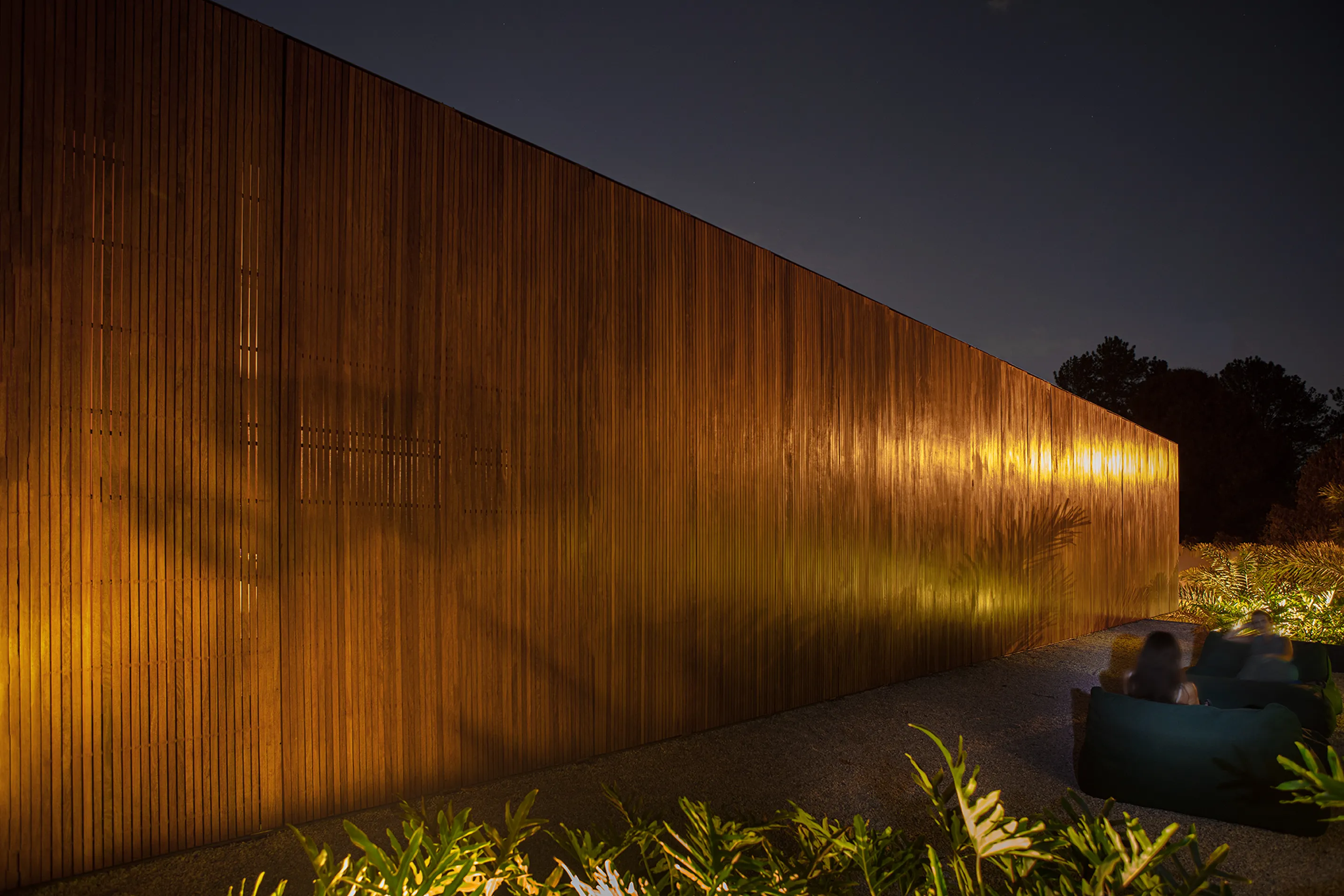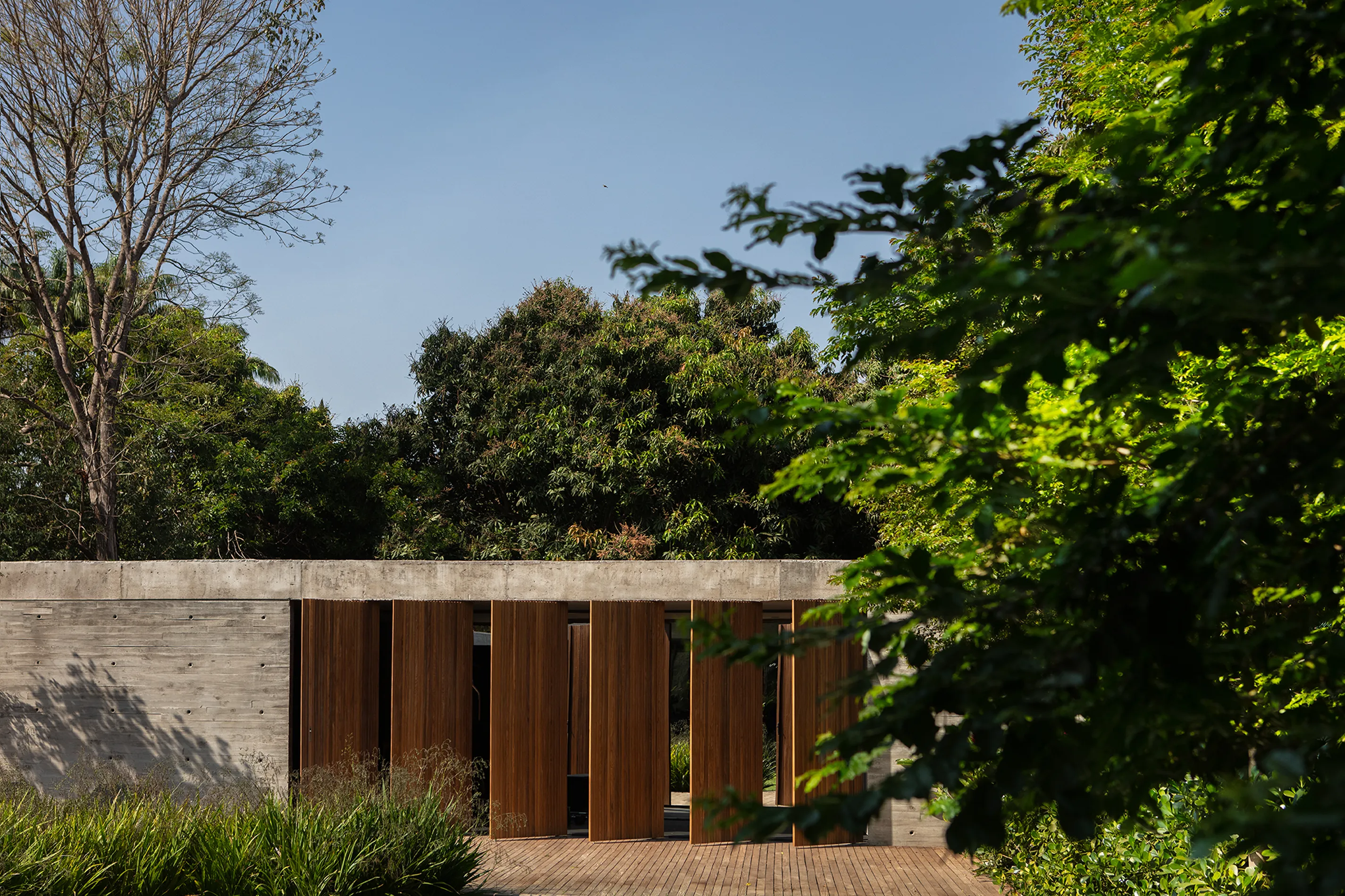 No volume superior, um corpo monolítico em madeira abriga a área íntima e se abre para uma grande varanda contínua voltada ao Lago Paranoá. Esse mirante linear emoldura a vista e garante proteção solar, ao mesmo tempo em que reforça o contraste entre opacidade e transparência — recurso central na composição da fachada. As lajes vazadas e o jogo entre luz e sombra acentuam o rigor construtivo e a leveza dos materiais.