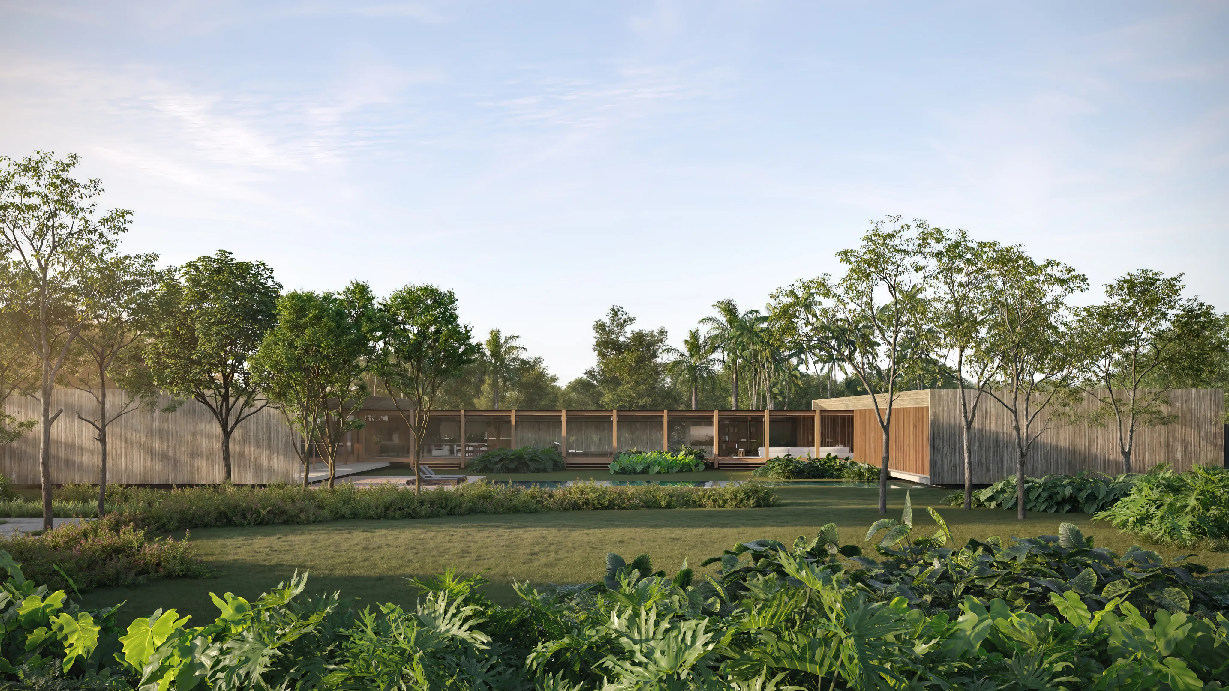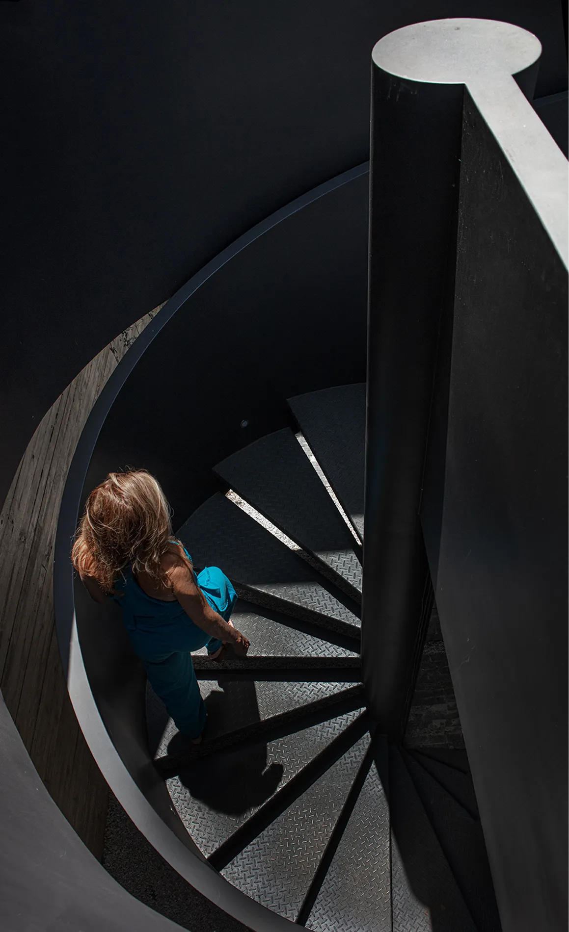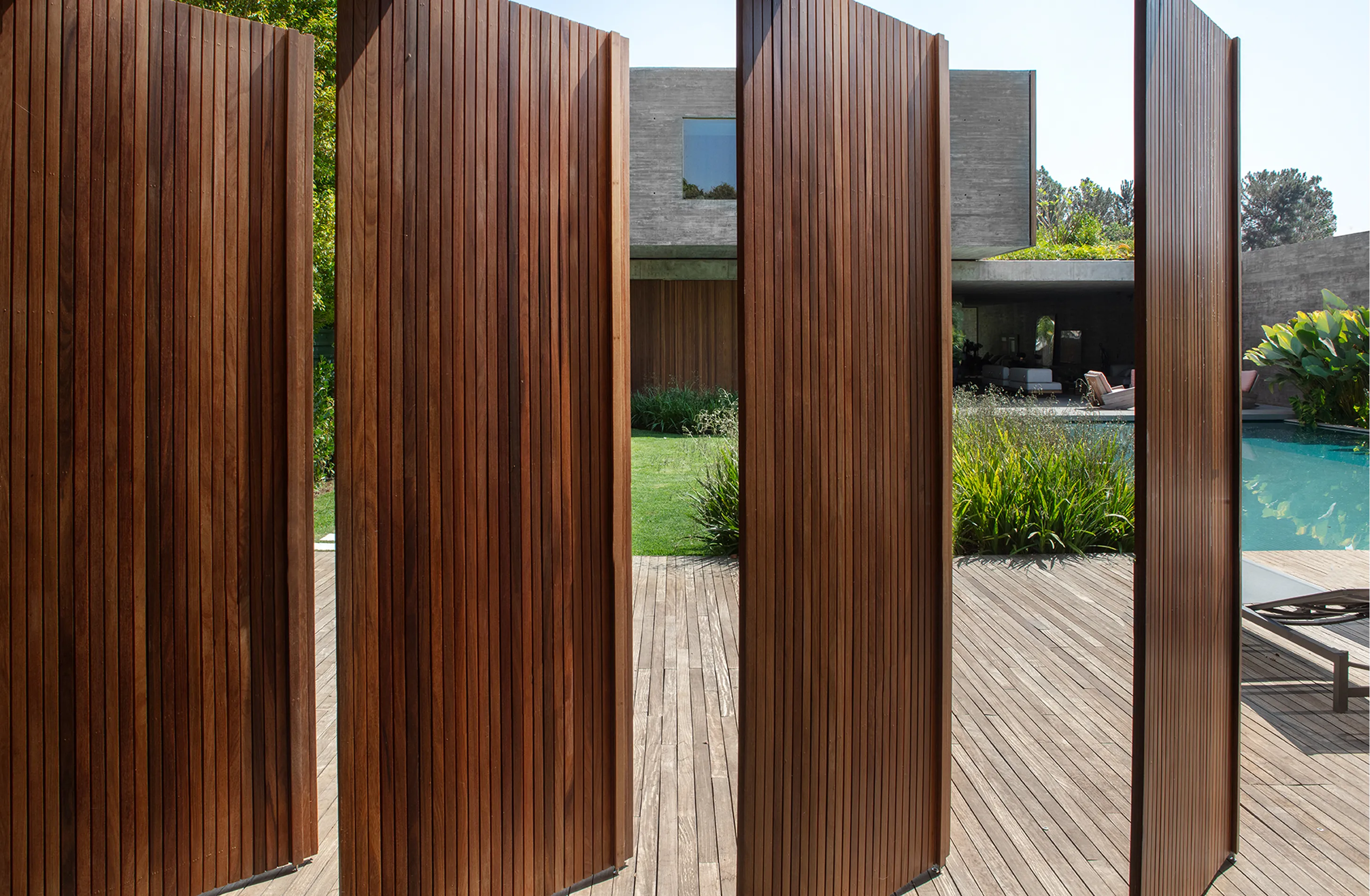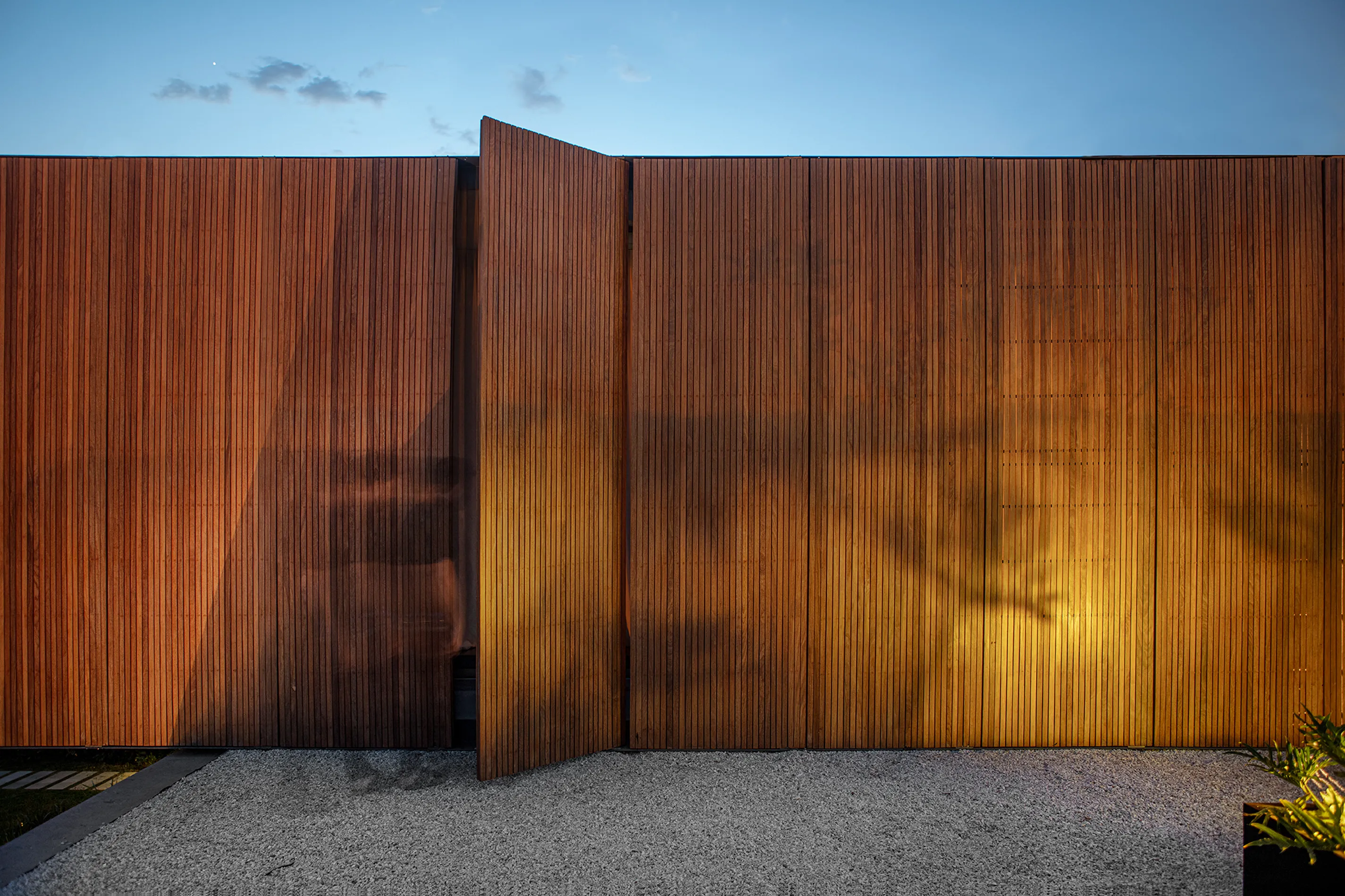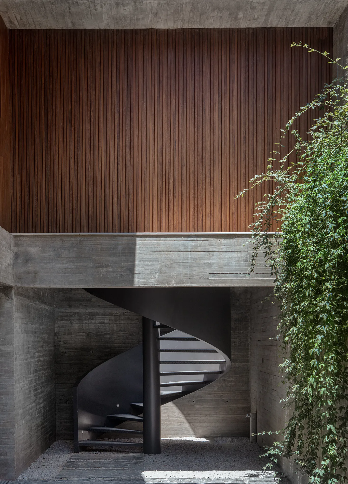 No volume superior, um corpo monolítico em madeira abriga a área íntima e se abre para uma grande varanda contínua voltada ao Lago Paranoá. Esse mirante linear emoldura a vista e garante proteção solar, ao mesmo tempo em que reforça o contraste entre opacidade e transparência — recurso central na composição da fachada. As lajes vazadas e o jogo entre luz e sombra acentuam o rigor construtivo e a leveza dos materiais.