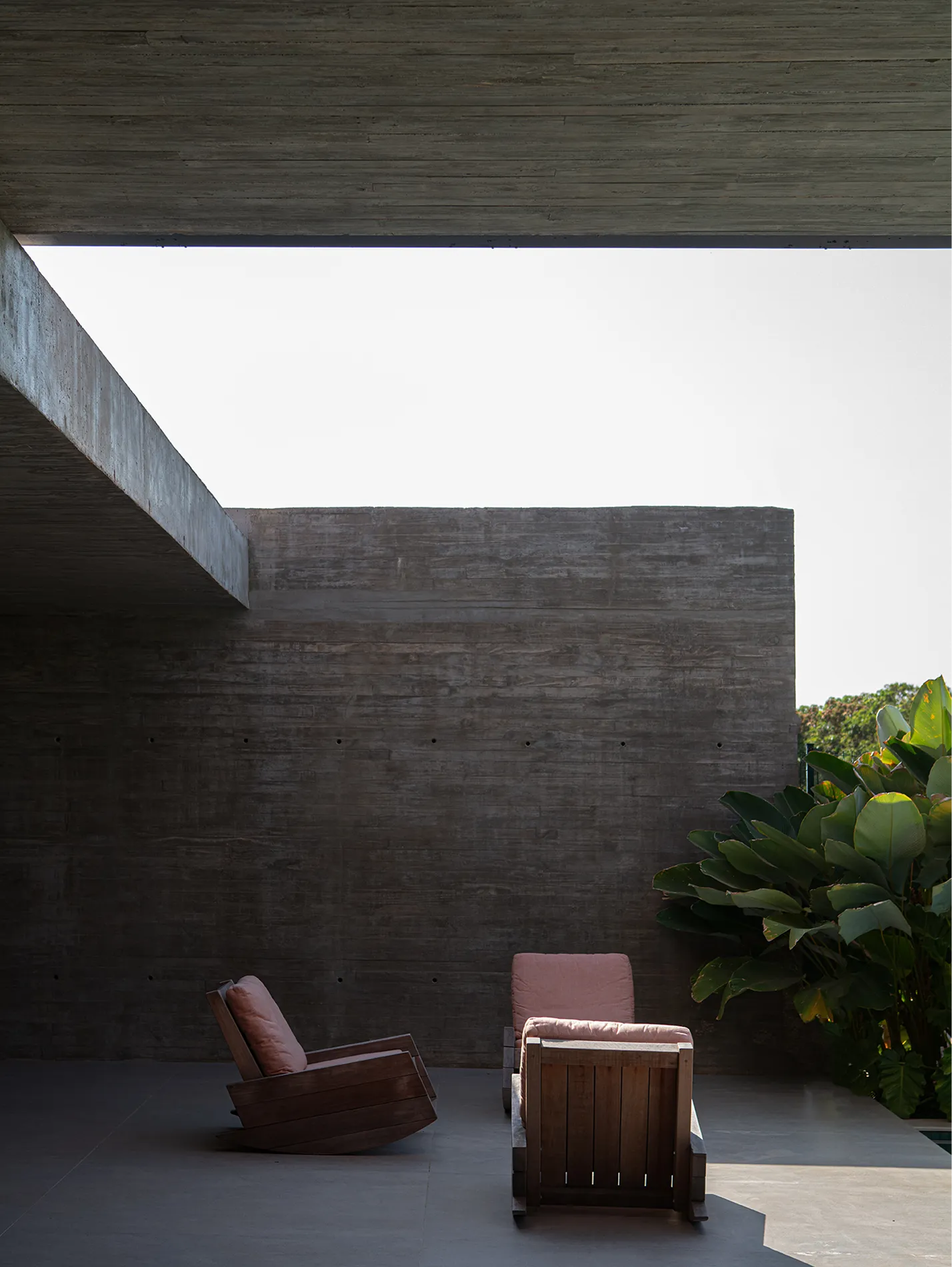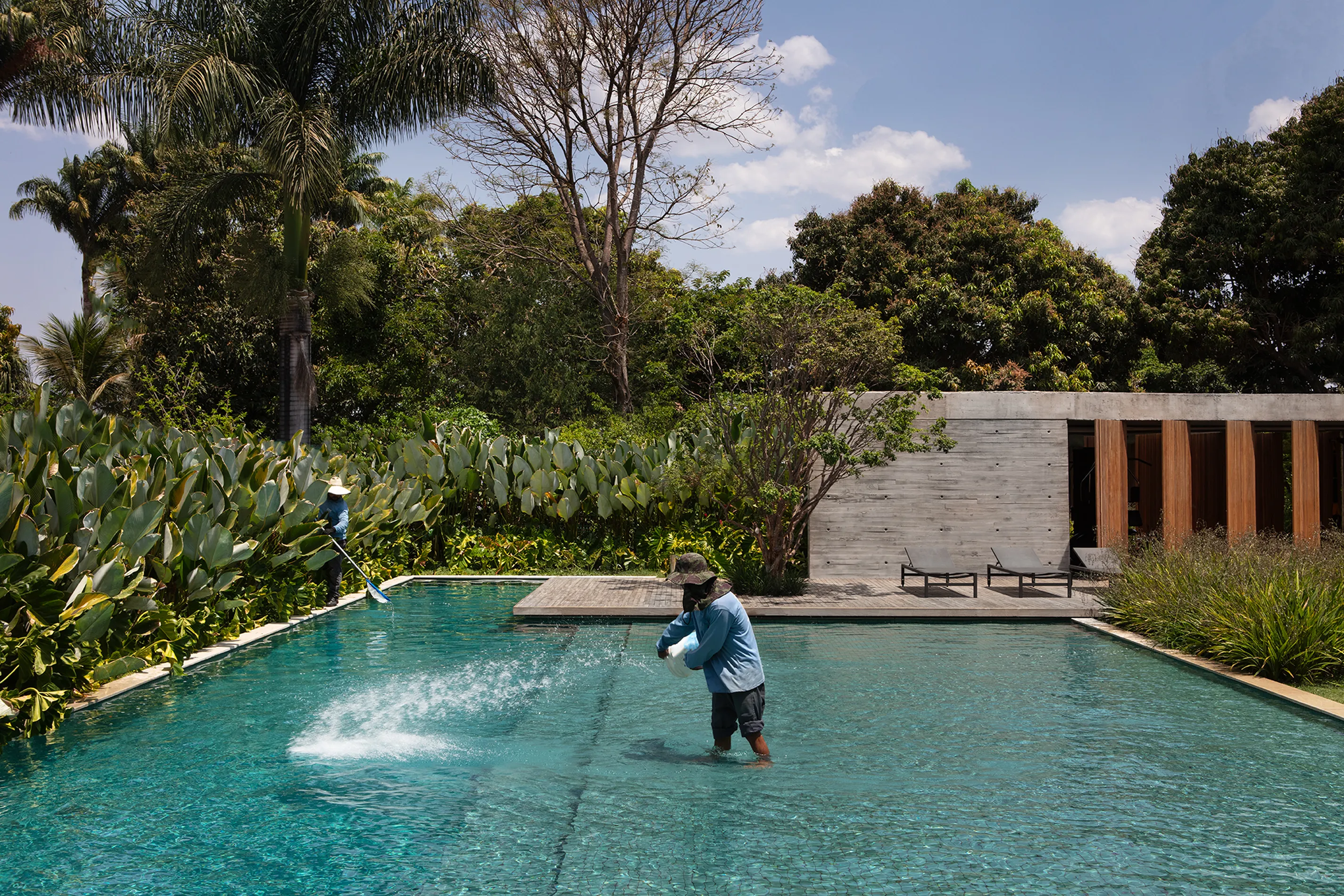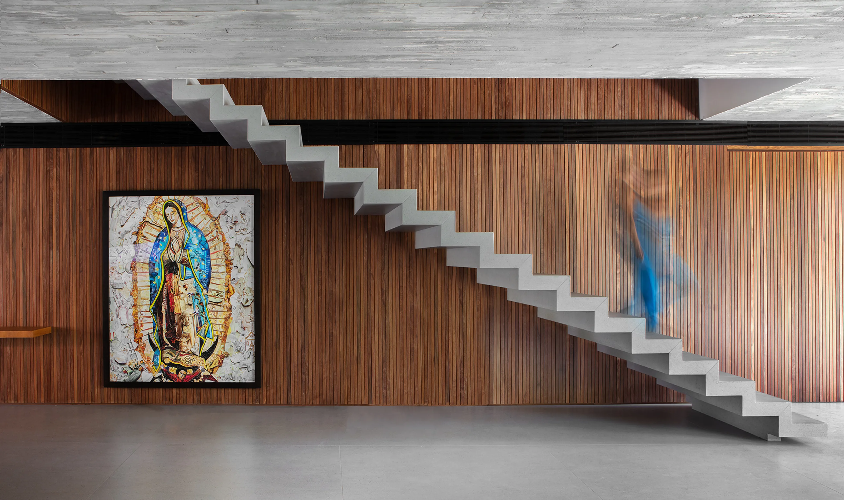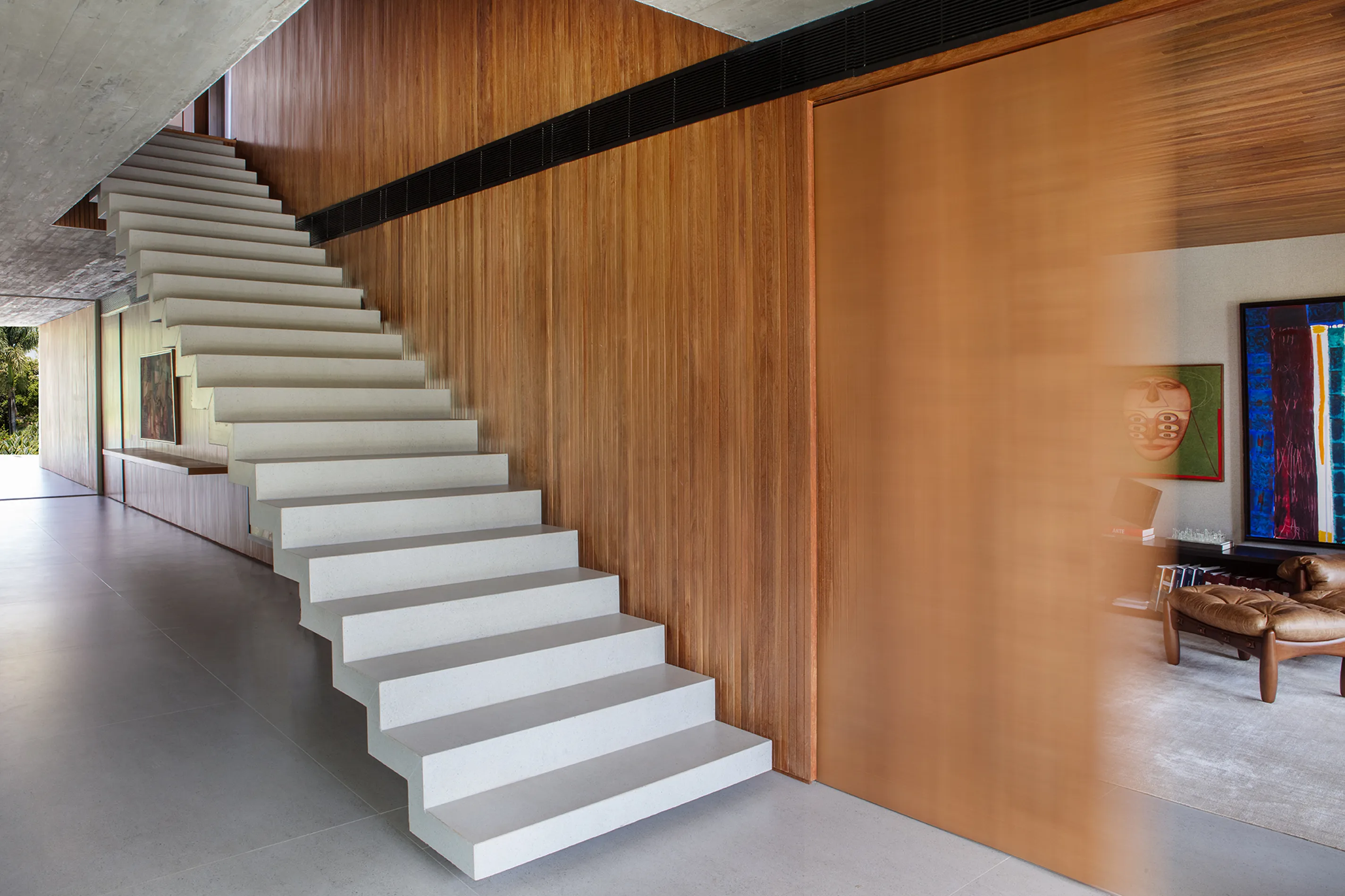 Internamente, os ambientes amplos e de acabamento preciso servem de suporte para a importante coleção de arte dos moradores, com destaque para arte contemporânea. A neutralidade da paleta — concreto, madeira e pedra — valoriza as peças e cria uma espacialidade serena e atemporal, onde arquitetura, arte e natureza coexistem em equilíbrio.