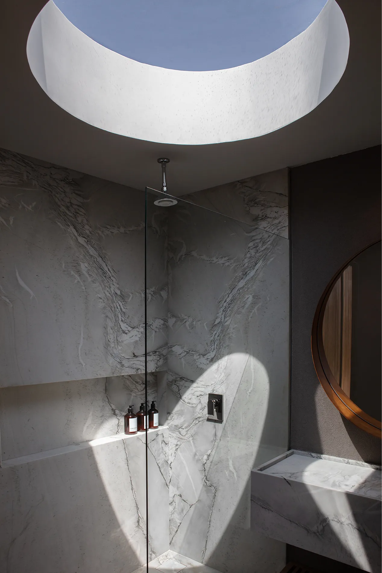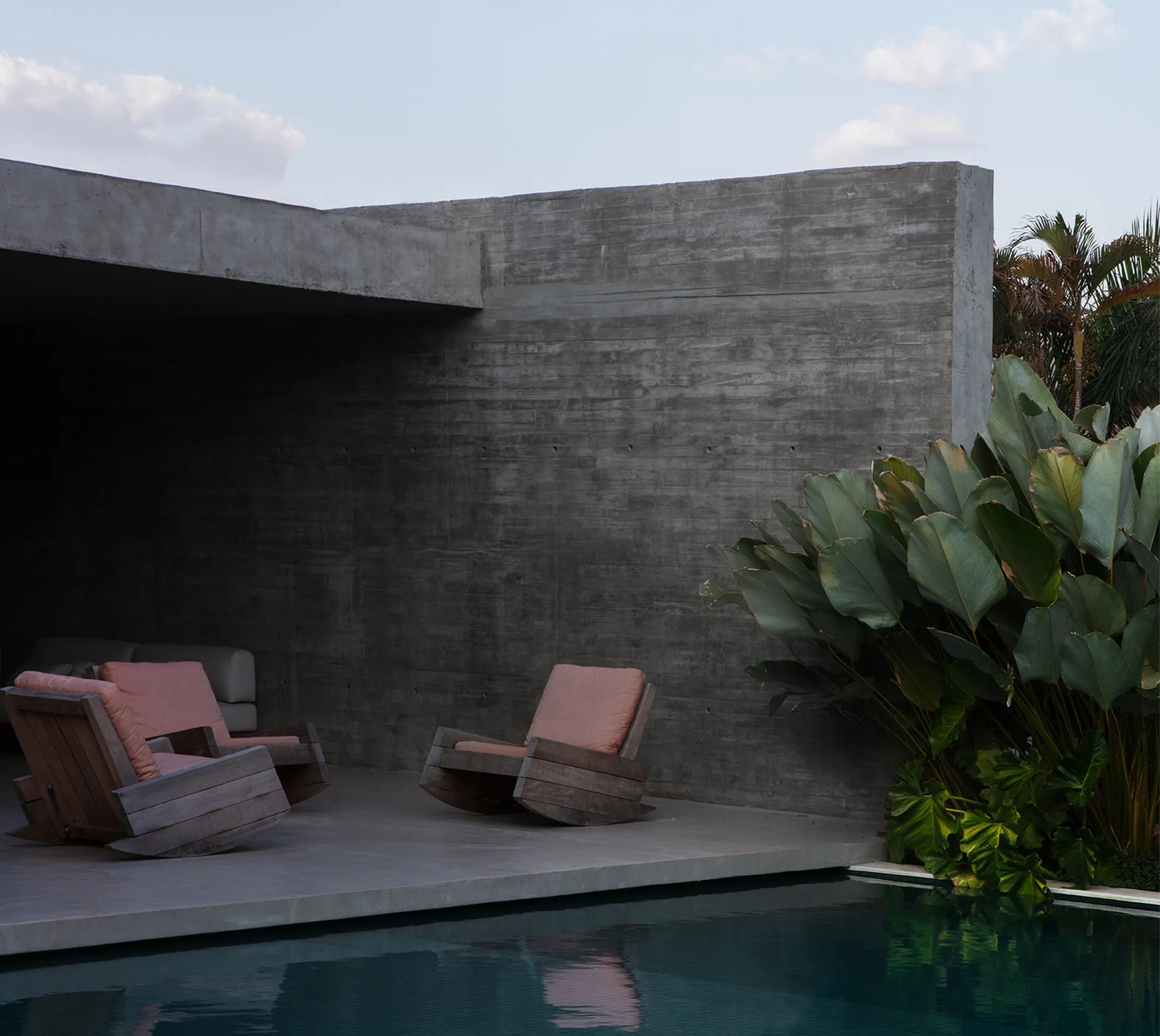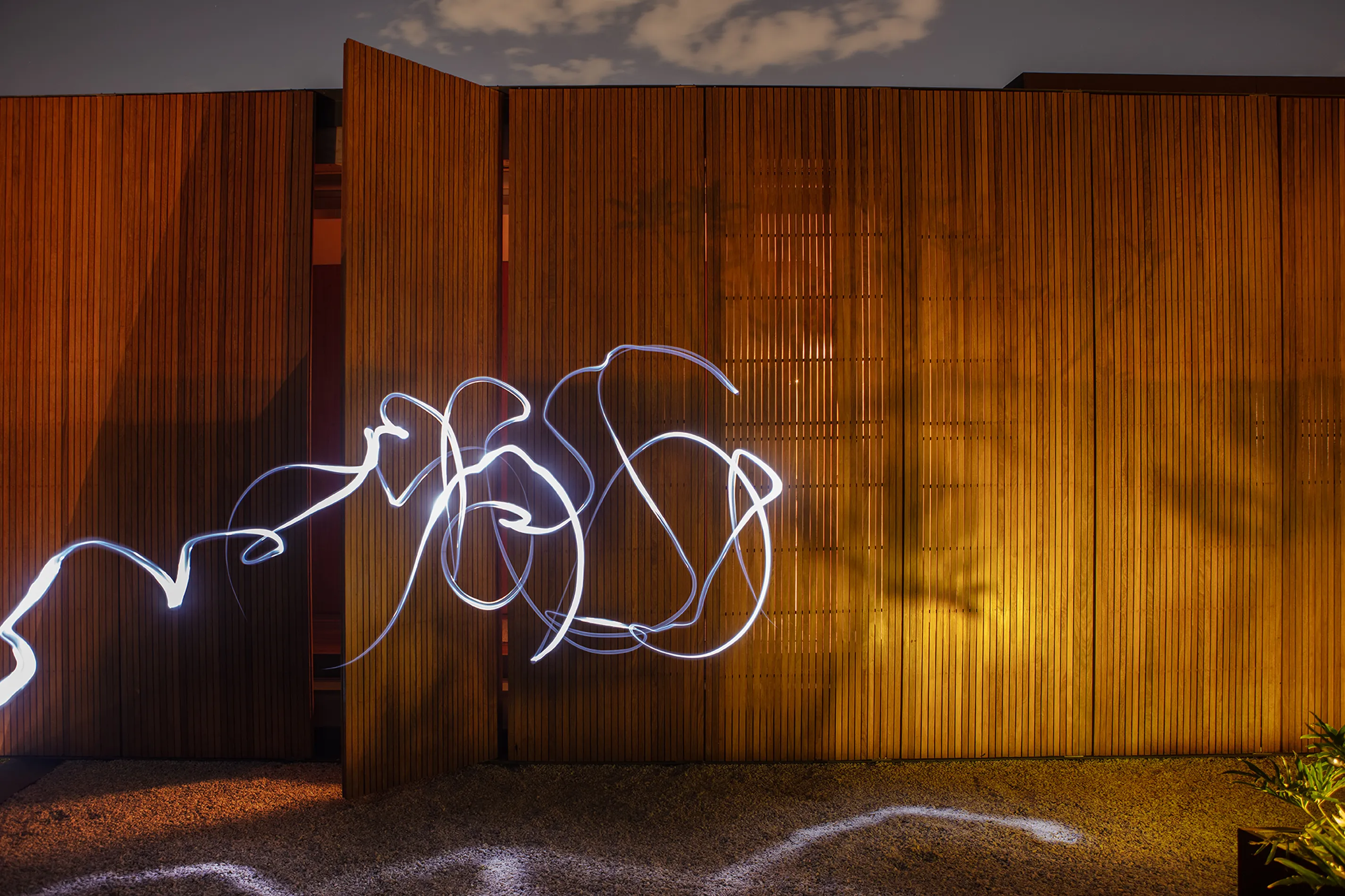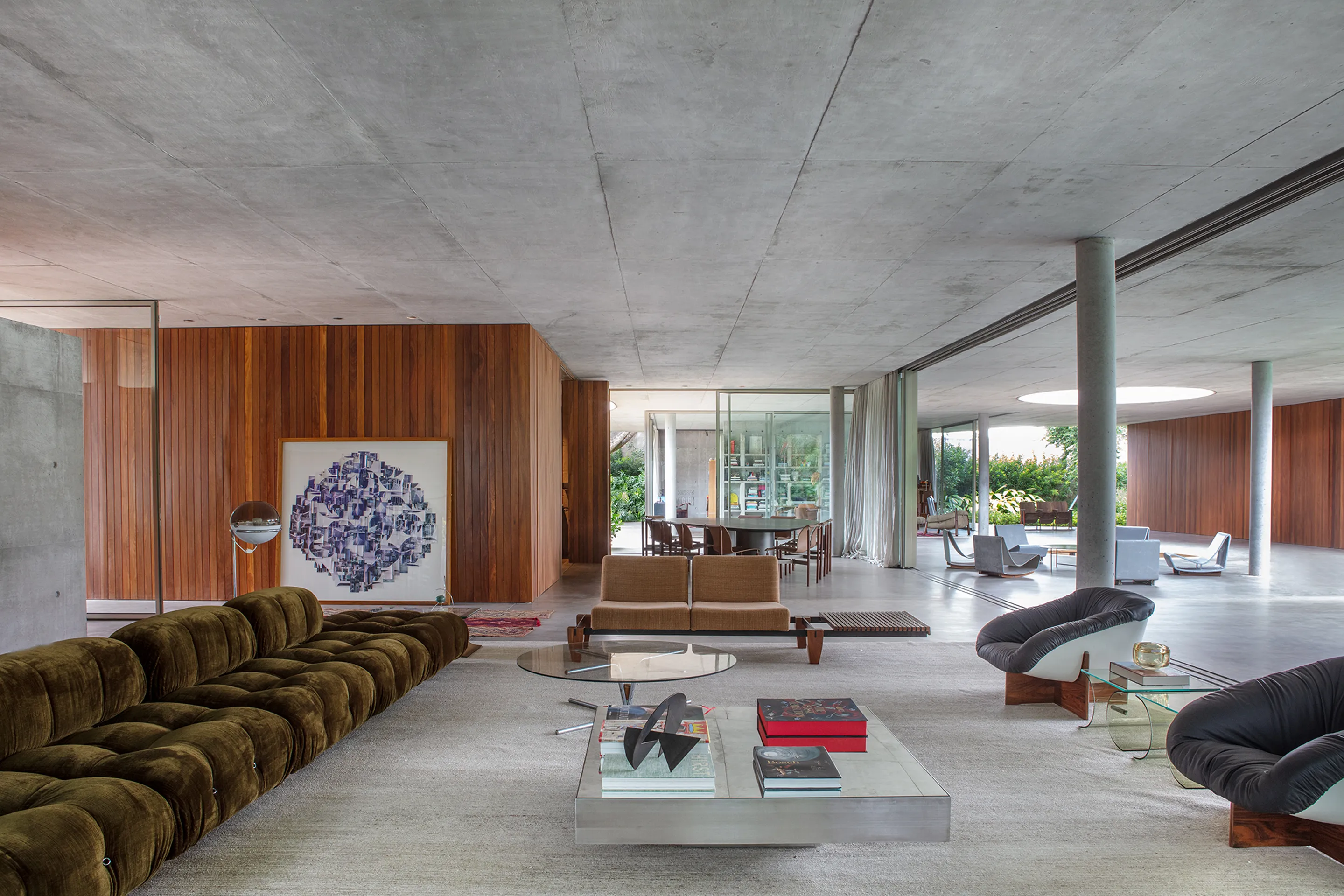Internamente, os ambientes amplos e de acabamento preciso servem de suporte para a importante coleção de arte dos moradores, com destaque para arte contemporânea. A neutralidade da paleta — concreto, madeira e pedra — valoriza as peças e cria uma espacialidade serena e atemporal, onde arquitetura, arte e natureza coexistem em equilíbrio.