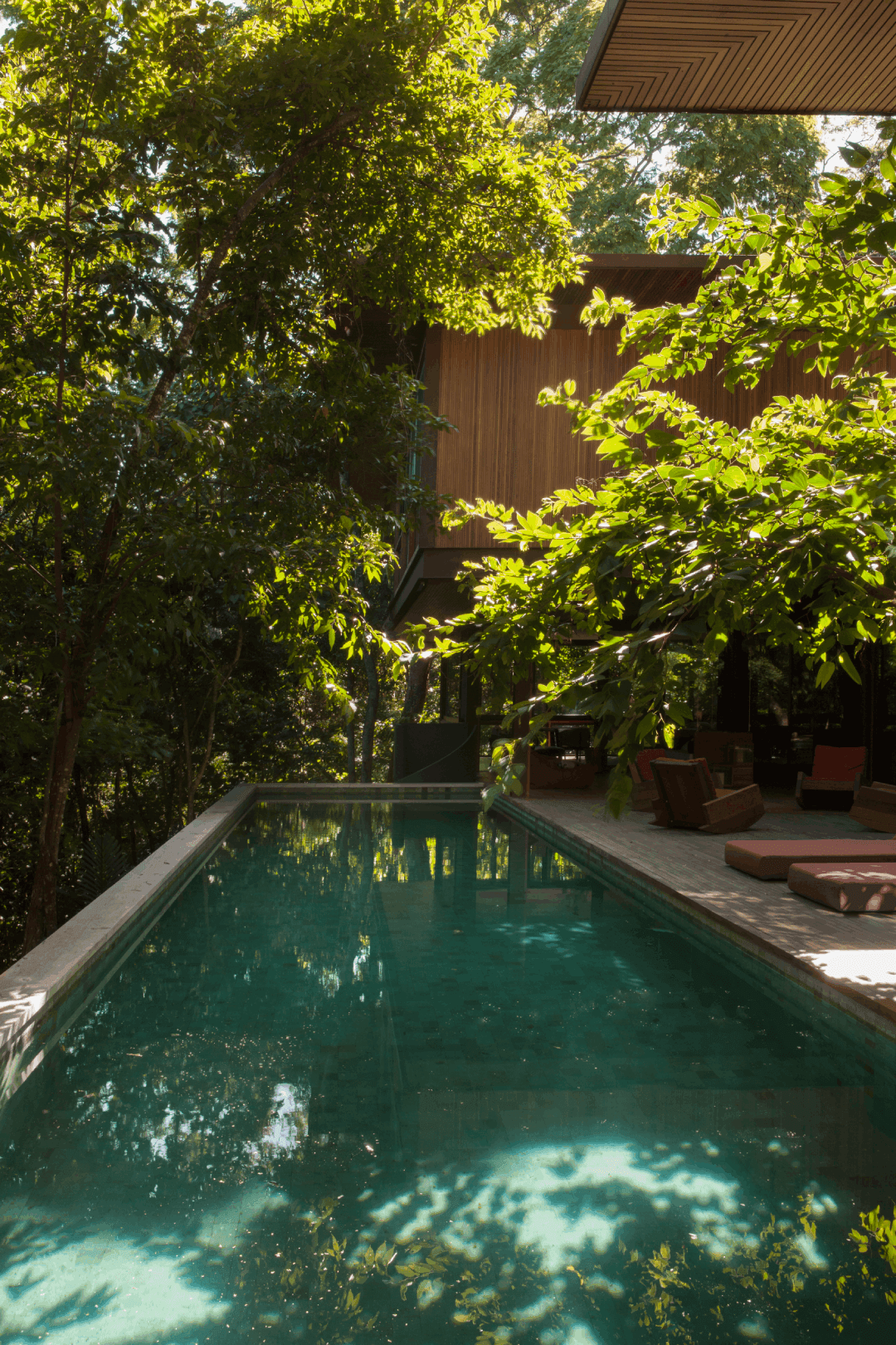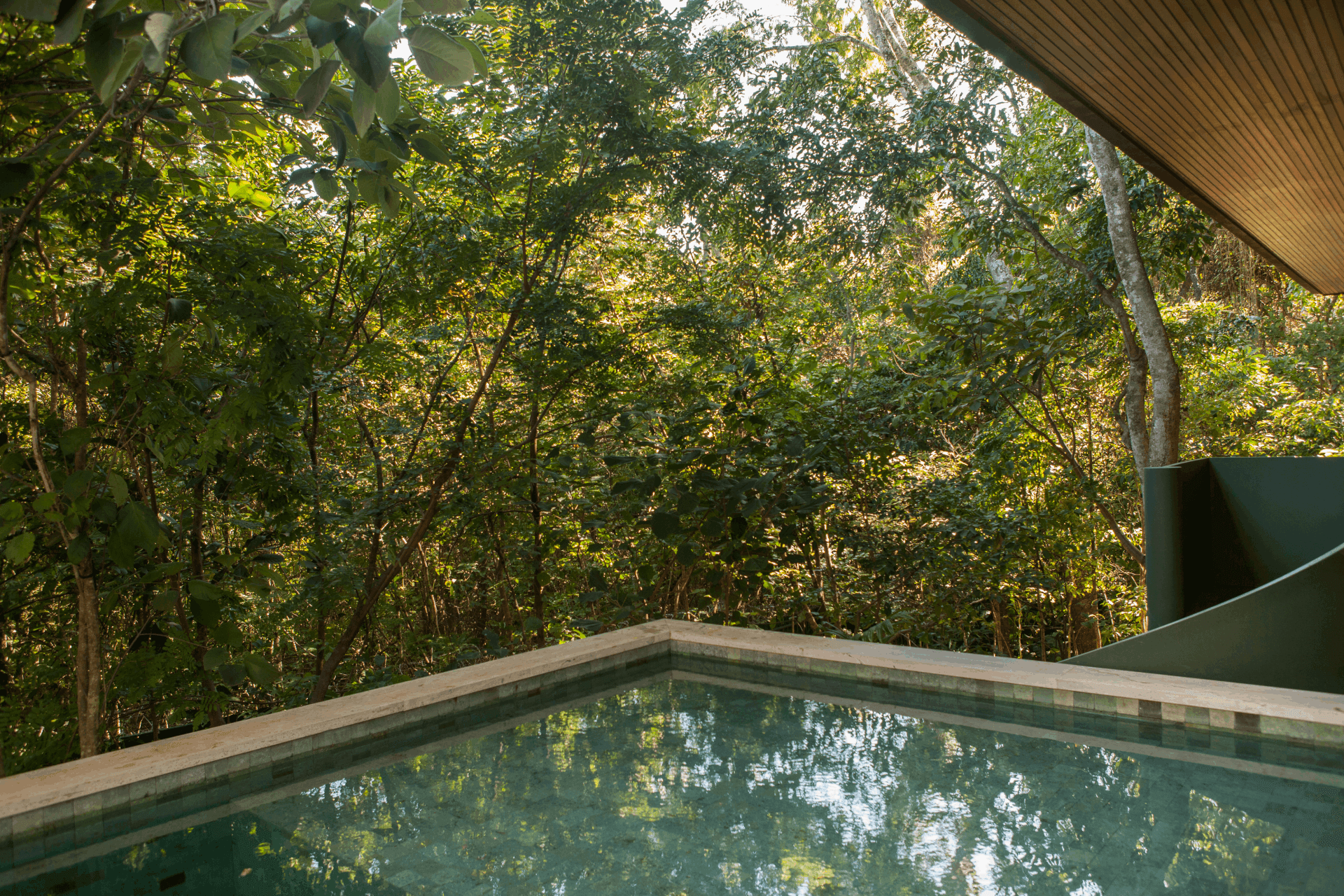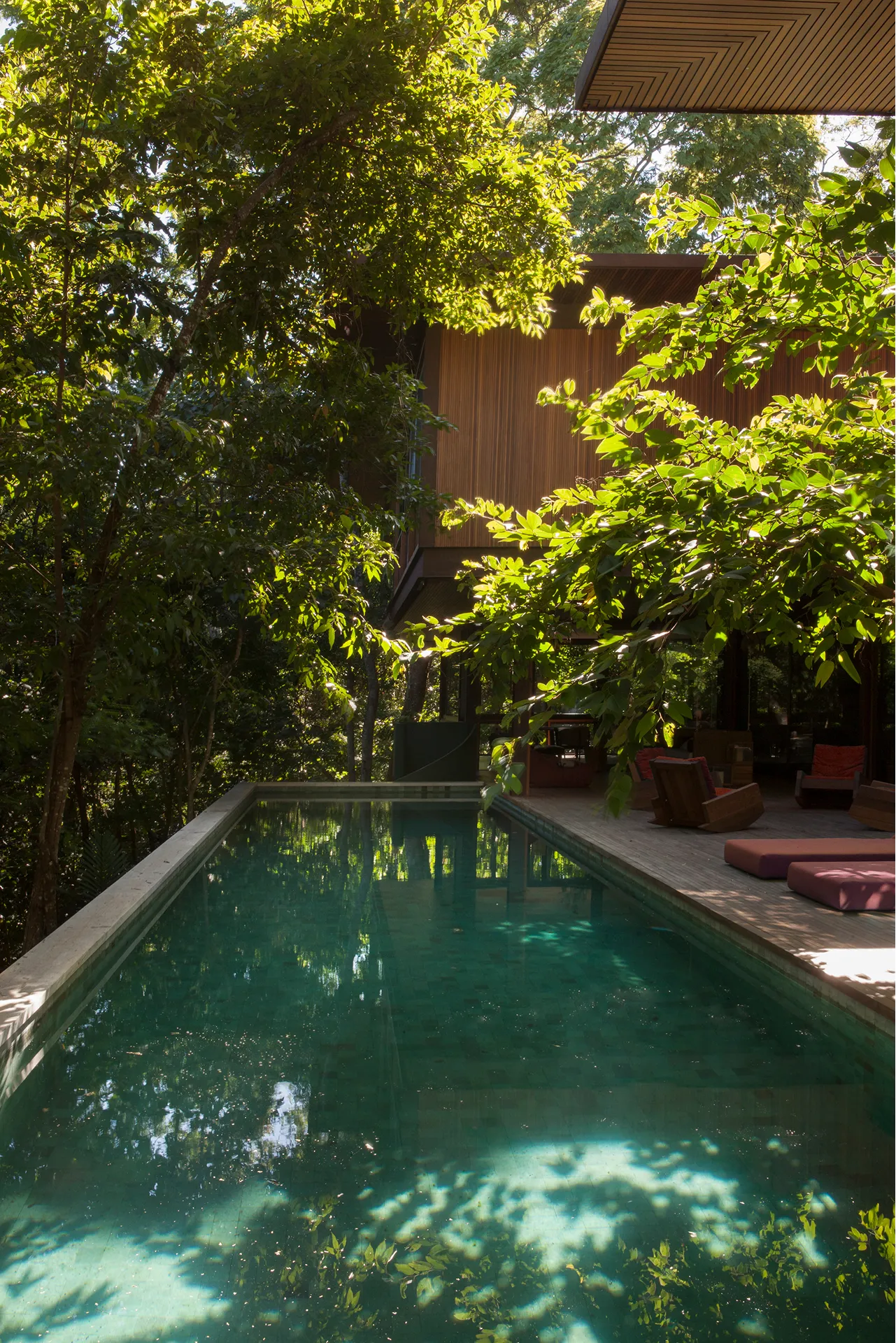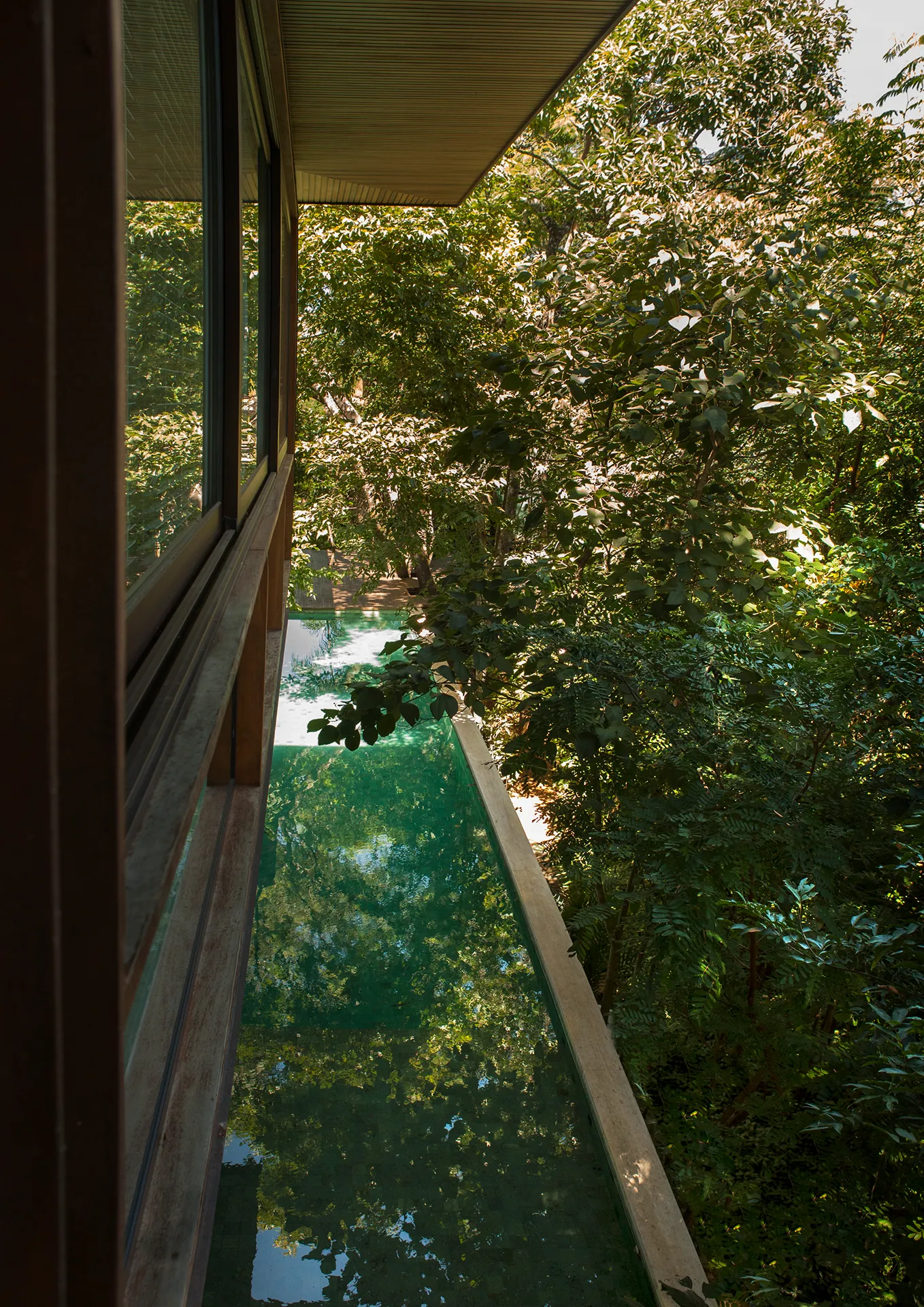 Uma das características mais marcantes do projeto é a piscina, que atravessa o coração da casa. Esta piscina não só serve como um refúgio refrescante, mas também como um mezanino para a floresta.