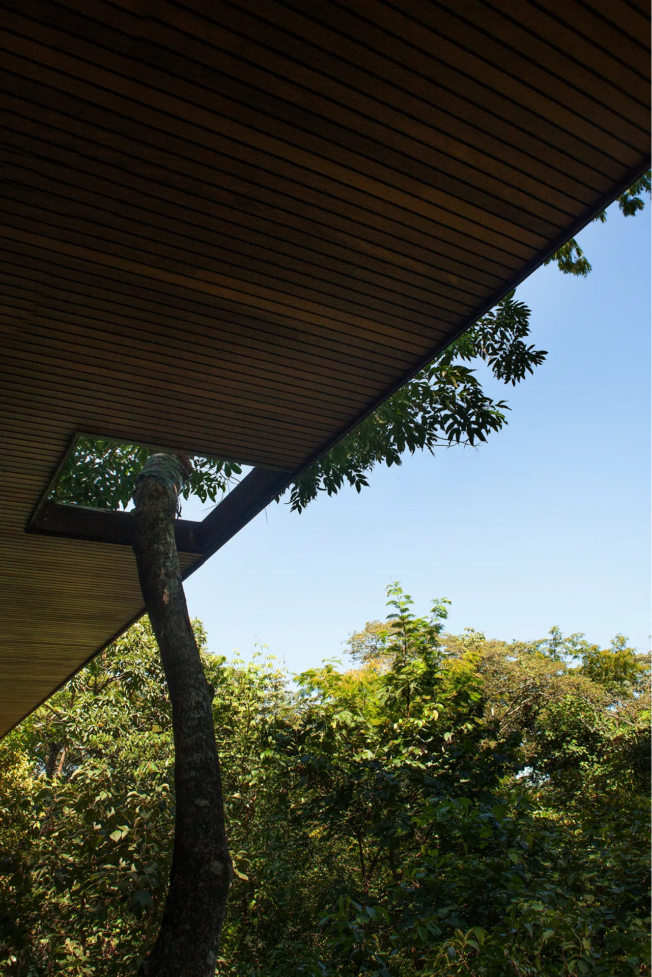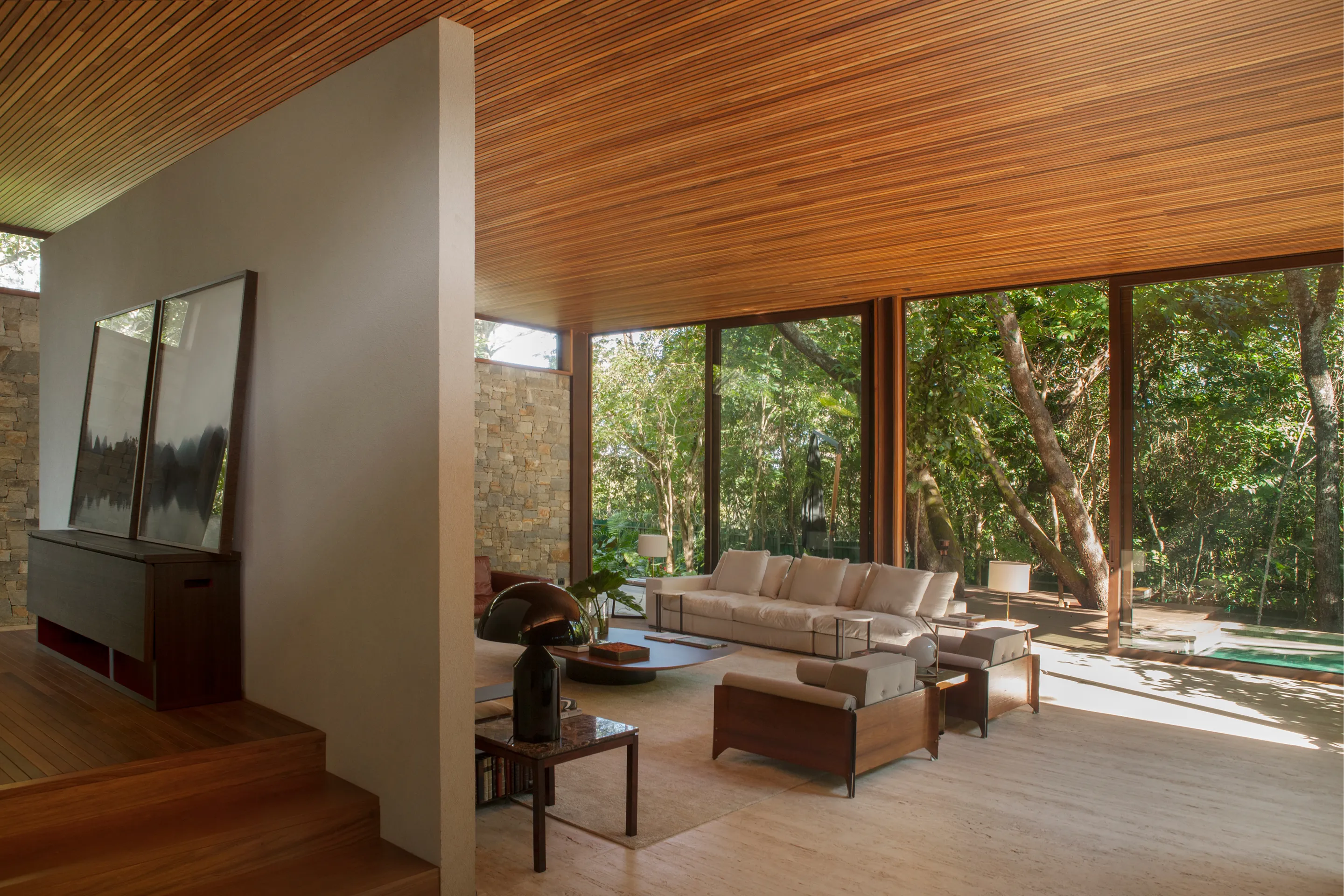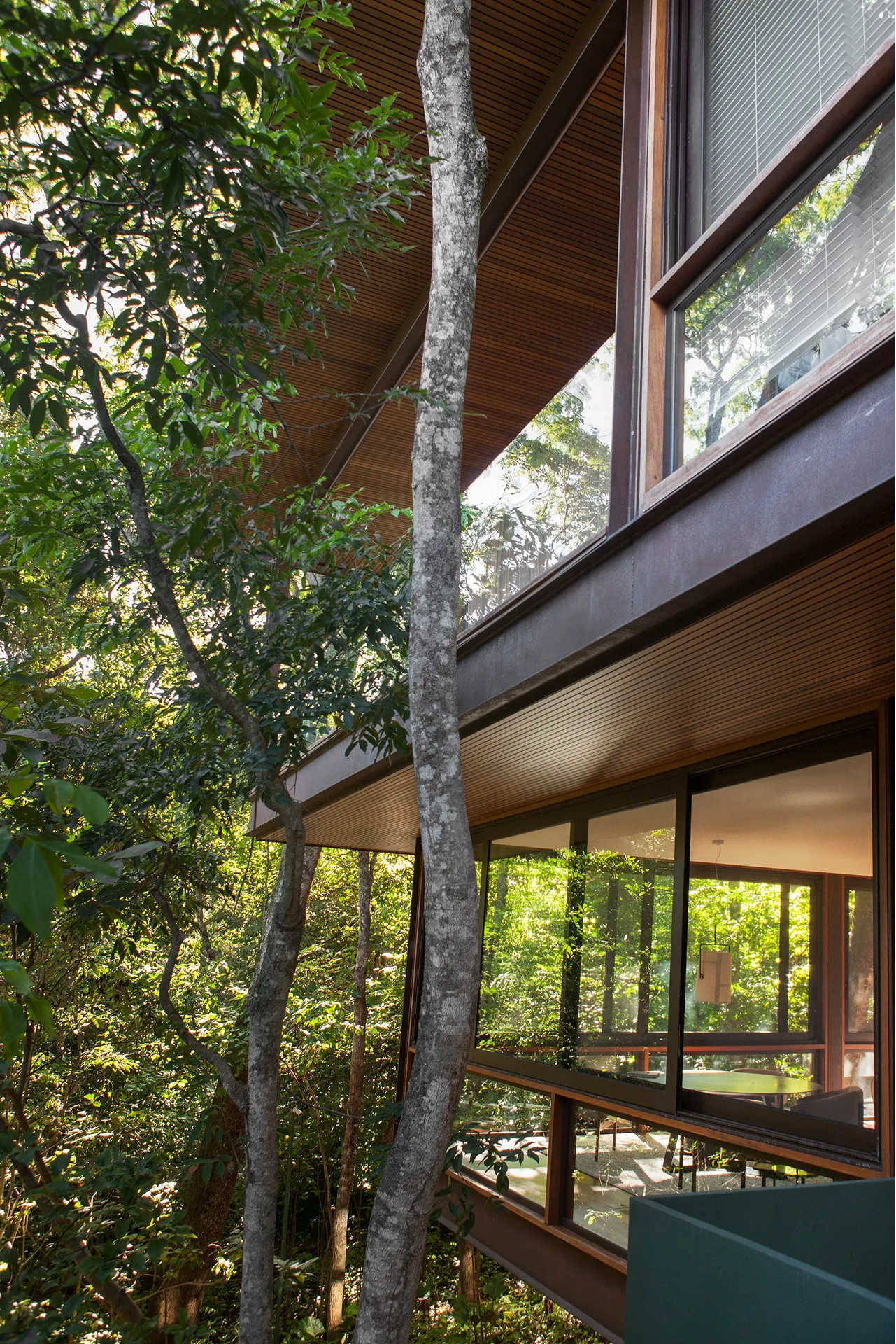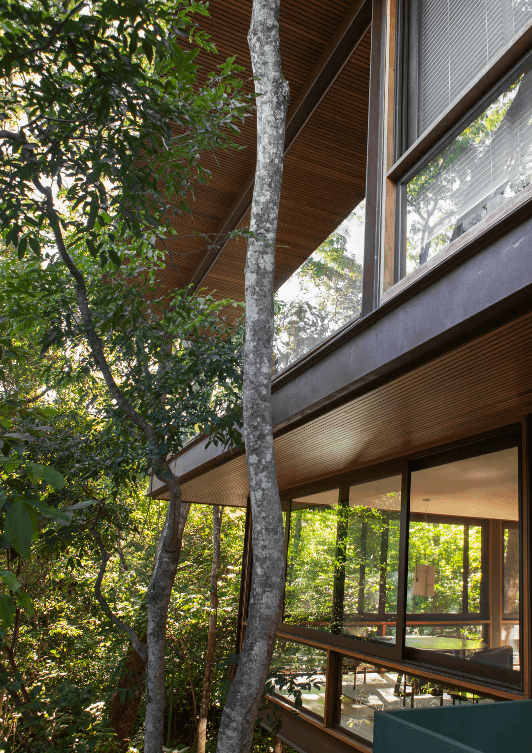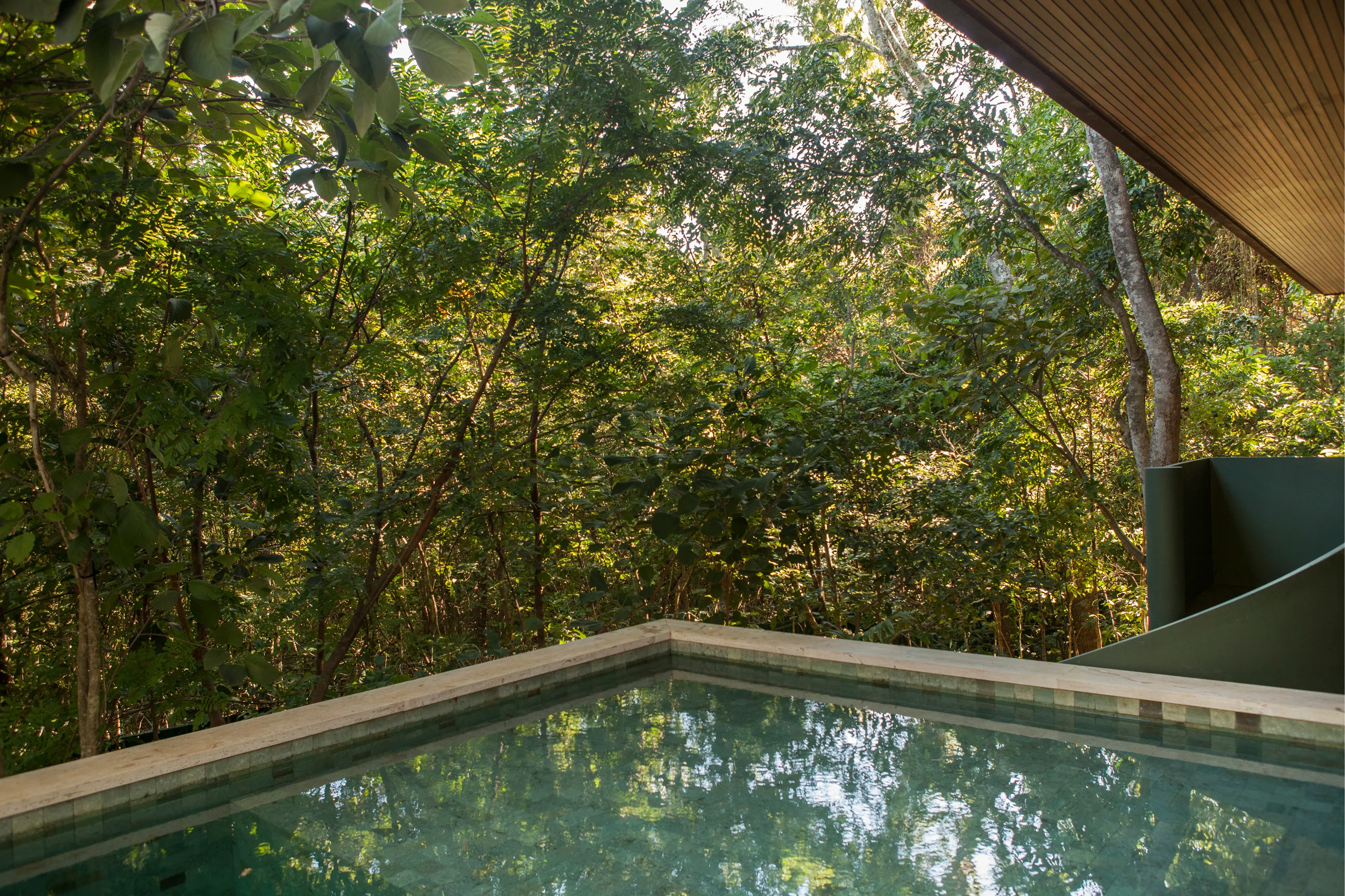 Uma das características mais marcantes do projeto é a piscina, que atravessa o coração da casa. Esta piscina não só serve como um refúgio refrescante, mas também como um mezanino para a floresta.