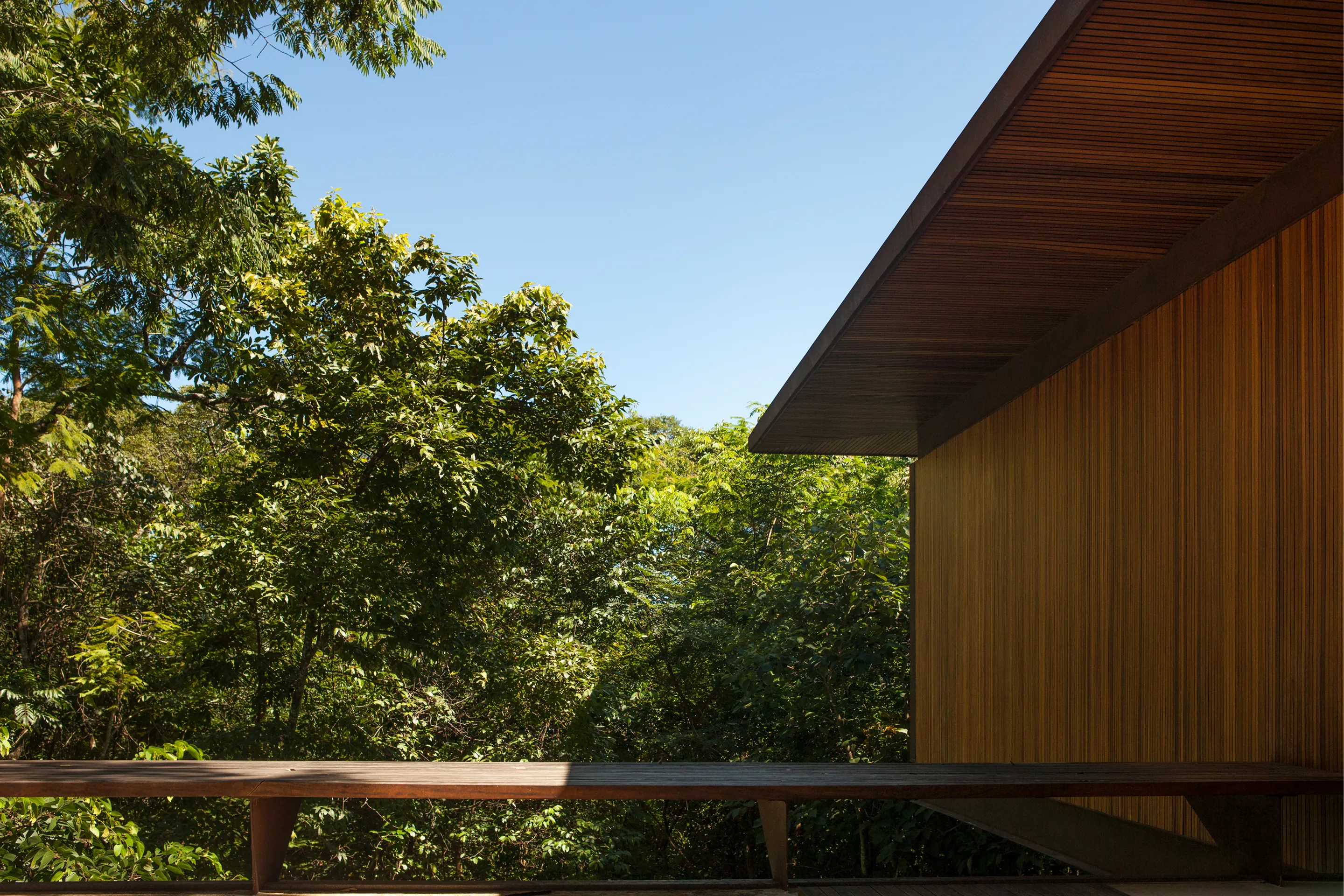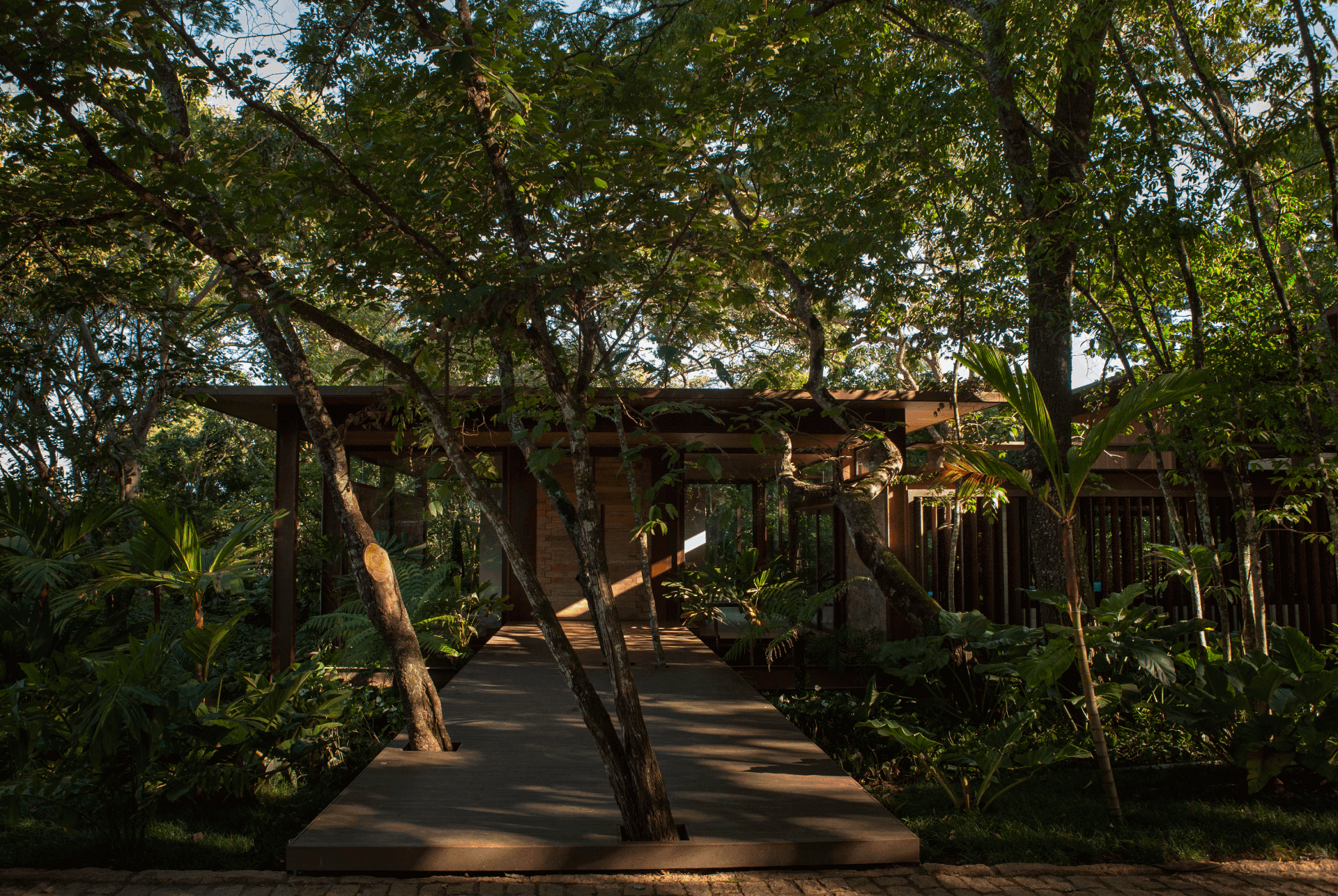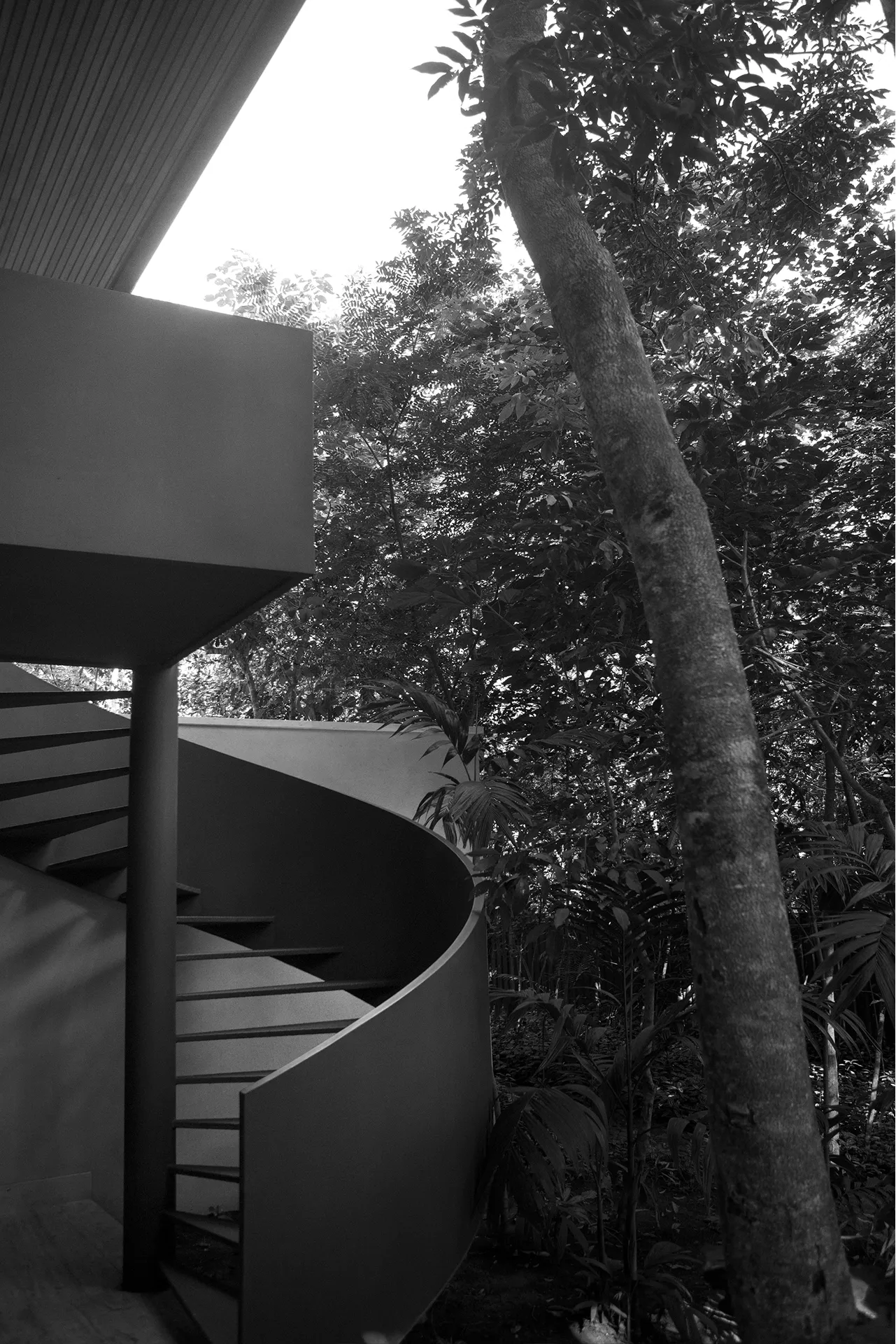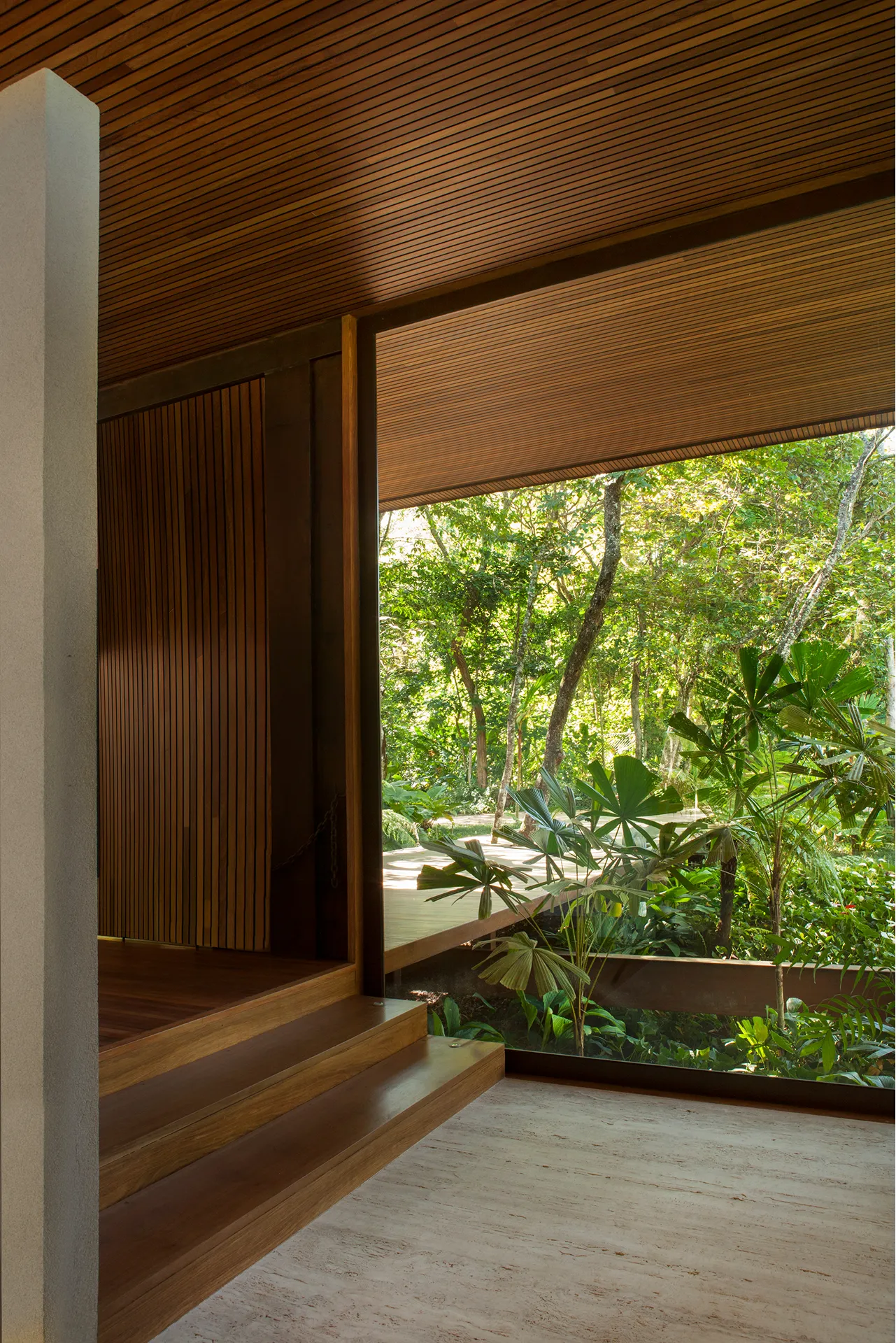 Uma das características mais marcantes do projeto é a piscina, que atravessa o coração da casa. Esta piscina não só serve como um refúgio refrescante, mas também como um mezanino para a floresta.