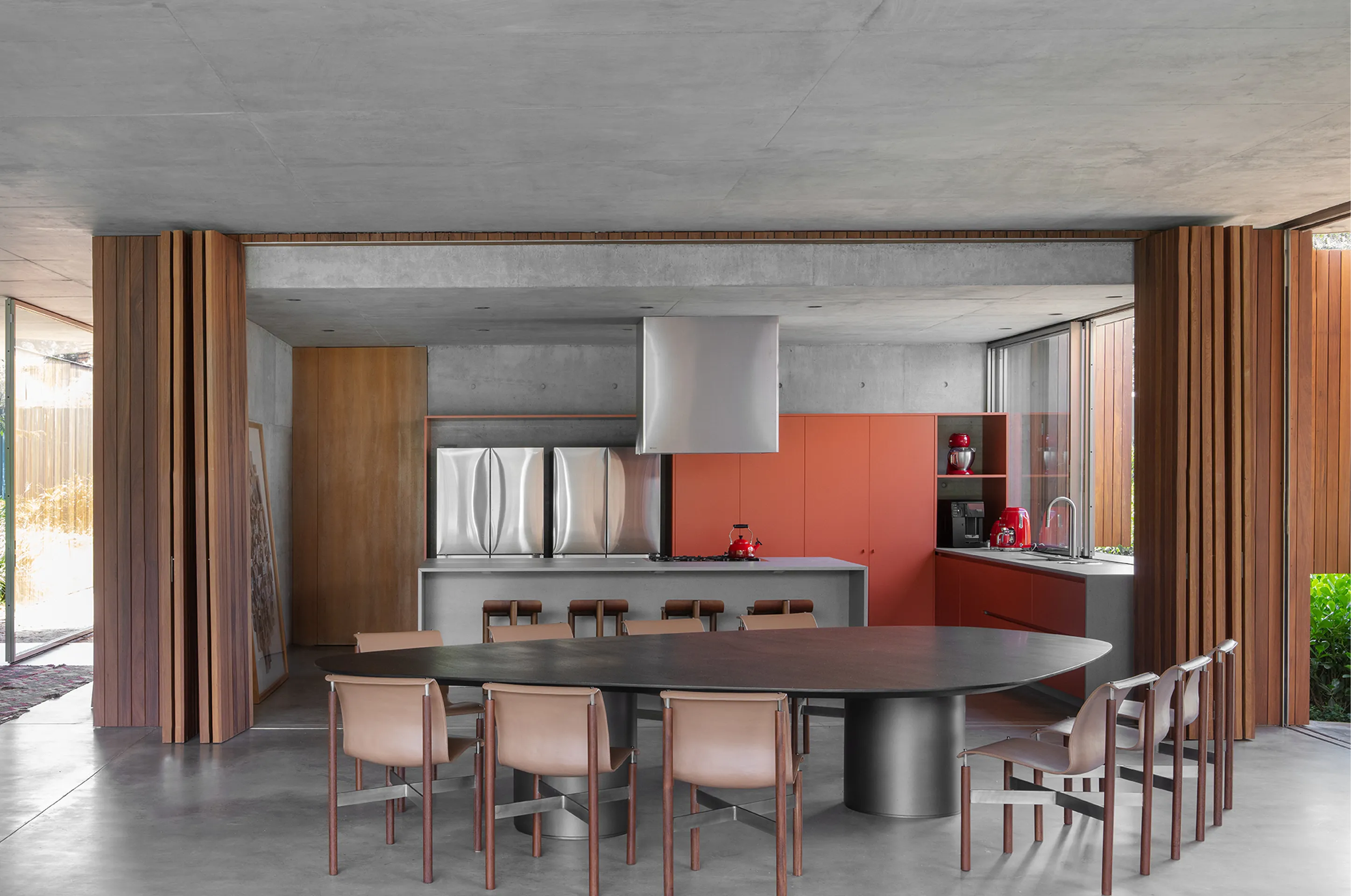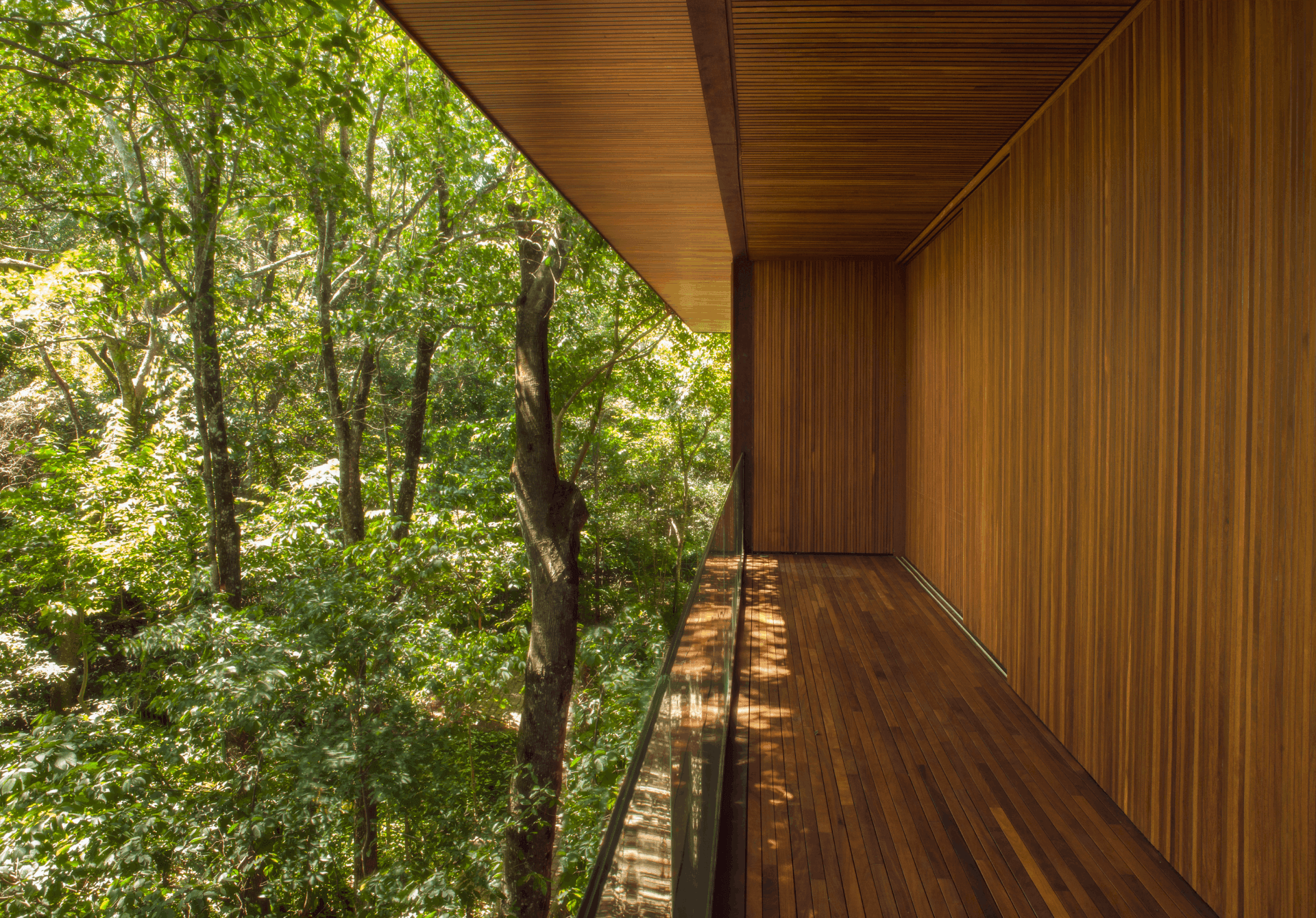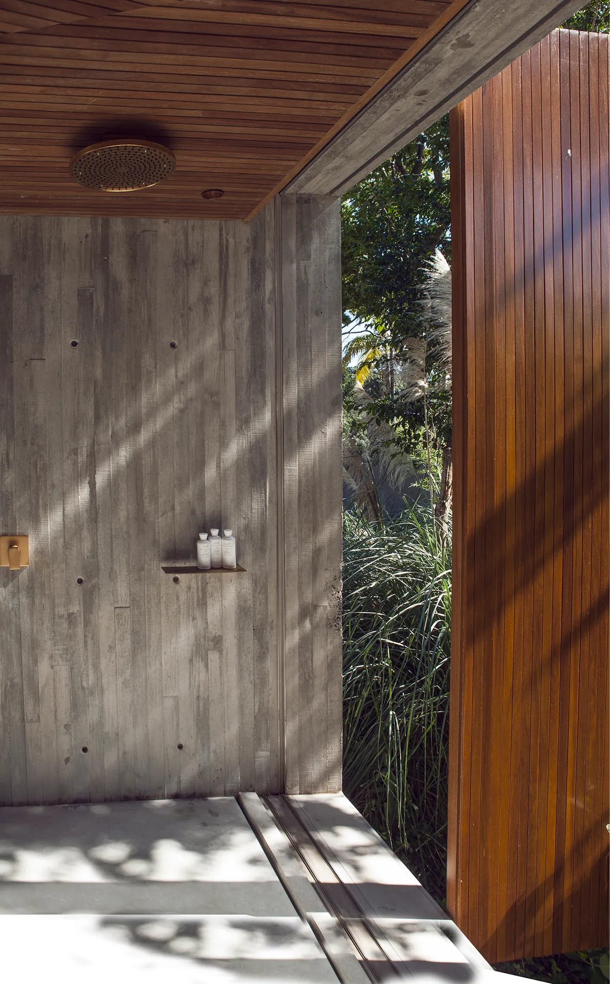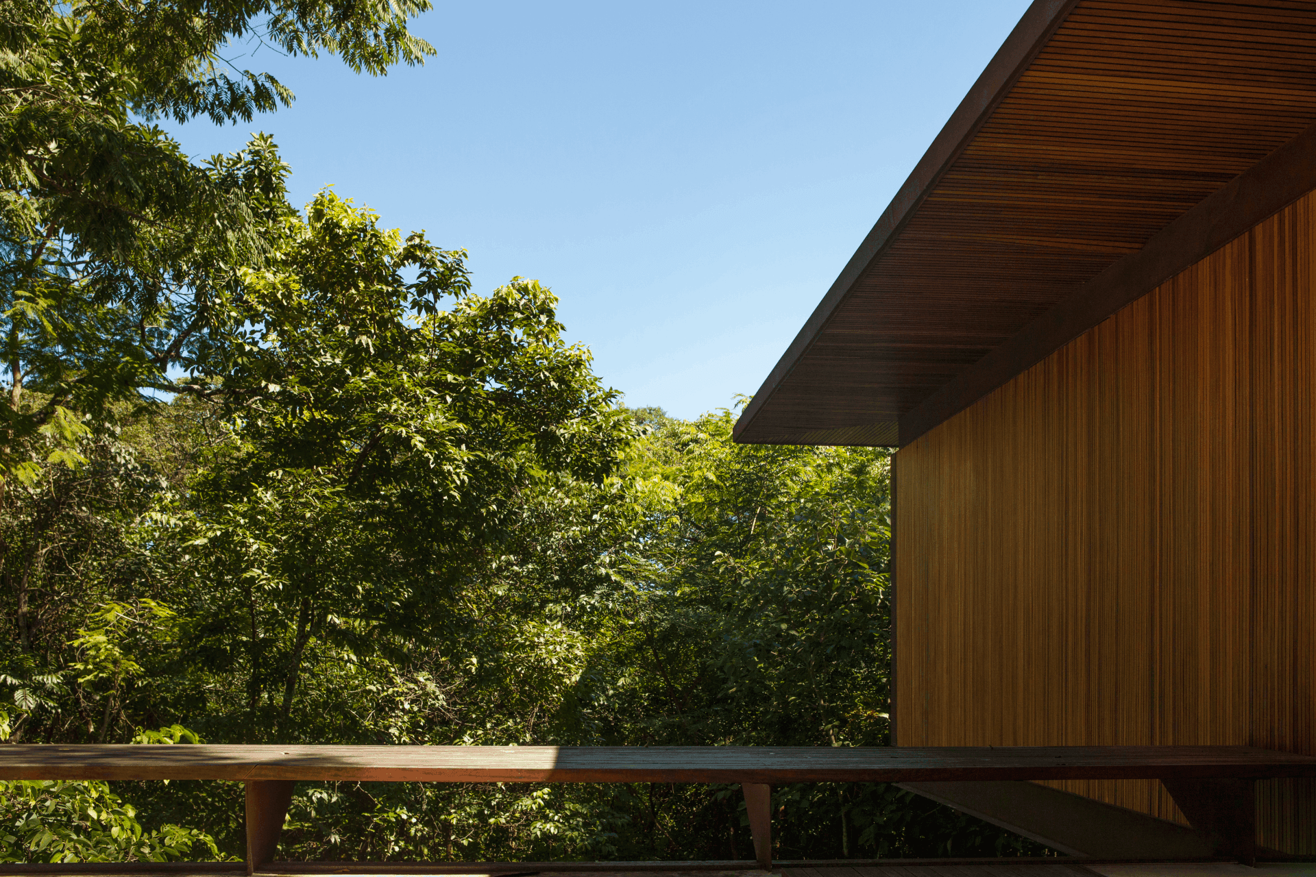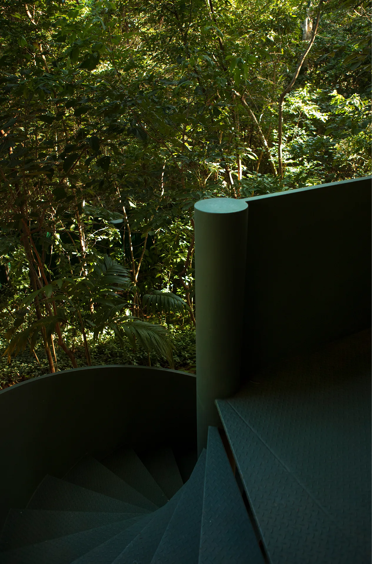 Uma das características mais marcantes do projeto é a piscina, que atravessa o coração da casa. Esta piscina não só serve como um refúgio refrescante, mas também como um mezanino para a floresta.