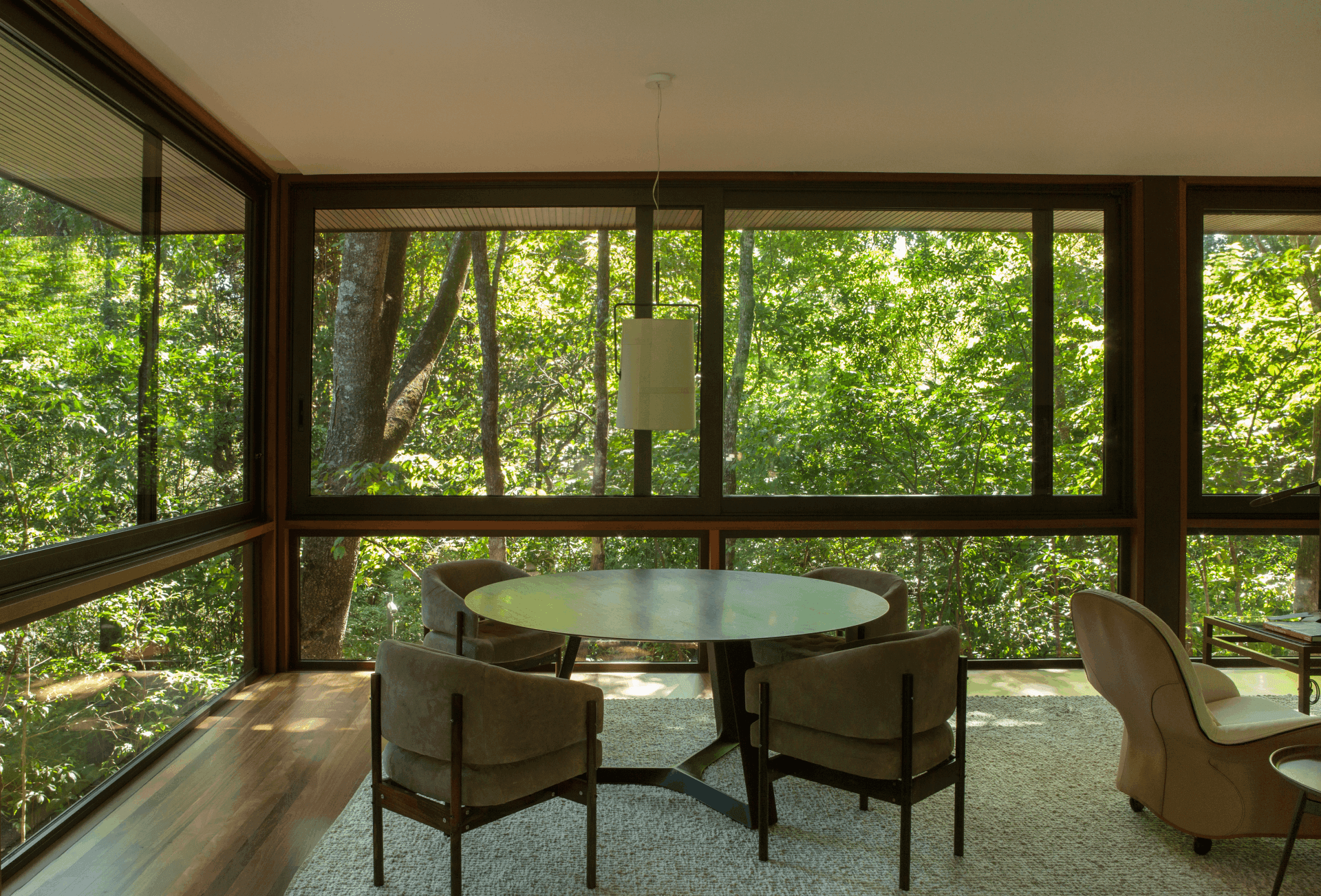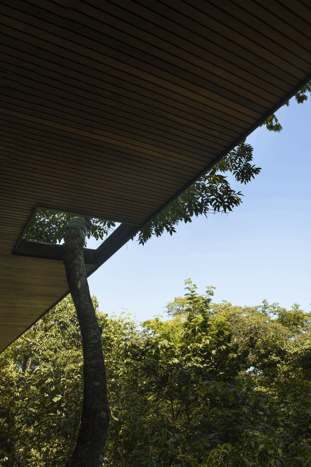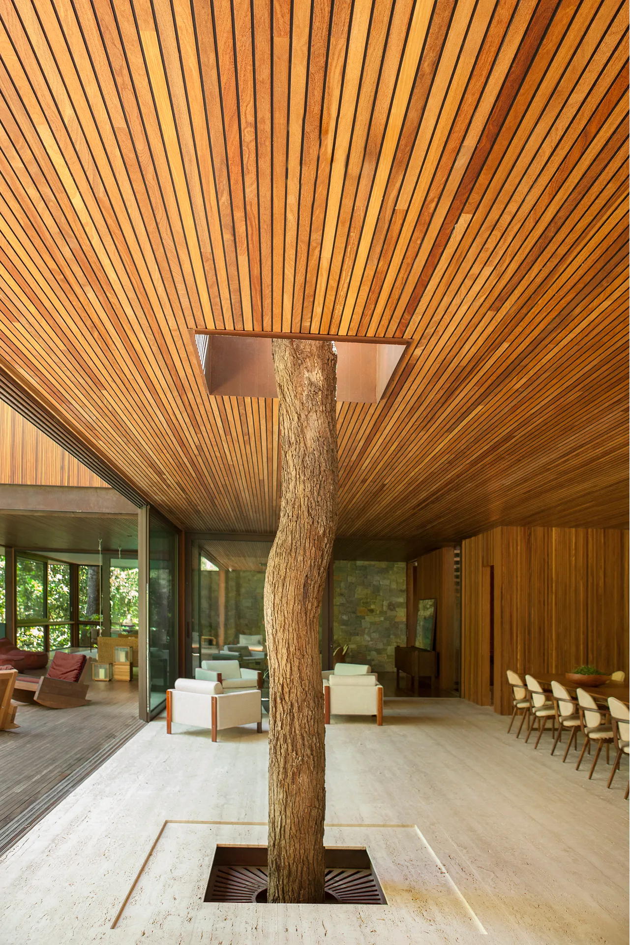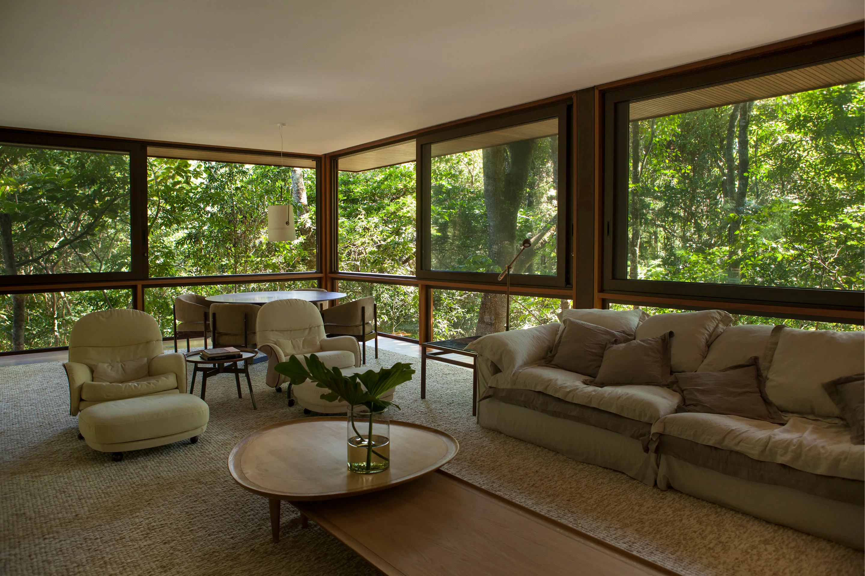 As árvores nativas pontuam os interiores, criando esculturas vivas que mudam com as estações, integrando ainda mais a casa à floresta.