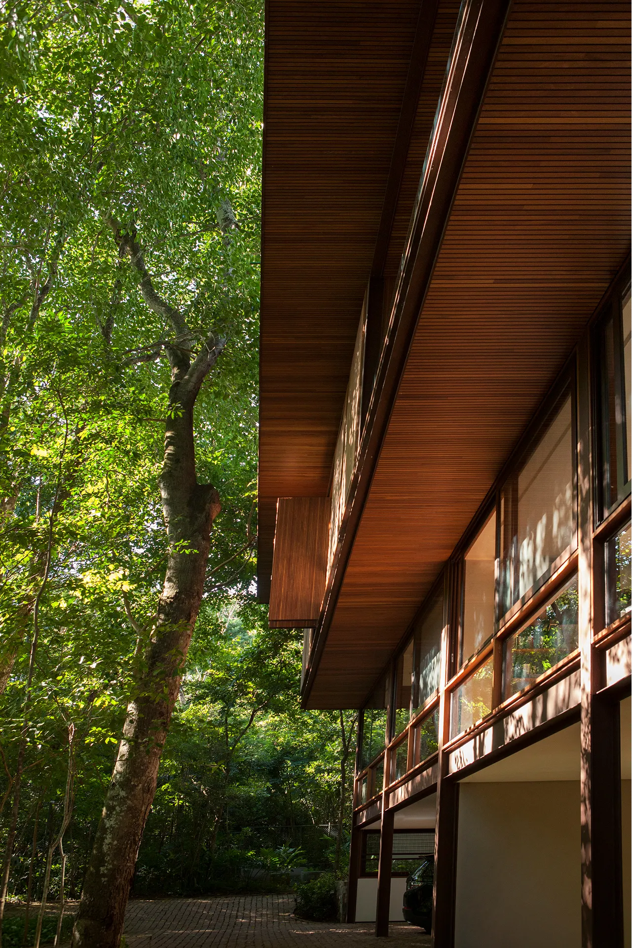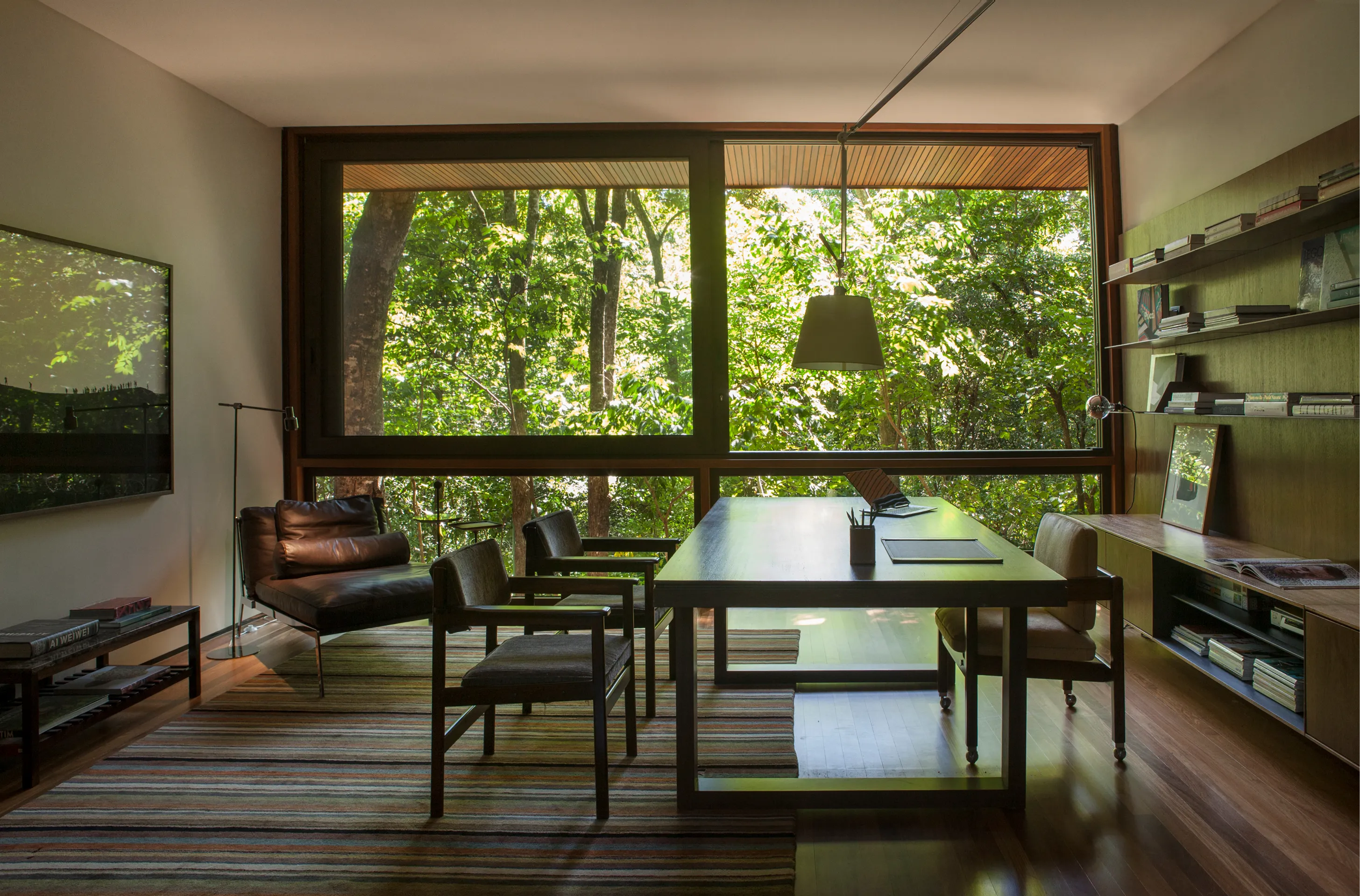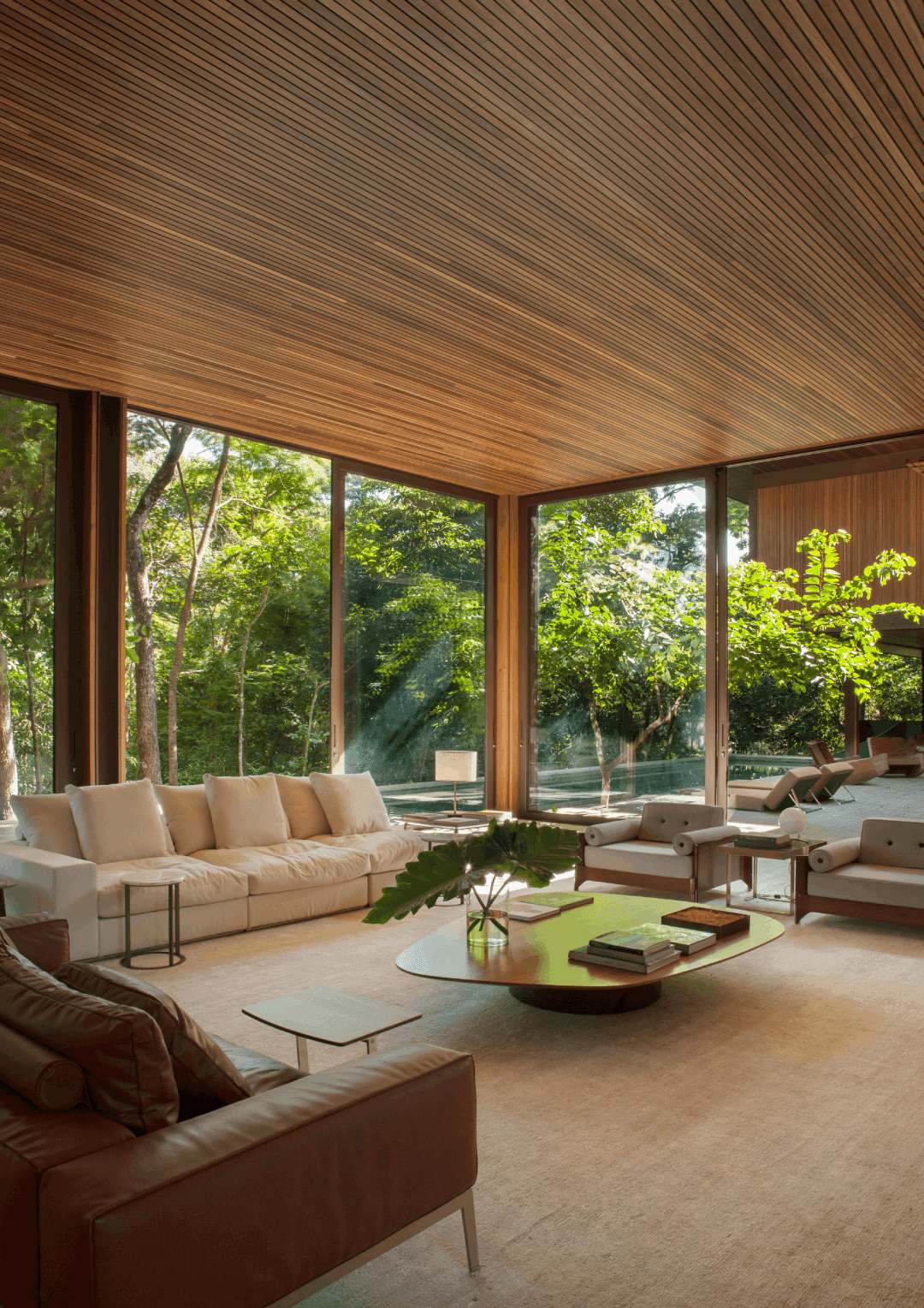As árvores nativas pontuam os interiores, criando esculturas vivas que mudam com as estações, integrando ainda mais a casa à floresta.