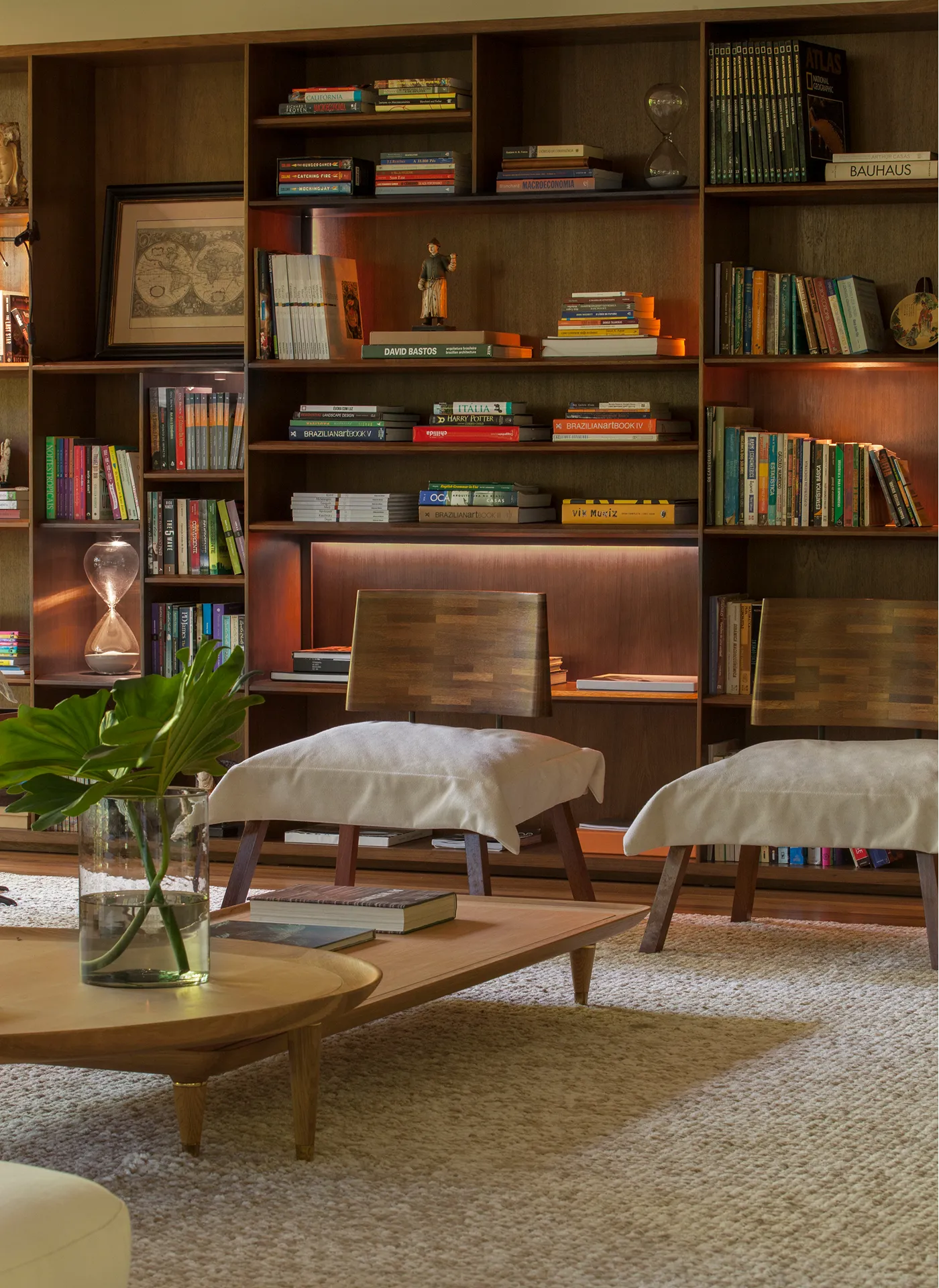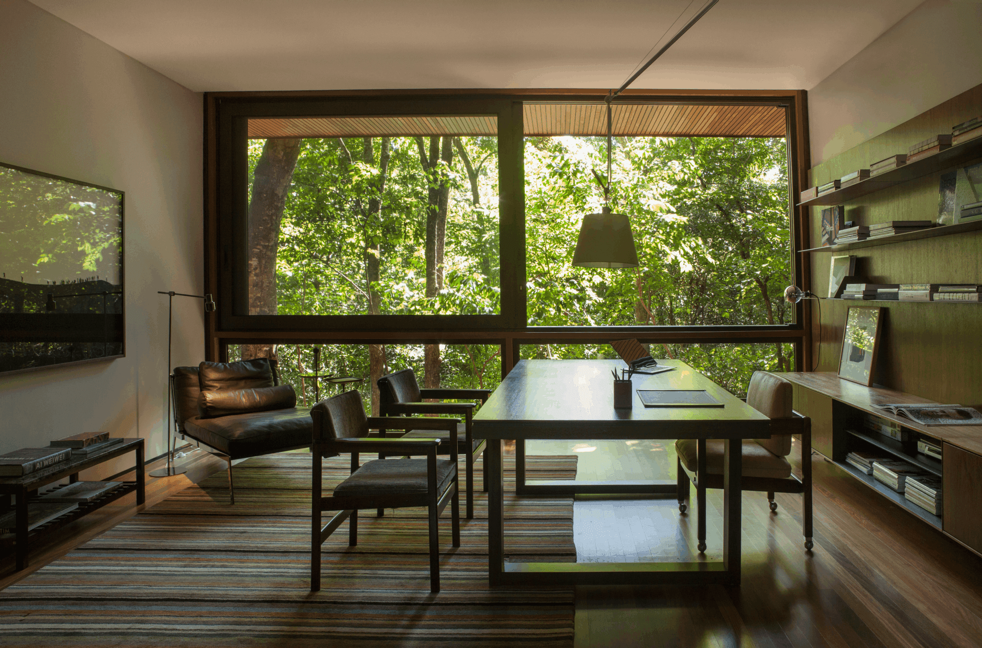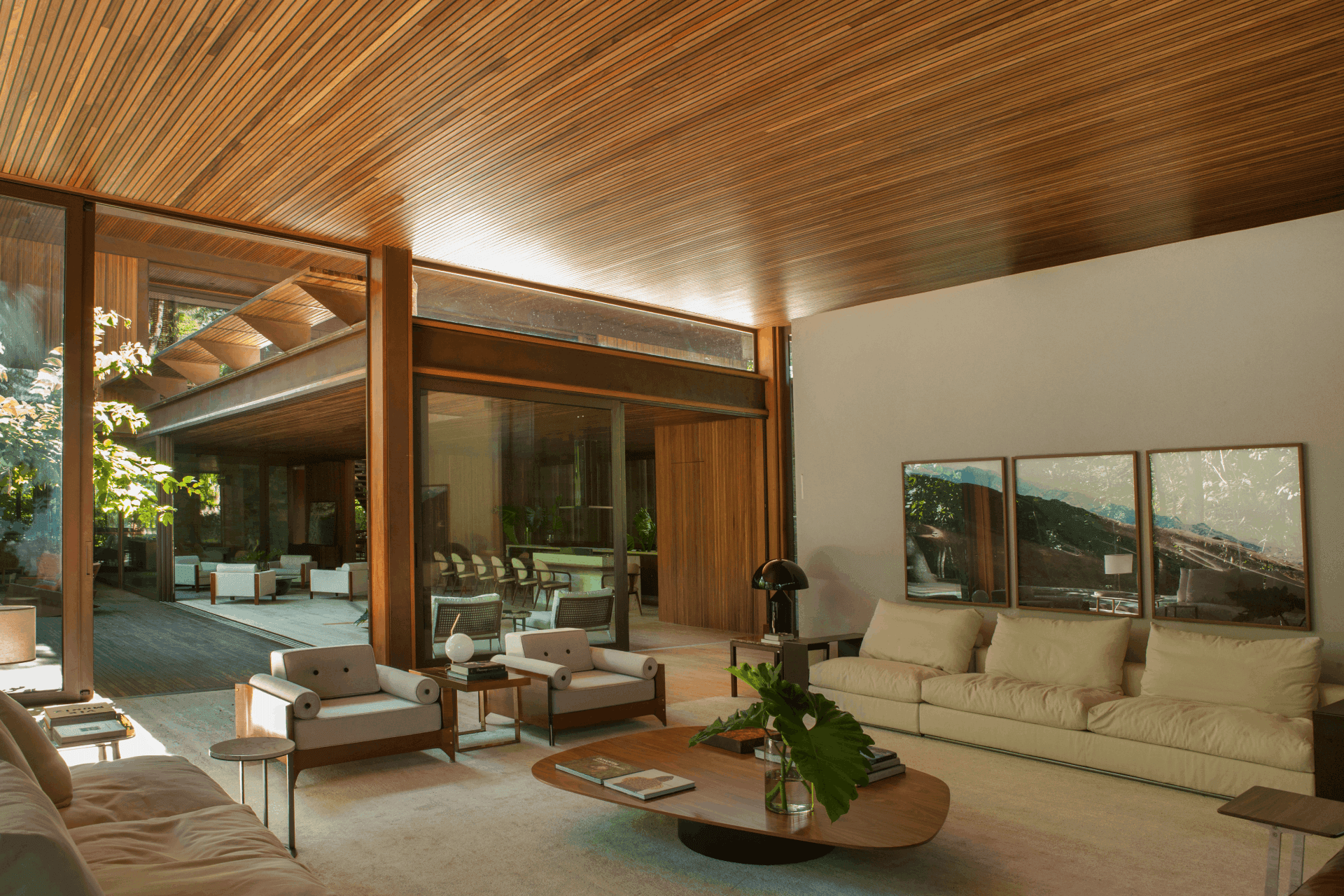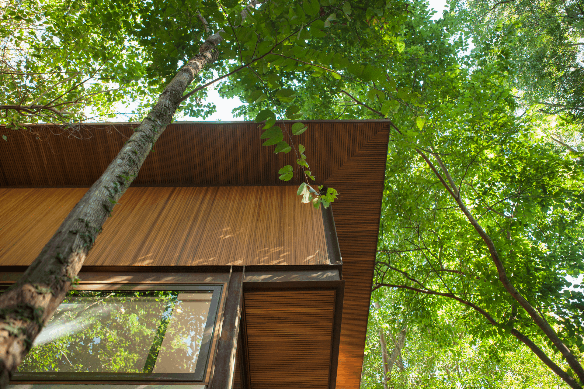 As árvores nativas pontuam os interiores, criando esculturas vivas que mudam com as estações, integrando ainda mais a casa à floresta.