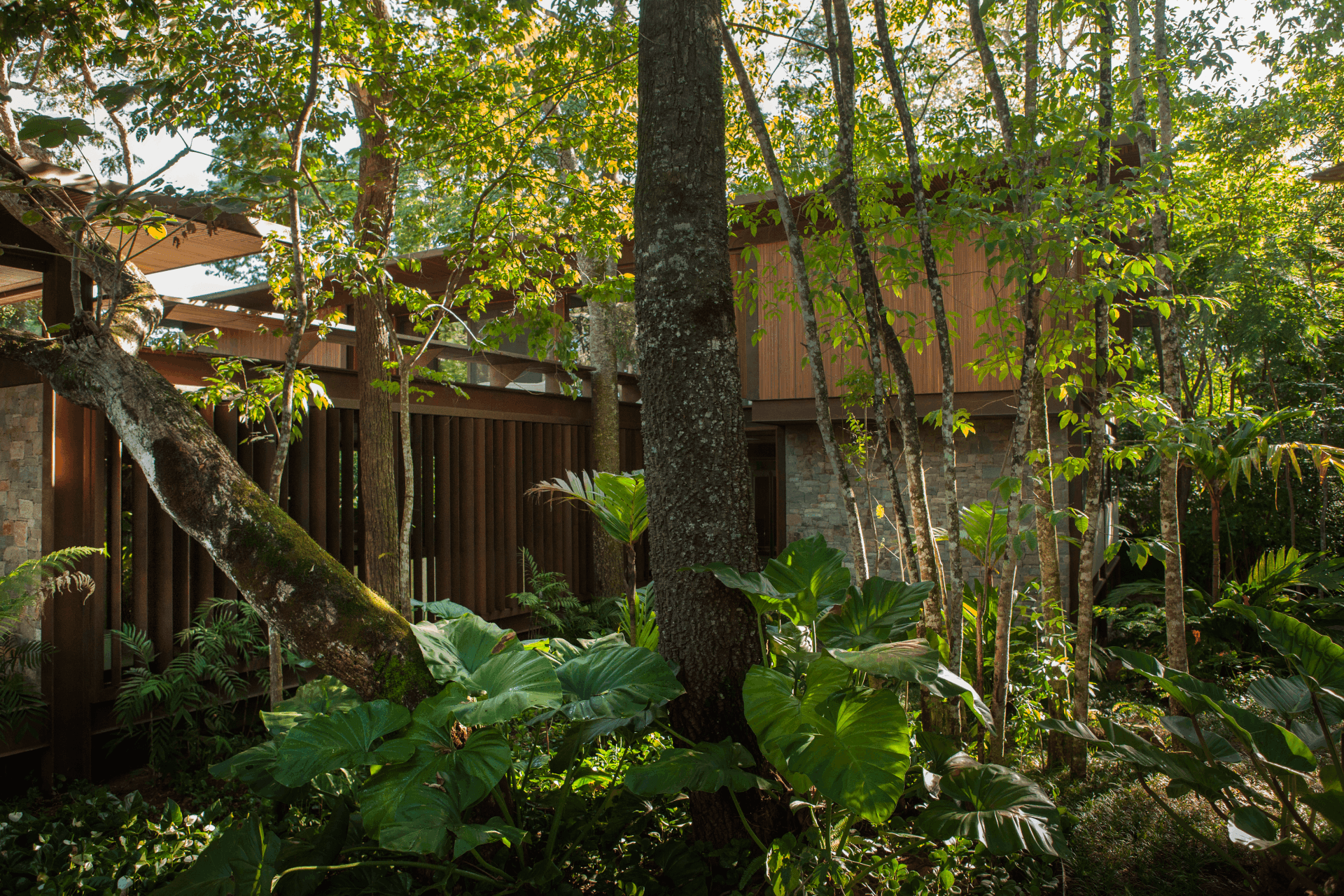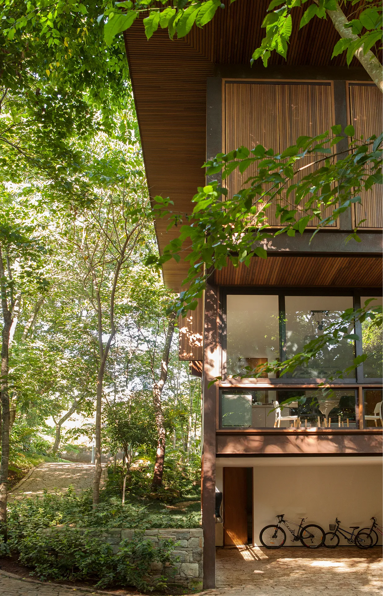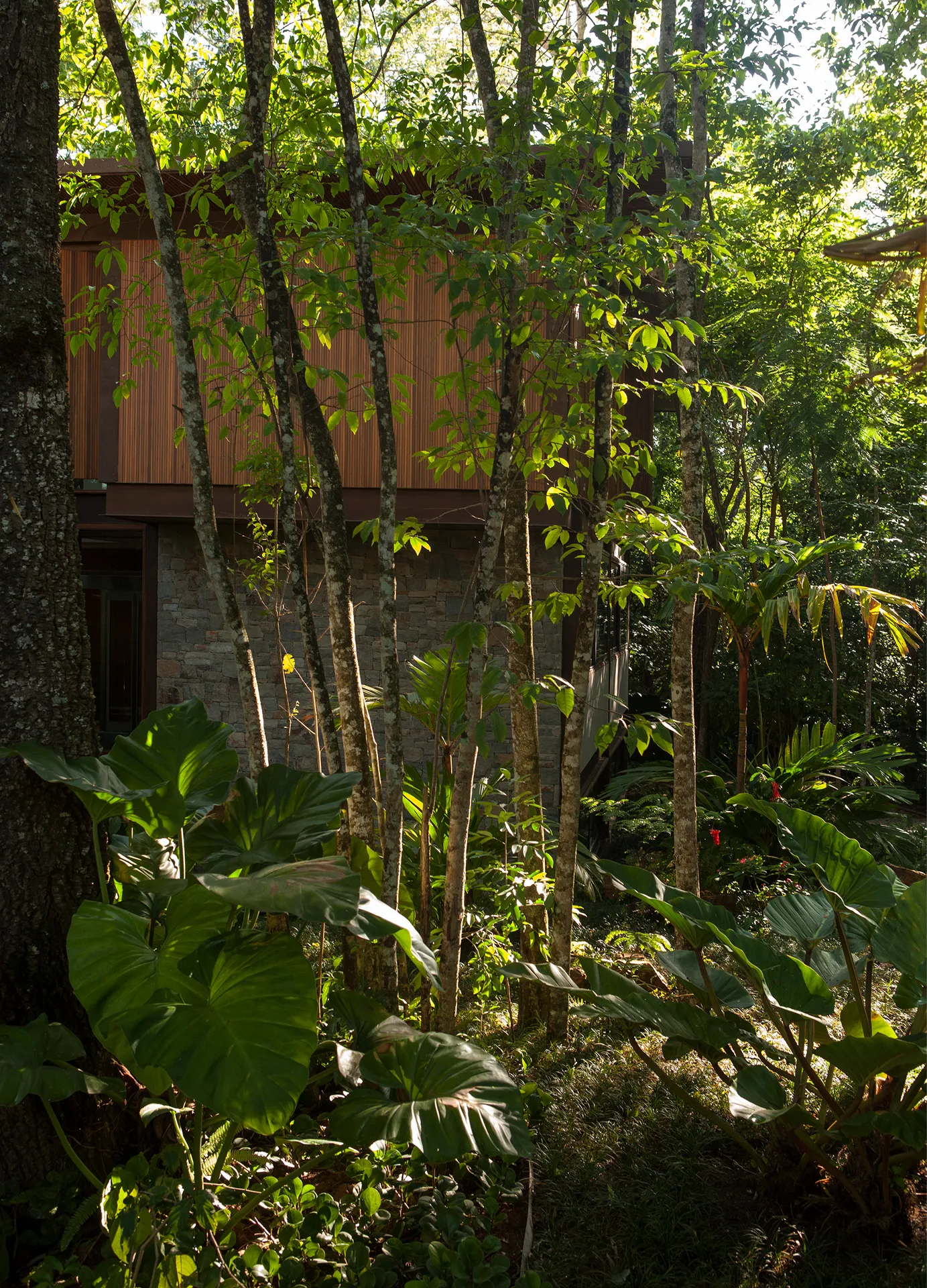 Aninhada na floresta, esta casa de três andares foi projetada com profundo respeito pela paisagem nativa. A arquitetura abraça o ambiente natural, com árvores maduras integradas à própria estrutura da casa, criando uma fusão perfeita entre os espaços internos e externos.
