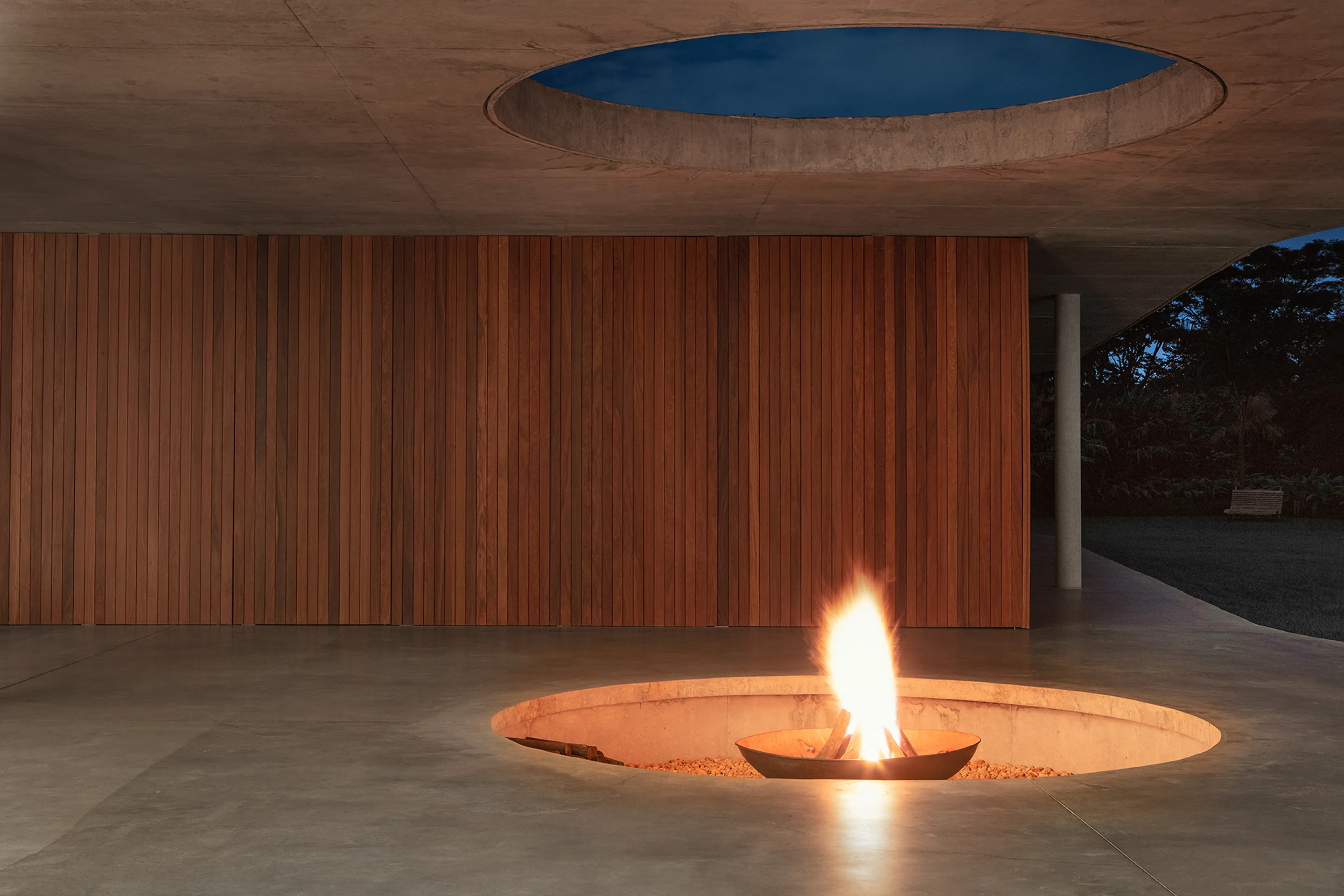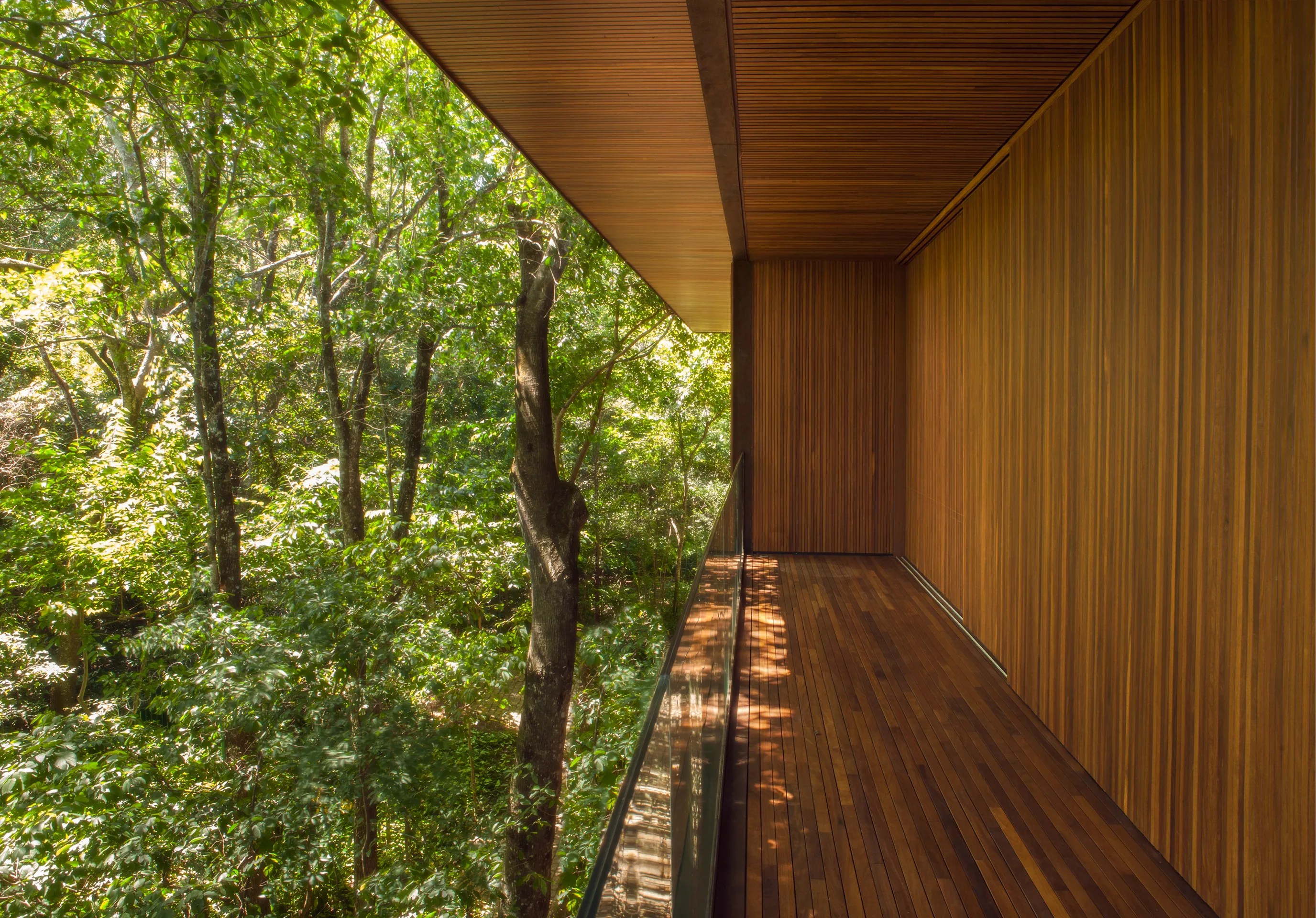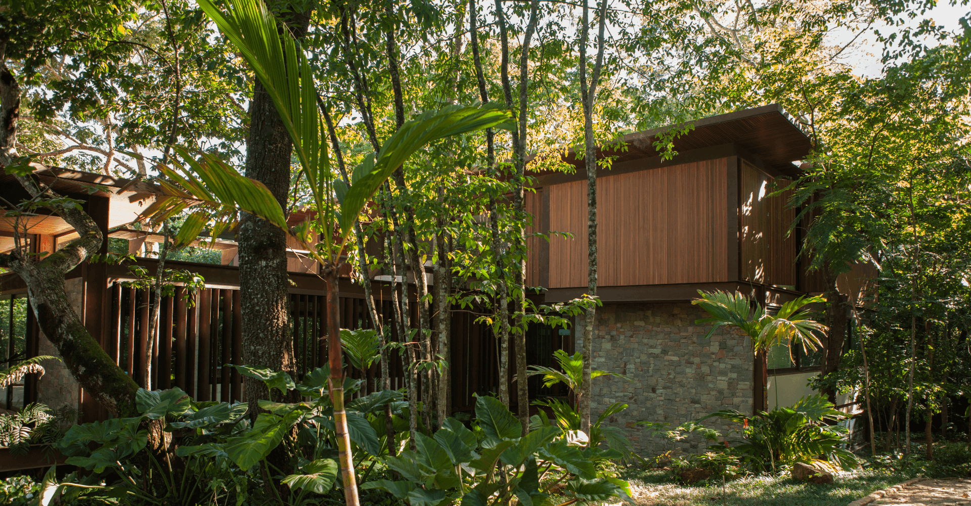 Aninhada na floresta, esta casa de três andares foi projetada com profundo respeito pela paisagem nativa. A arquitetura abraça o ambiente natural, com árvores maduras integradas à própria estrutura da casa, criando uma fusão perfeita entre os espaços internos e externos.