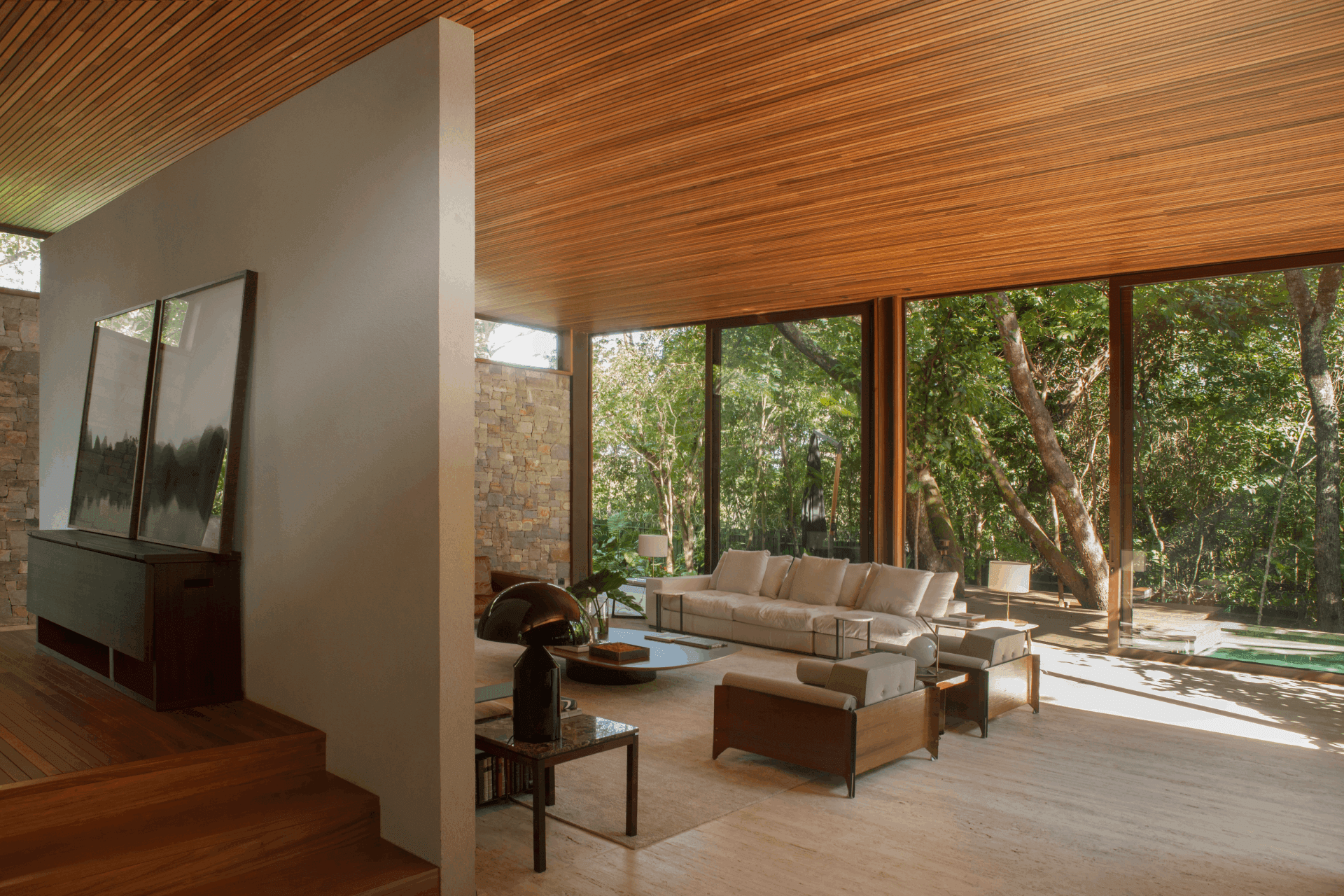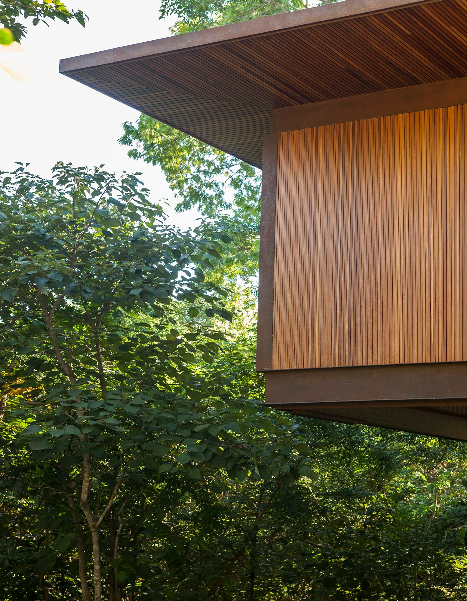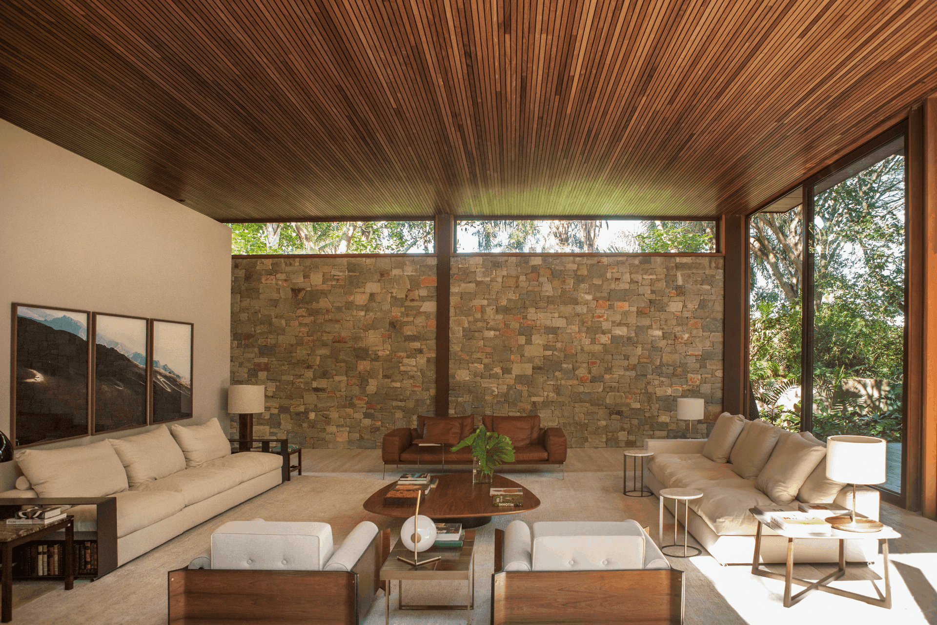 A estrutura de metal, envelopada com madeira e pedra, abre um diálogo entre o ambiente construído e o natural. O uso da estrutura metálica oferece um contraste elegante e moderno às texturas orgânicas da madeira e da pedra, ancorando a casa em seu entorno natural.