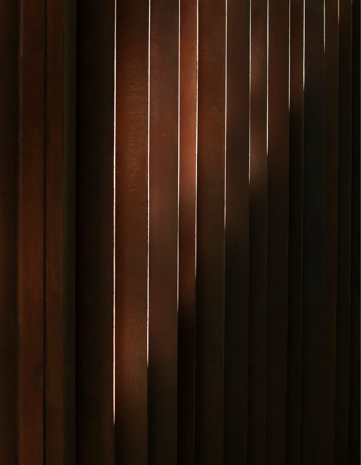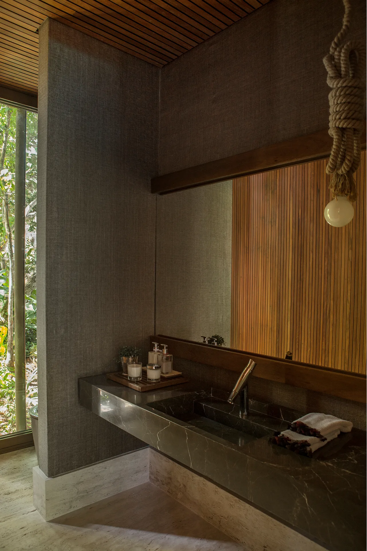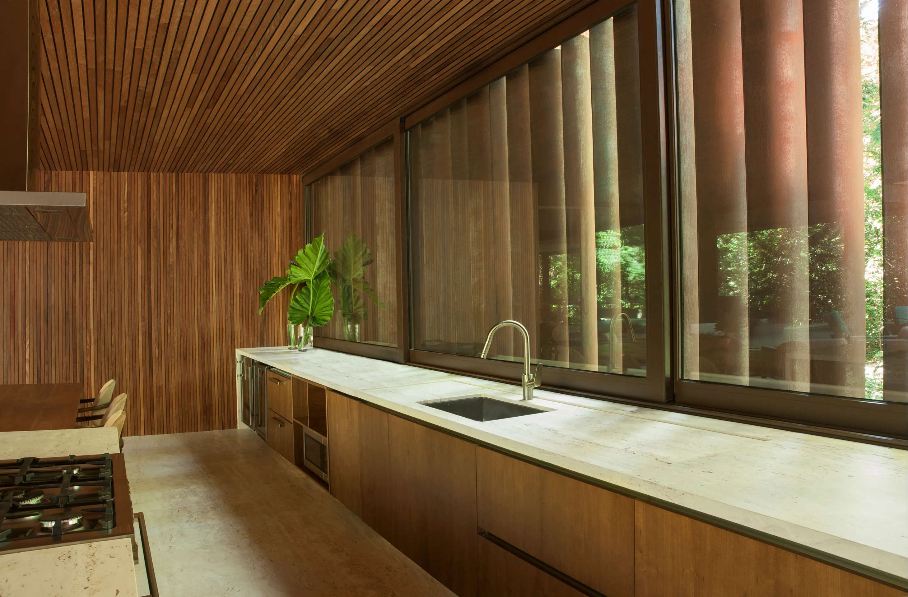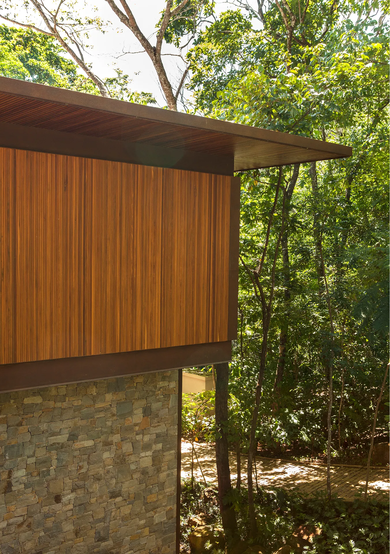 A estrutura de metal, envelopada com madeira e pedra, abre um diálogo entre o ambiente construído e o natural. O uso da estrutura metálica oferece um contraste elegante e moderno às texturas orgânicas da madeira e da pedra, ancorando a casa em seu entorno natural.