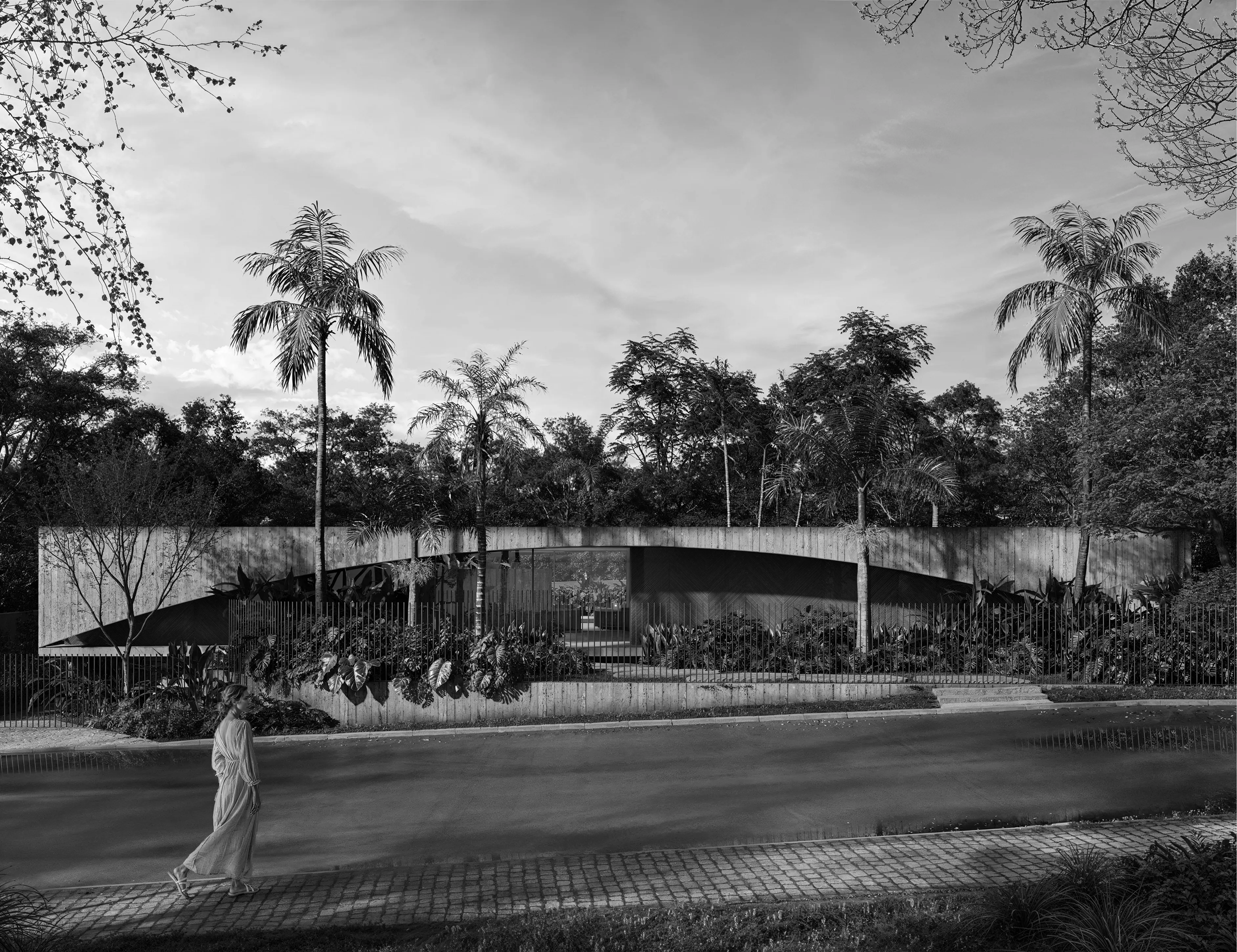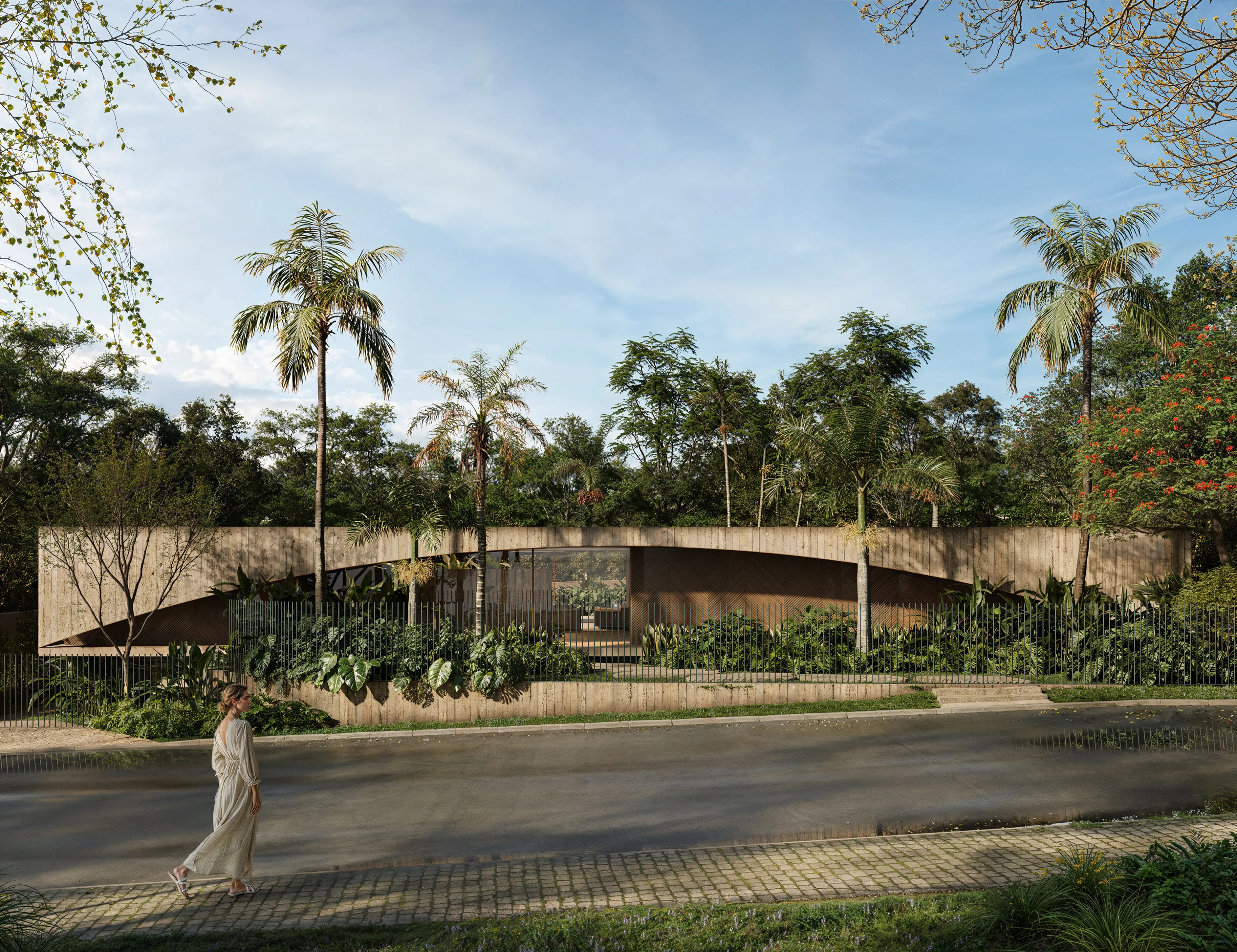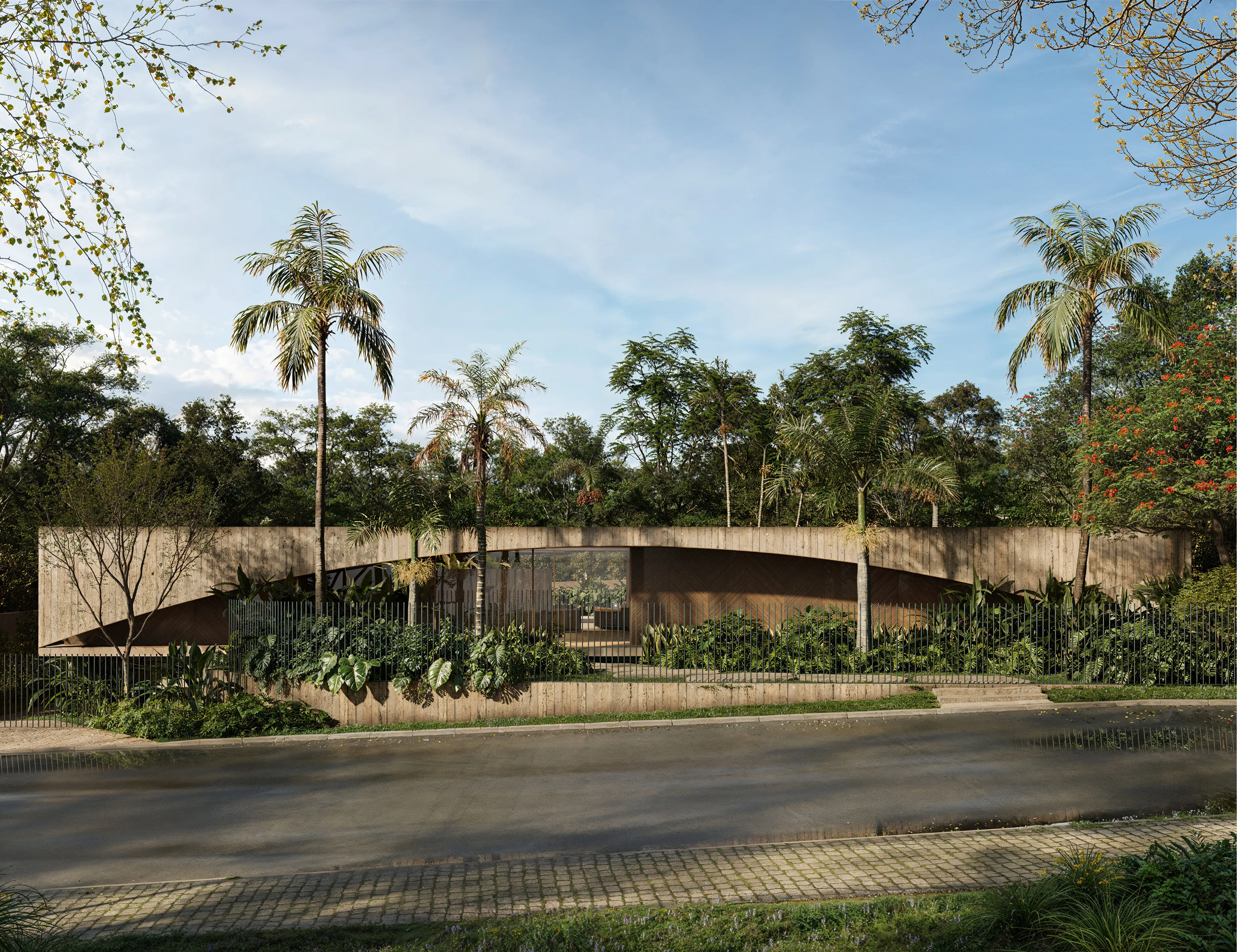 Implantada em um lote generoso no Lago Sul, em Brasília, a Casa GER se organiza a partir de um arco estrutural em concreto armado que define a fachada e direciona o partido arquitetônico. A geometria curva — inspirada nas passagens viárias da cidade — cria um gesto escultórico que combina monumentalidade e leveza, estabelecendo um diálogo entre infraestrutura urbana e habitação.
