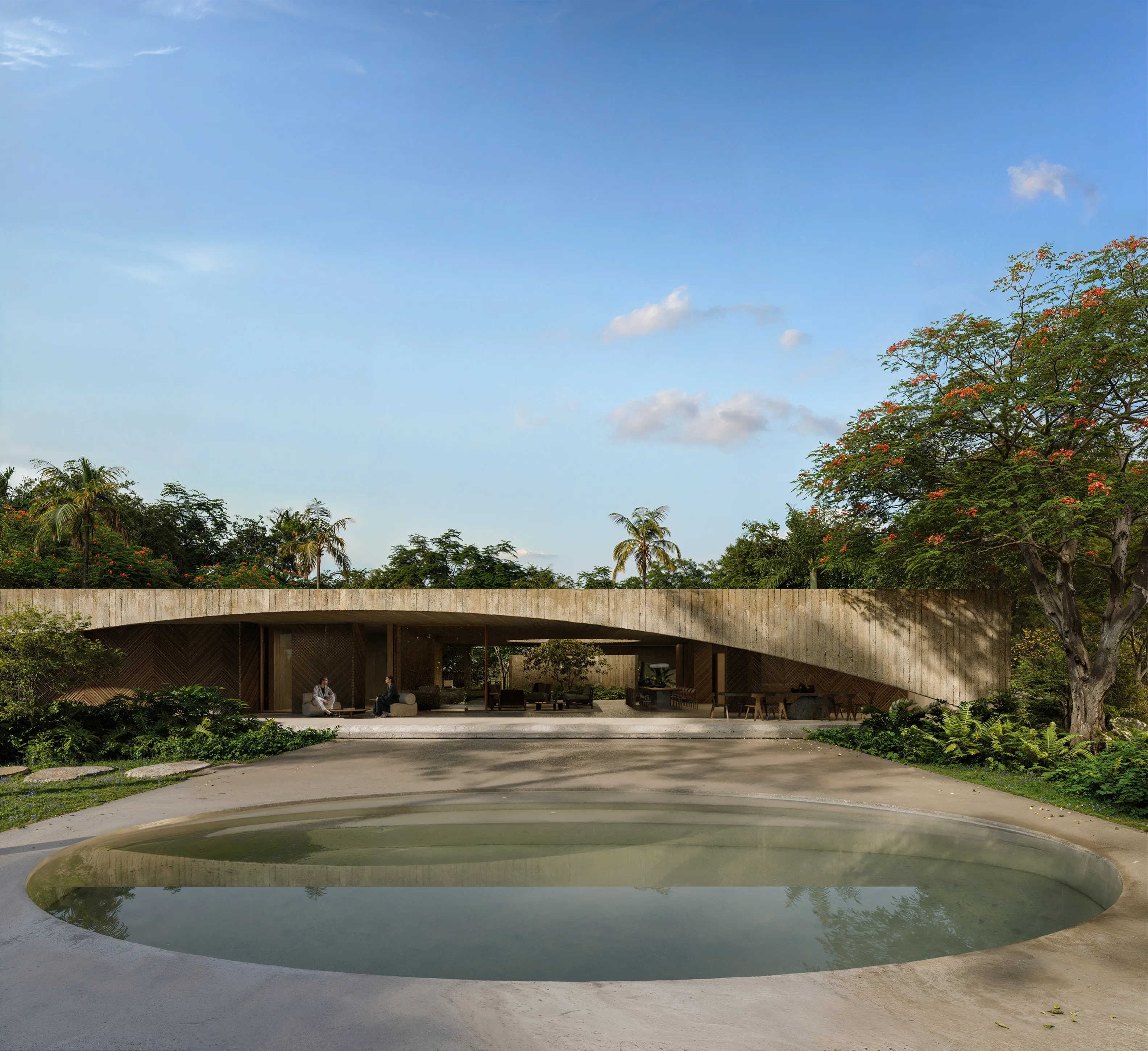 Sob o arco, painéis de madeira e amplas esquadrias garantem controle climático, ventilação cruzada e conexão com os jardins tropicais que envolvem a residência. No interior, um pátio central arborizado recebe luz natural por meio de um rasgo circular na laje, criando um espaço de transição entre os ambientes de estar e o exterior.