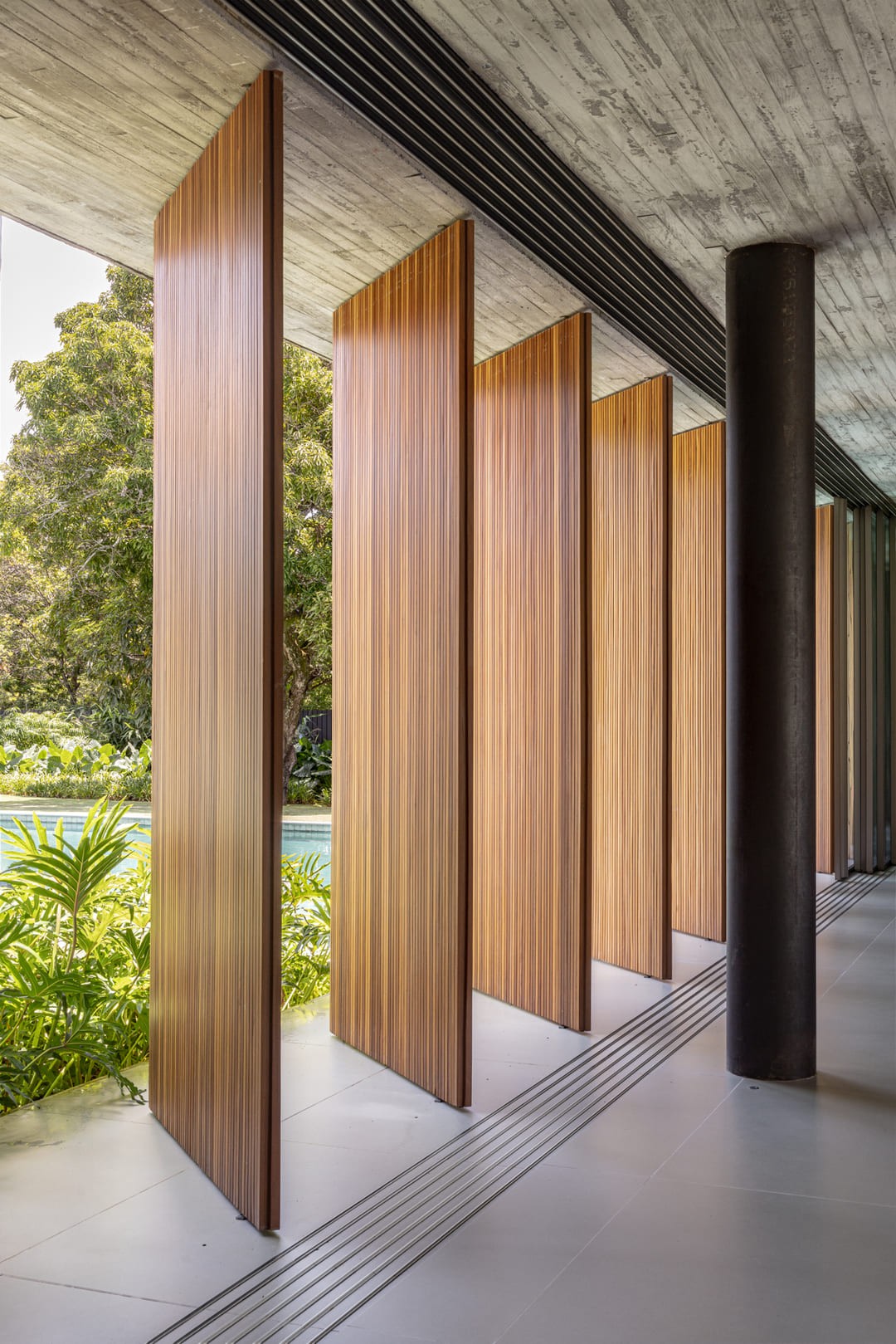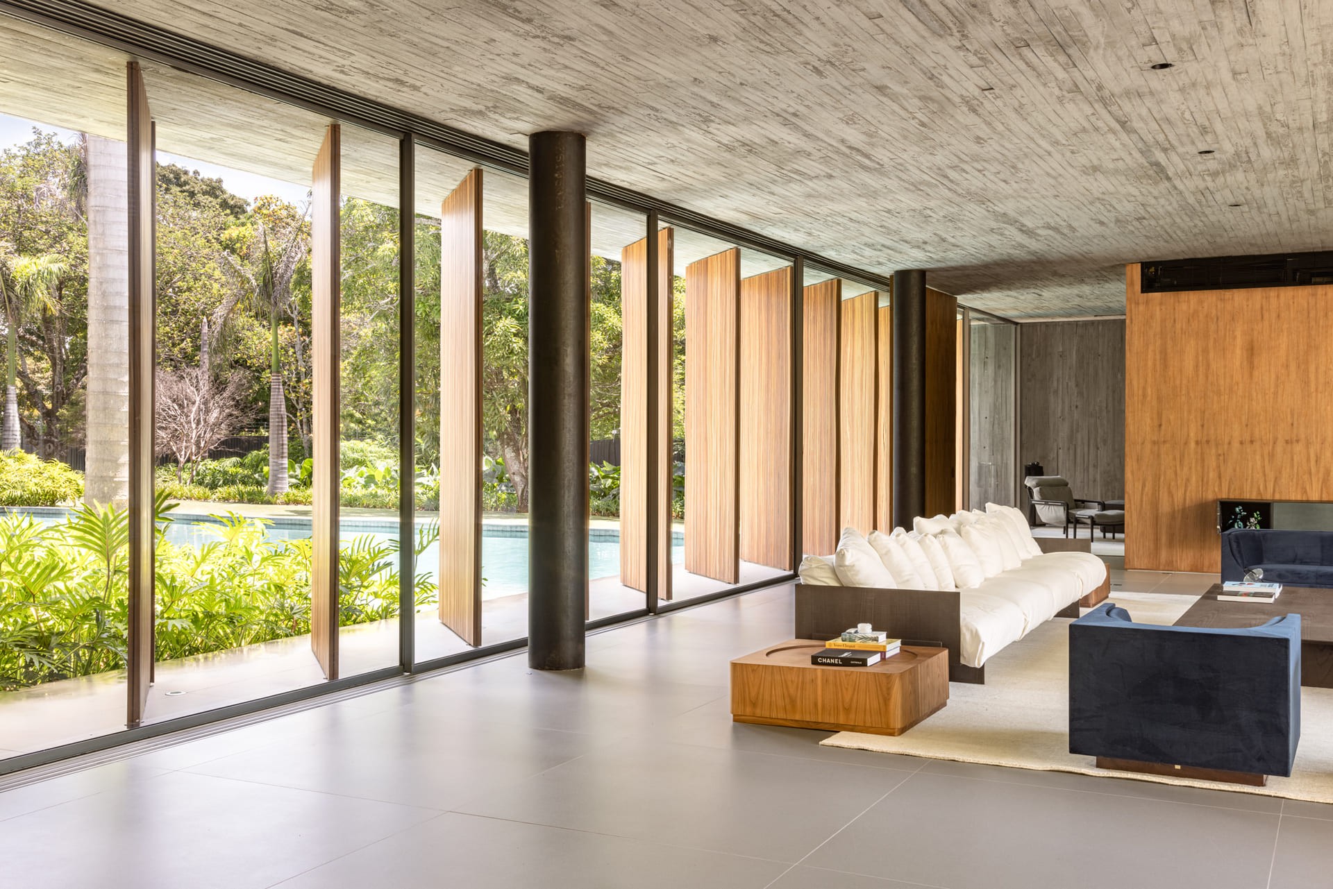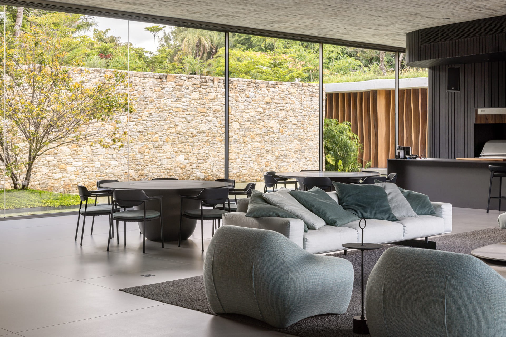 Os materiais foram escolhidos com rigor: pedra, madeira, vidro e concreto compõem uma paleta reduzida e elegante. Esquadrias piso-teto garantem permeabilidade visual entre interior e paisagem, enquanto painéis pivotantes de madeira maciça introduzem privacidade e controle térmico. A água — presente em espelhos d’água e na piscina linear — reforça a sensação de refúgio e conforto térmico.