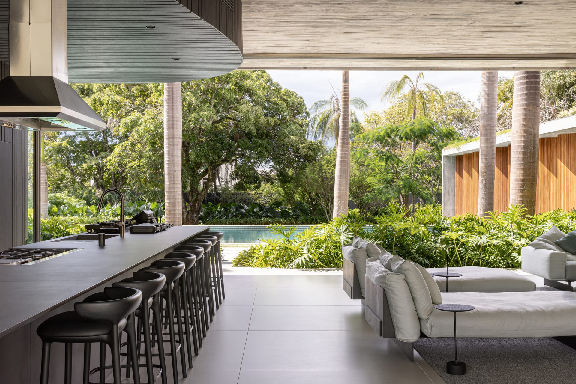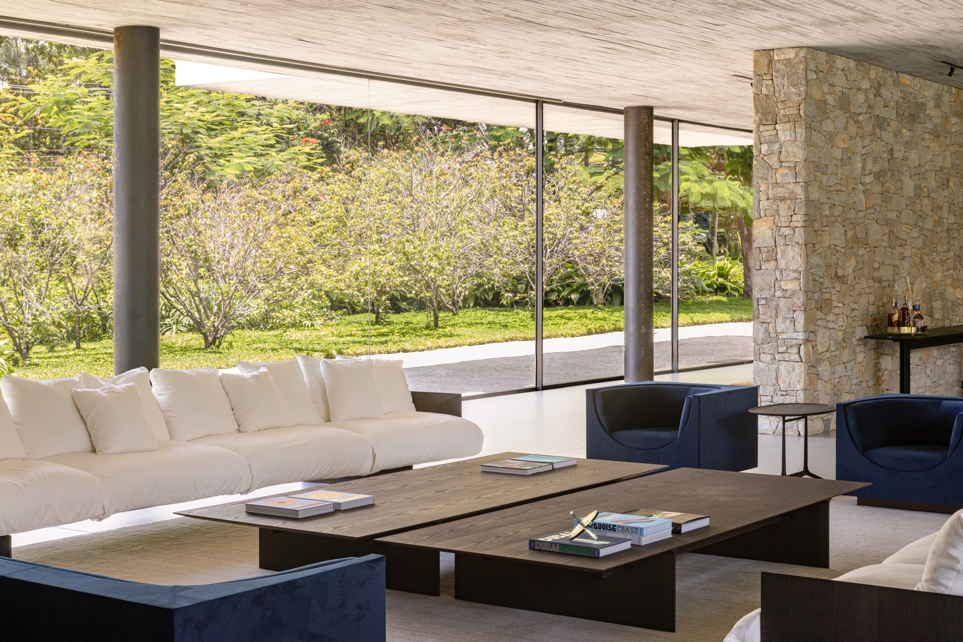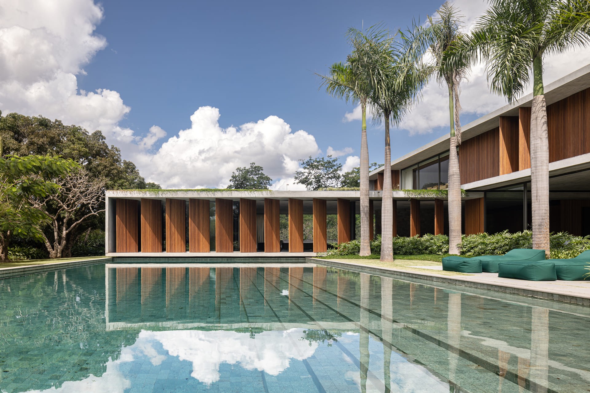 Os materiais foram escolhidos com rigor: pedra, madeira, vidro e concreto compõem uma paleta reduzida e elegante. Esquadrias piso-teto garantem permeabilidade visual entre interior e paisagem, enquanto painéis pivotantes de madeira maciça introduzem privacidade e controle térmico. A água — presente em espelhos d’água e na piscina linear — reforça a sensação de refúgio e conforto térmico.