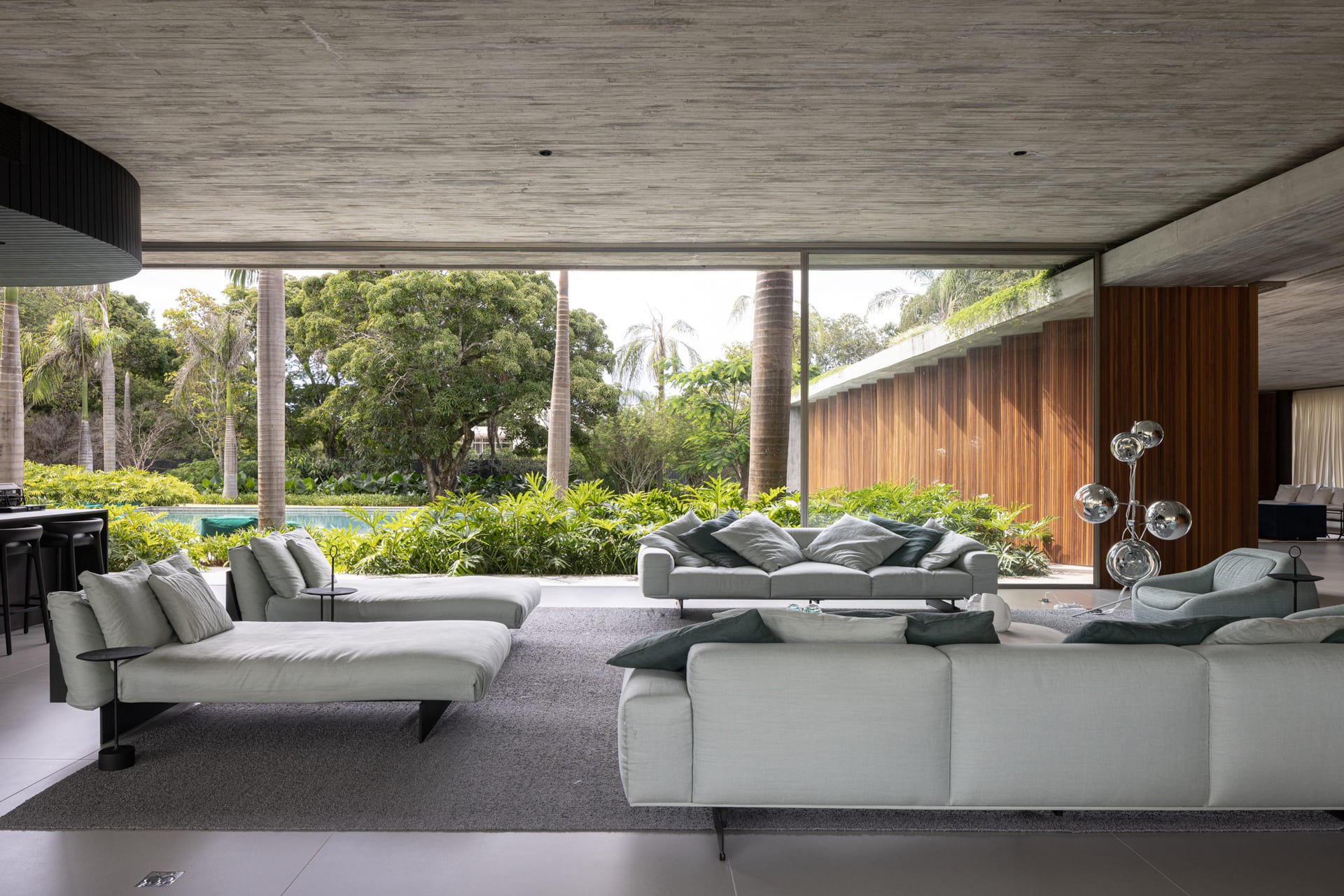A organização funcional distribui os usos com clareza: o bloco social abriga estar, jantar e gourmet com acesso direto ao jardim, enquanto o bloco de serviço garante suporte e discrição. Escadas ocultas conectam o térreo às áreas íntimas no pavimento superior e à apartamento de visitas no subsolo, desenhando uma residência que privilegia a integração entre arquitetura e paisagem.