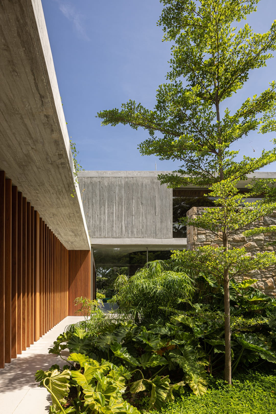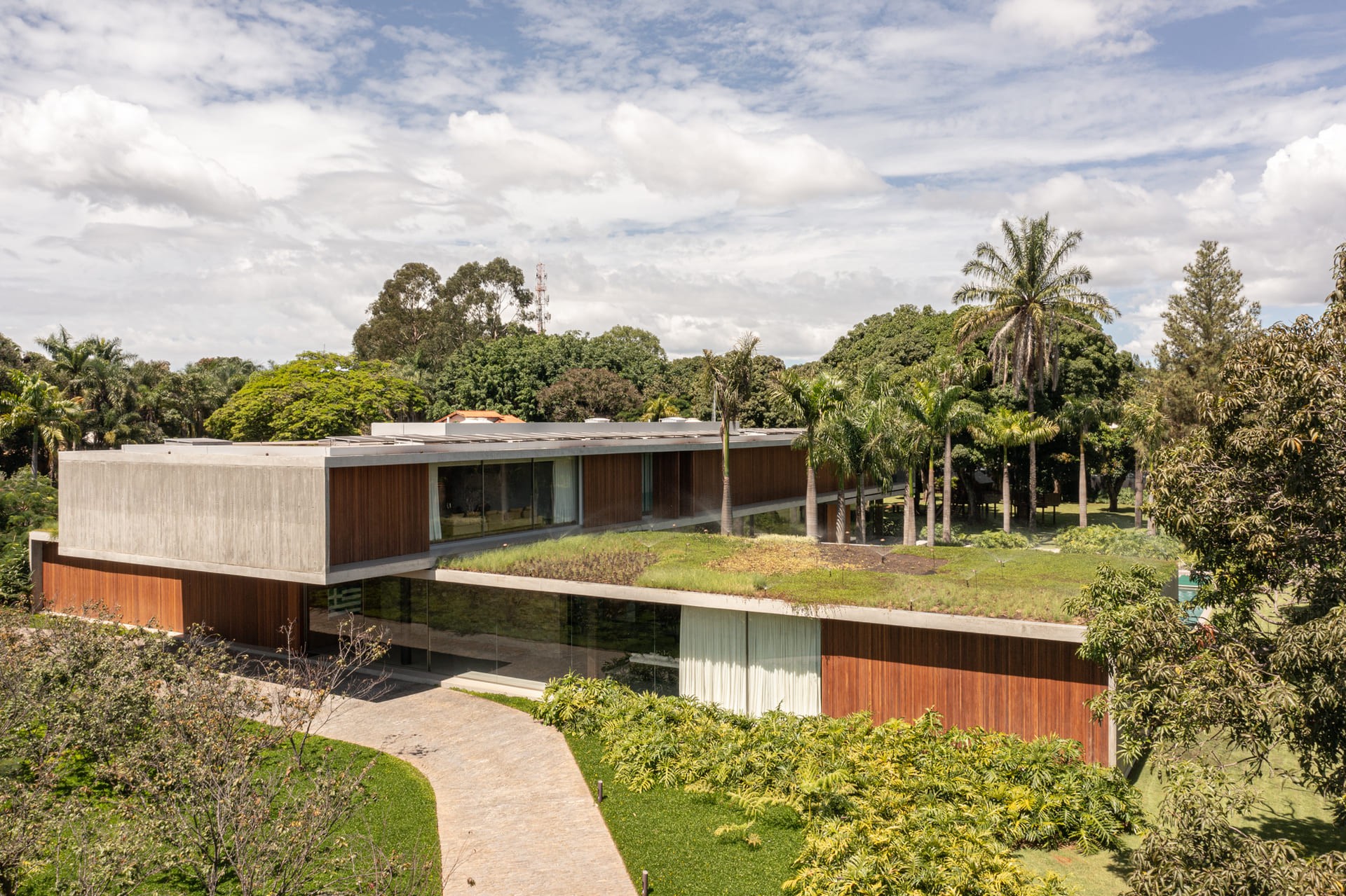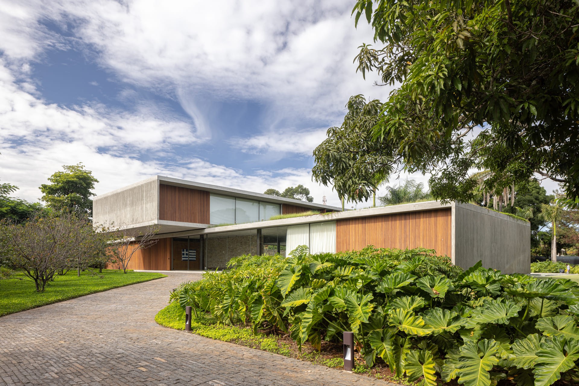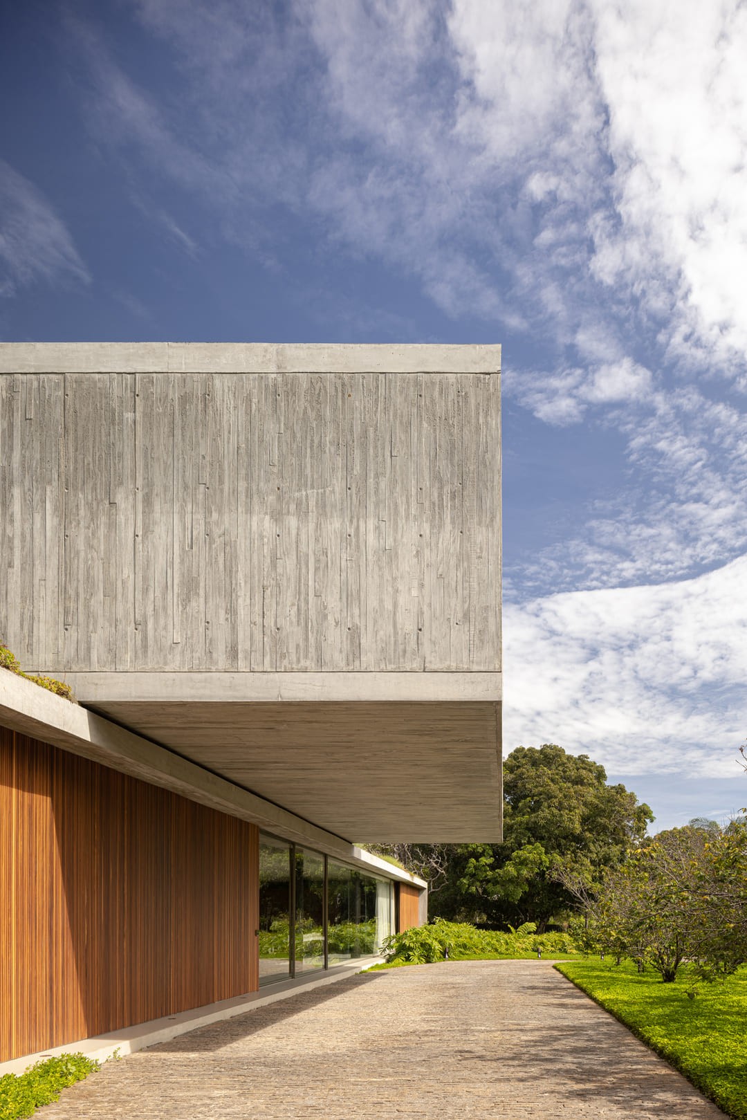Implantada em um lote extenso e rodeada por vegetação abundante, a Casa Grécia parte de uma composição horizontal clara: dois blocos retangulares de concreto aparente. A volumetria se apoia na precisão estrutural e no contraste entre a rigidez do concreto e a fluidez da natureza que a envolve.