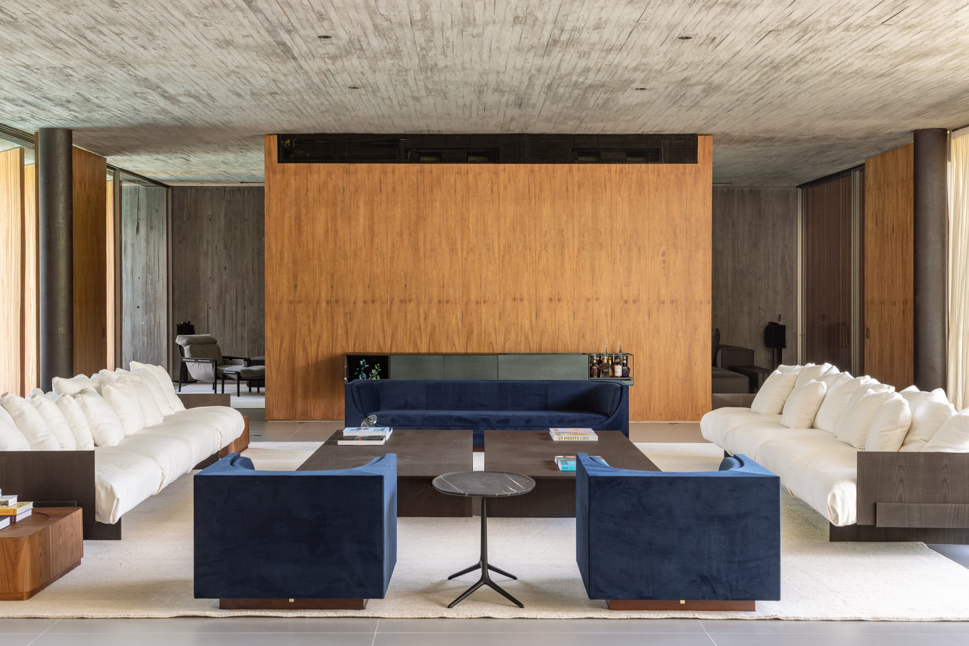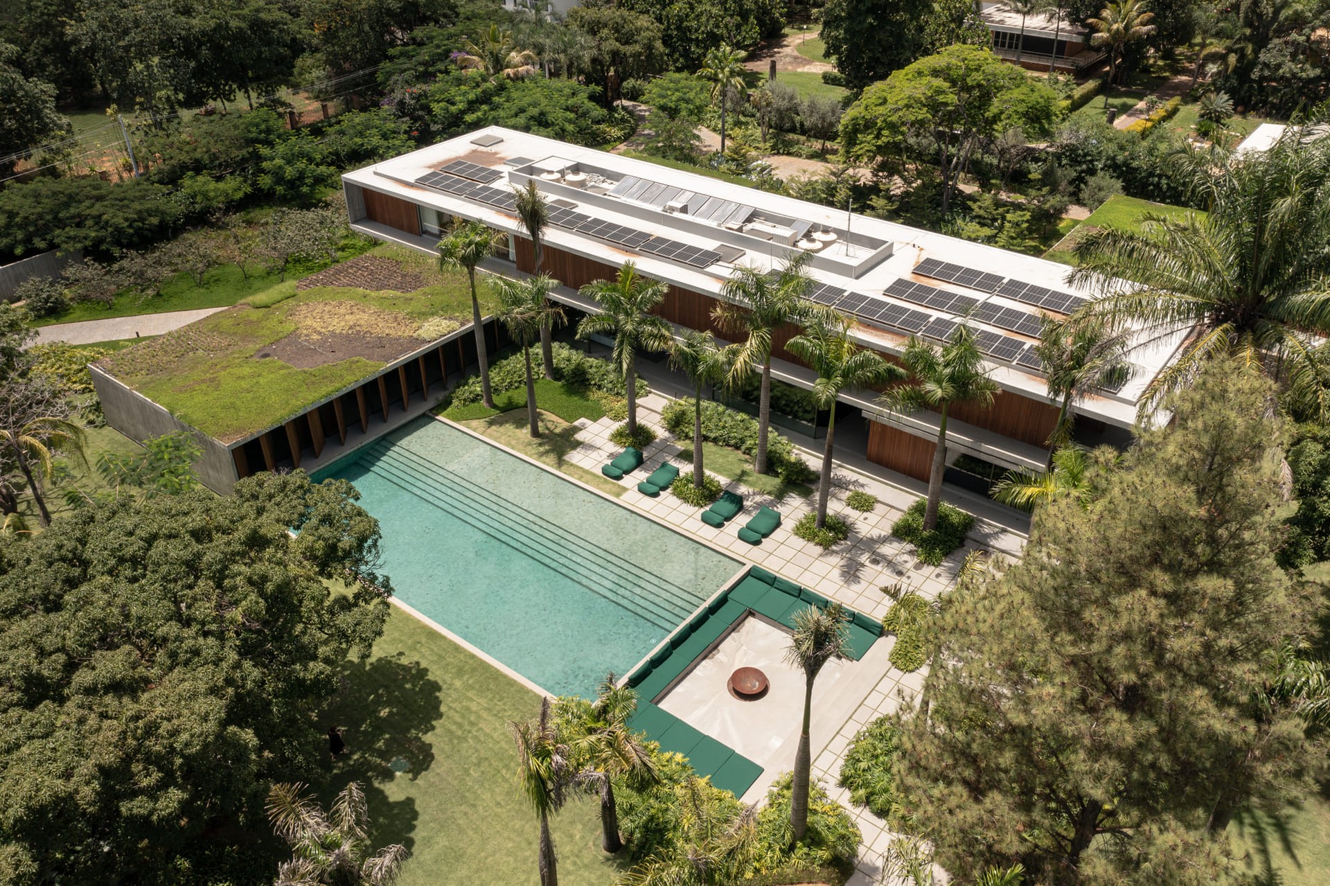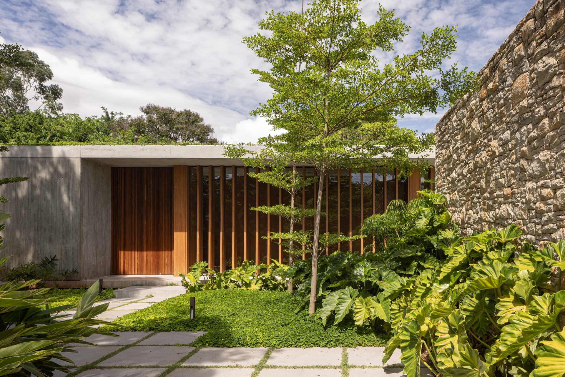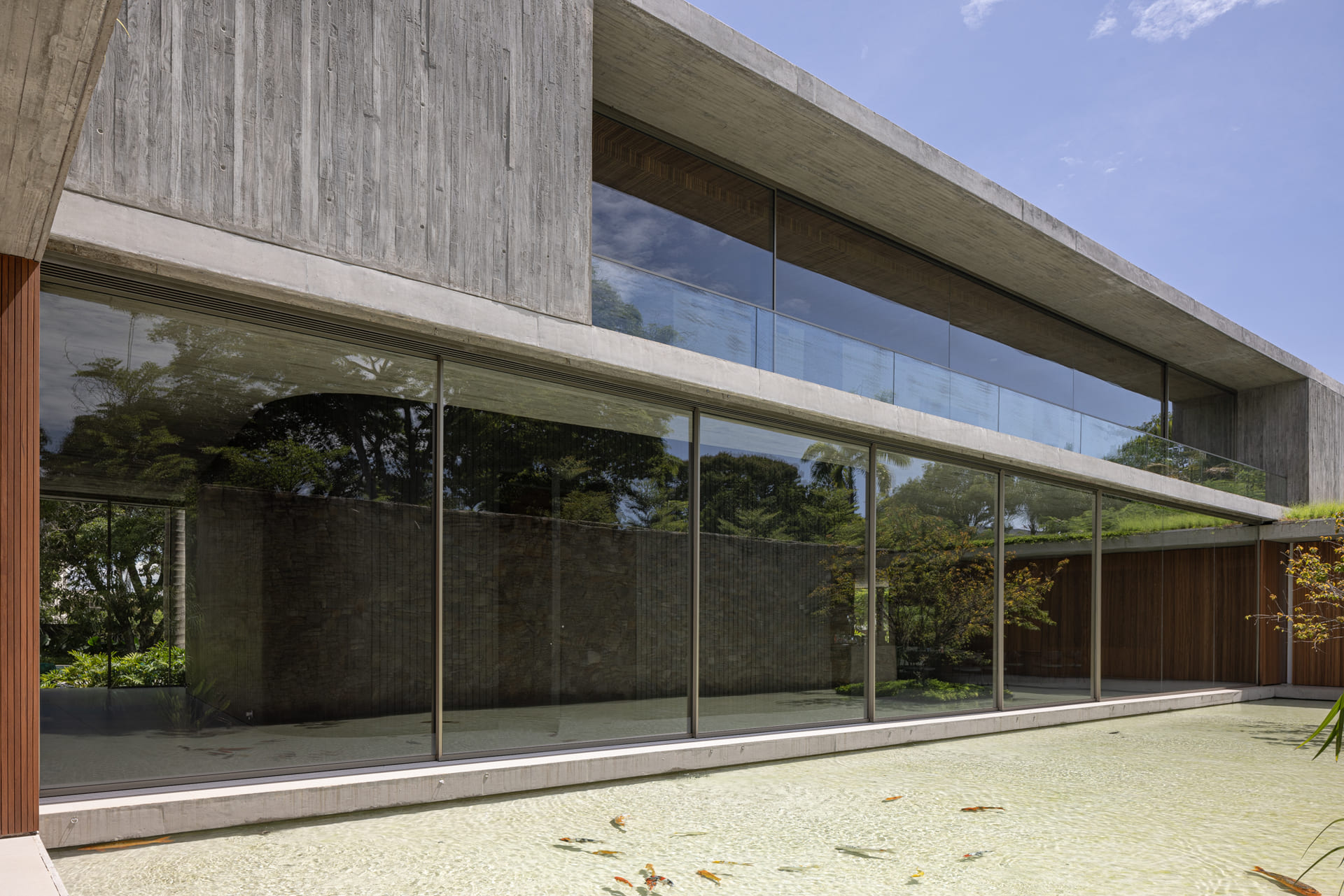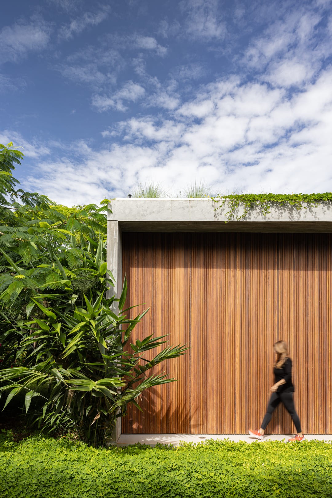 Implantada em um lote extenso e rodeada por vegetação abundante, a Casa Grécia parte de uma composição horizontal clara: dois blocos retangulares de concreto aparente. A volumetria se apoia na precisão estrutural e no contraste entre a rigidez do concreto e a fluidez da natureza que a envolve.