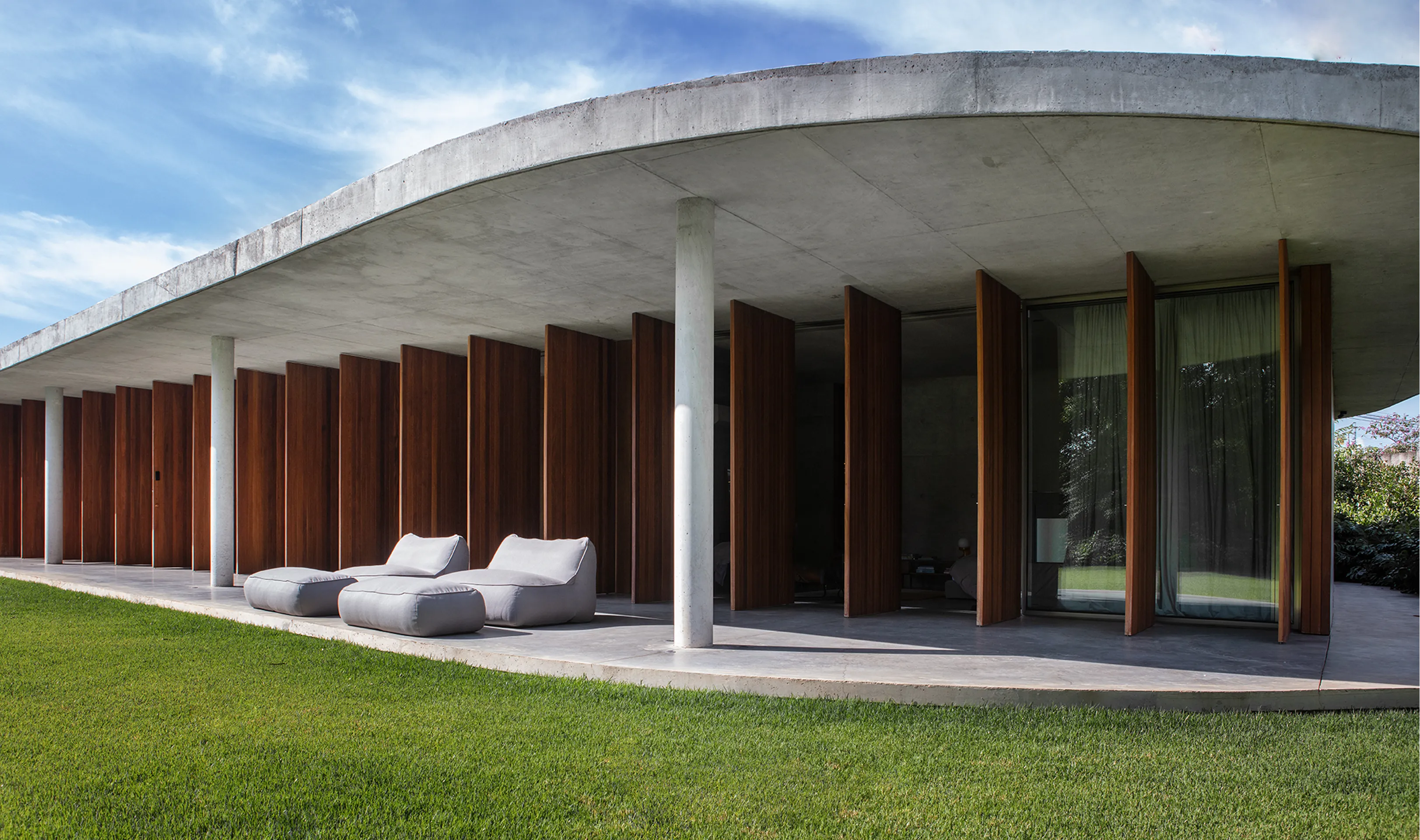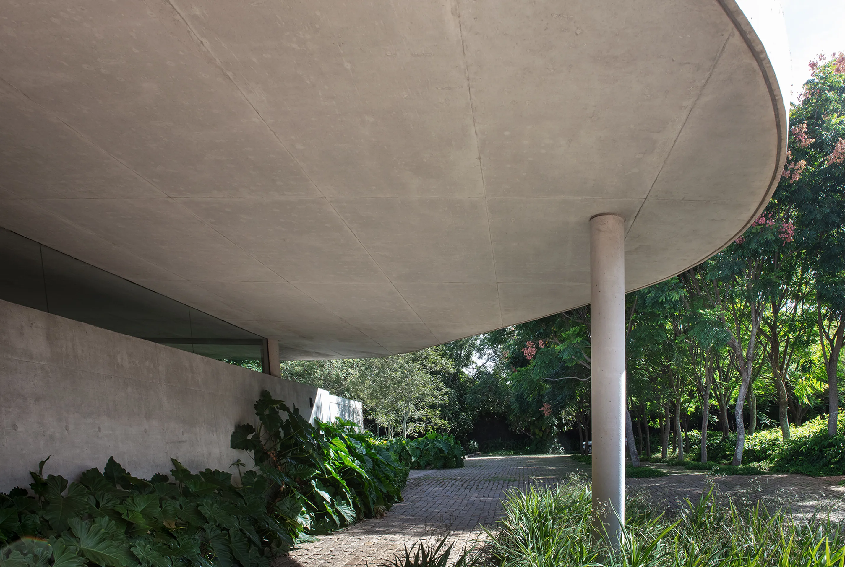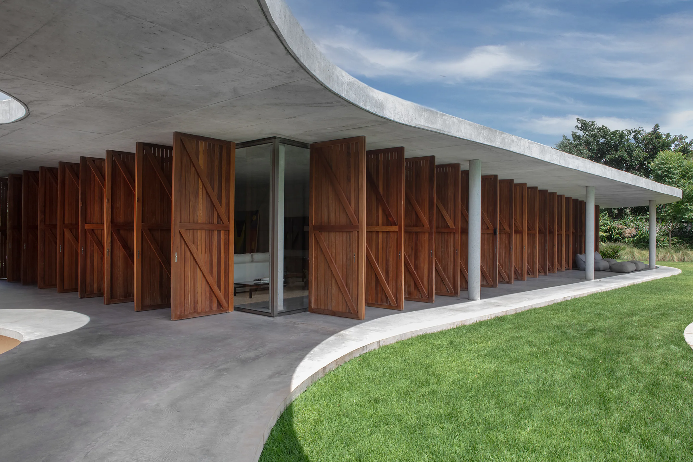 O design inovador da Casa México apresenta uma laje sinuosa que contrasta de forma marcante com a ortogonalidade dos três volumes que dividem a casa em zonas distintas: privada, estúdio e social + serviço. Essa abordagem arquitetônica não só define os espaços funcionais da residência, mas também cria uma fluidez visual que convida à exploração e interação.