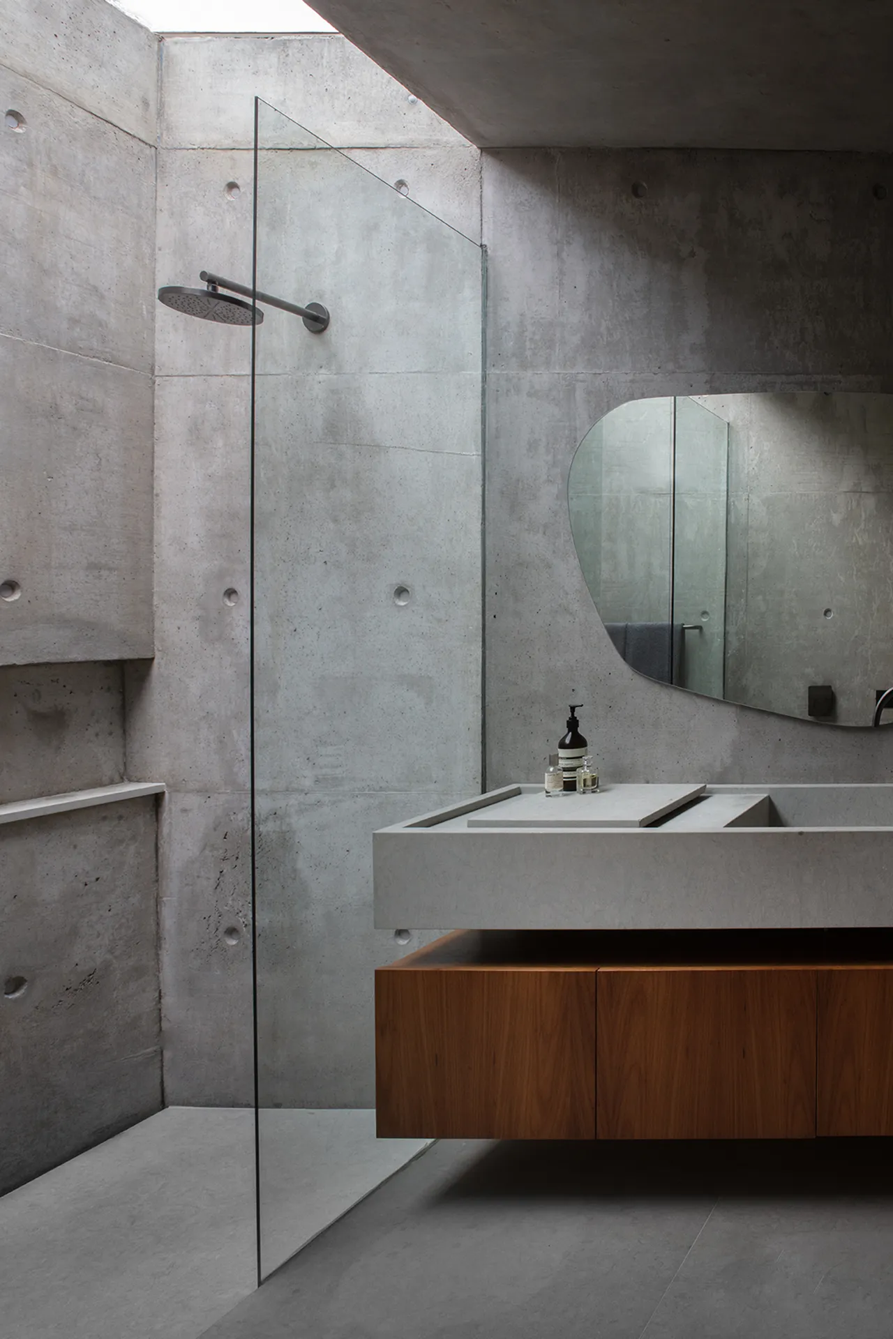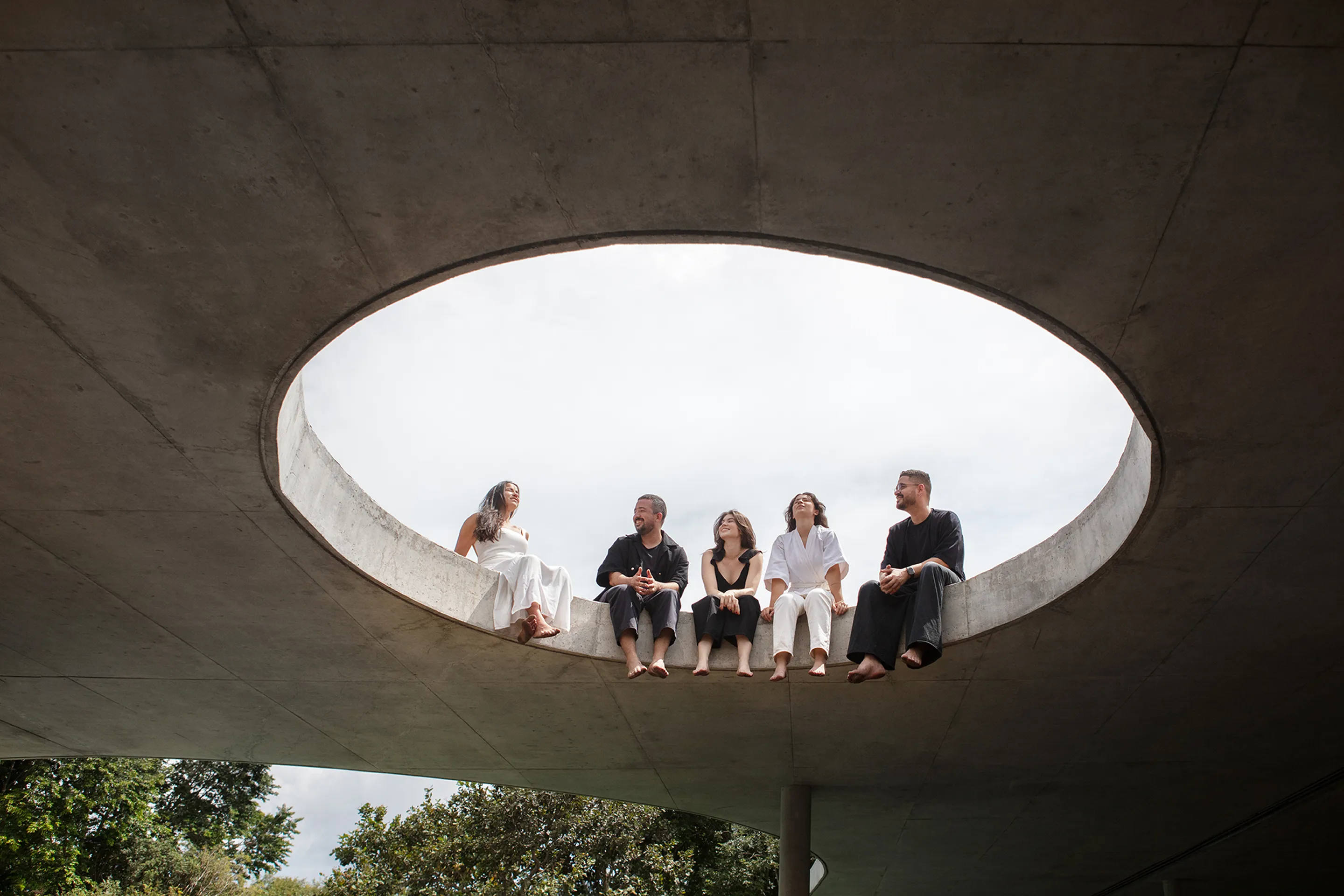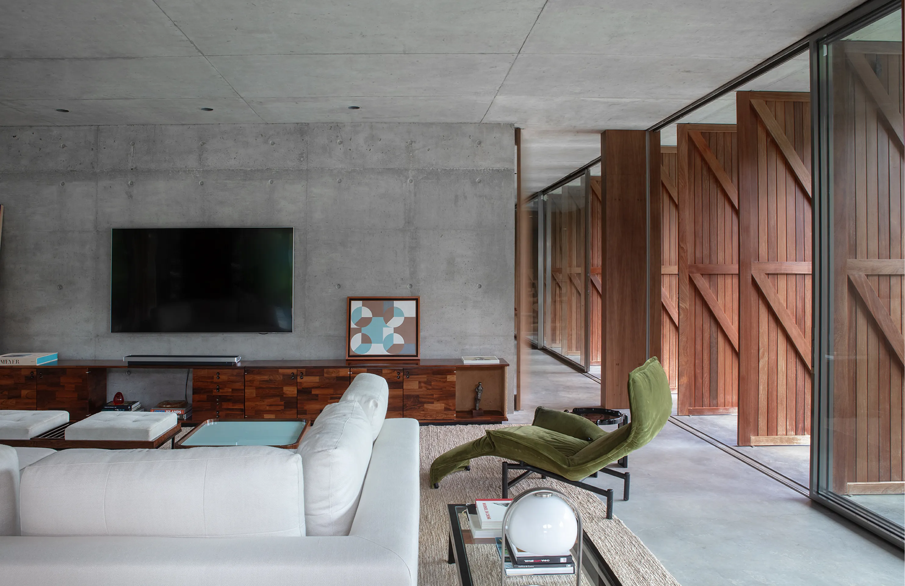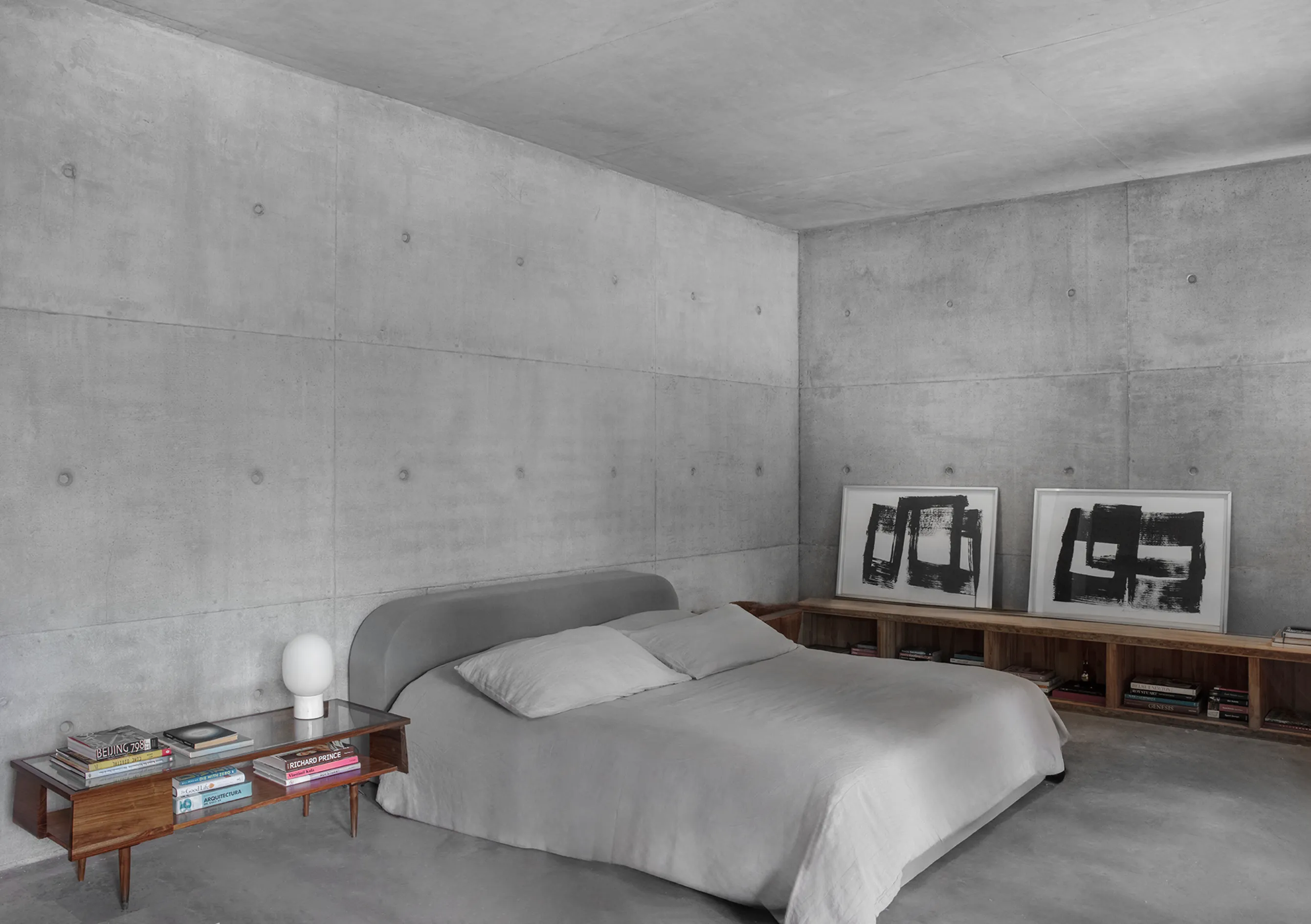 O design inovador da Casa México apresenta uma laje sinuosa que contrasta de forma marcante com a ortogonalidade dos três volumes que dividem a casa em zonas distintas: privada, estúdio e social + serviço. Essa abordagem arquitetônica não só define os espaços funcionais da residência, mas também cria uma fluidez visual que convida à exploração e interação.