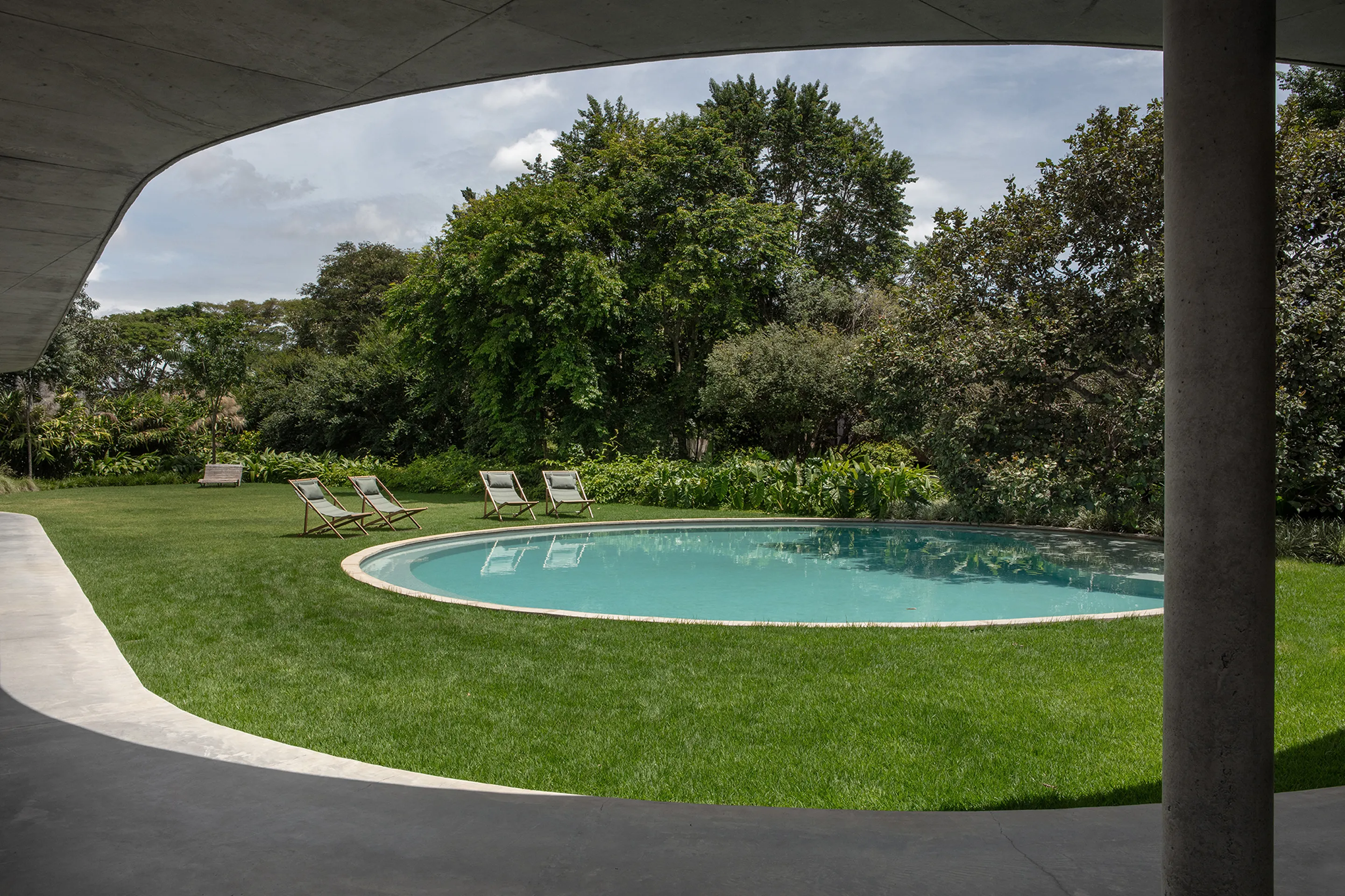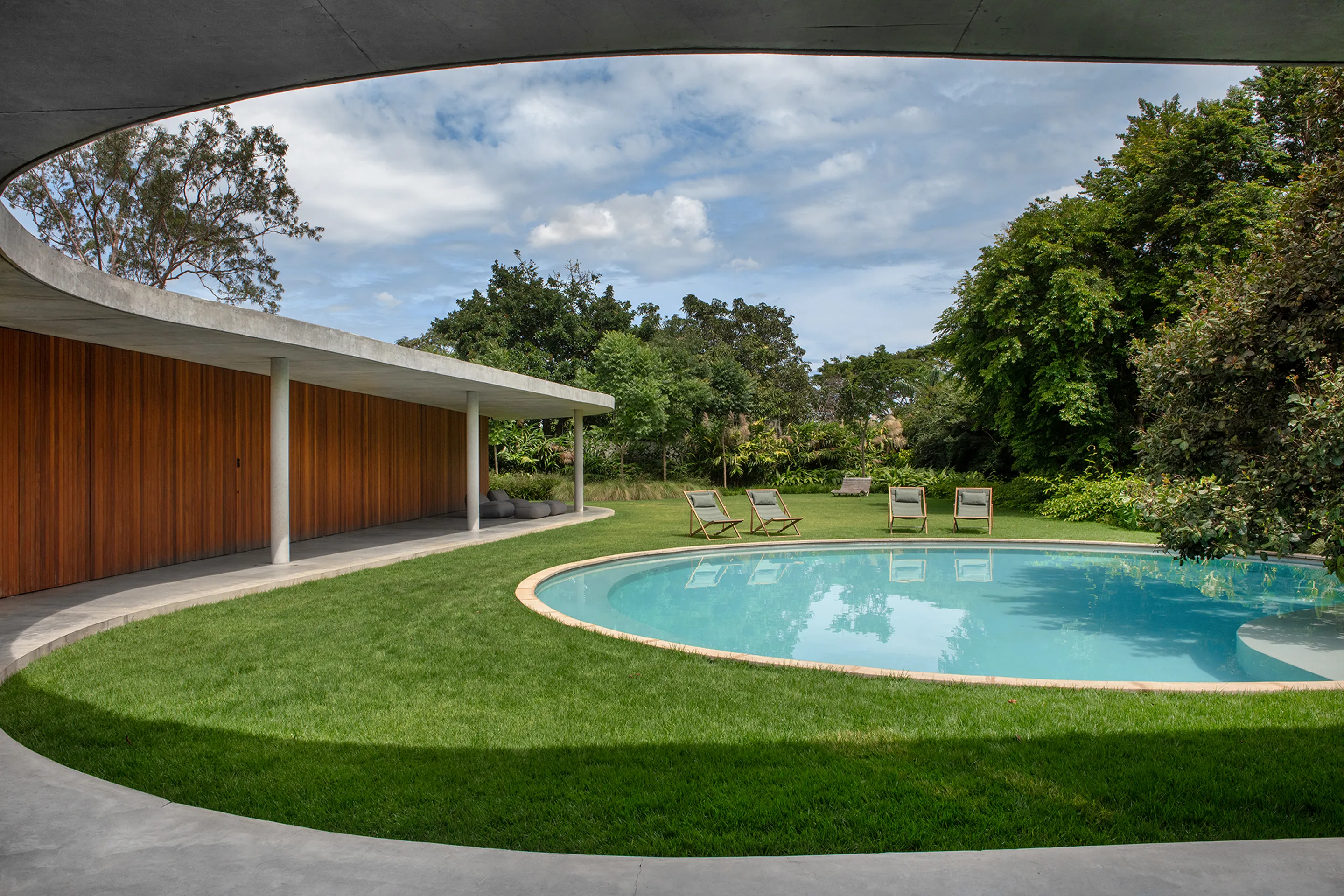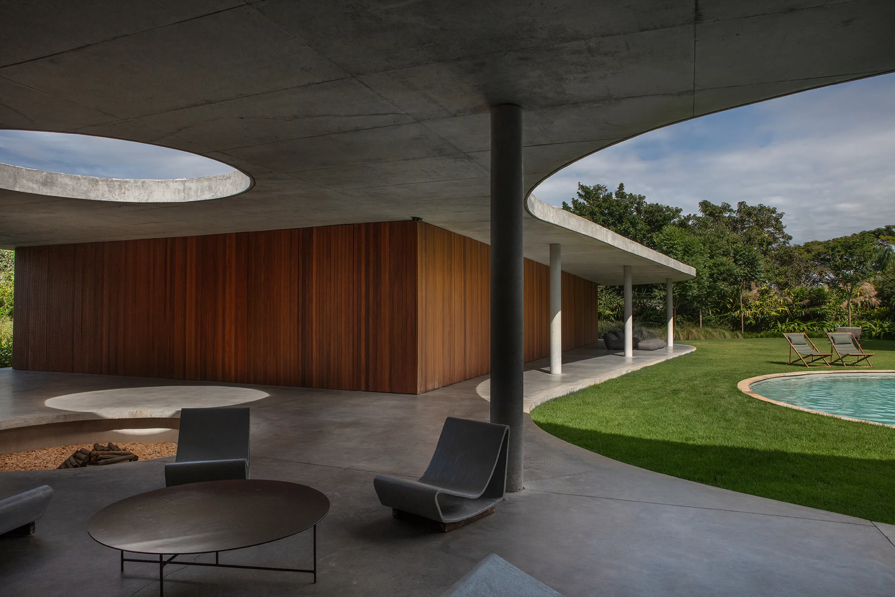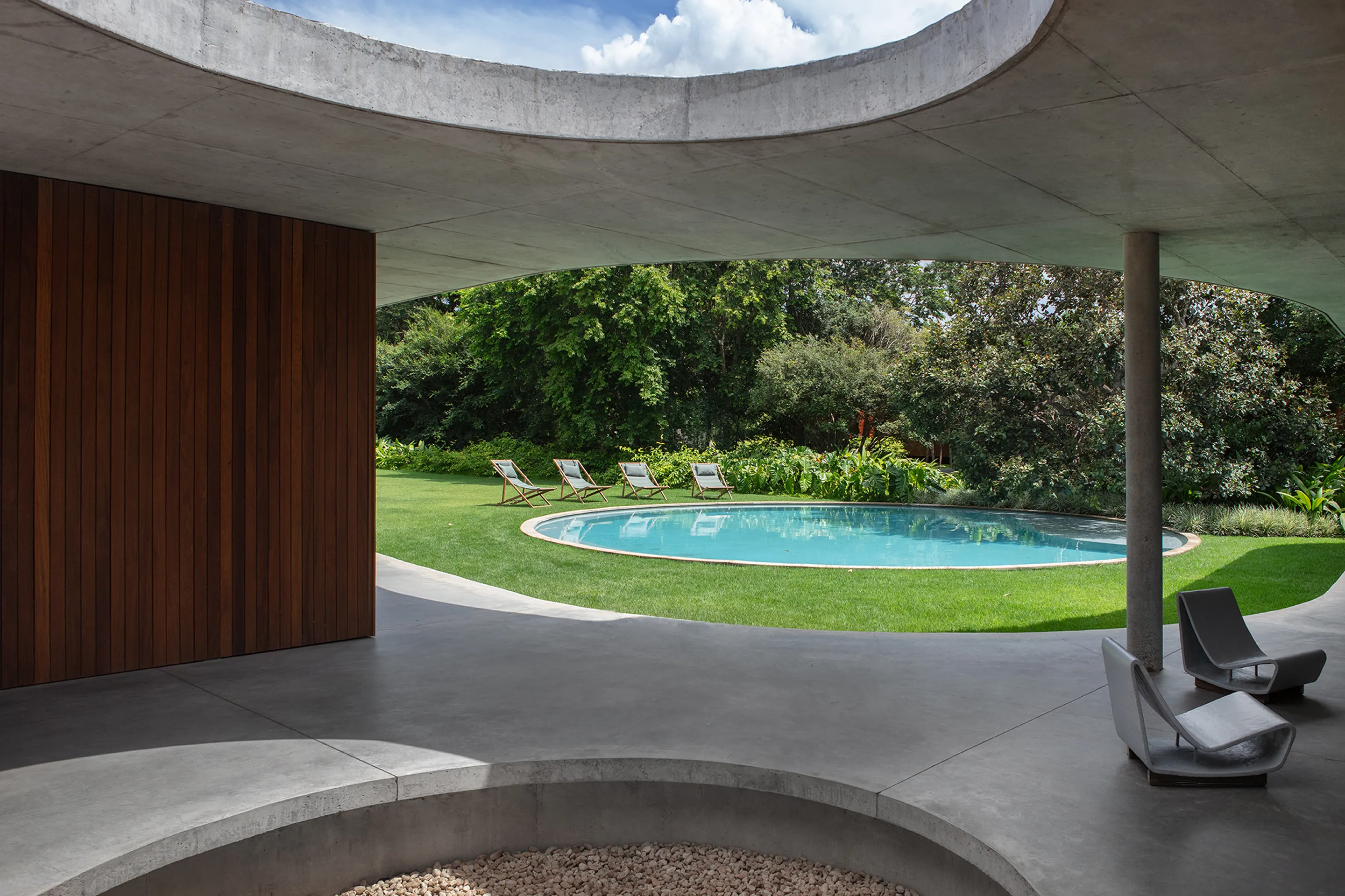 Uma piscina circular, estrategicamente posicionada no jardim, destaca-se na paisagem da propriedade, adicionando um elemento de surpresa e movimento ao ambiente externo. A laje, por sua vez, não só desafia as convenções estruturais tradicionais, como também dá origem a múltiplas varandas que proporcionam uma sensação de continuidade e conexão com o entorno.