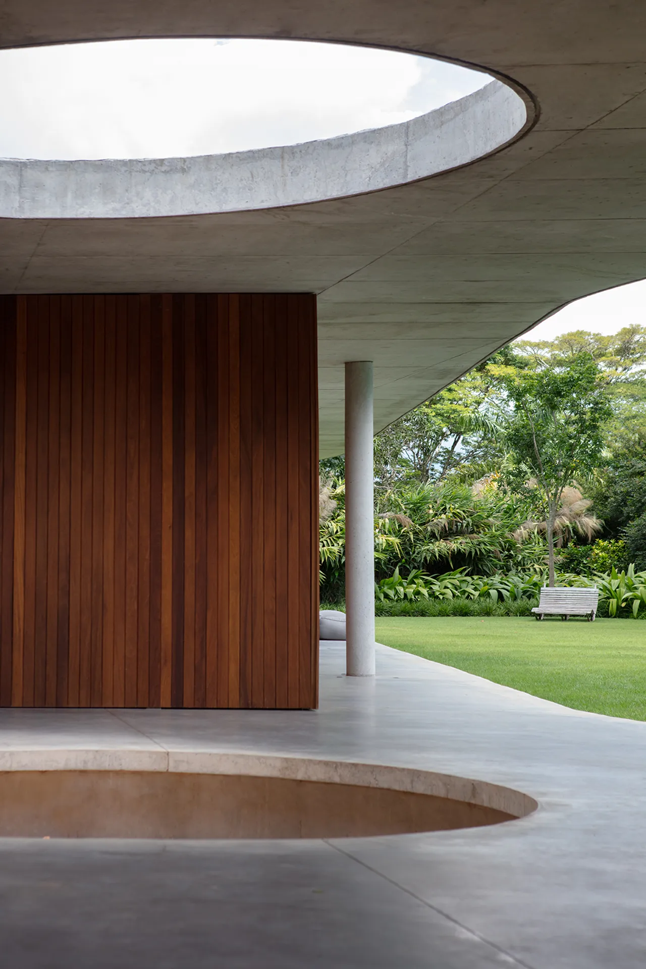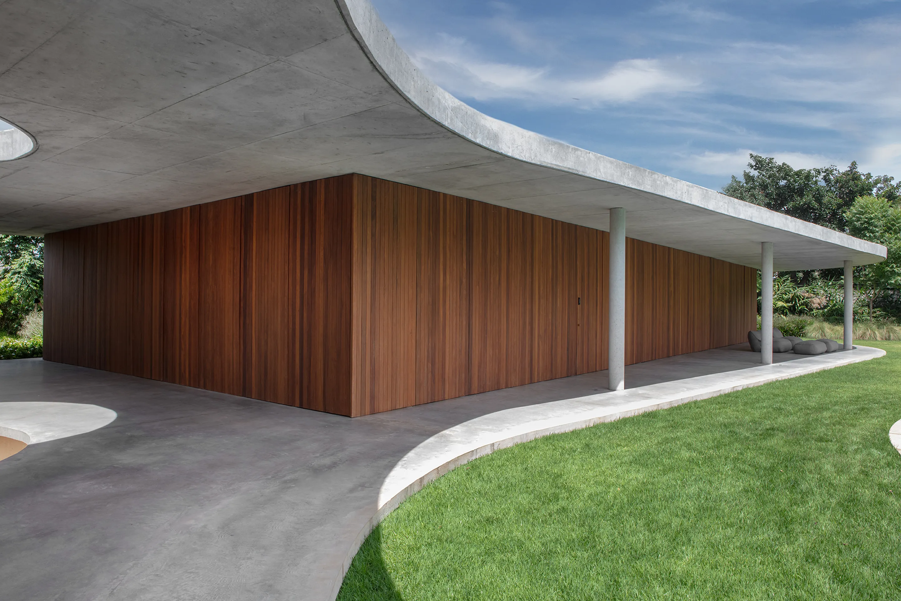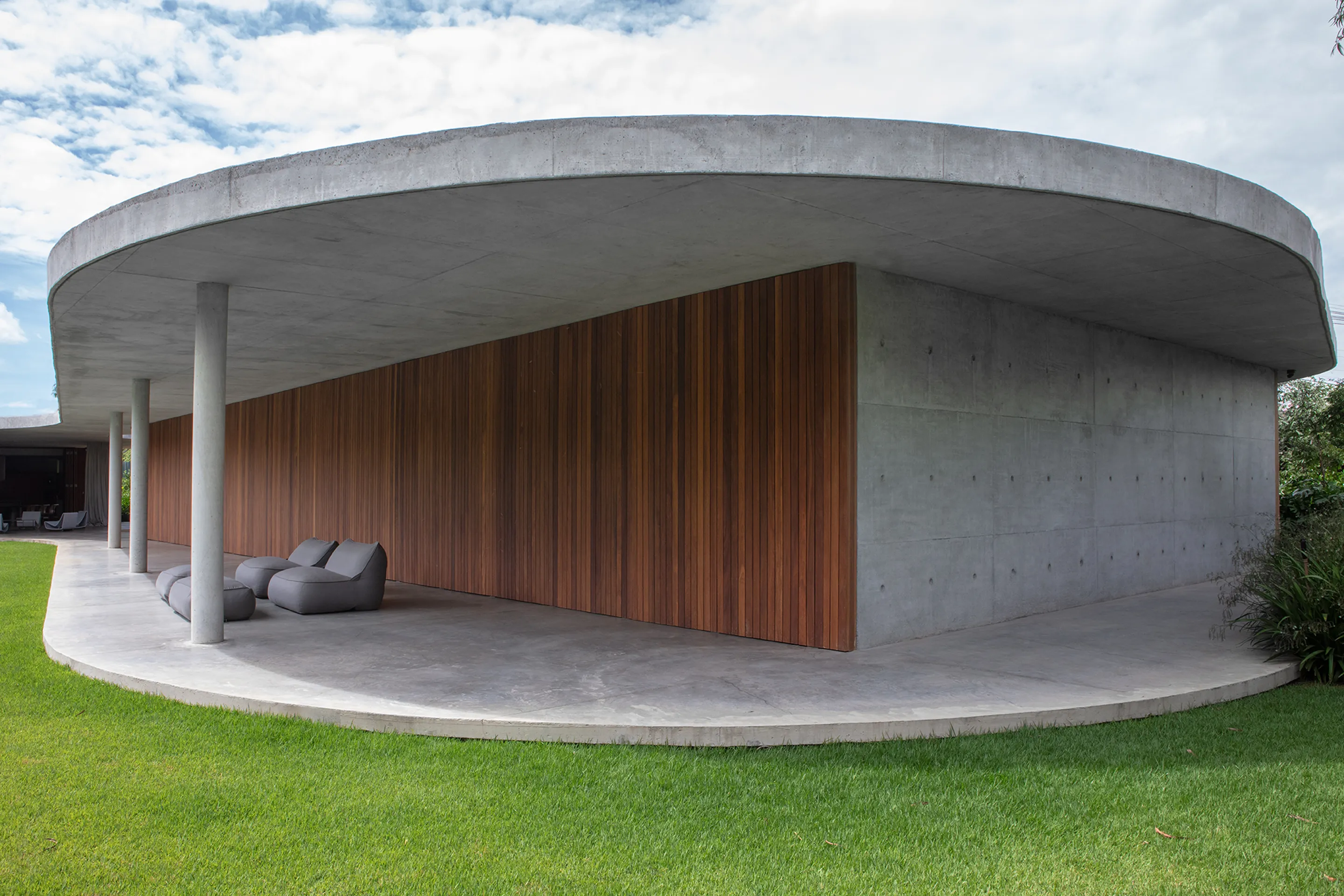 Uma piscina circular, estrategicamente posicionada no jardim, destaca-se na paisagem da propriedade, adicionando um elemento de surpresa e movimento ao ambiente externo. A laje, por sua vez, não só desafia as convenções estruturais tradicionais, como também dá origem a múltiplas varandas que proporcionam uma sensação de continuidade e conexão com o entorno.