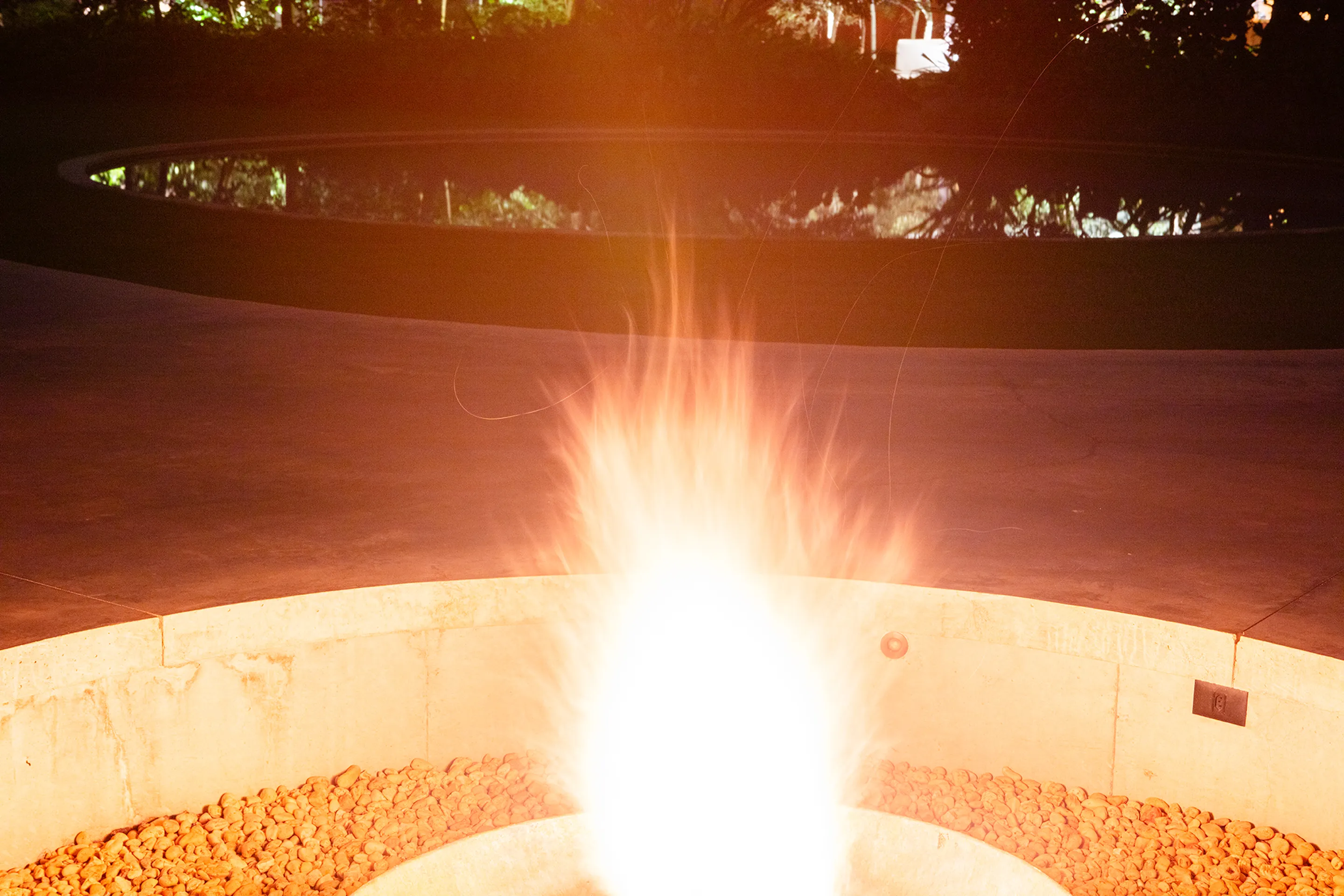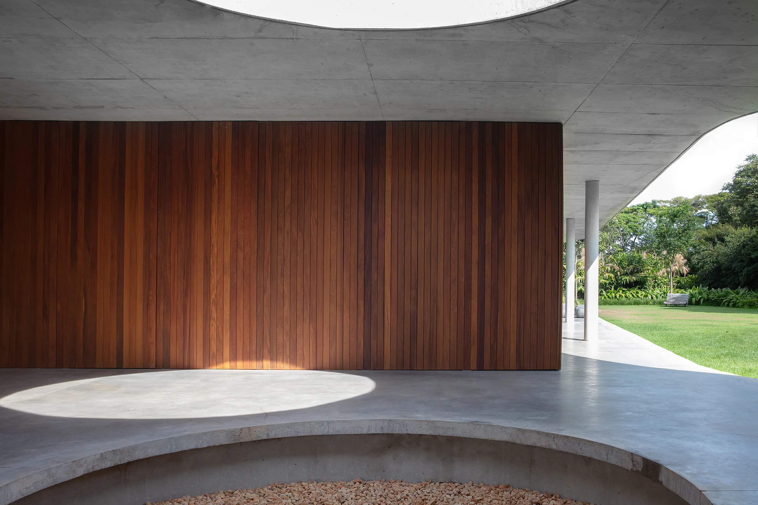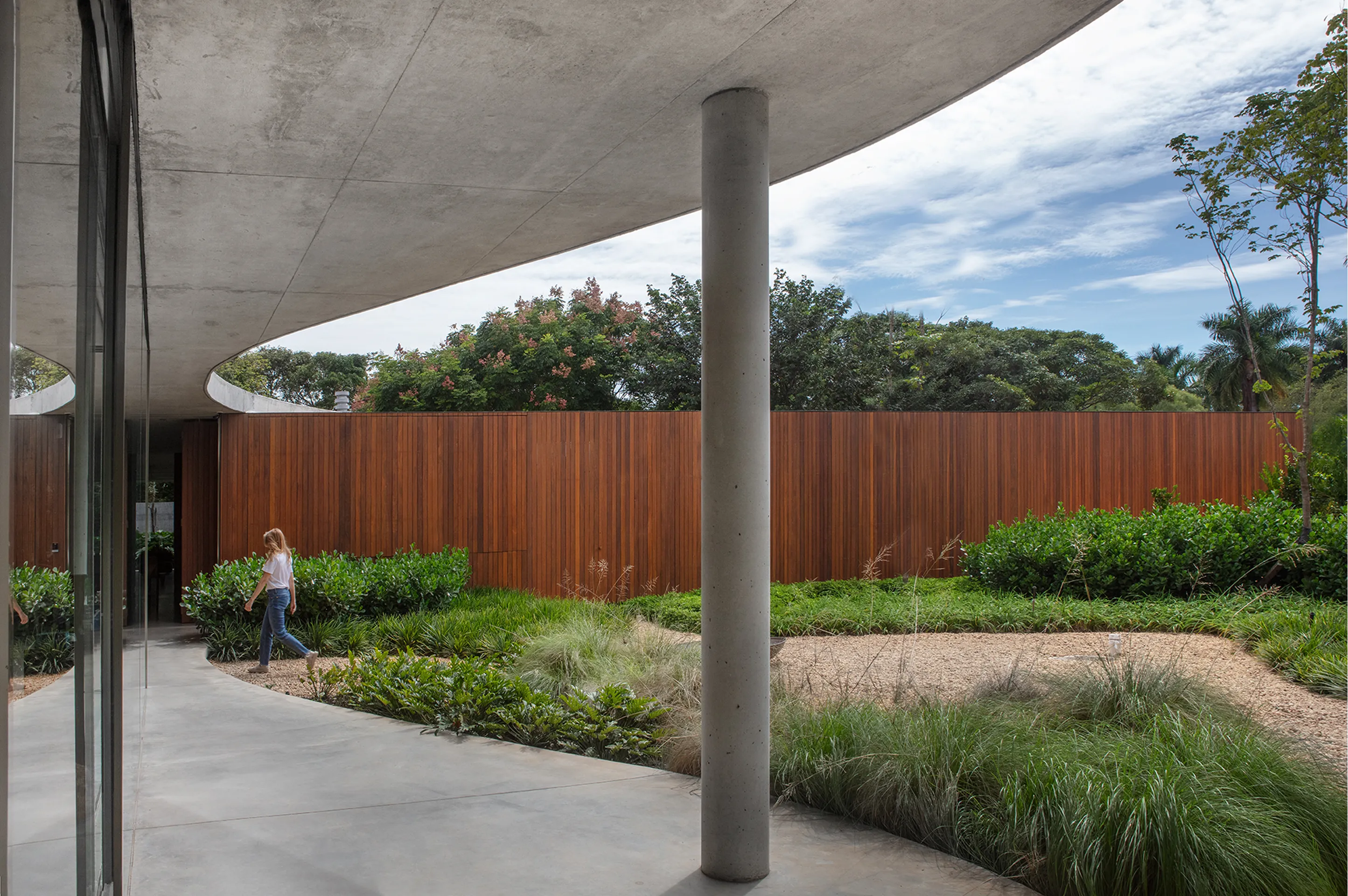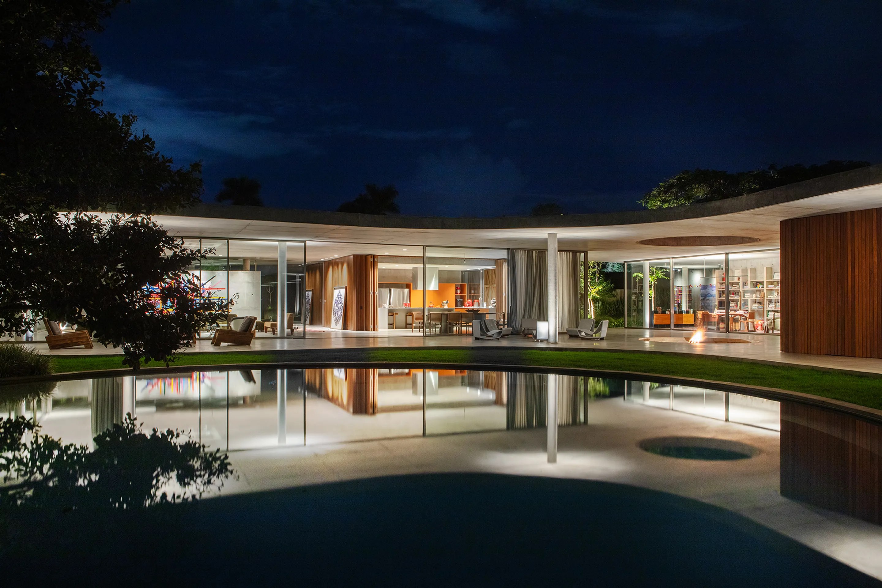 Uma piscina circular, estrategicamente posicionada no jardim, destaca-se na paisagem da propriedade, adicionando um elemento de surpresa e movimento ao ambiente externo. A laje, por sua vez, não só desafia as convenções estruturais tradicionais, como também dá origem a múltiplas varandas que proporcionam uma sensação de continuidade e conexão com o entorno.