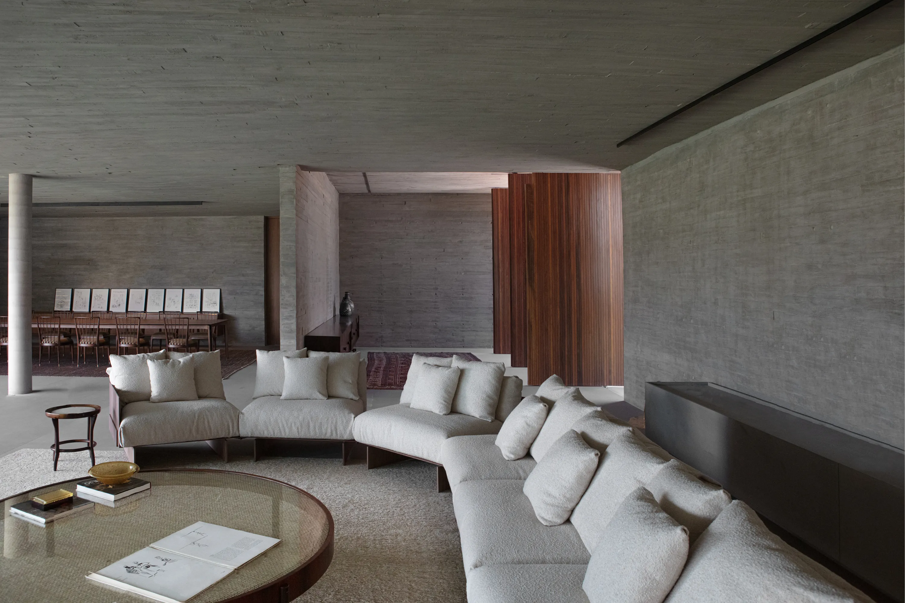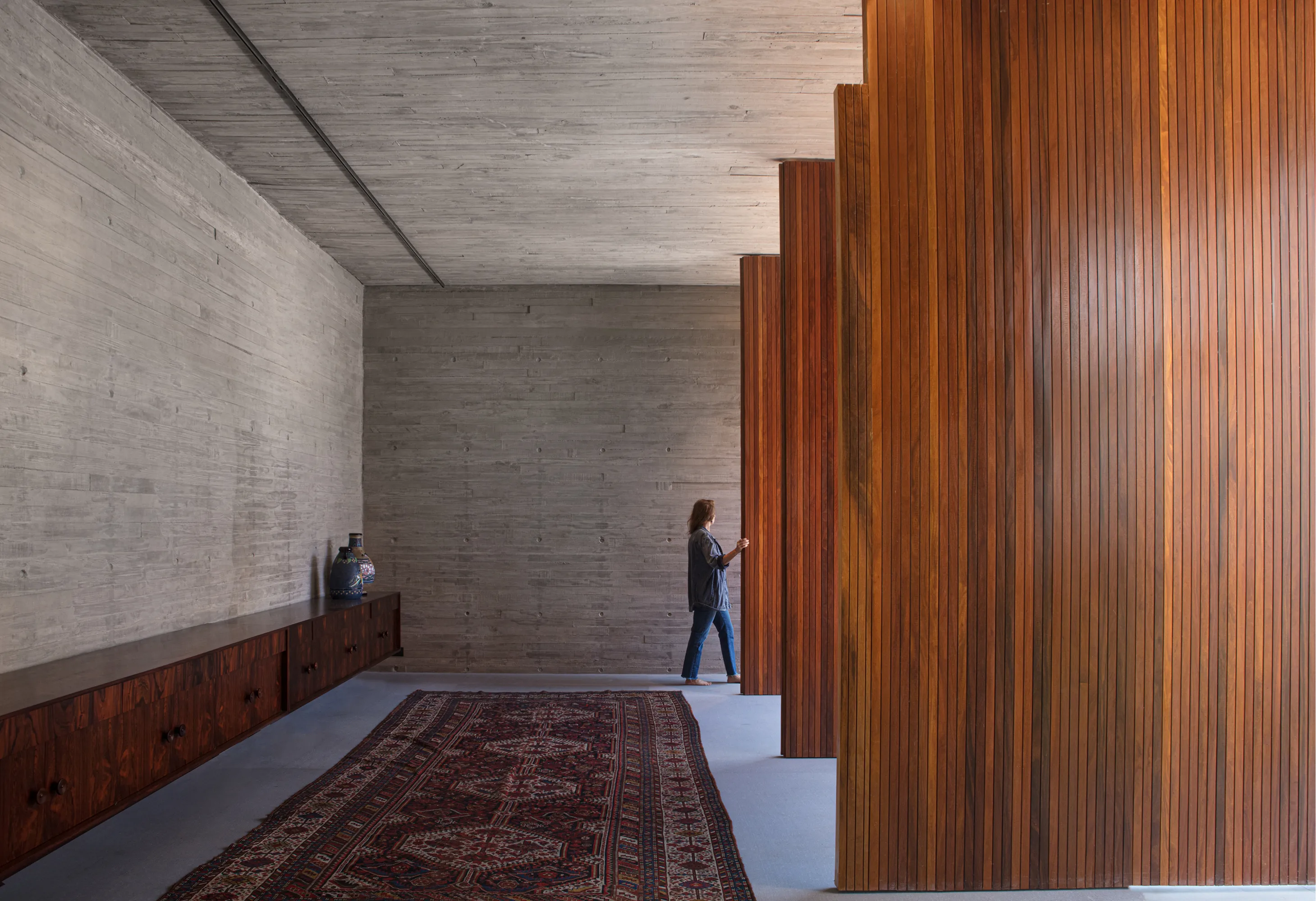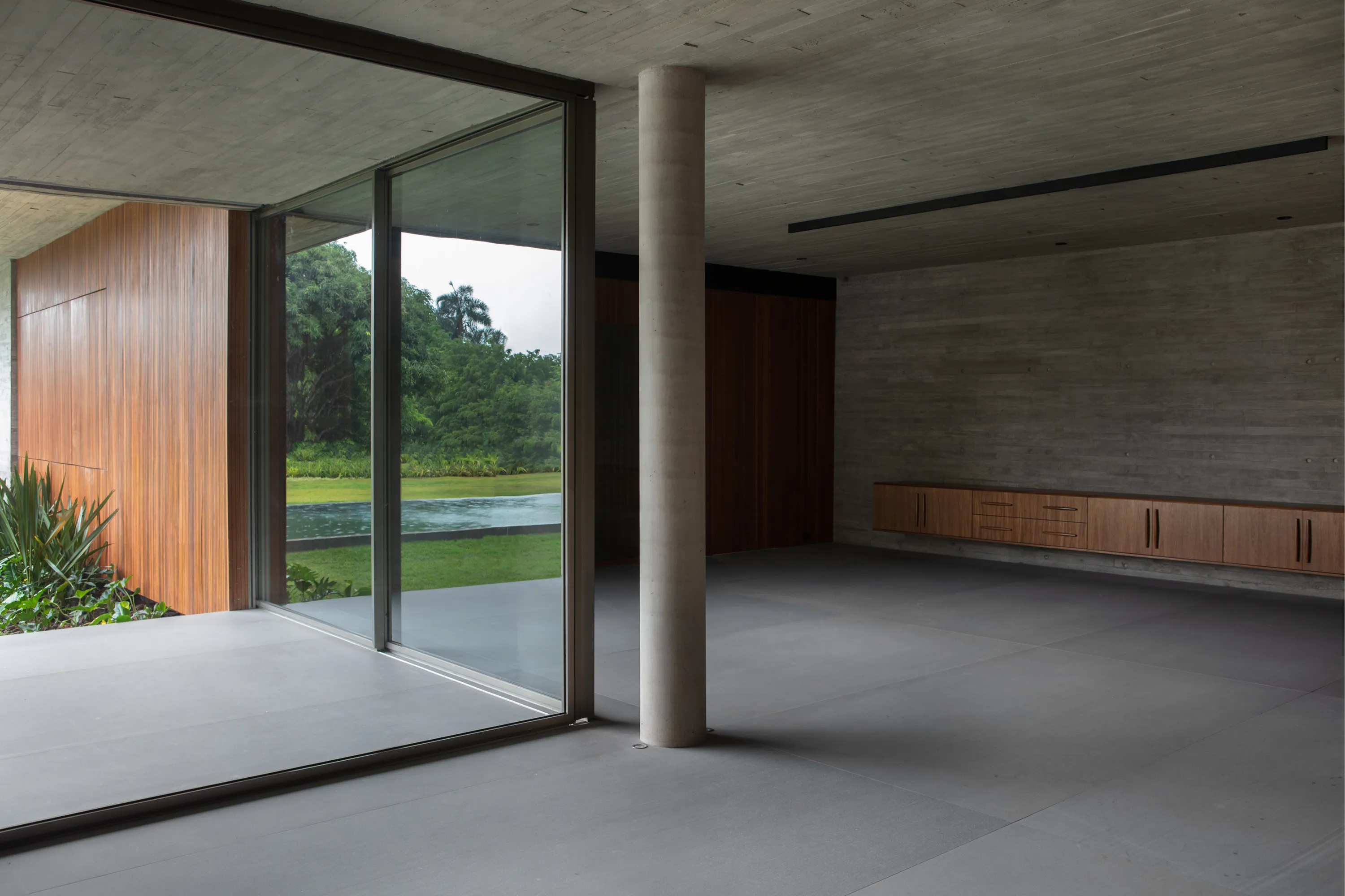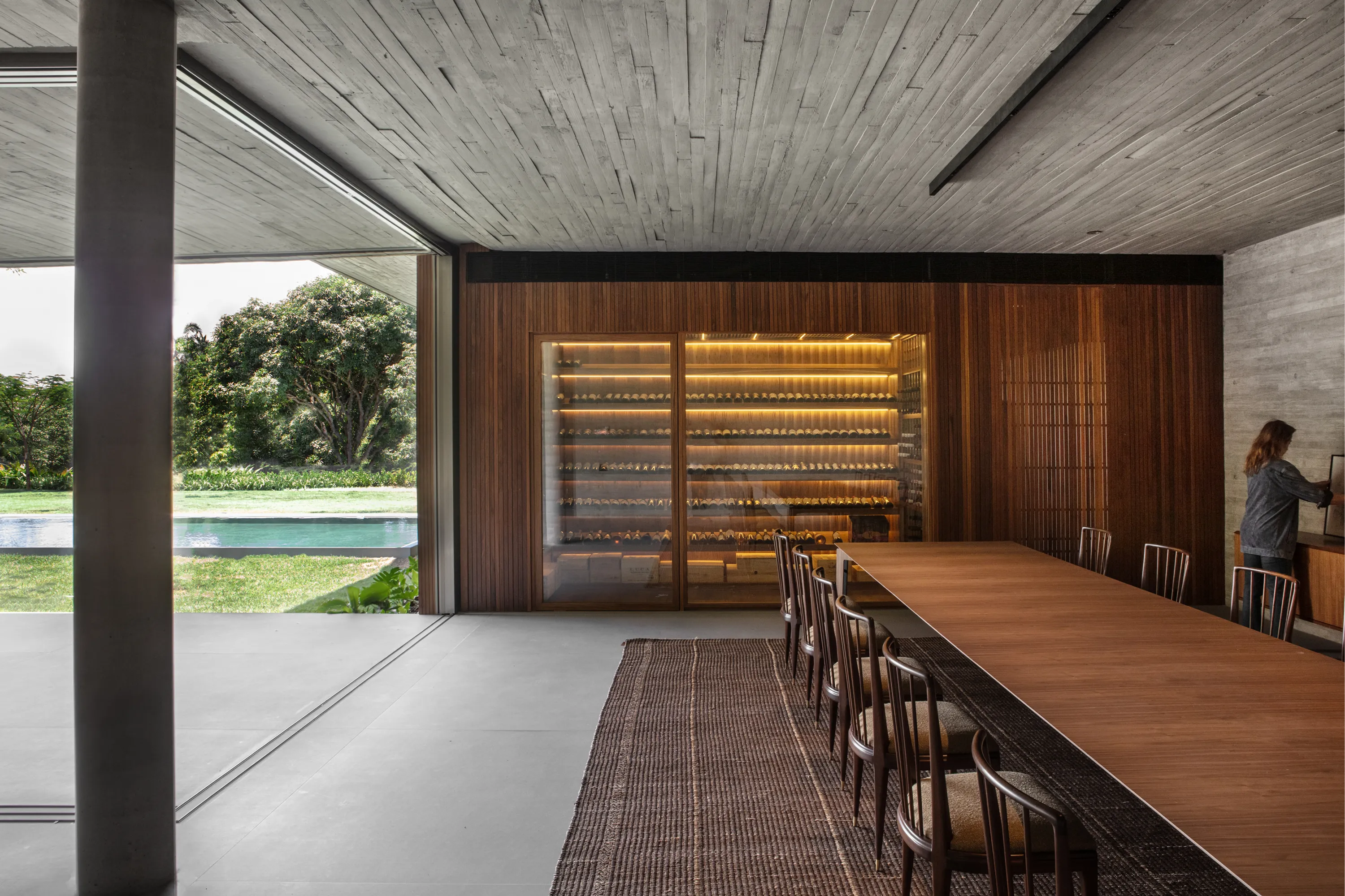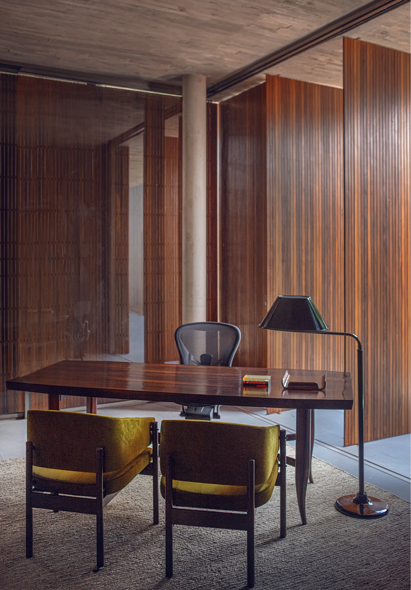 Internamente, a casa abriga uma importante coleção de mobiliário moderno brasileiro, com destaque para peças dos anos 1970 assinadas por Giuseppe Scapinelli. O desenho arquitetônico atua como suporte silencioso para o mobiliário e para a luz natural, que percorre os espaços ao longo do dia filtrada por brises e elementos estruturais que reforçam a cadência visual da casa.