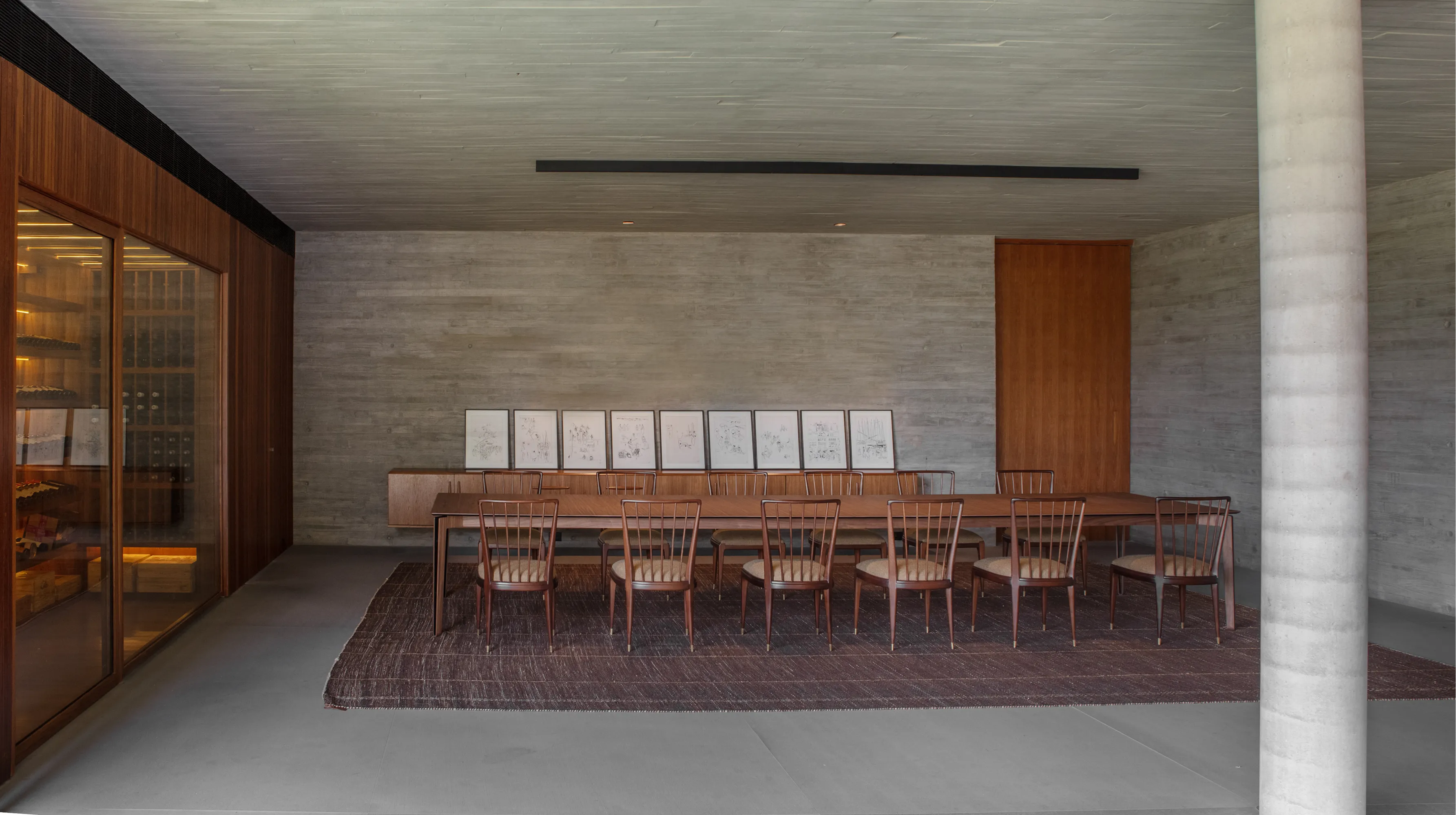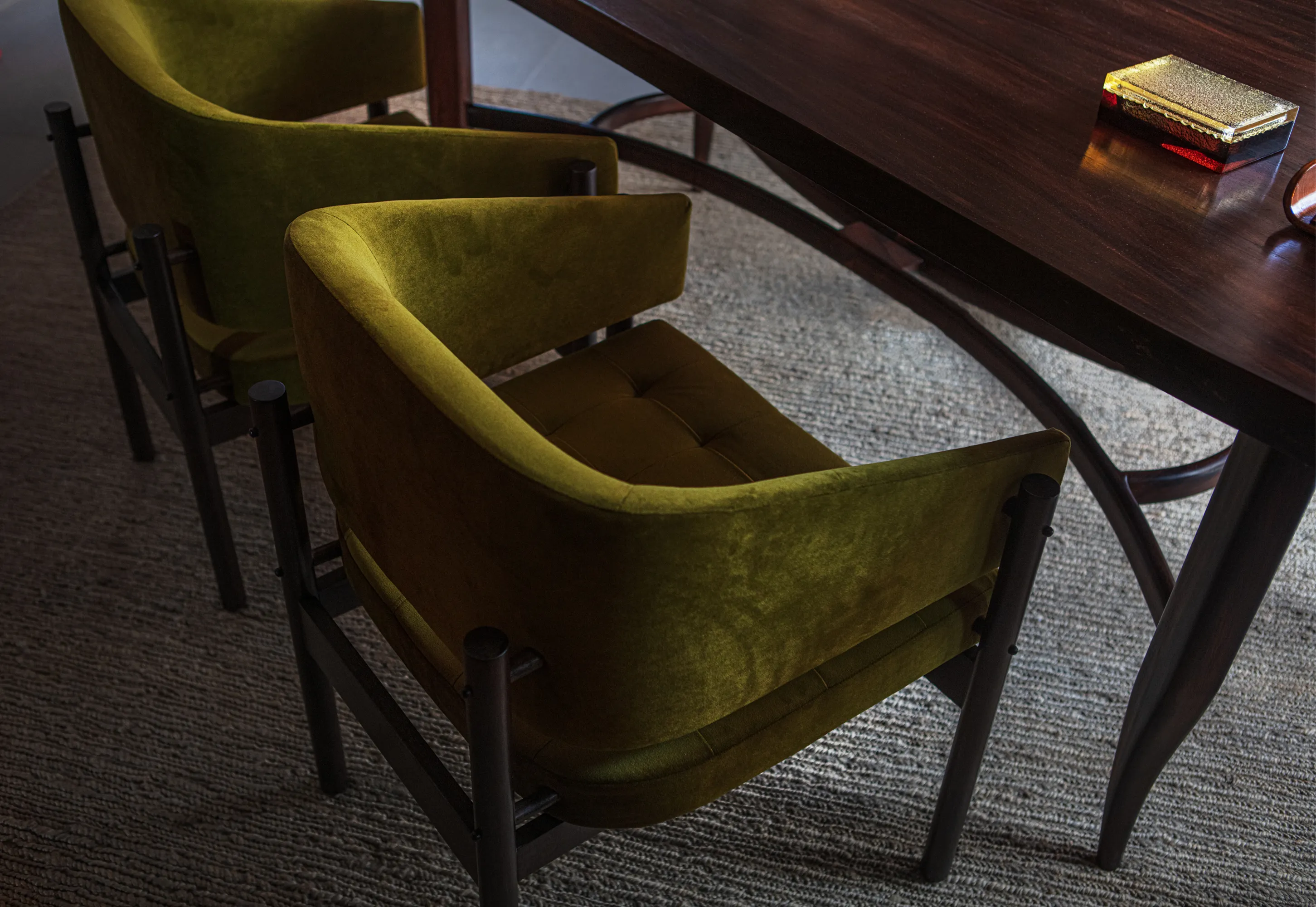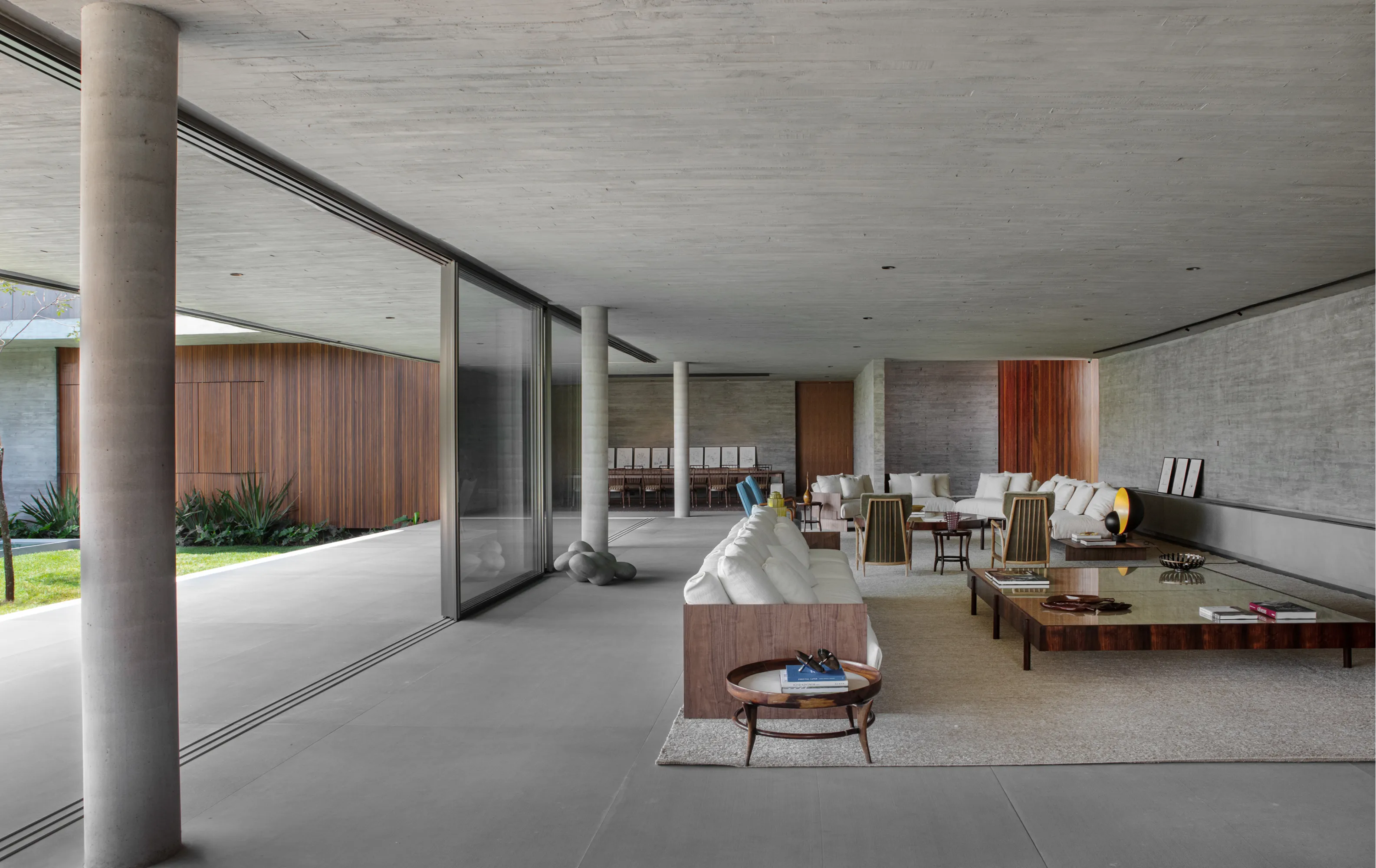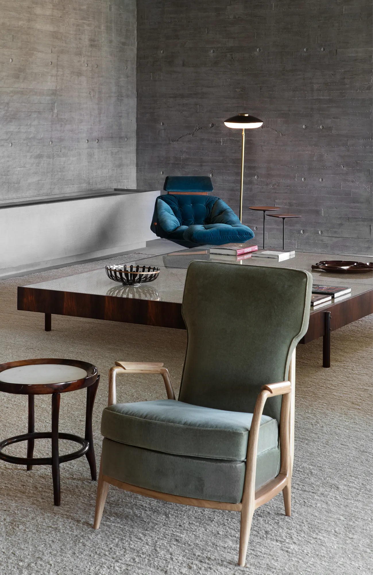Internamente, a casa abriga uma importante coleção de mobiliário moderno brasileiro, com destaque para peças dos anos 1970 assinadas por Giuseppe Scapinelli. O desenho arquitetônico atua como suporte silencioso para o mobiliário e para a luz natural, que percorre os espaços ao longo do dia filtrada por brises e elementos estruturais que reforçam a cadência visual da casa.