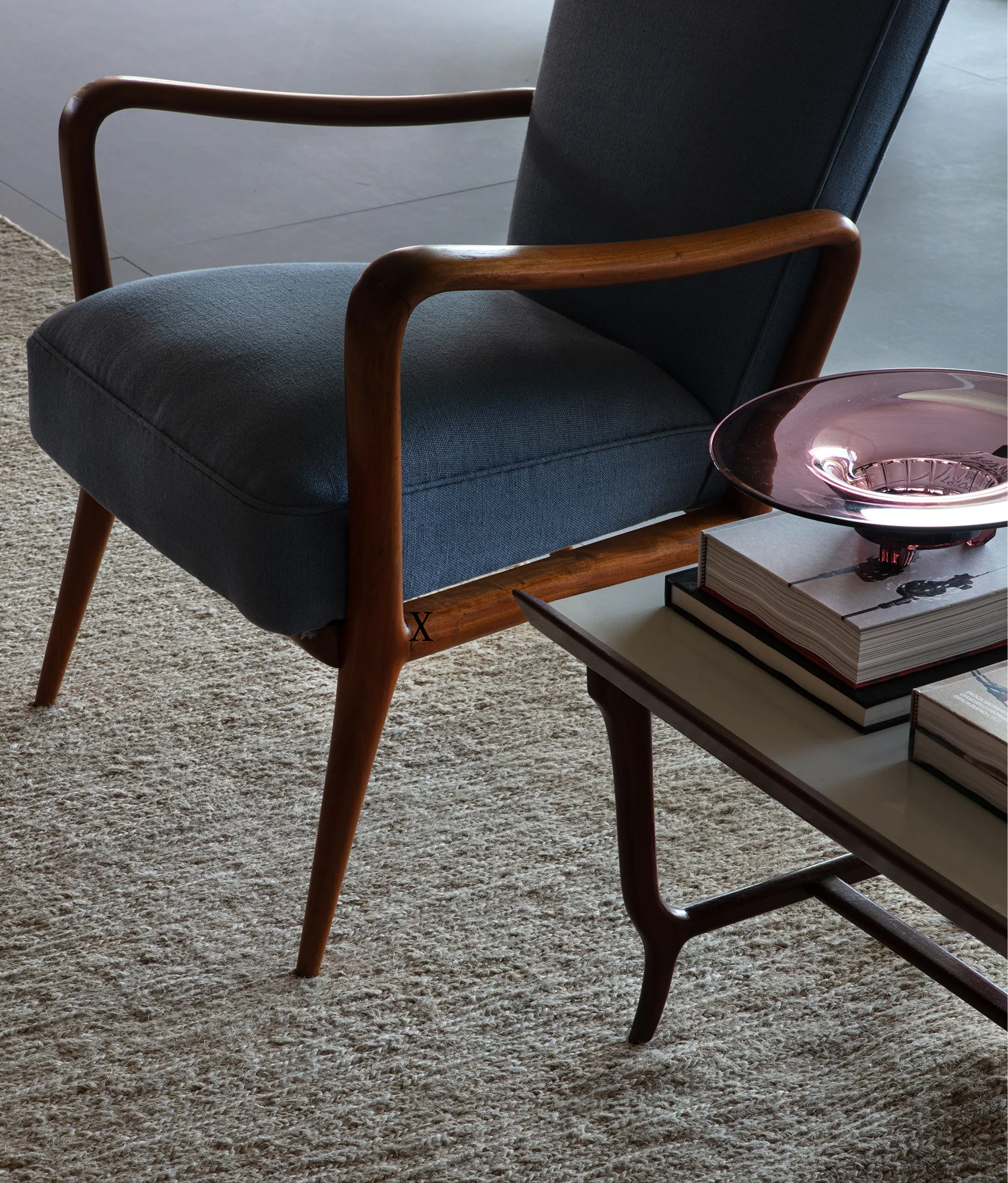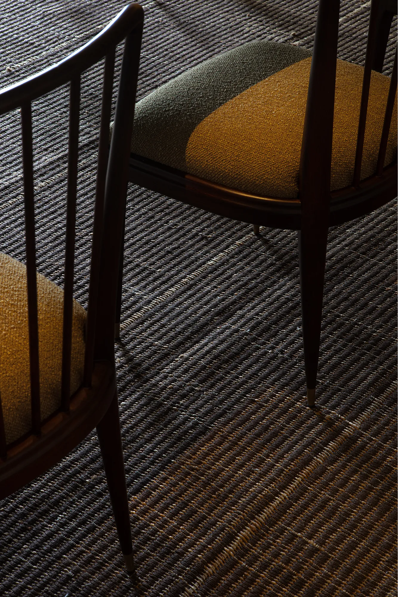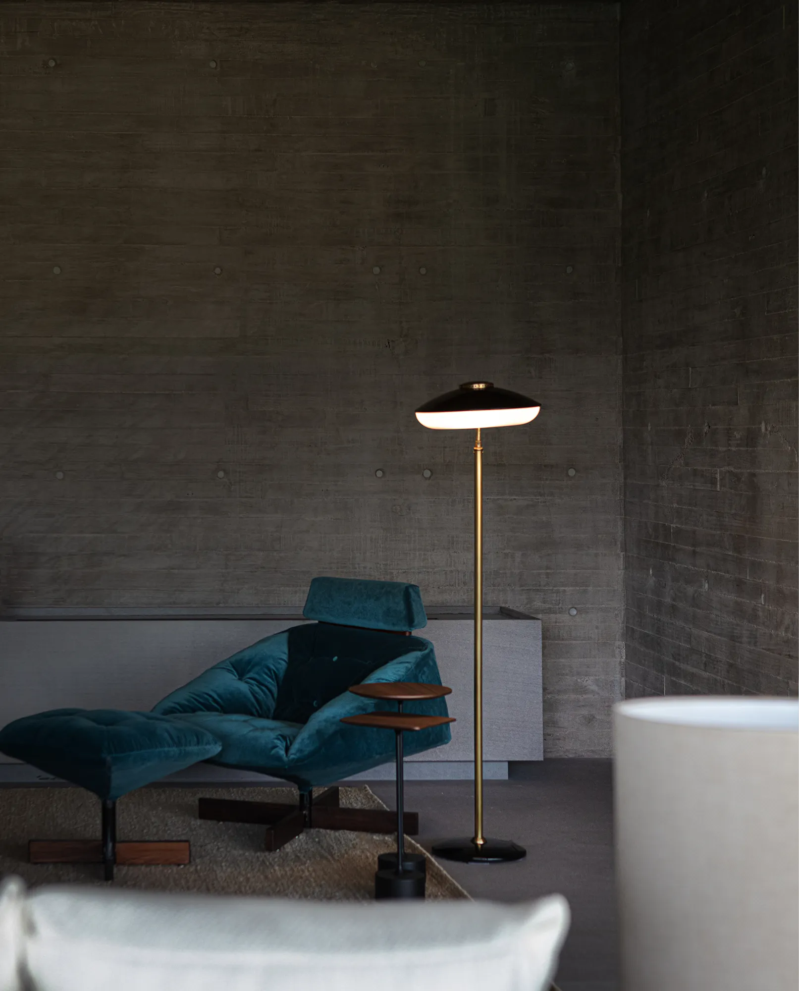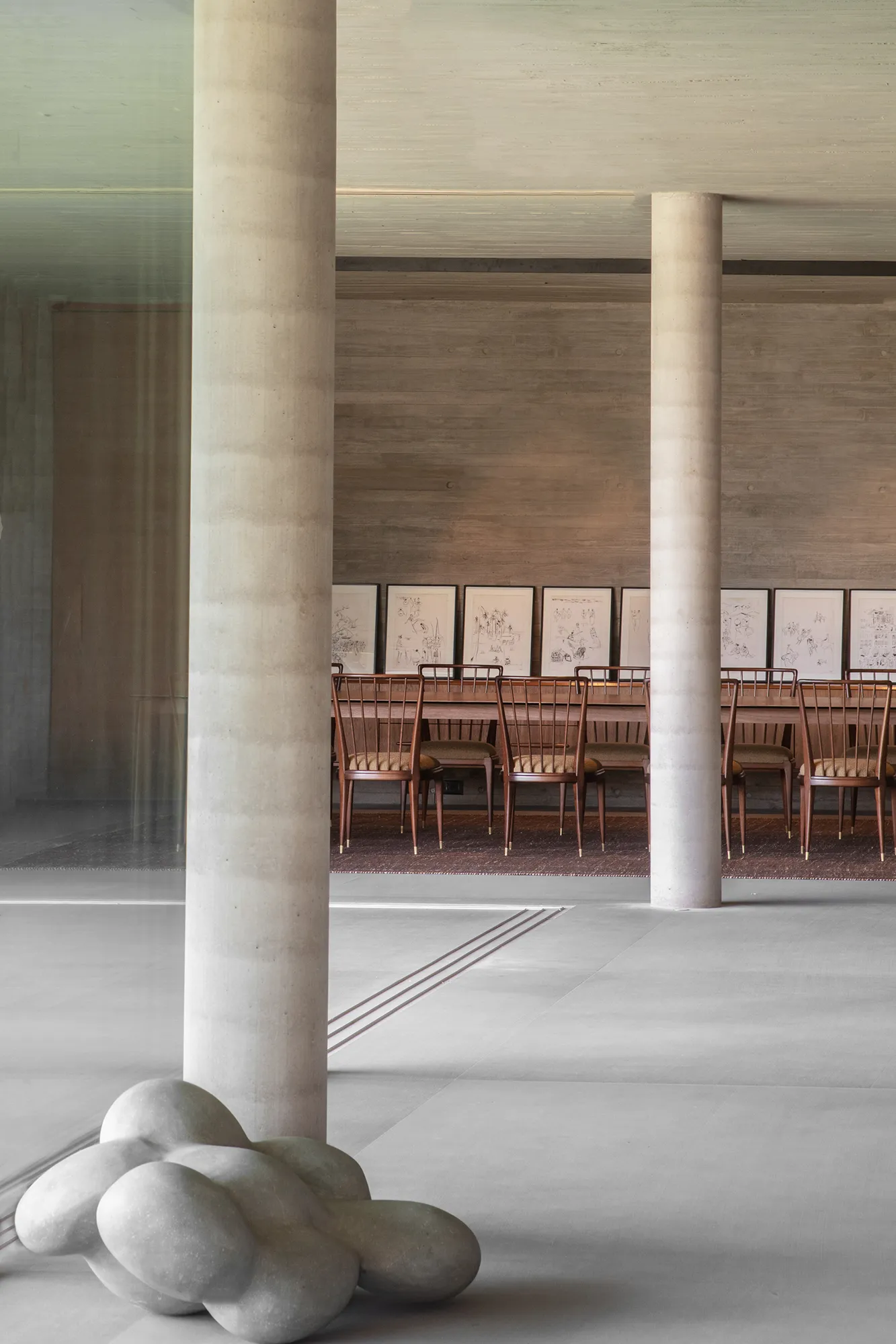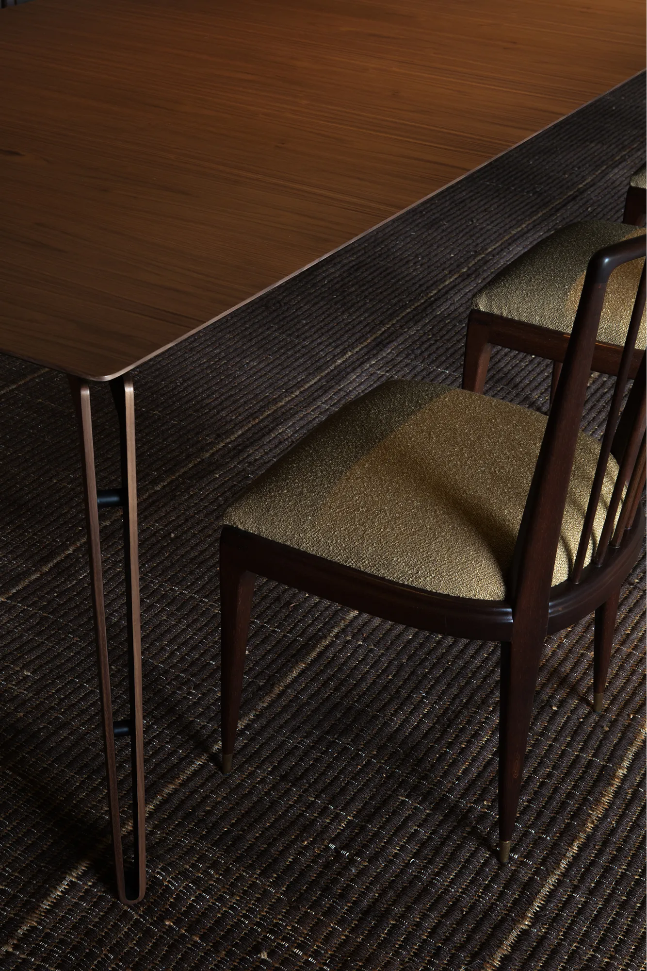 Internamente, a casa abriga uma importante coleção de mobiliário moderno brasileiro, com destaque para peças dos anos 1970 assinadas por Giuseppe Scapinelli. O desenho arquitetônico atua como suporte silencioso para o mobiliário e para a luz natural, que percorre os espaços ao longo do dia filtrada por brises e elementos estruturais que reforçam a cadência visual da casa.