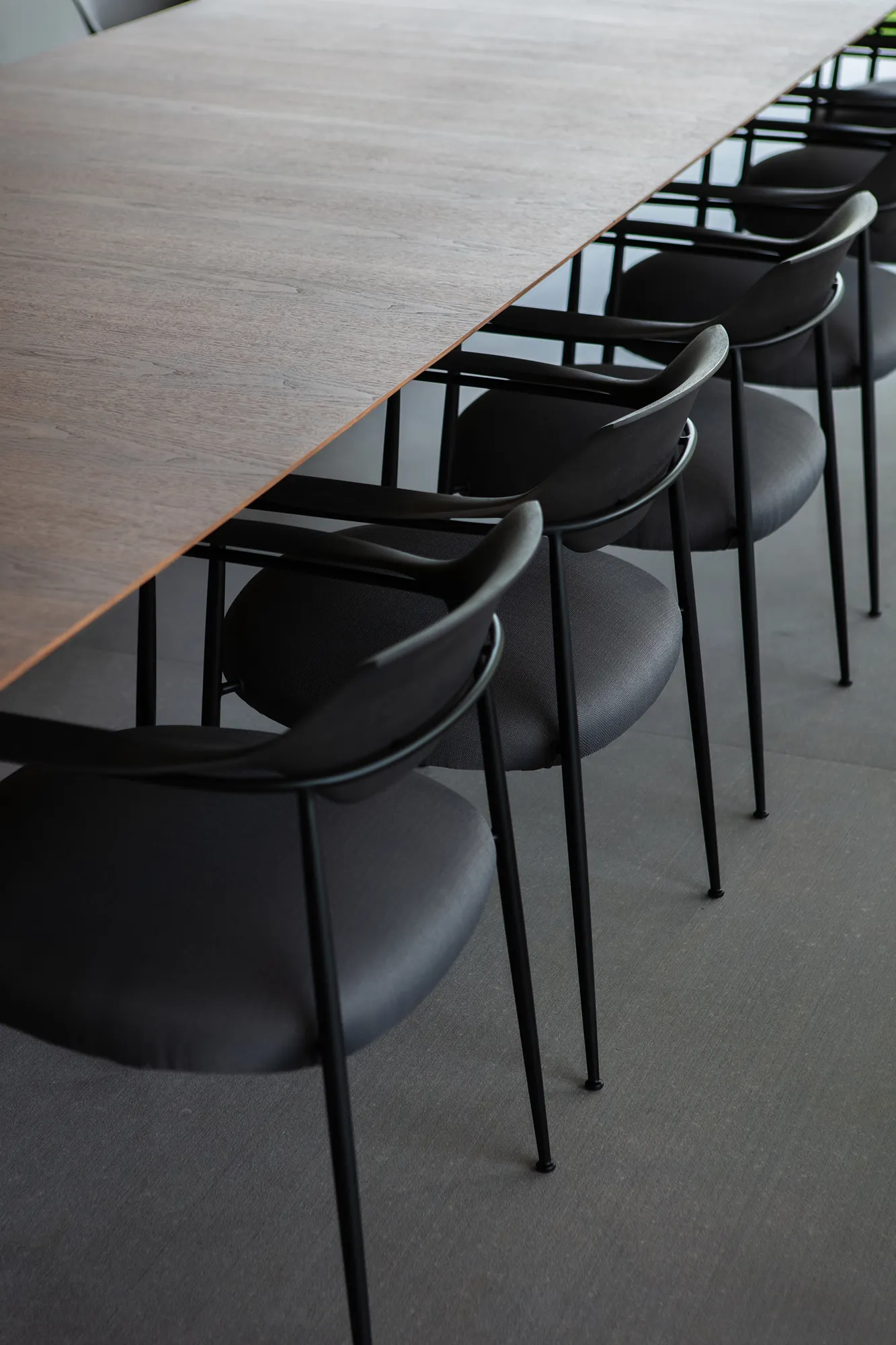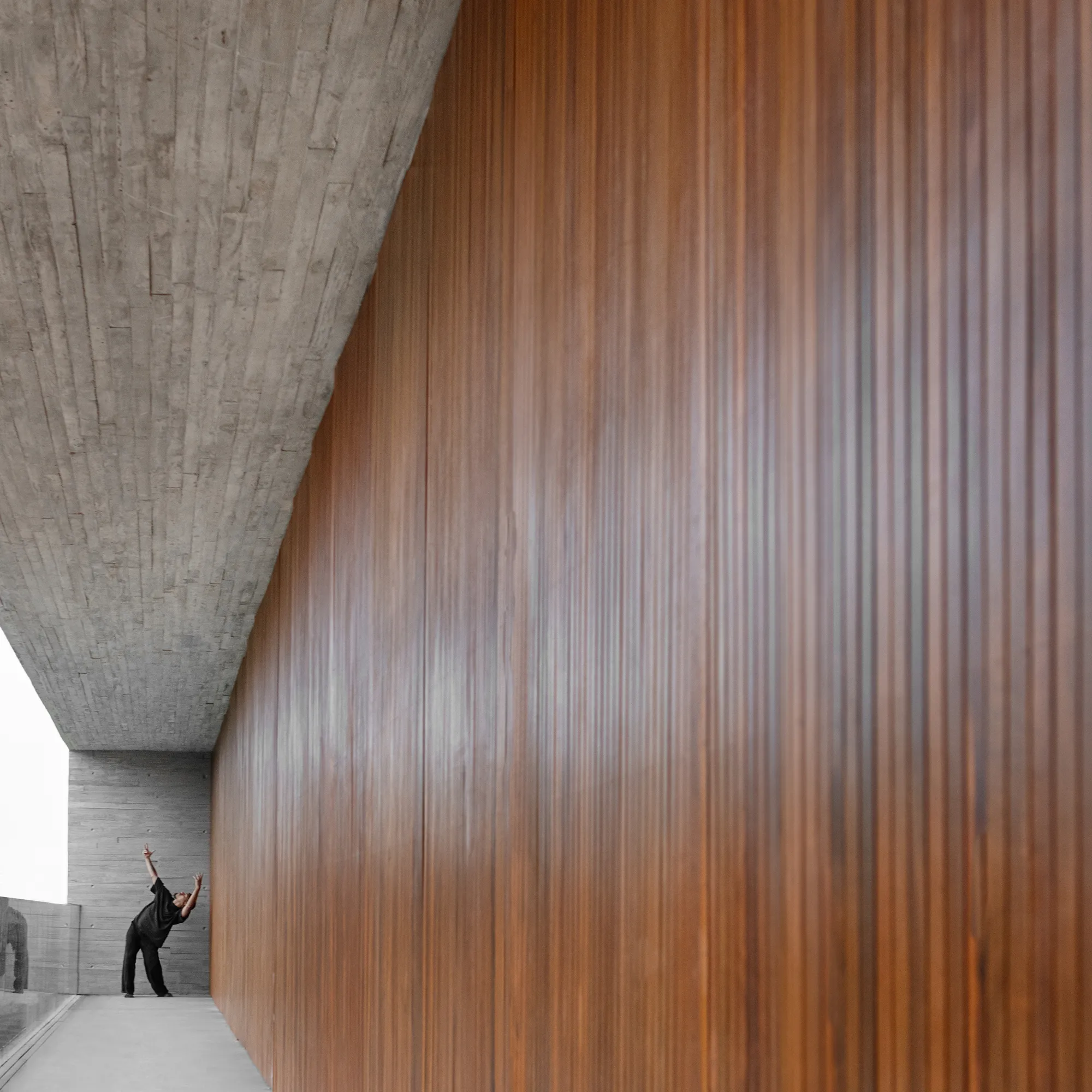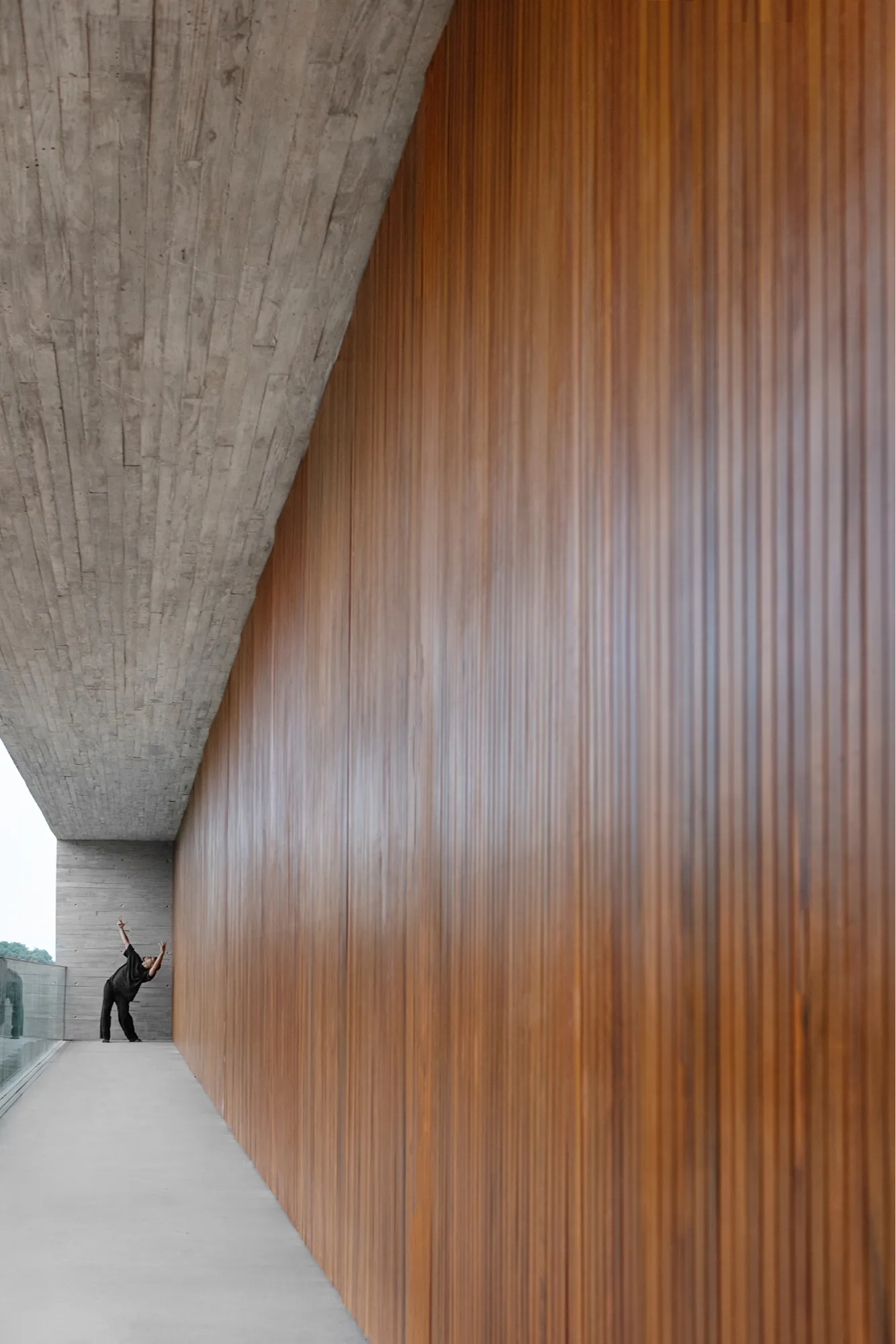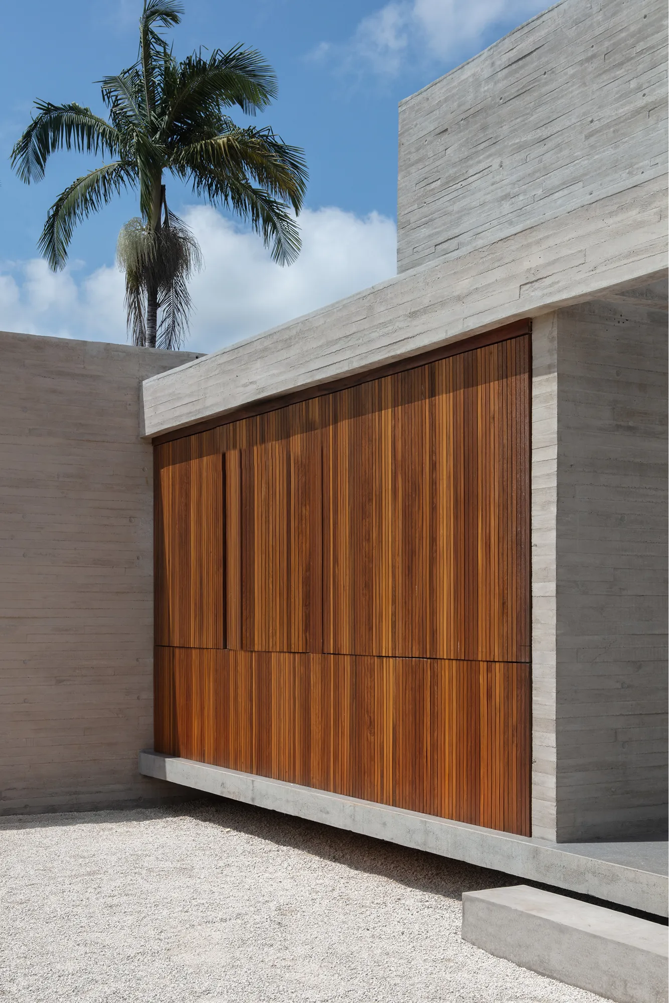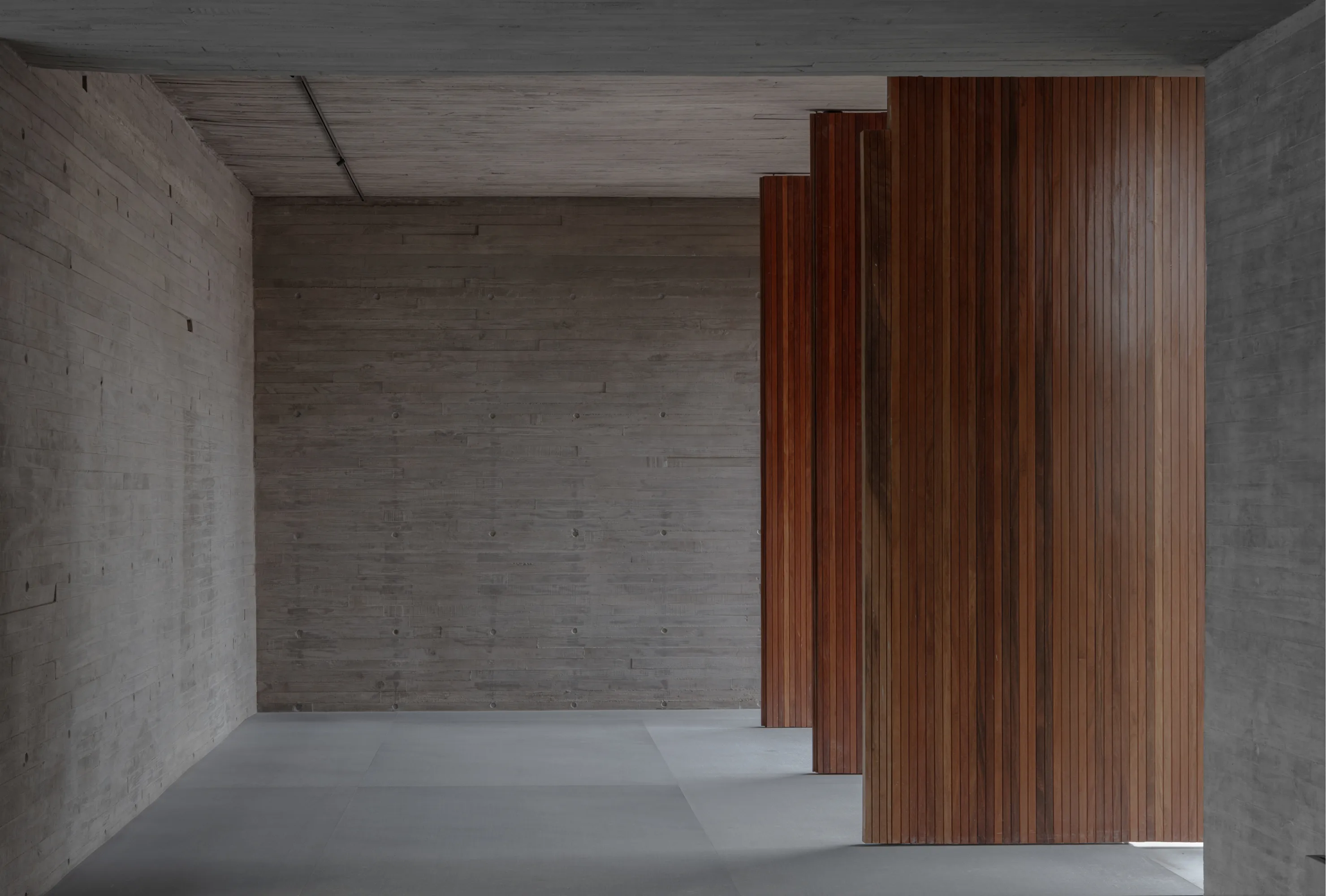 Com uma planta linear e racional, o projeto aposta na espacialidade como protagonista. A madeira, aplicada com rigor nos painéis verticais, contrapõe-se ao concreto com calor e sofisticação, marcando portas, forros e áreas de transição.
