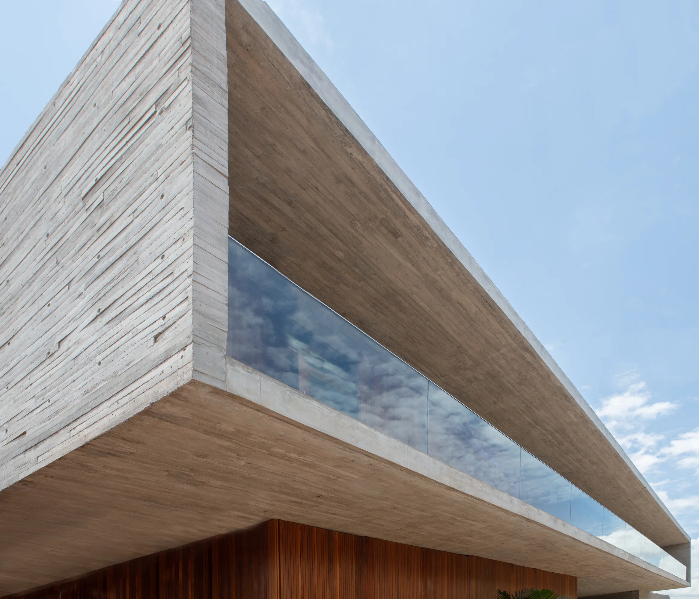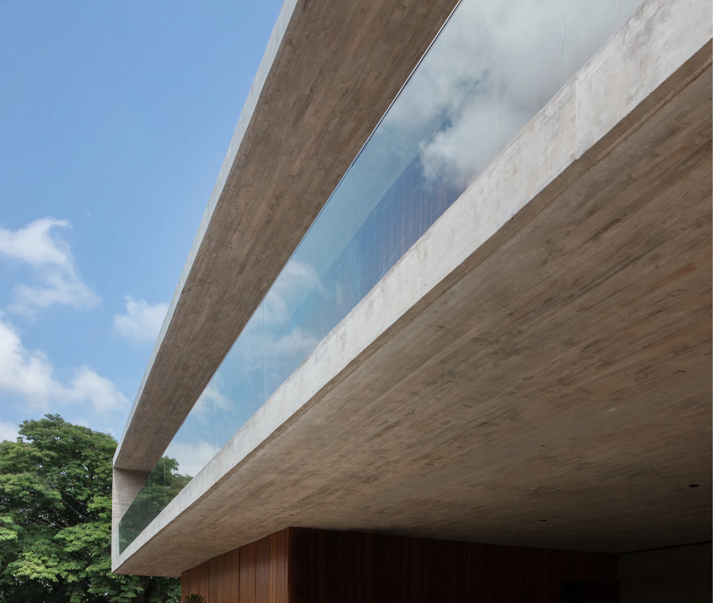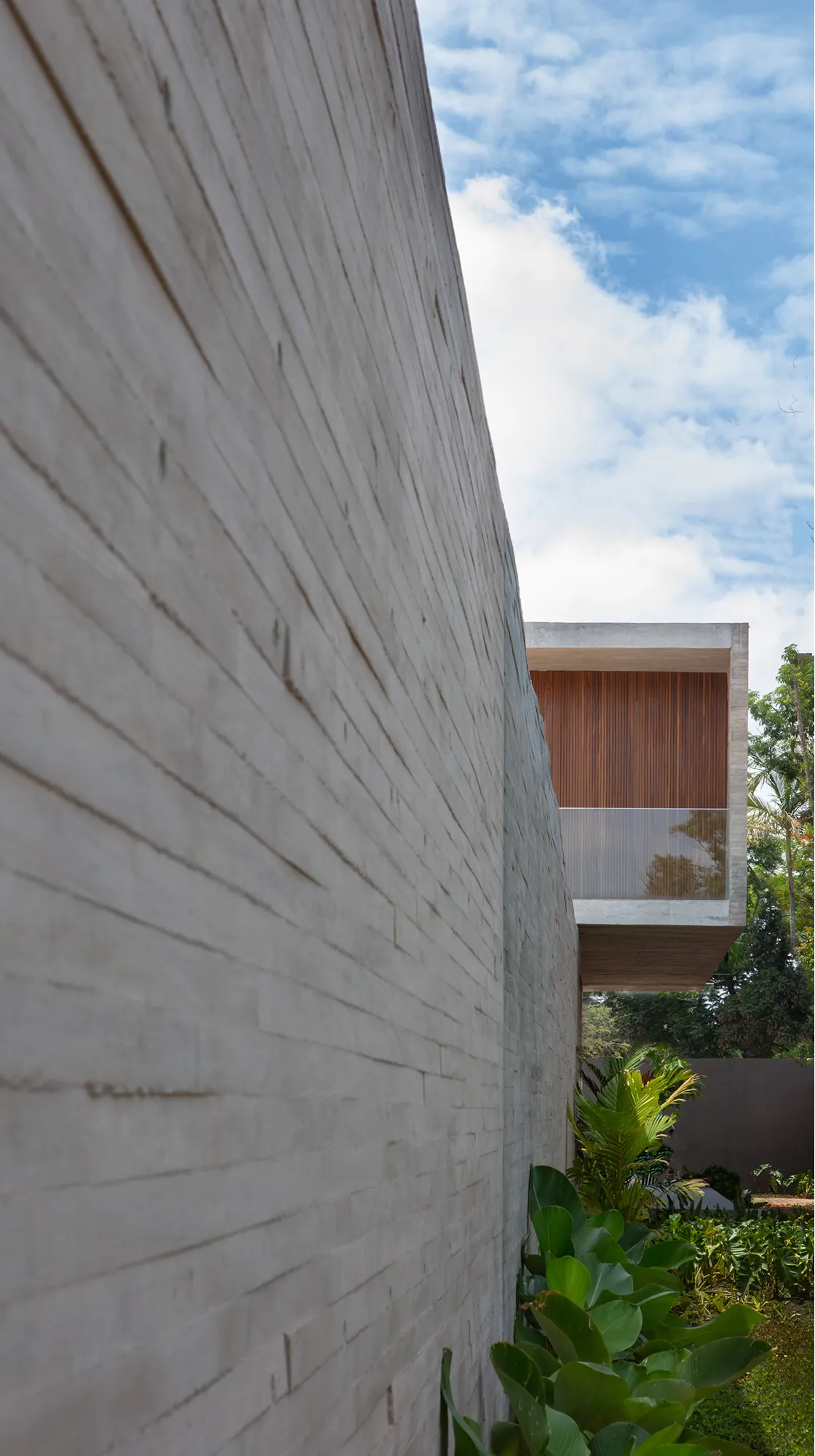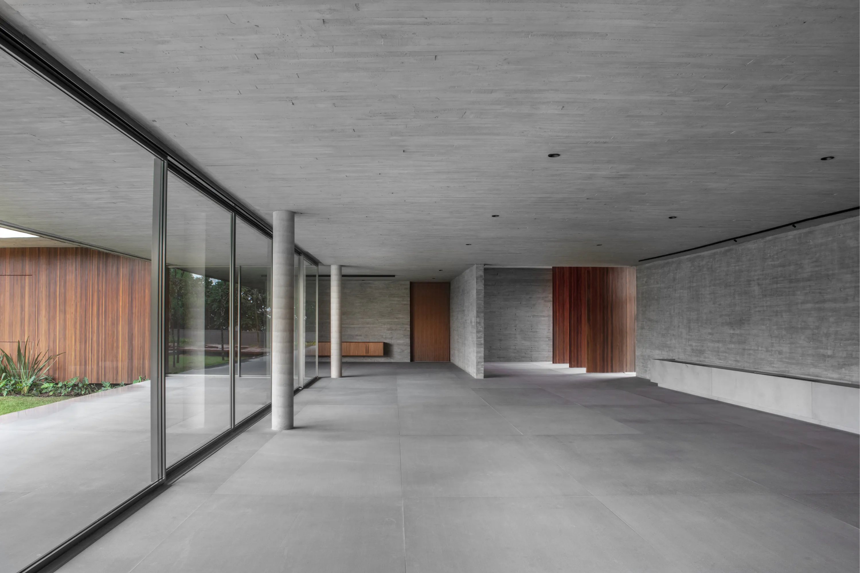 A Casa RM está situada em um terreno privilegiado no Lago Sul, conhecido como “ponta-seca” por ocupar a extremidade de um conjunto de residências, com generosa metragem e vistas amplas. A arquitetura parte de um gesto contido e preciso: volumes neutros e contínuos em concreto aparente definem uma casa ampla, silenciosa e profundamente integrada à sua paisagem.