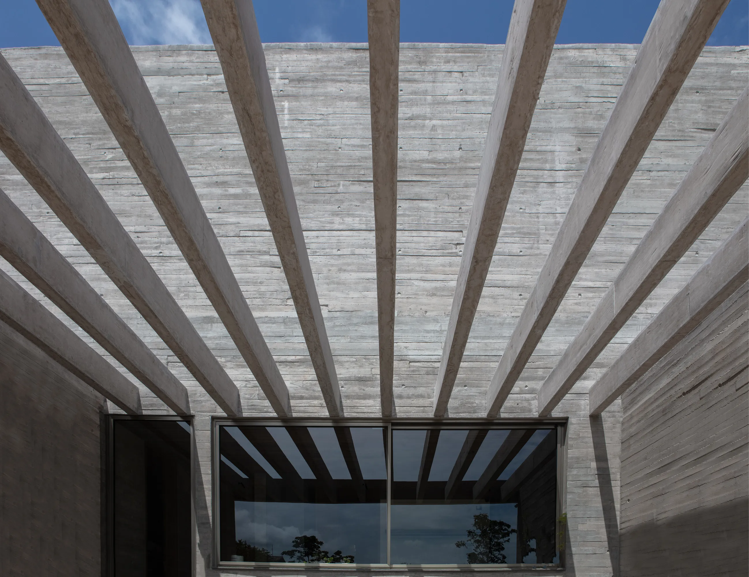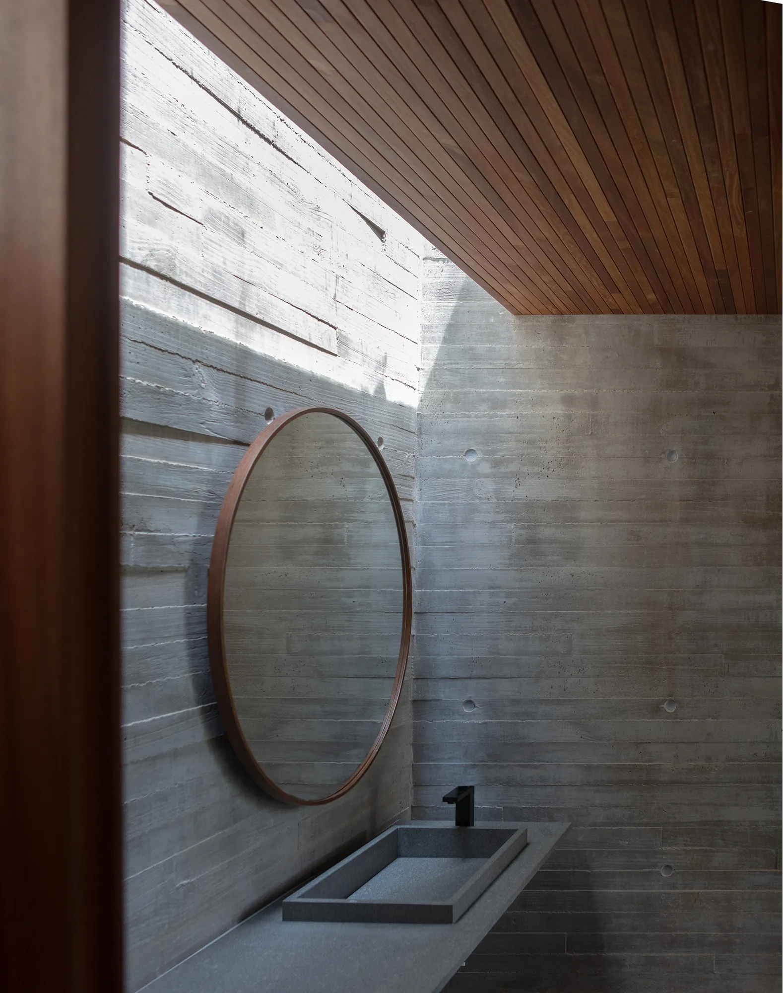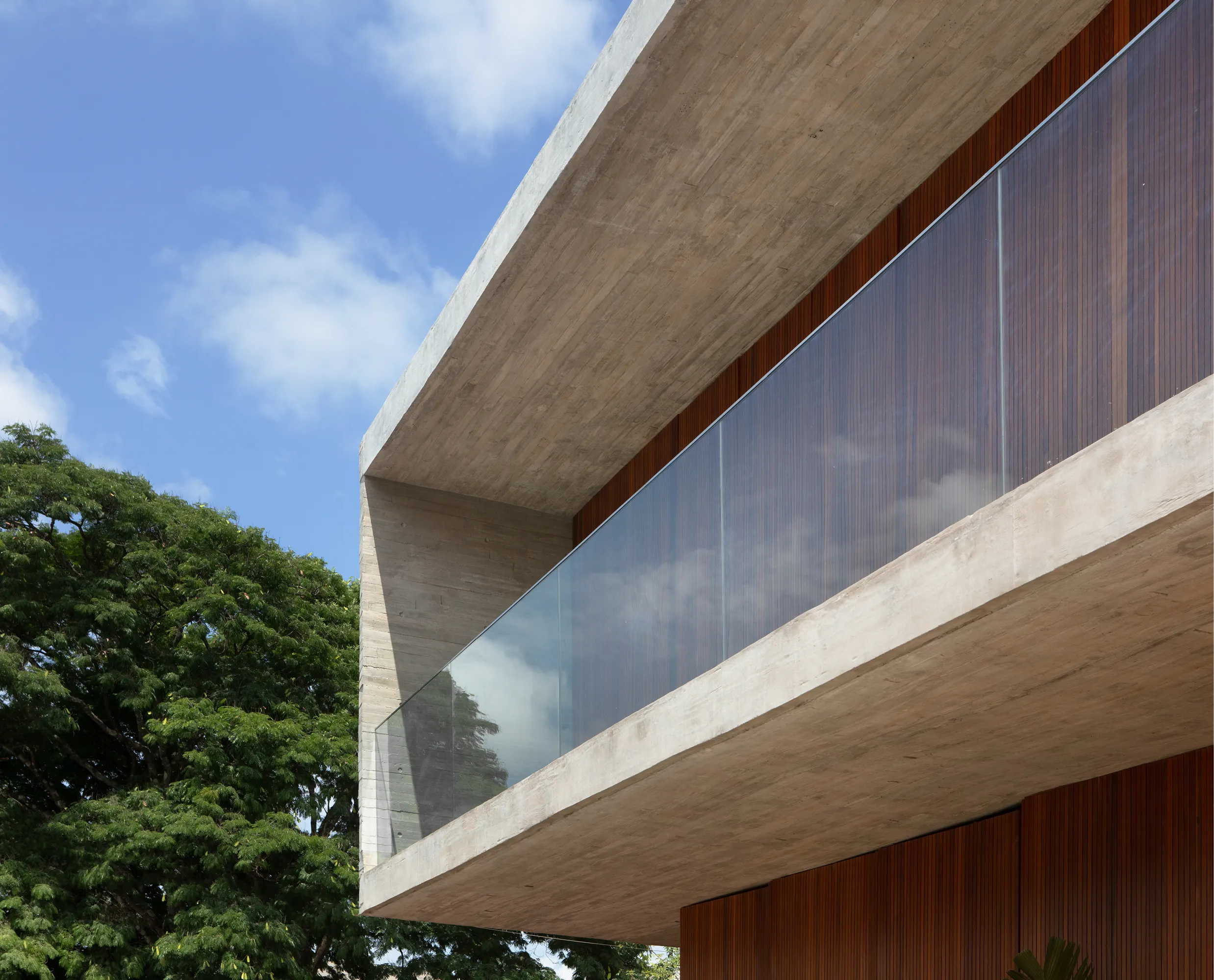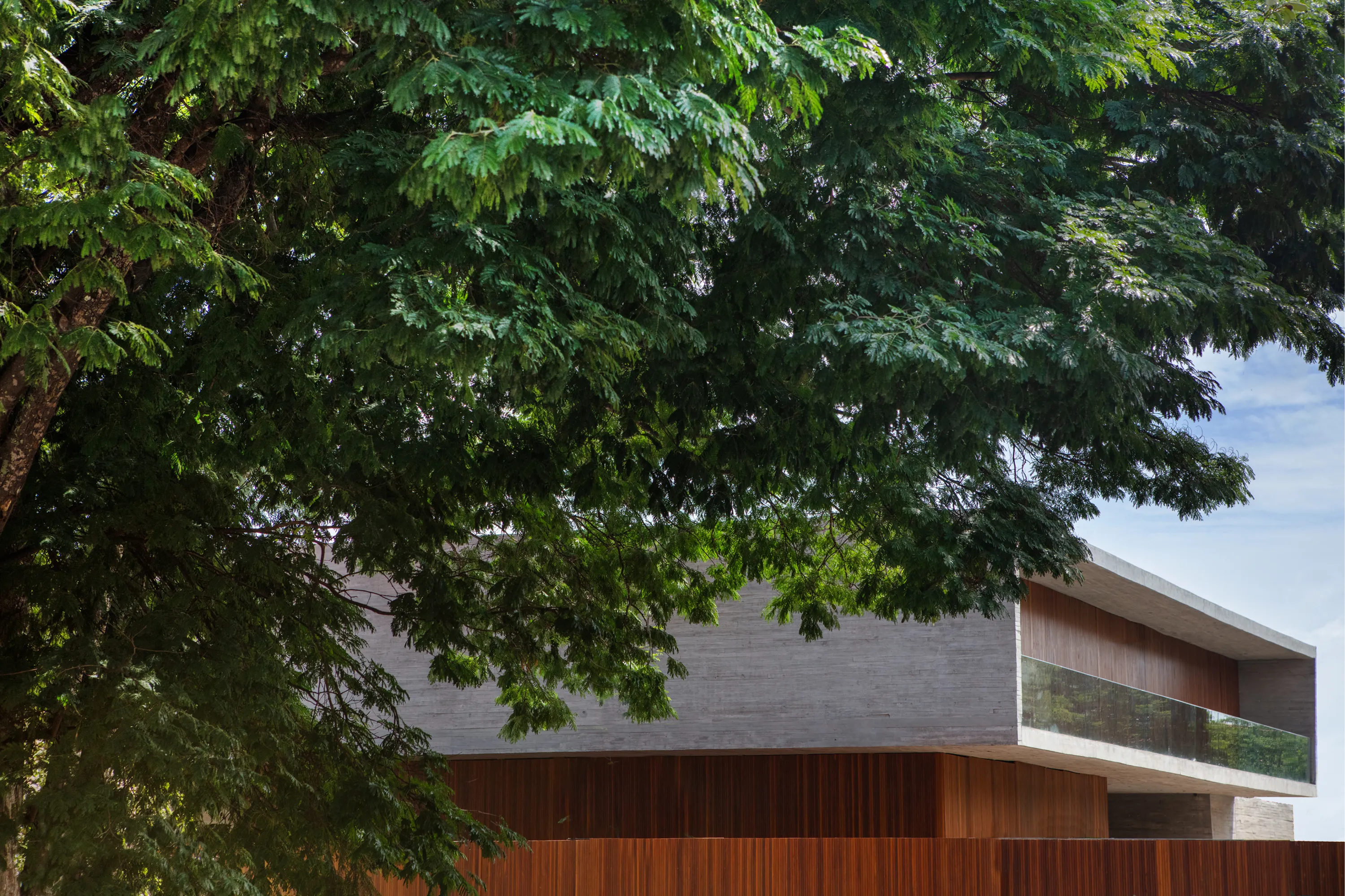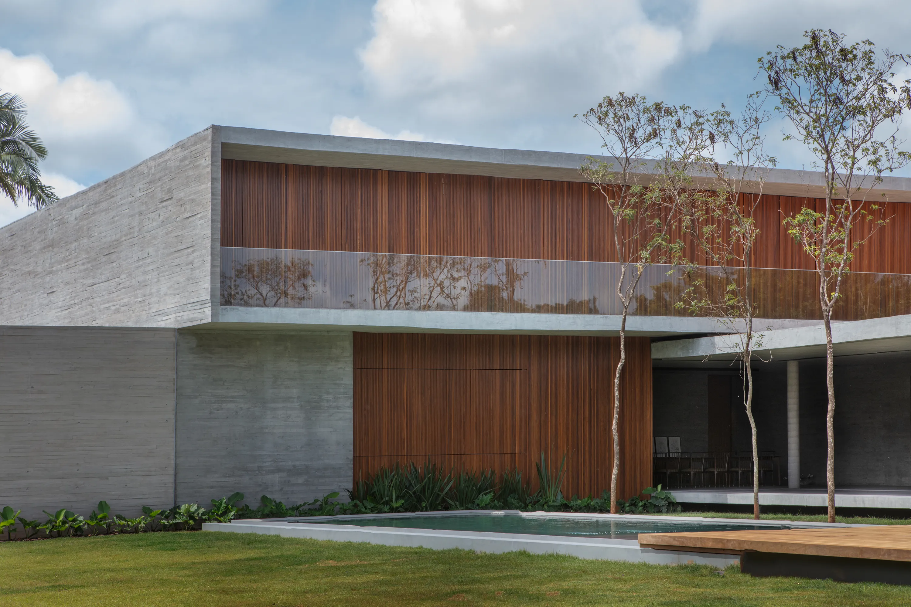 A Casa RM está situada em um terreno privilegiado no Lago Sul, conhecido como “ponta-seca” por ocupar a extremidade de um conjunto de residências, com generosa metragem e vistas amplas. A arquitetura parte de um gesto contido e preciso: volumes neutros e contínuos em concreto aparente definem uma casa ampla, silenciosa e profundamente integrada à sua paisagem.
