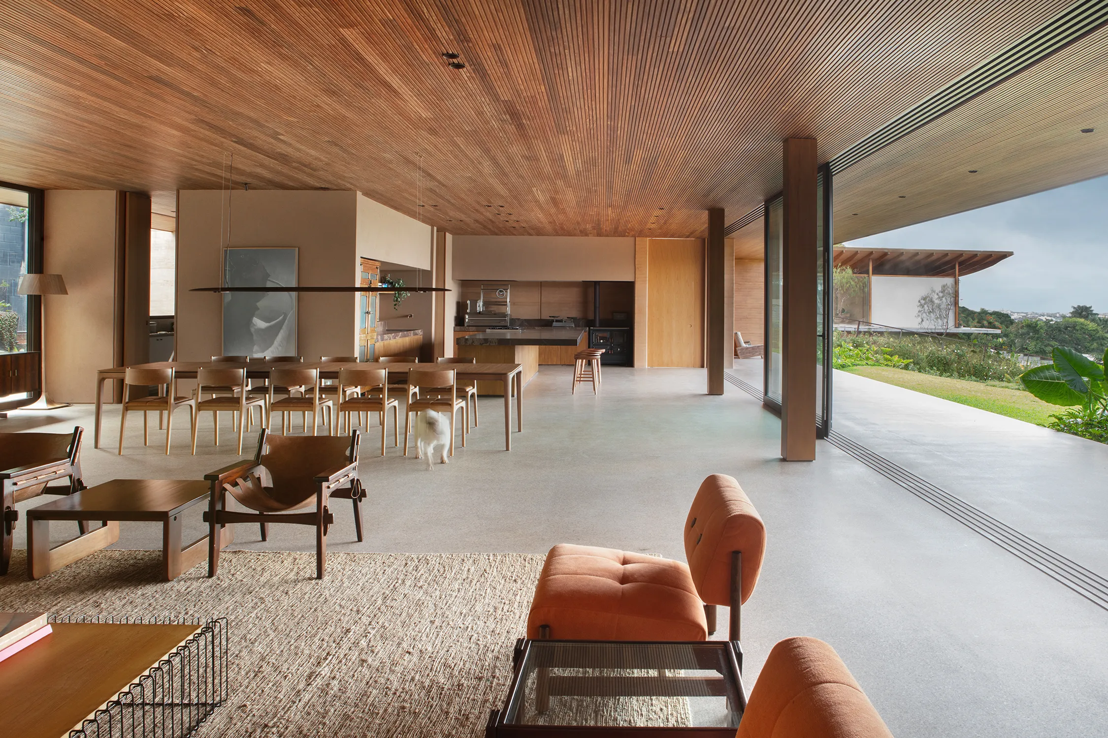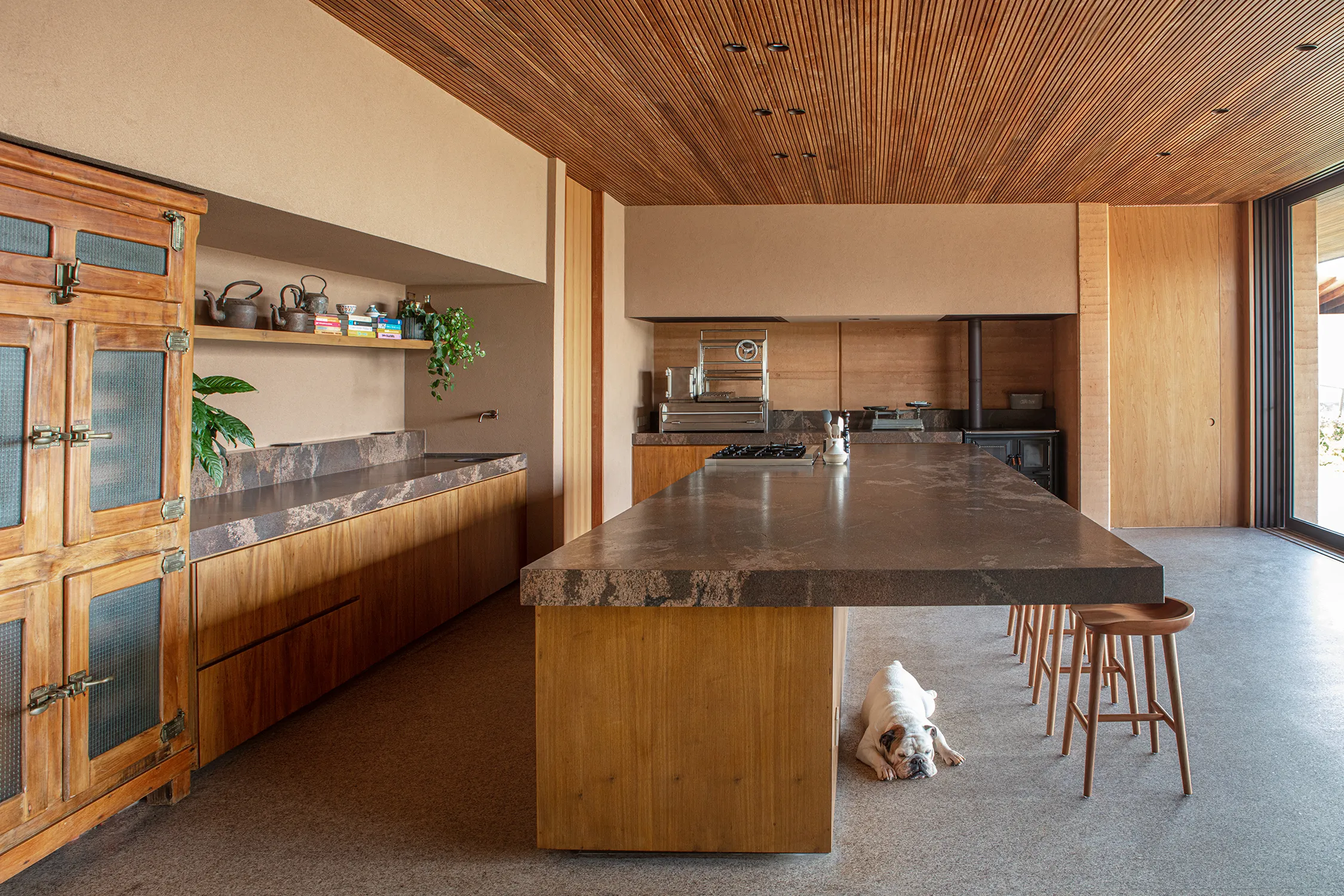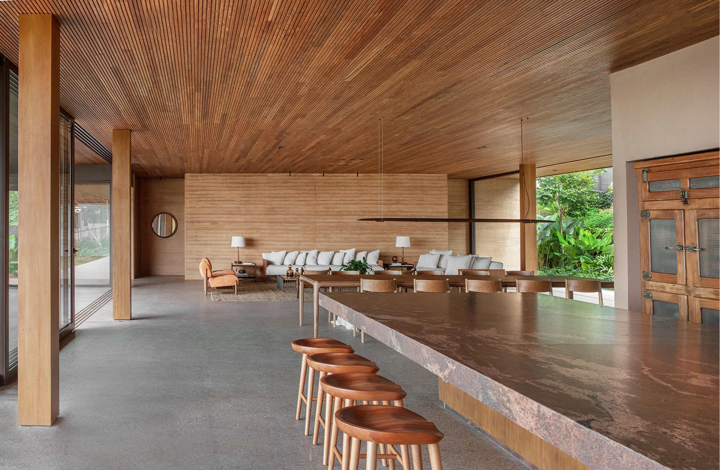 O gourmet multifuncional serve para conectar diferentes partes da casa e transmitir uma atmosfera acolhedora e festiva. Além disso, a decoração rústica foi planejada para refletir a autenticidade e a personalidade dos clientes.