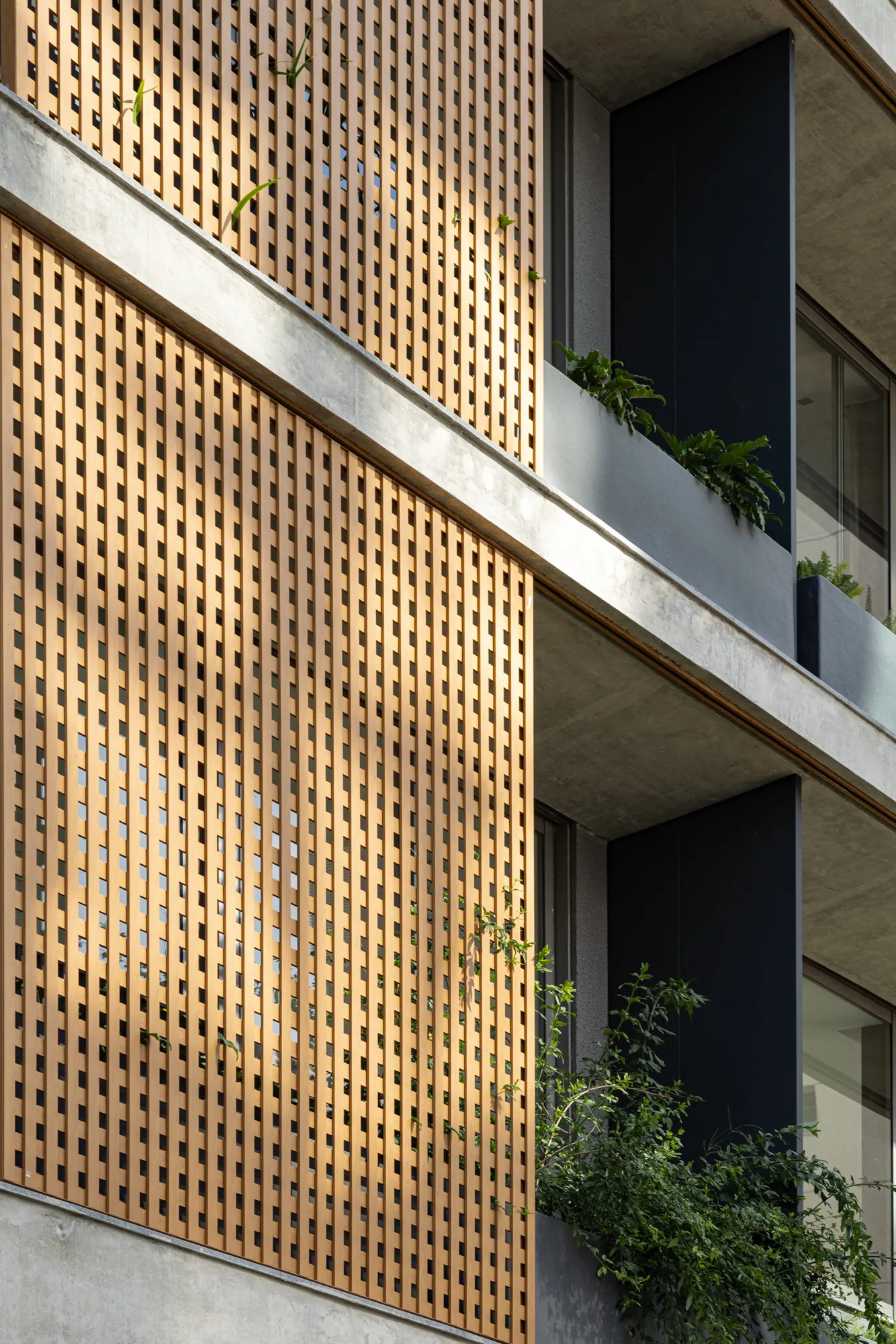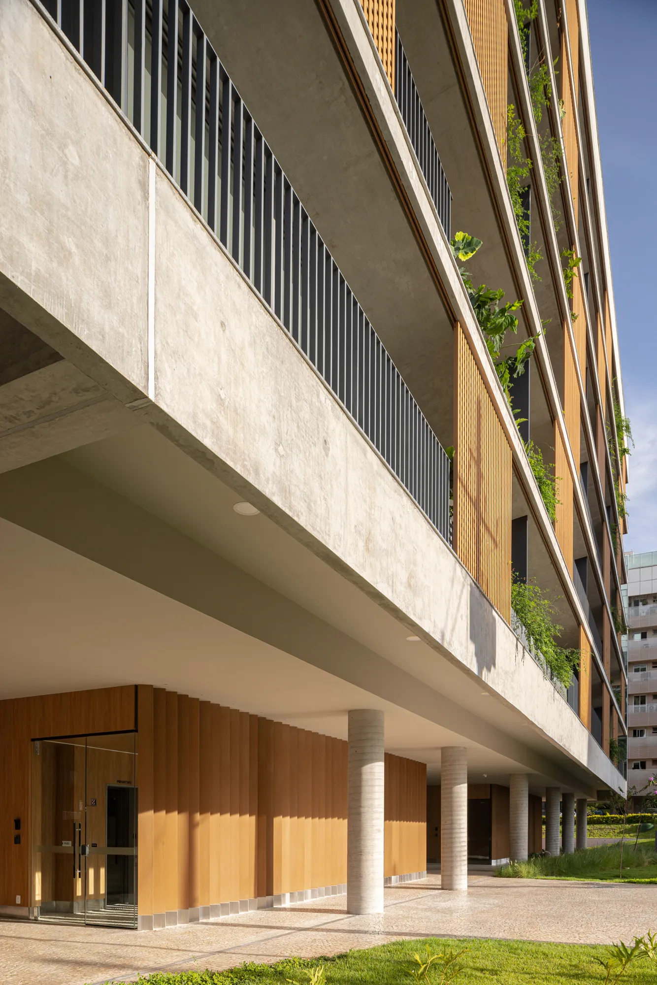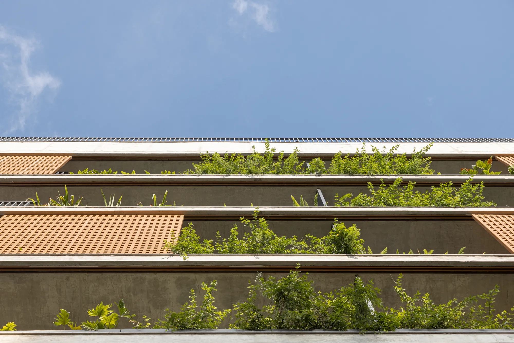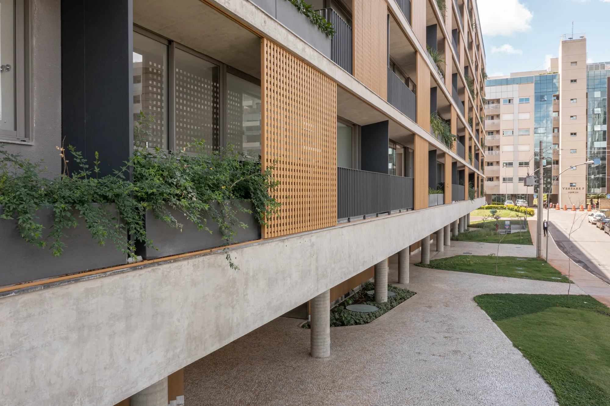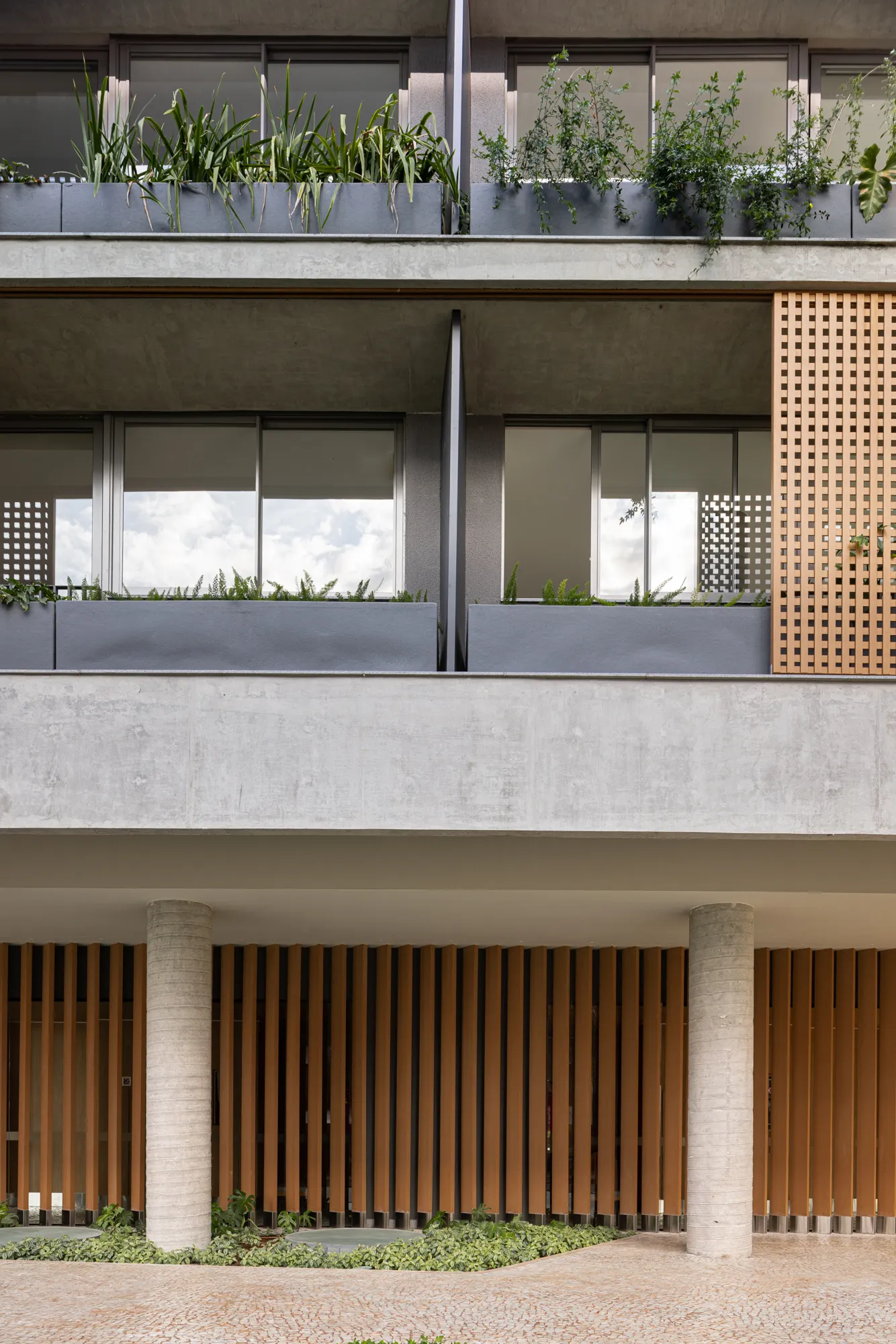 Sua volumetria segue o gabarito das edificações vizinhas, e se destaca pela materialidade leve e tropical: painéis de madeira que funcionam como brieses móveis e revestimentos naturais trazem textura, sombra e ventilação — traduzindo os ideais modernos em soluções contemporâneas.