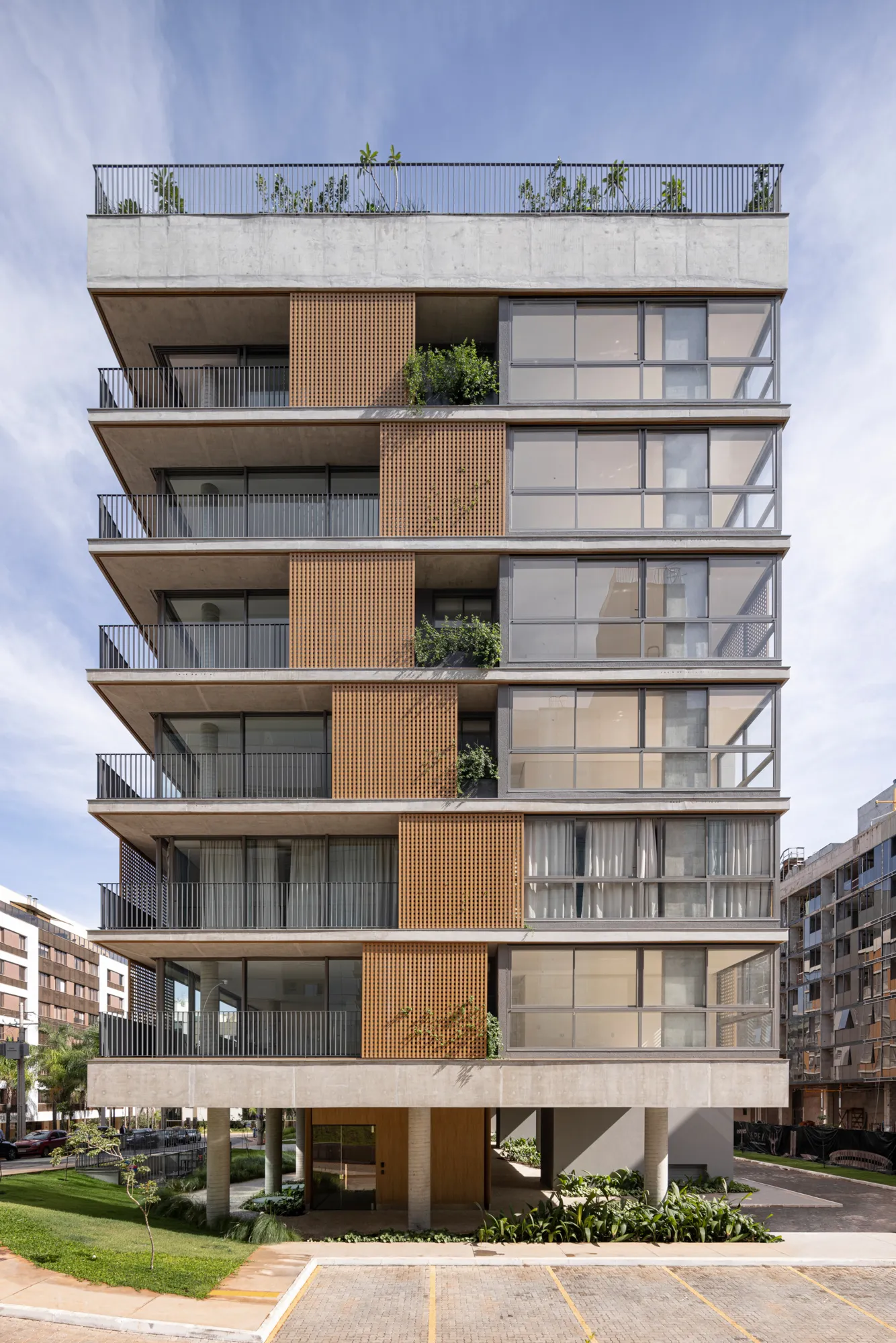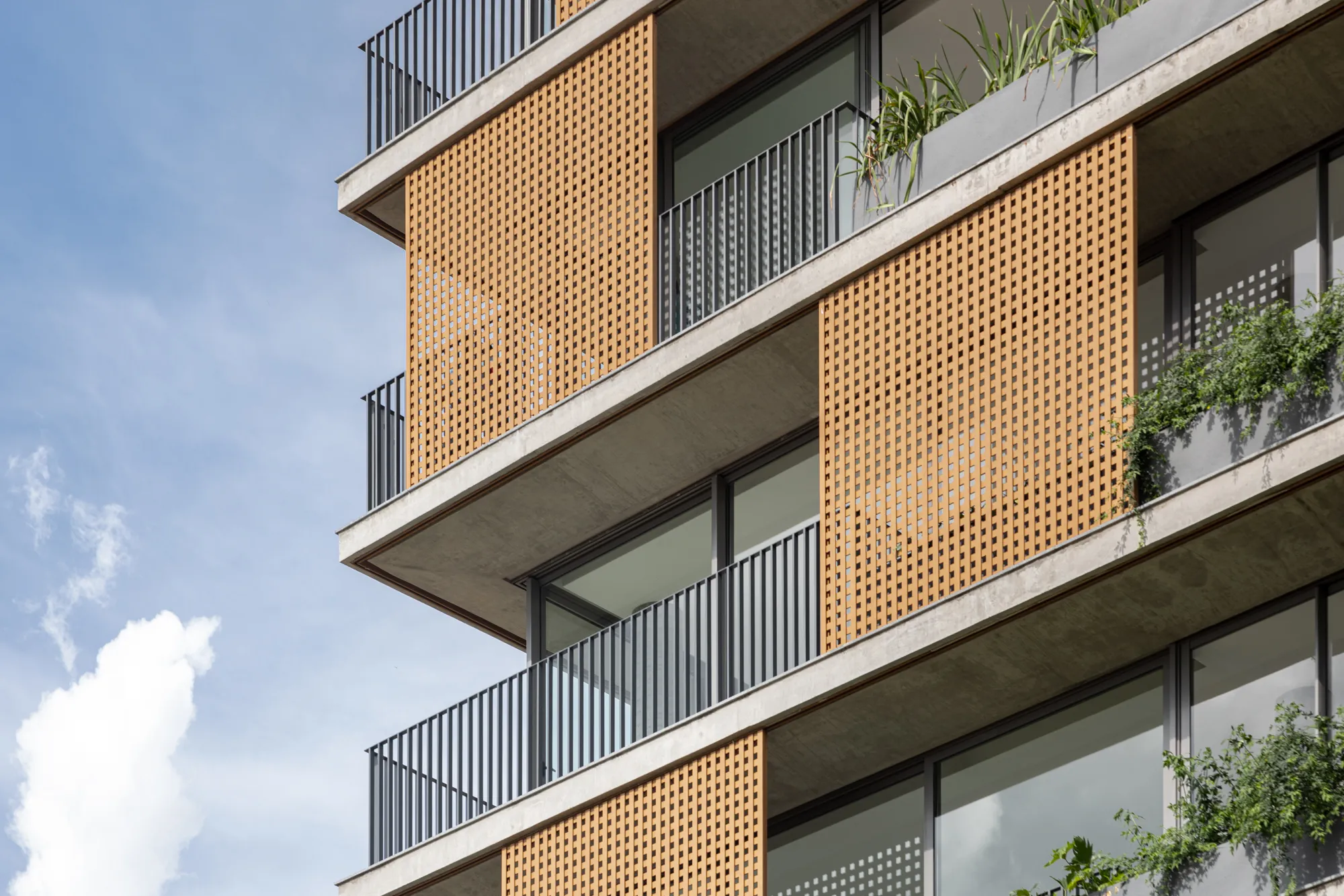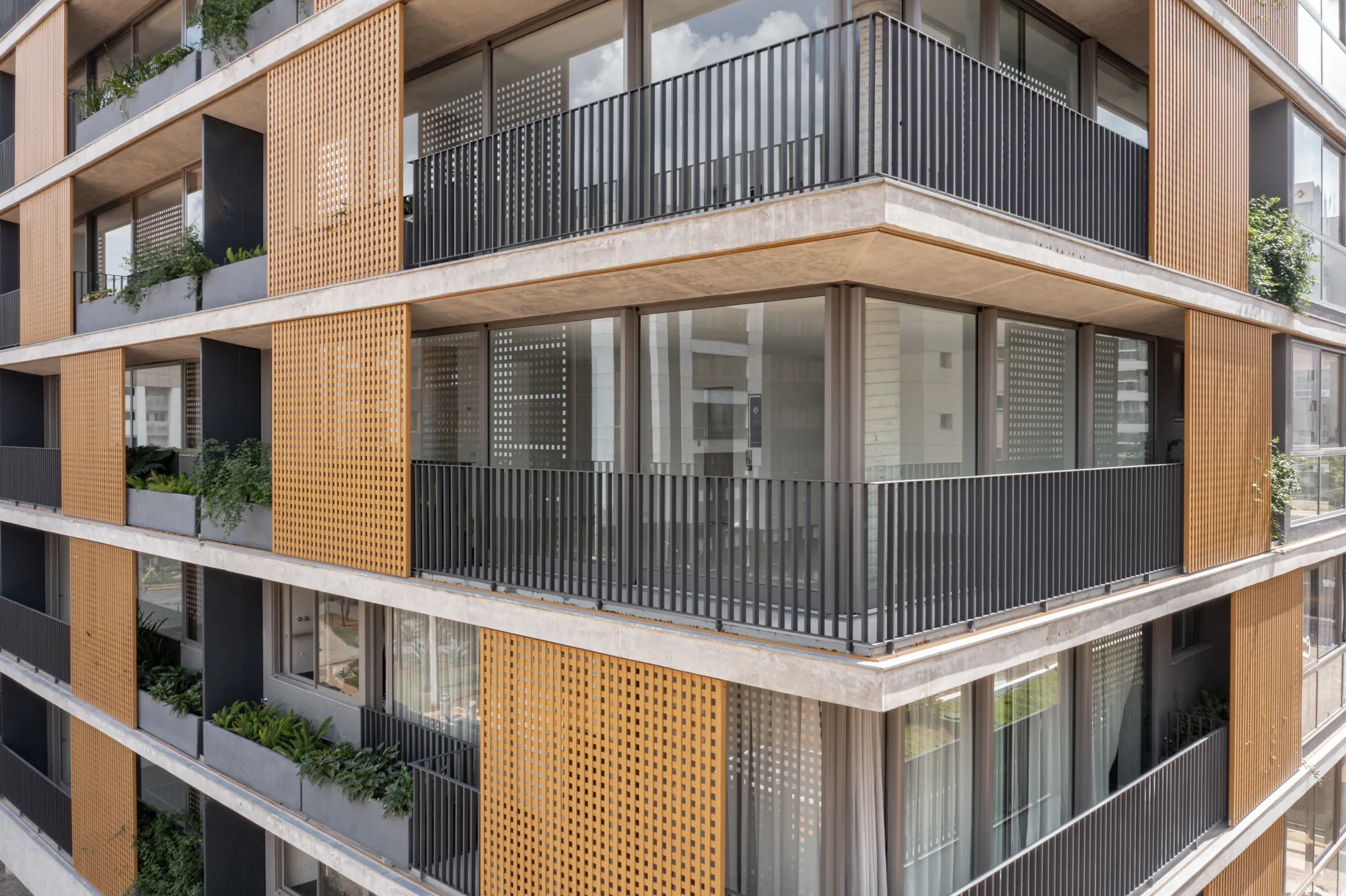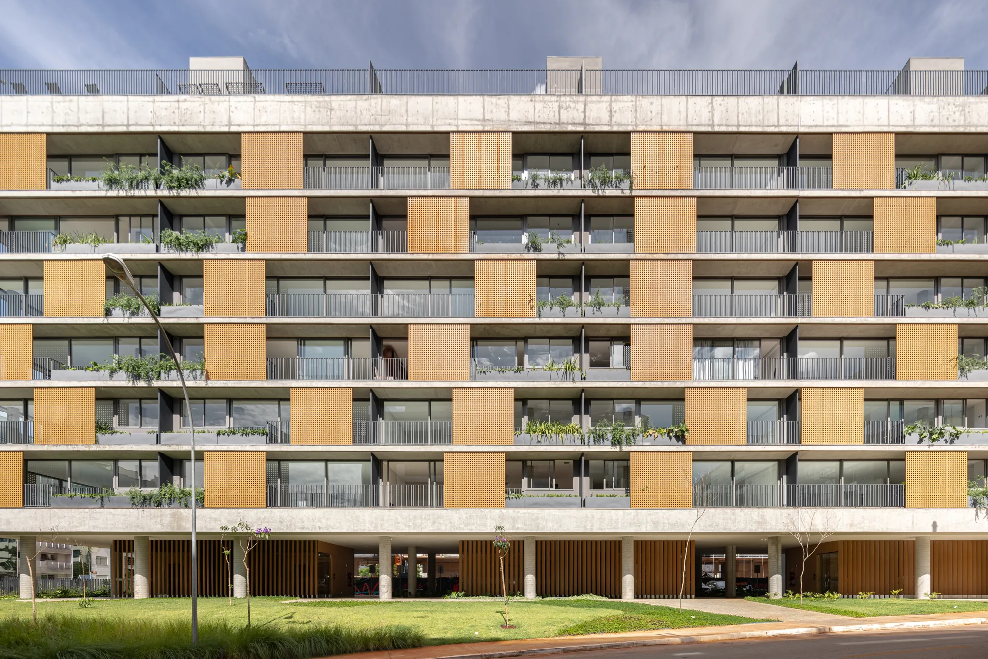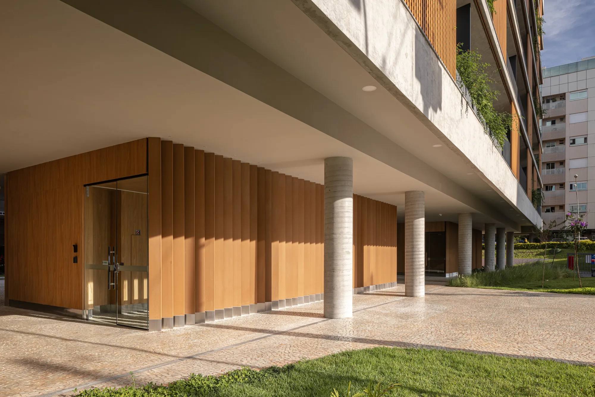 Sua volumetria segue o gabarito das edificações vizinhas, e se destaca pela materialidade leve e tropical: painéis de madeira que funcionam como brieses móveis e revestimentos naturais trazem textura, sombra e ventilação — traduzindo os ideais modernos em soluções contemporâneas.