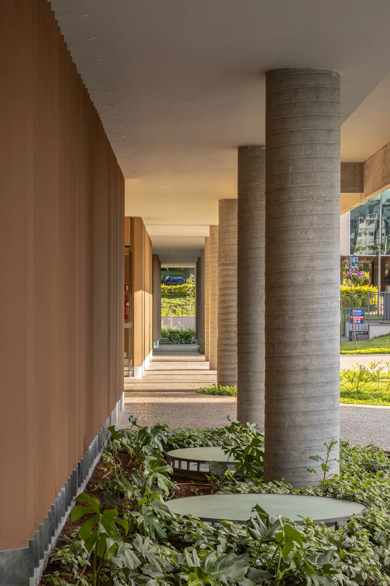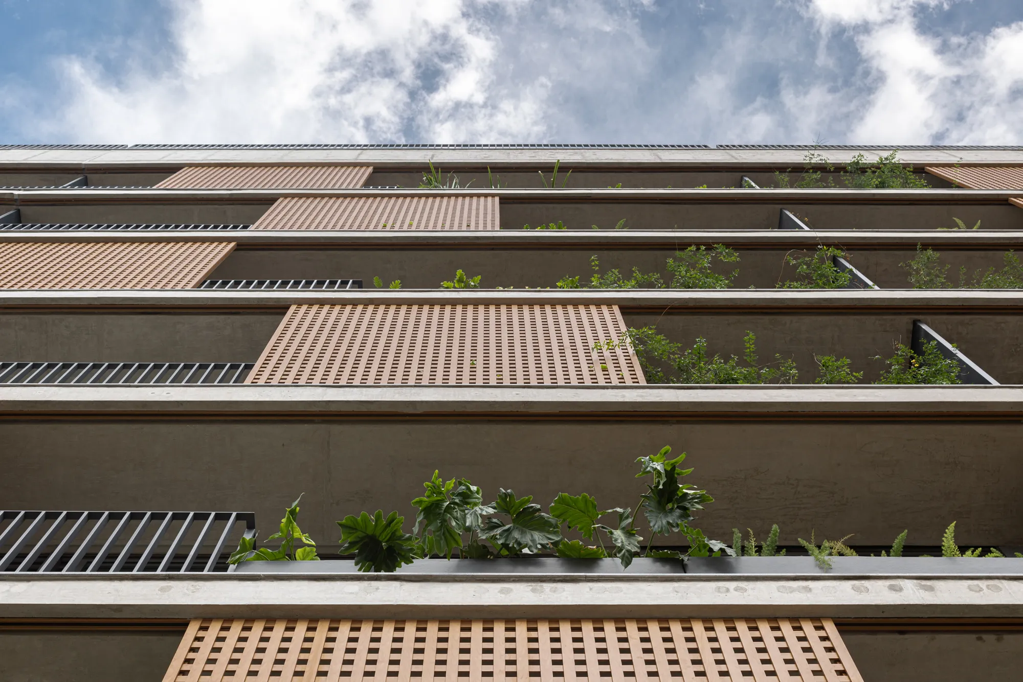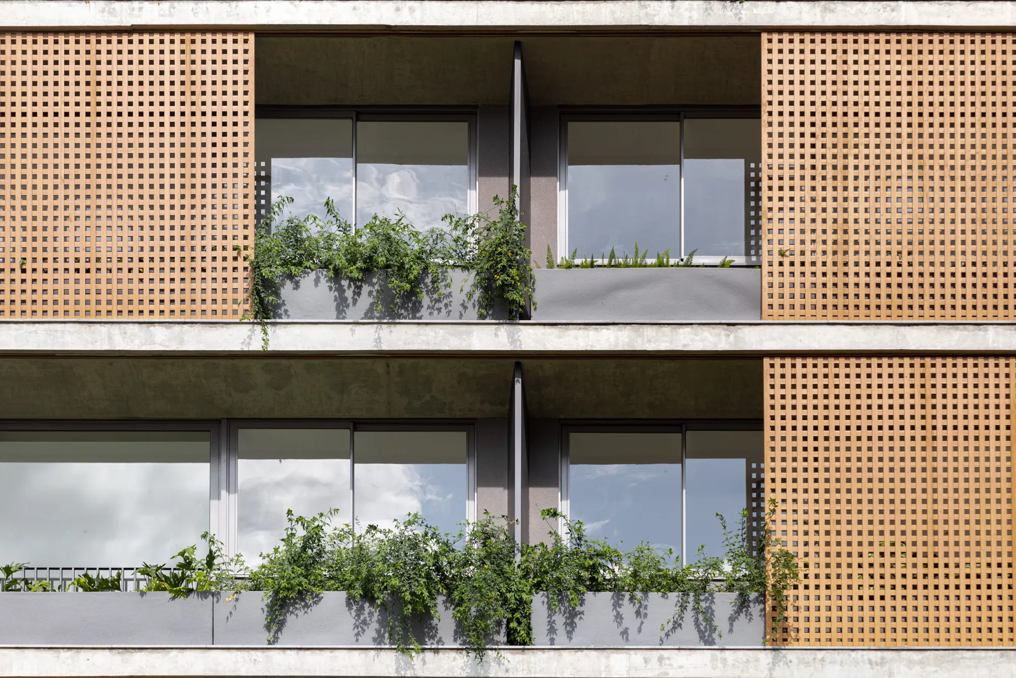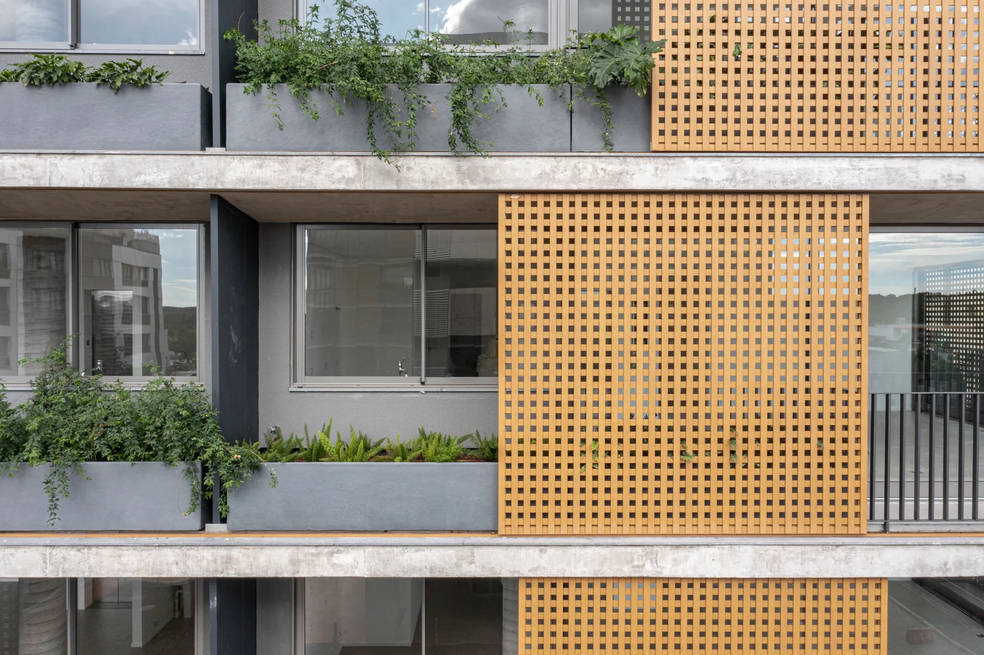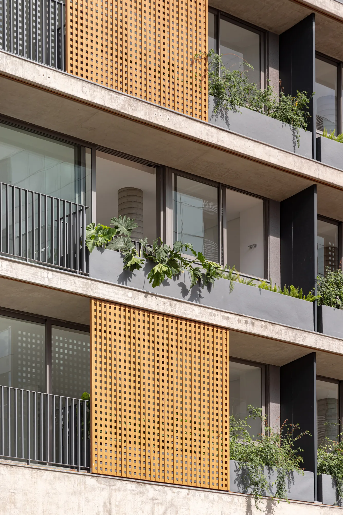 Sua volumetria segue o gabarito das edificações vizinhas, e se destaca pela materialidade leve e tropical: painéis de madeira que funcionam como brieses móveis e revestimentos naturais trazem textura, sombra e ventilação — traduzindo os ideais modernos em soluções contemporâneas.