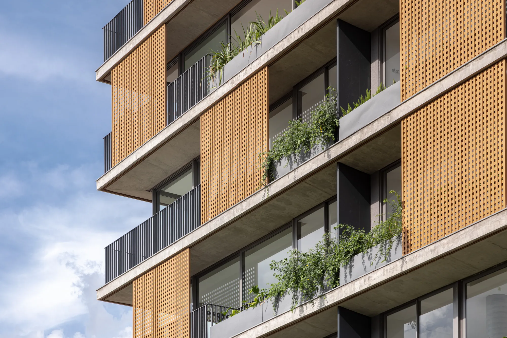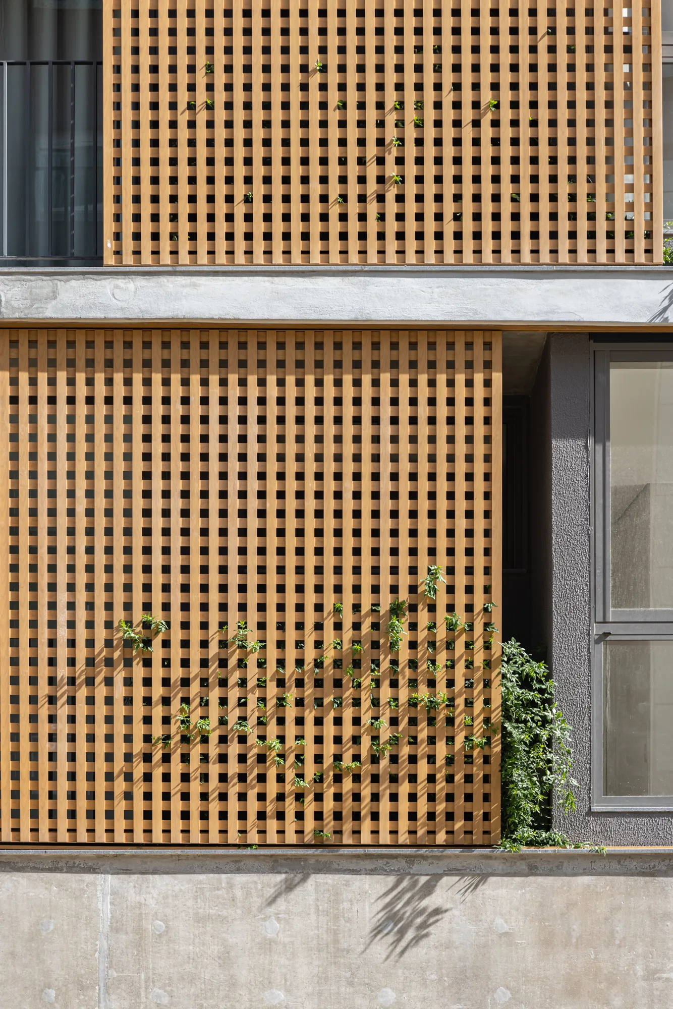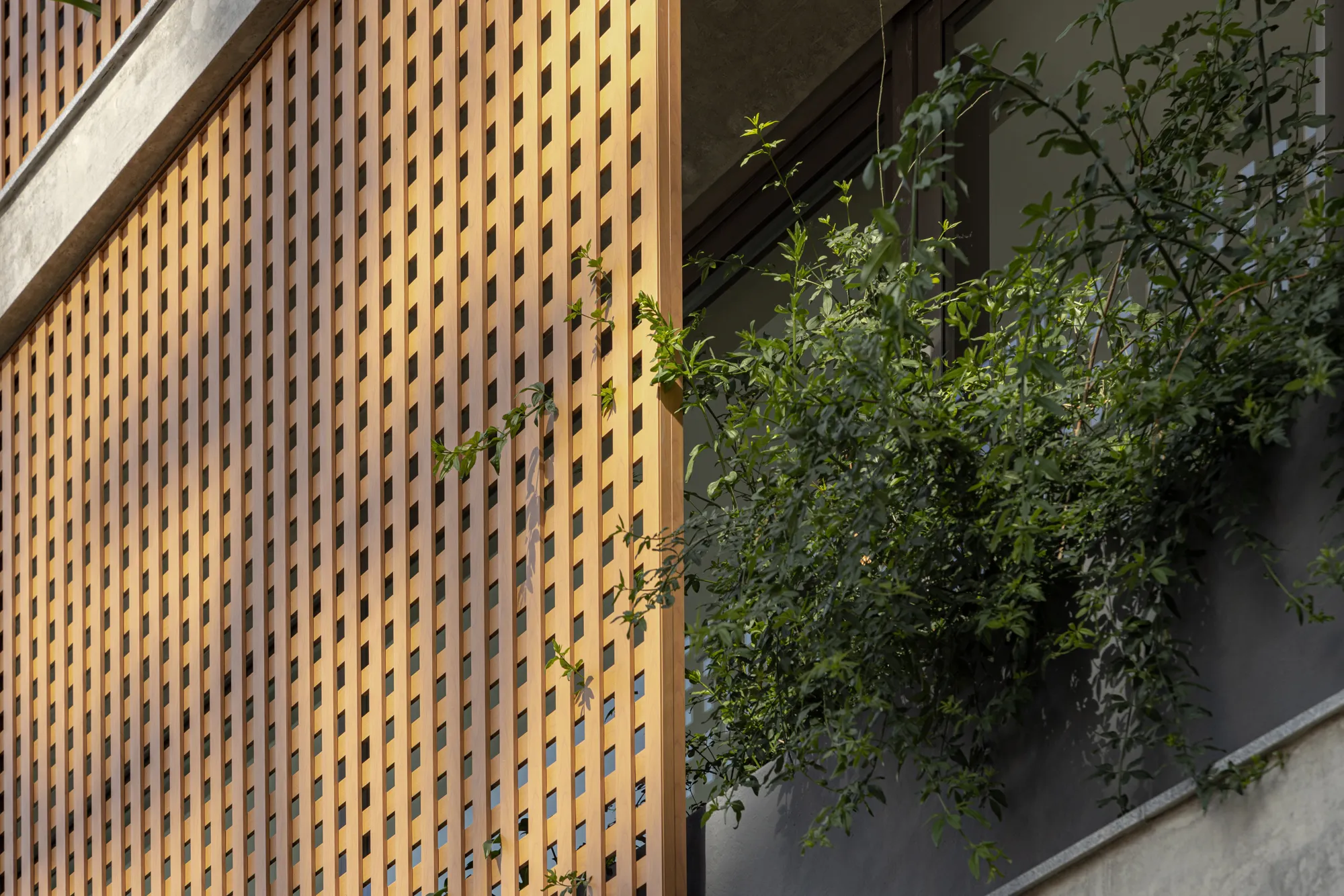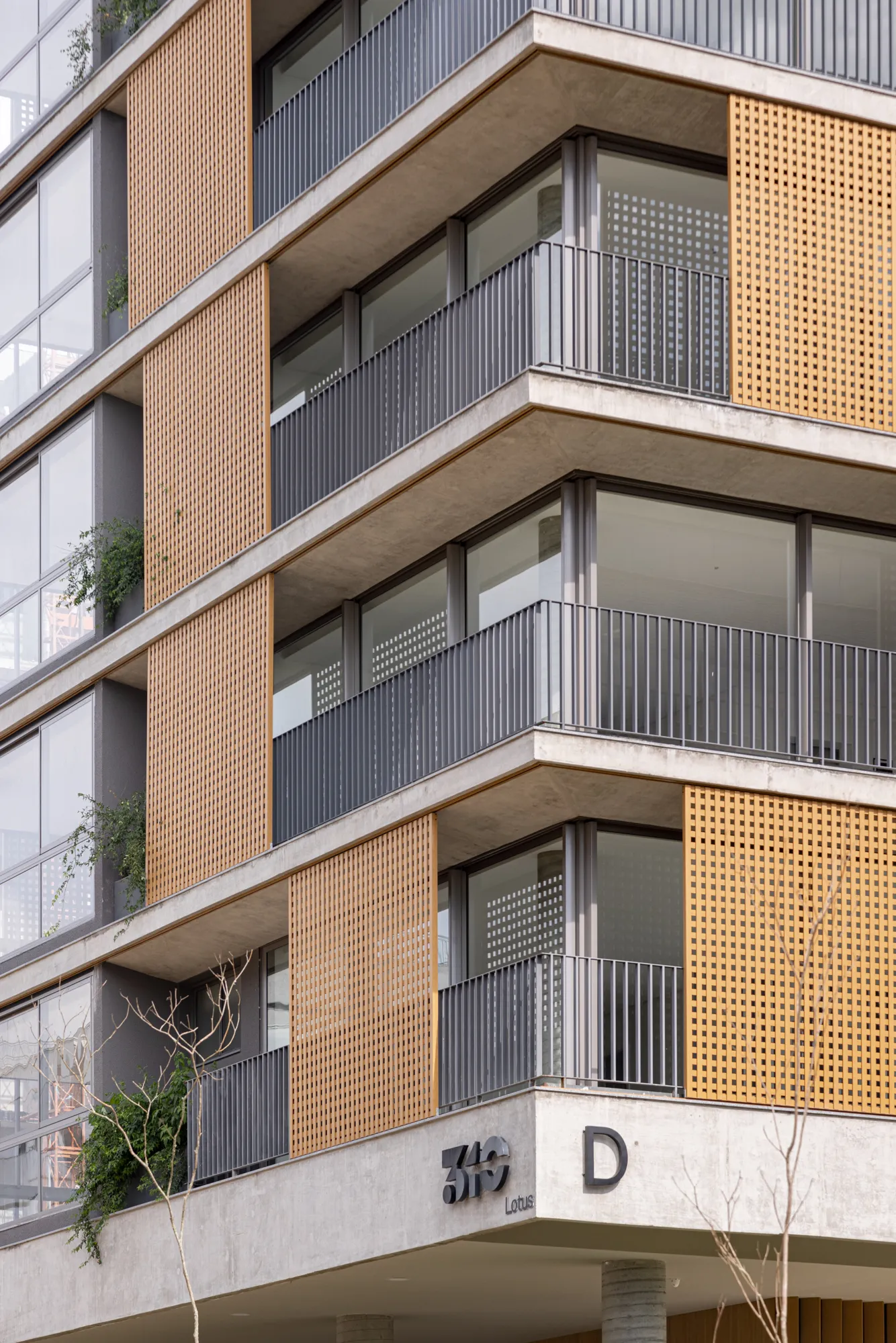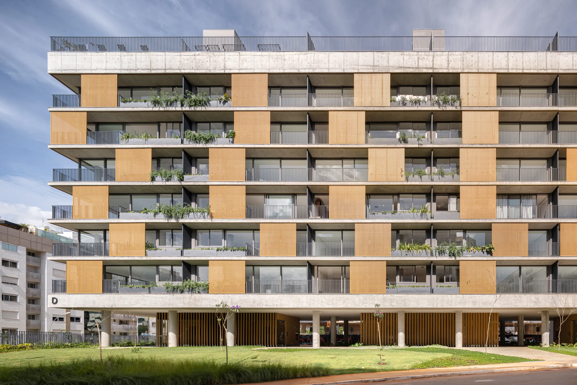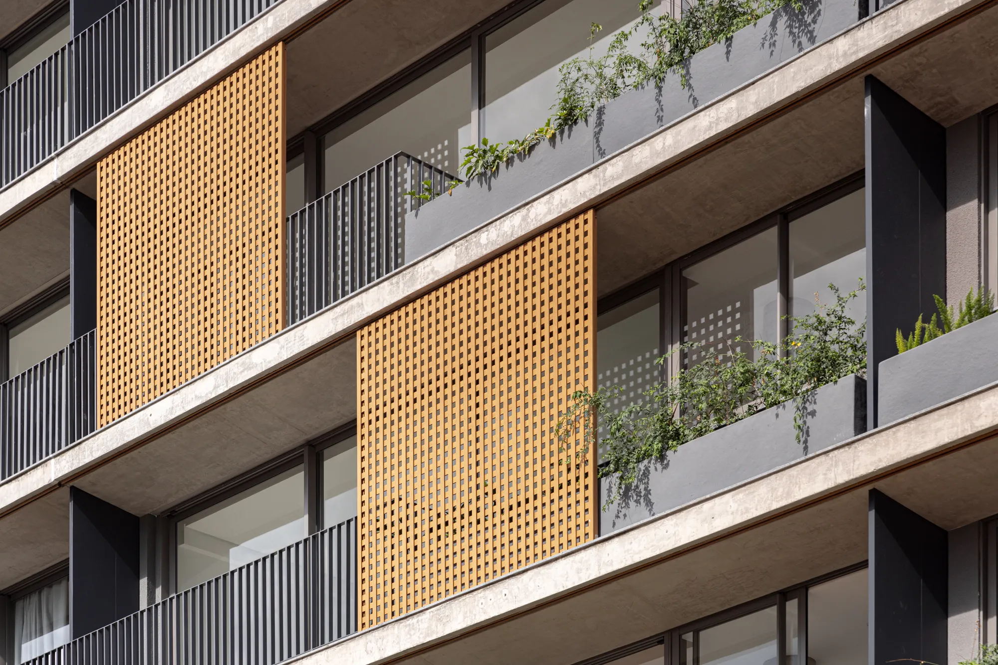 Sua volumetria segue o gabarito das edificações vizinhas, e se destaca pela materialidade leve e tropical: painéis de madeira que funcionam como brieses móveis e revestimentos naturais trazem textura, sombra e ventilação — traduzindo os ideais modernos em soluções contemporâneas.