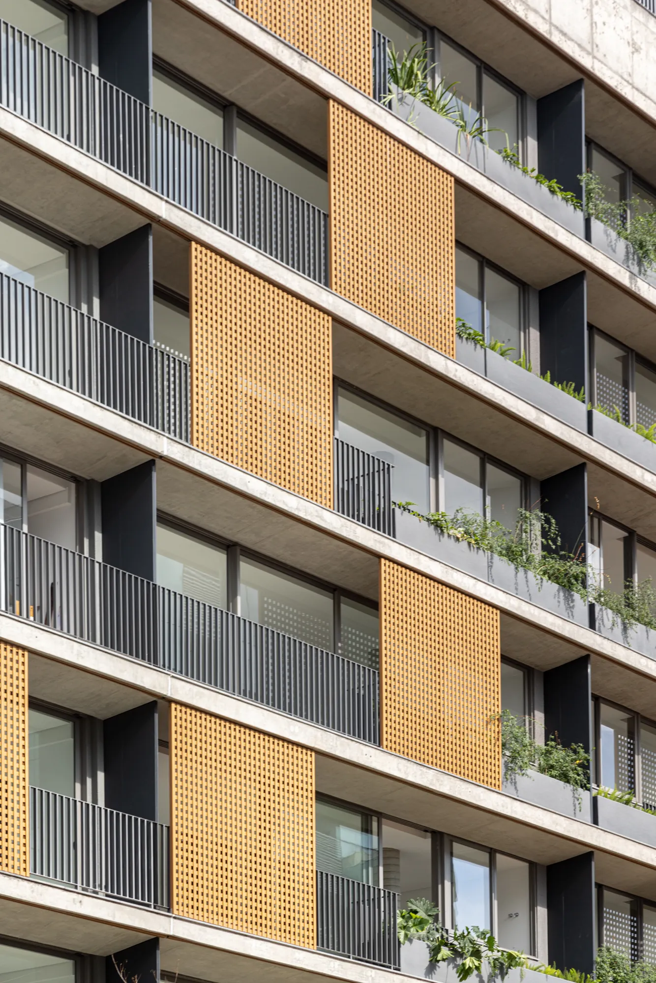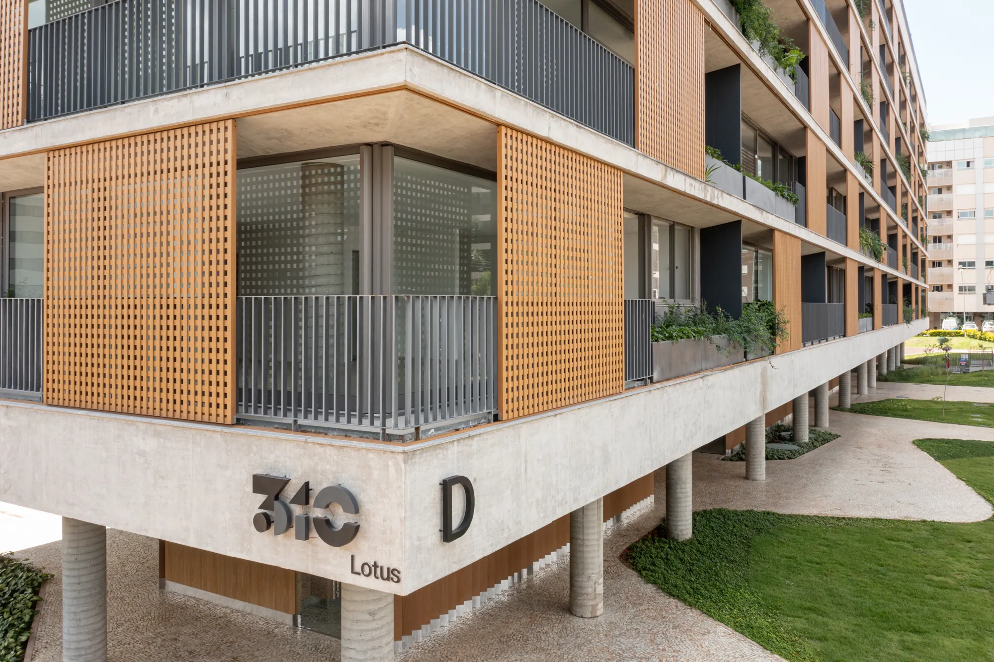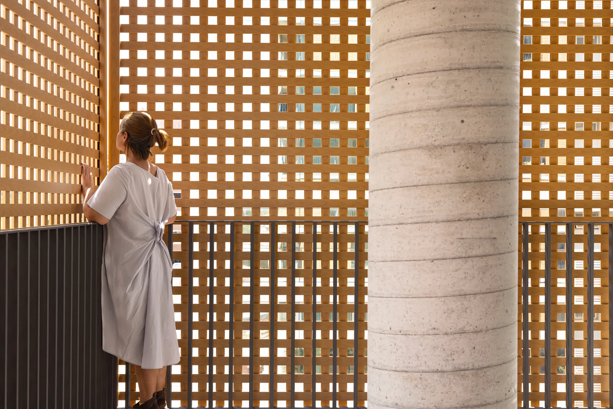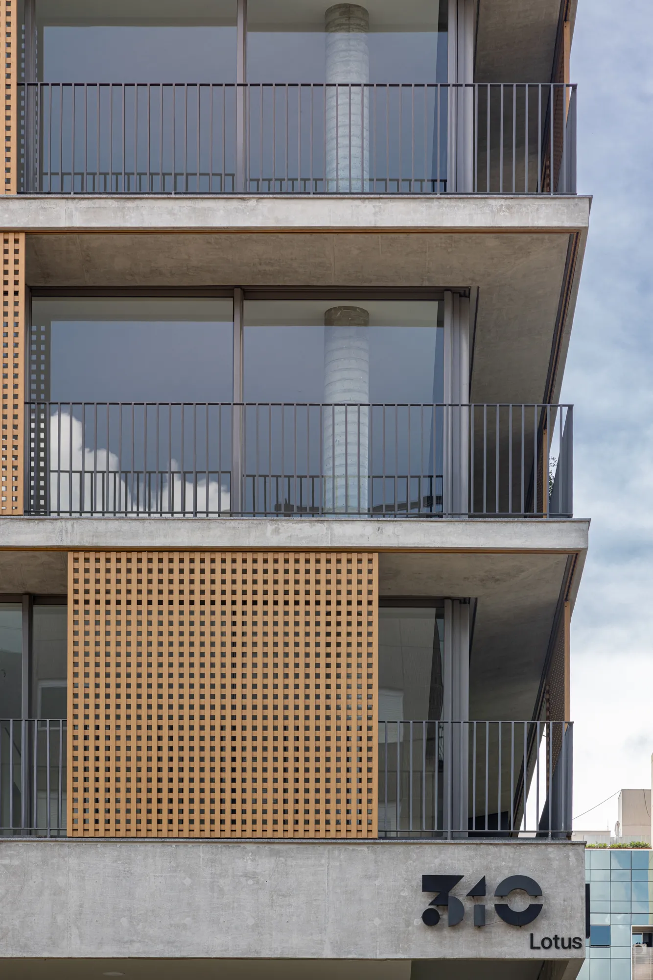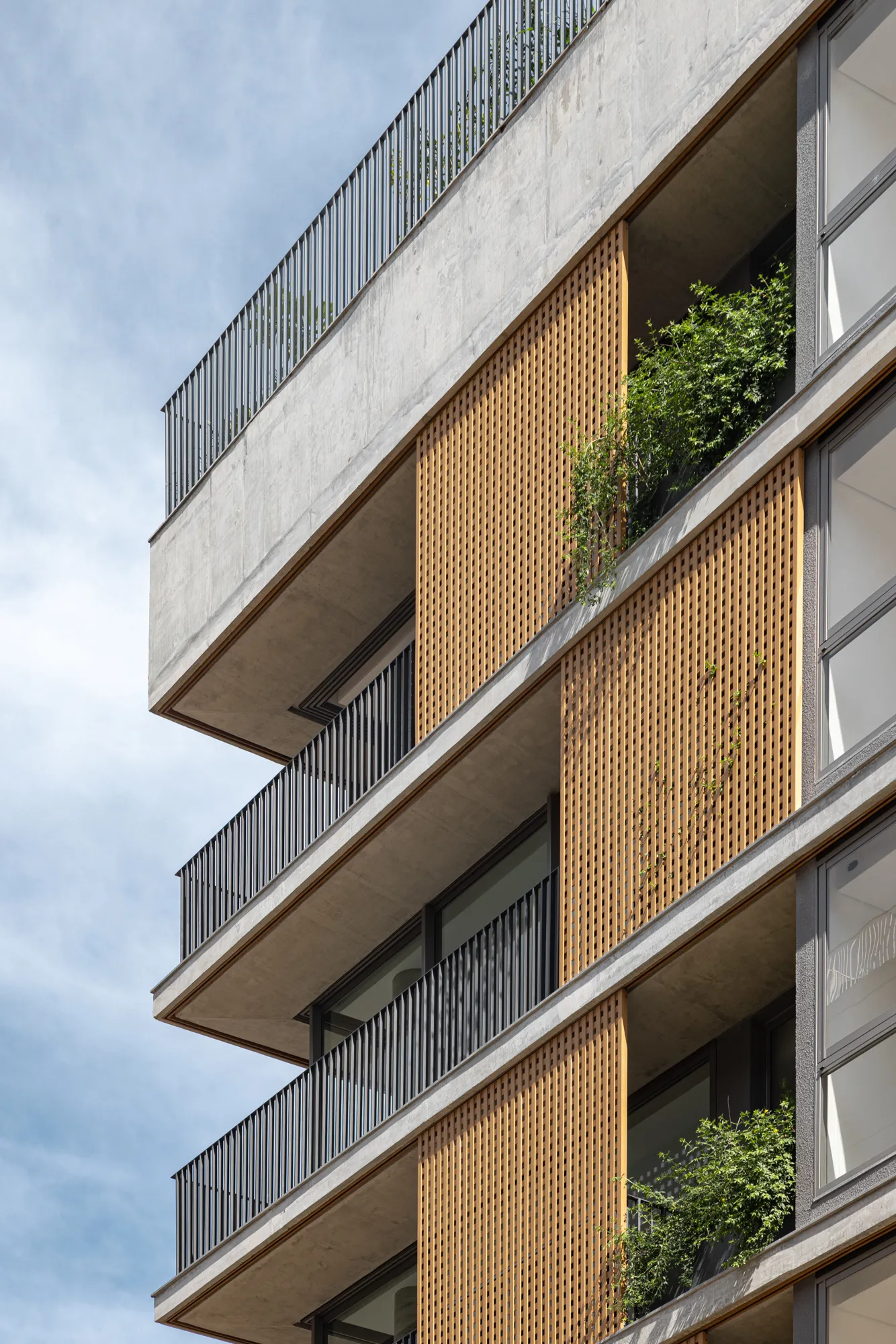 Sua volumetria segue o gabarito das edificações vizinhas, e se destaca pela materialidade leve e tropical: painéis de madeira que funcionam como brieses móveis e revestimentos naturais trazem textura, sombra e ventilação — traduzindo os ideais modernos em soluções contemporâneas.
