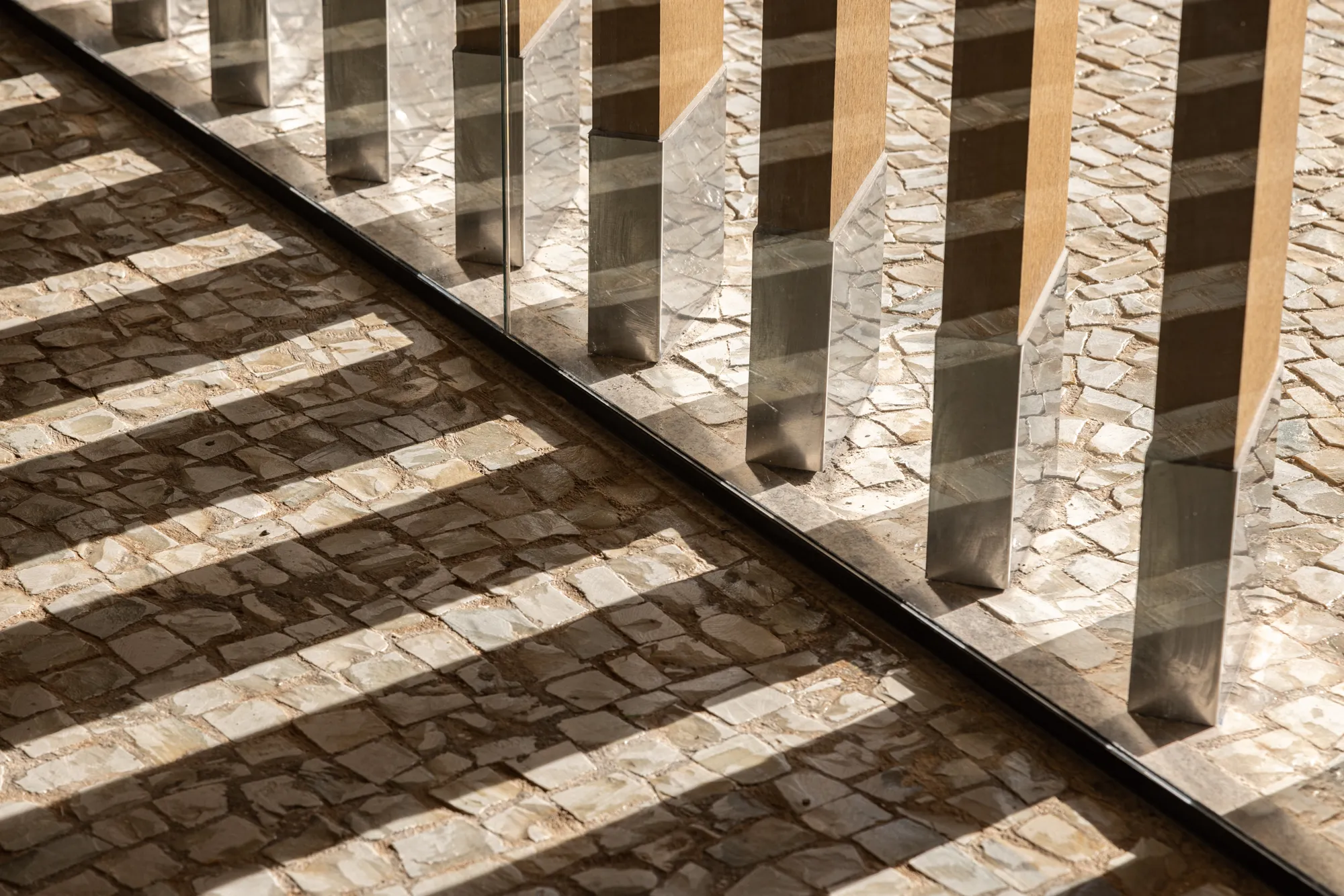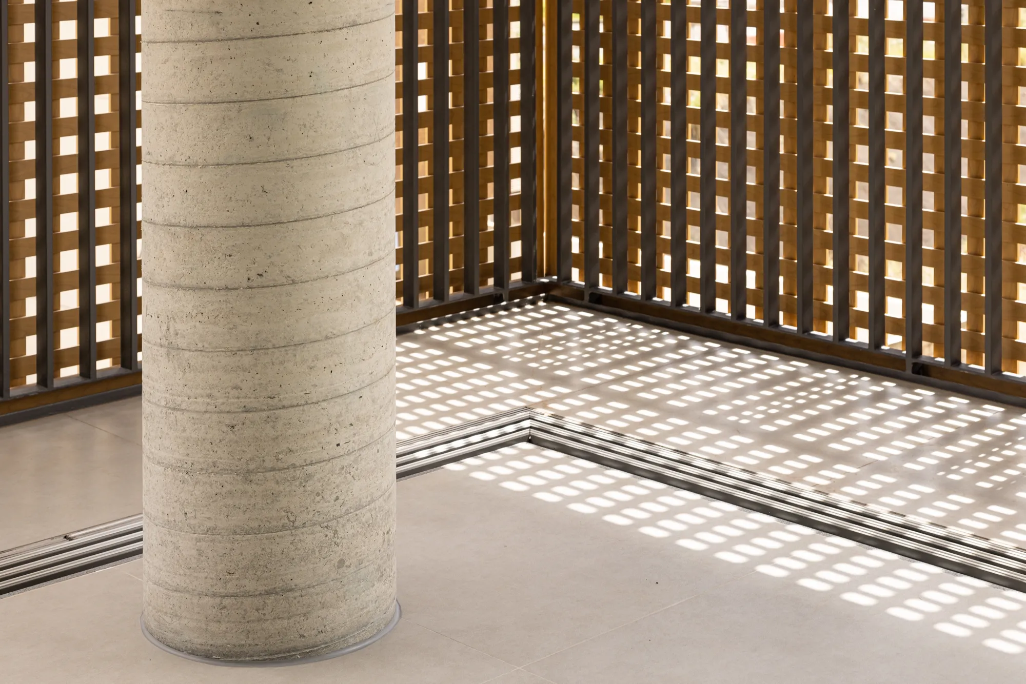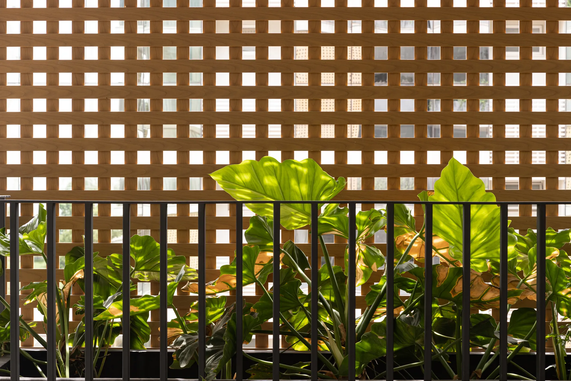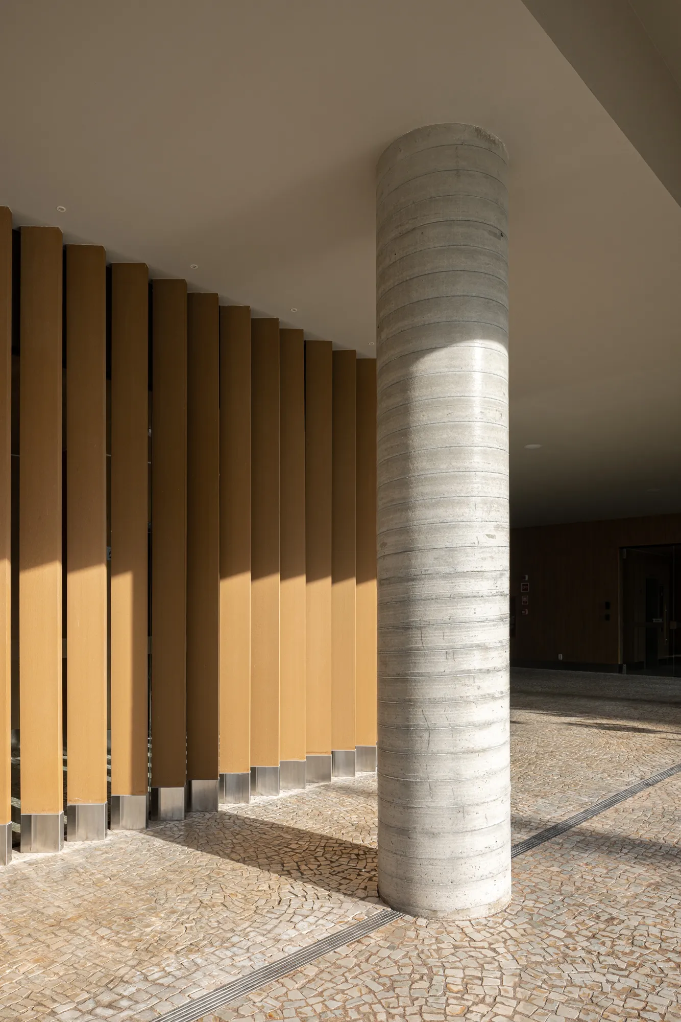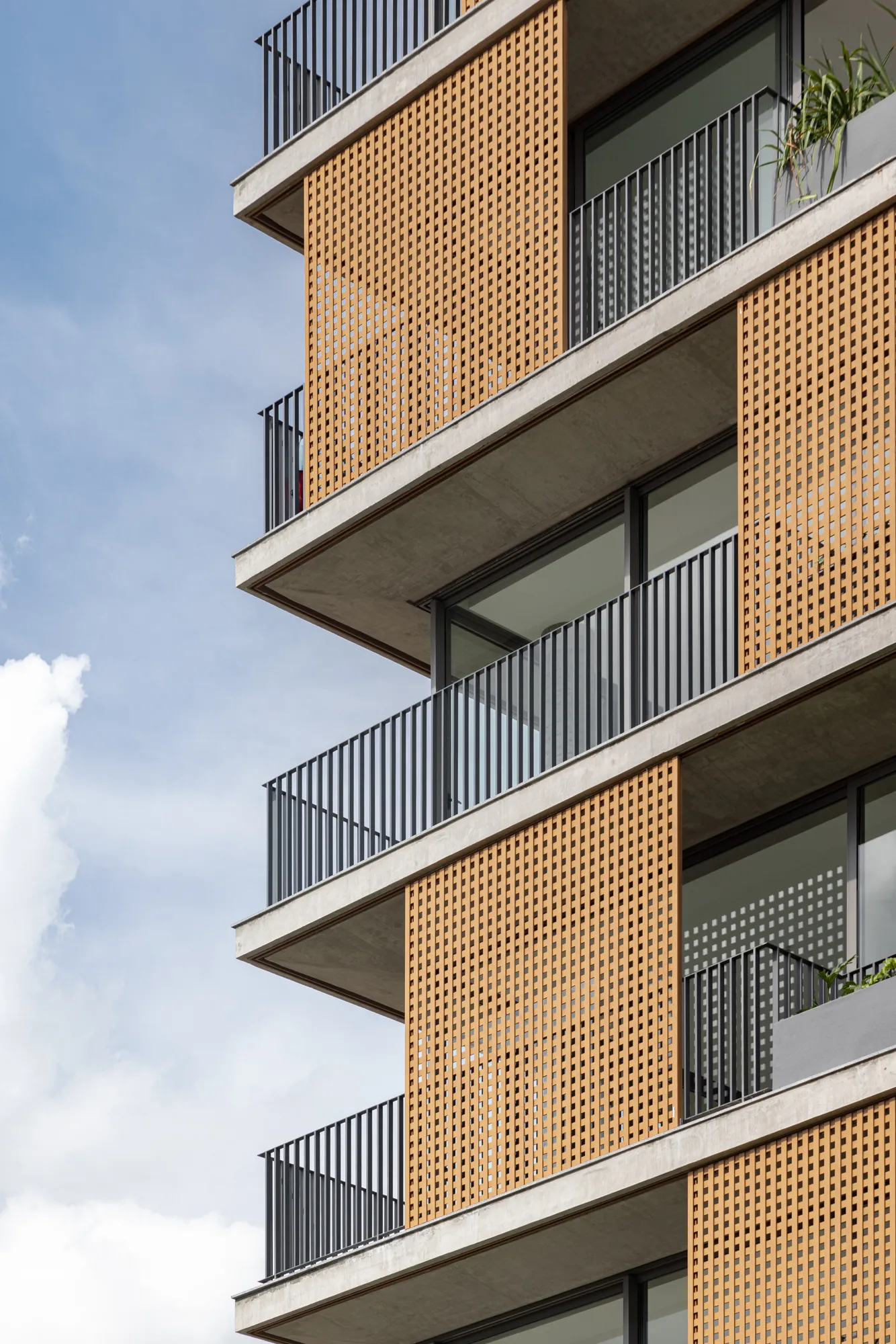 Sua volumetria segue o gabarito das edificações vizinhas, e se destaca pela materialidade leve e tropical: painéis de madeira que funcionam como brieses móveis e revestimentos naturais trazem textura, sombra e ventilação — traduzindo os ideais modernos em soluções contemporâneas.
