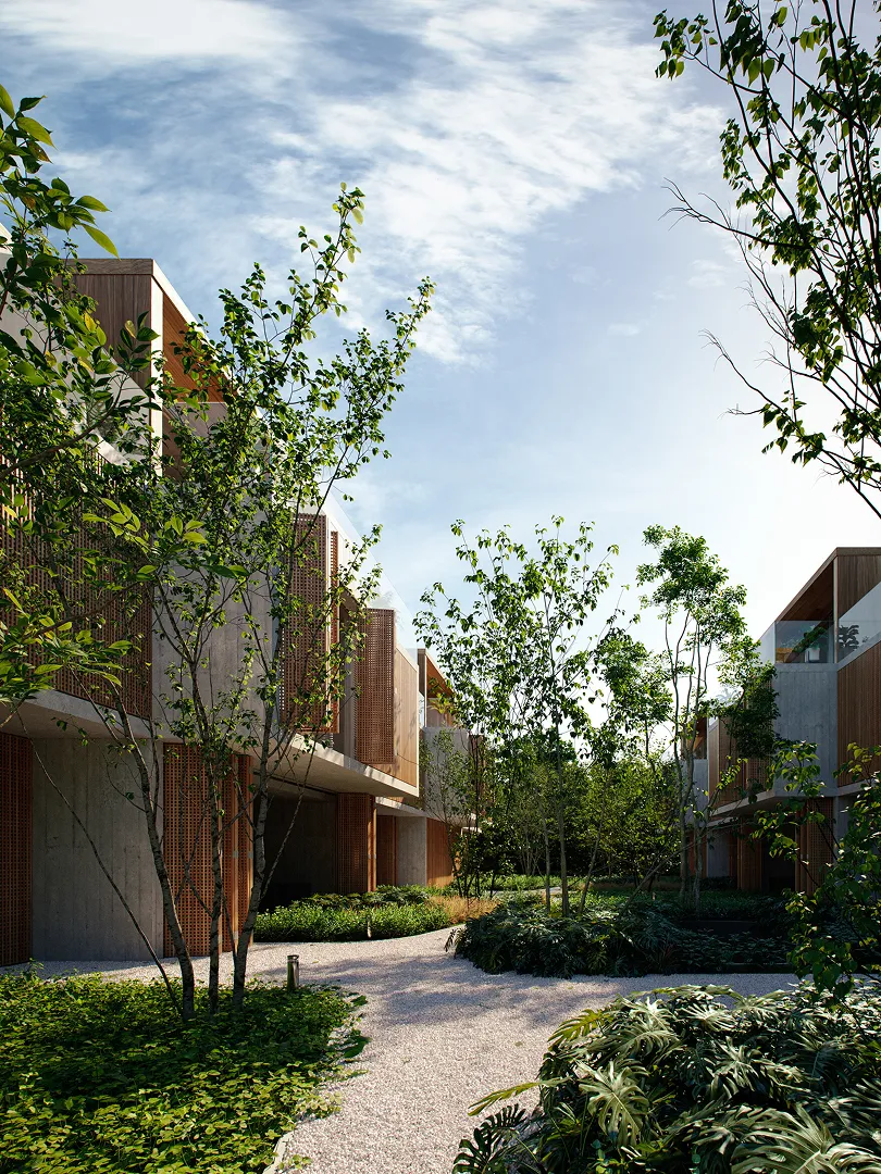 As áreas comuns, generosas em vegetação nativa, dão continuidade à tradição tropicalista do MiMo, com caminhos sinuosos, pisos drenantes e espaços de convívio que valorizam o ar livre.