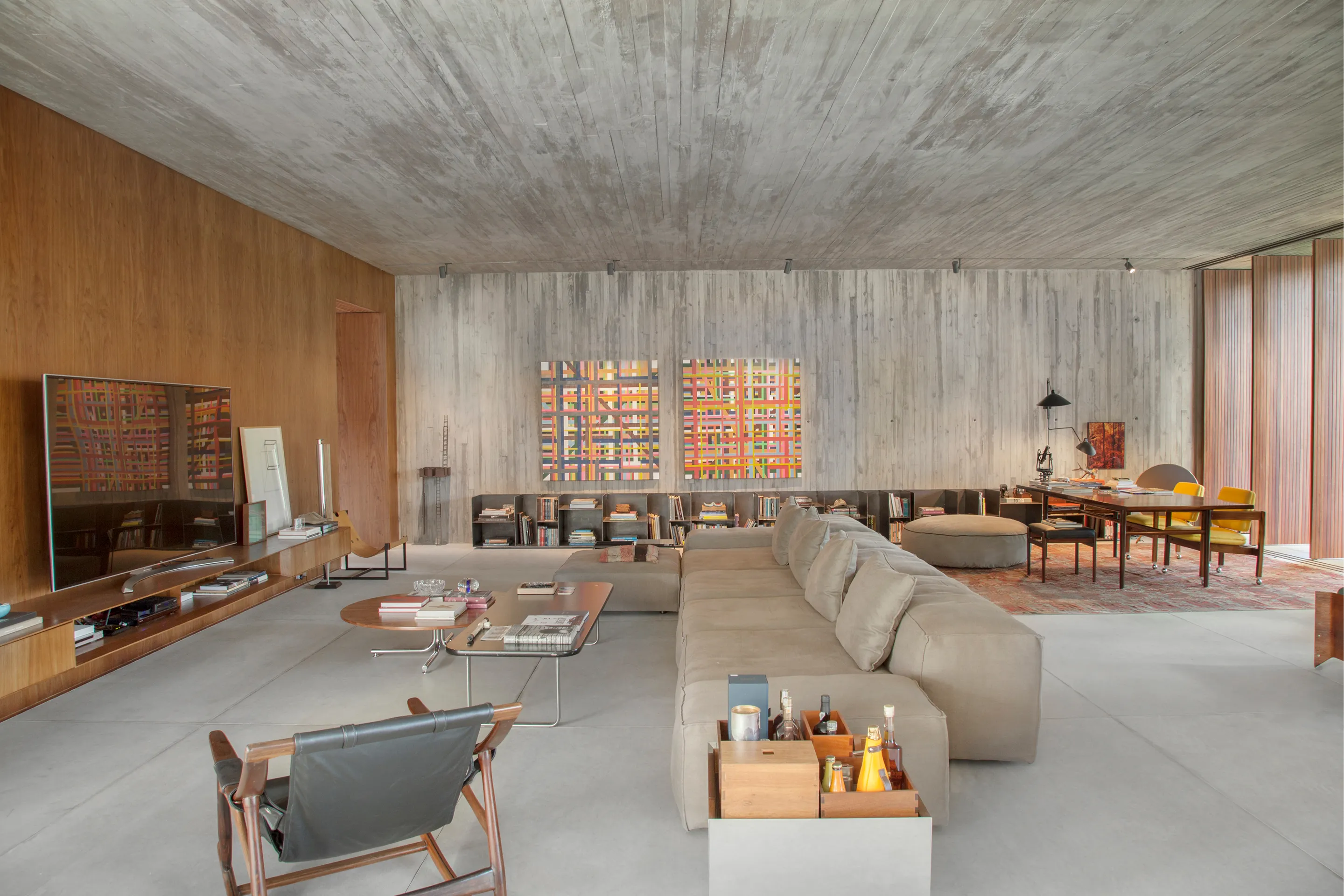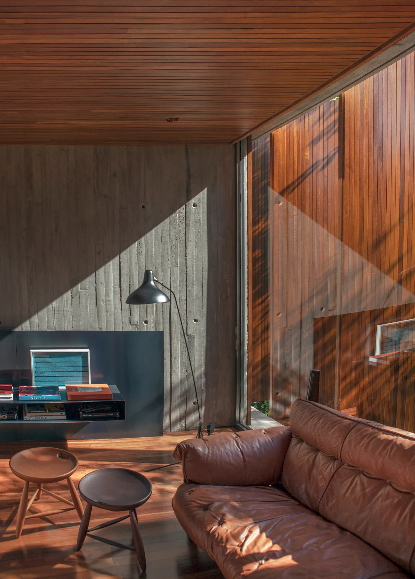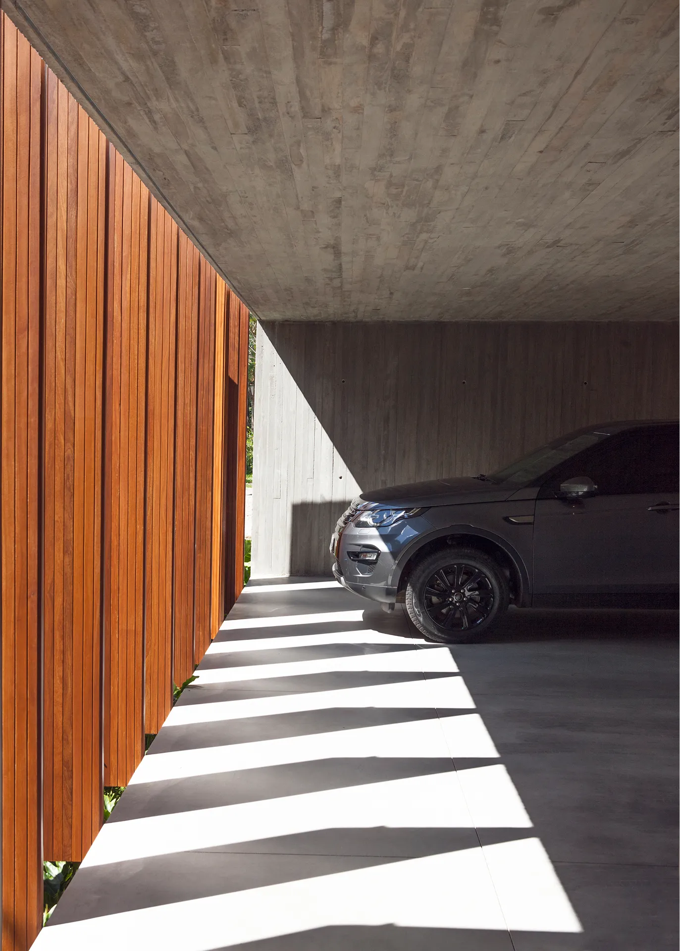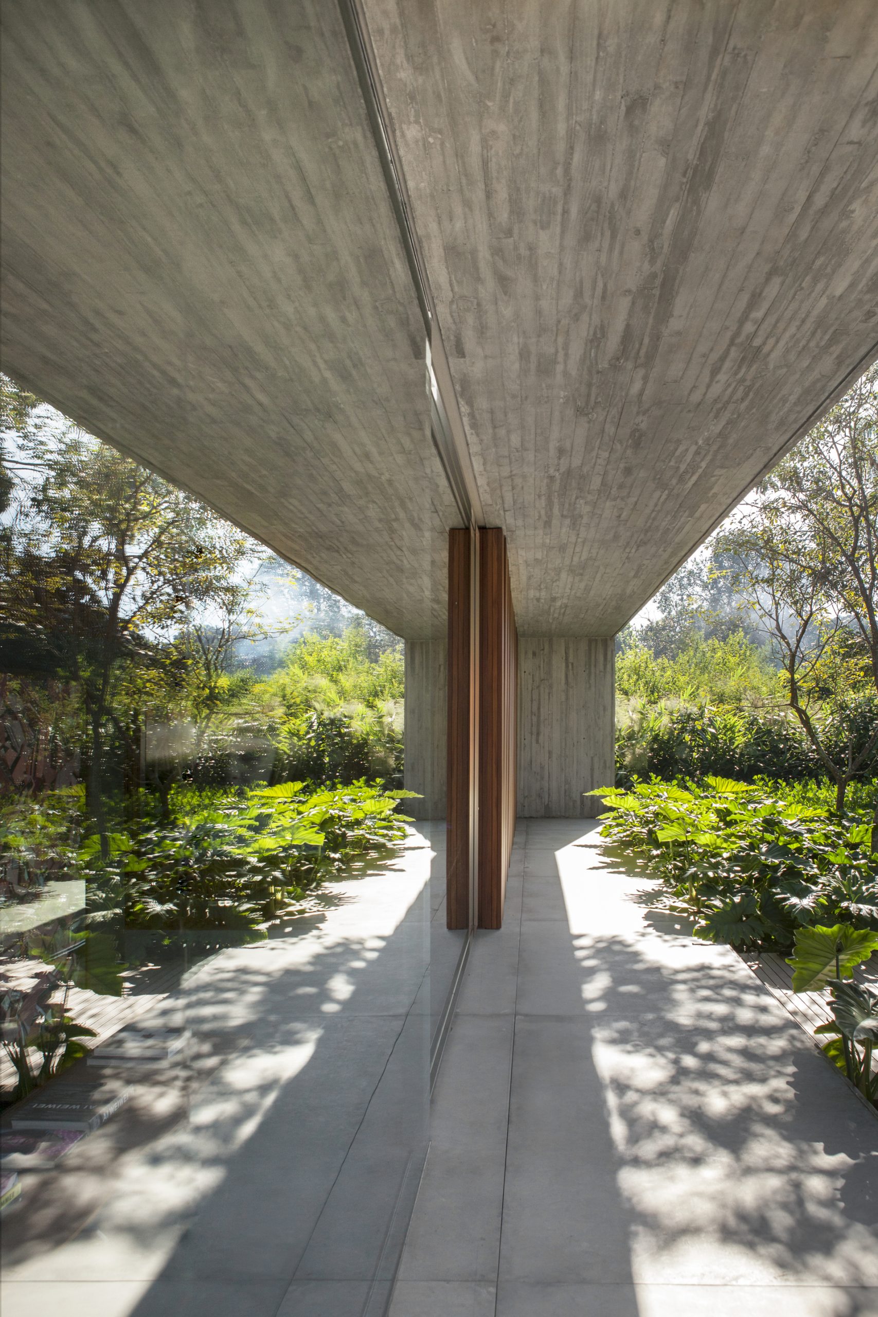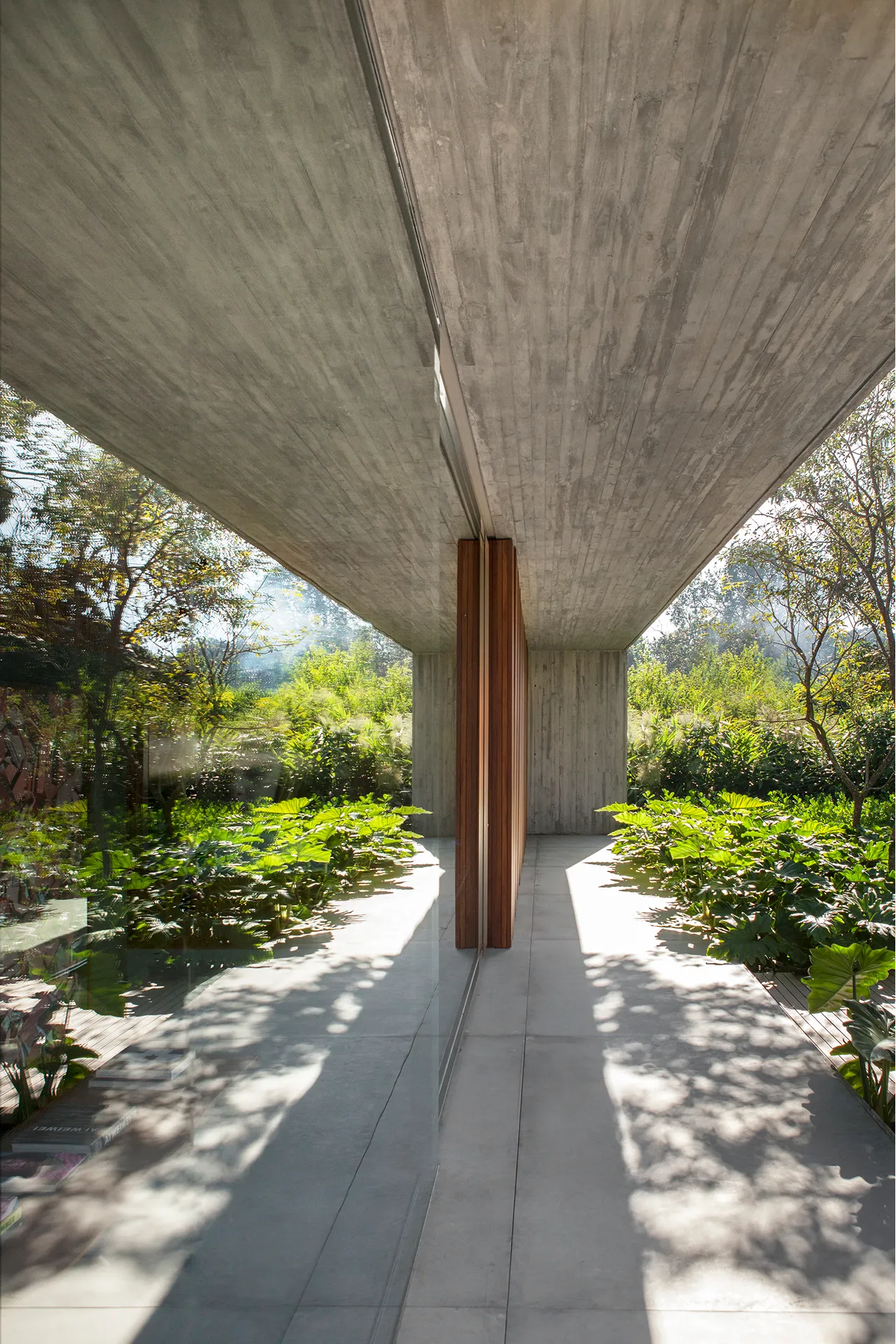 O entrelaçamento dos volumes ocorre através do encaixe dos blocos, laje com laje, deixando apenas o bloco central, destinado aos espaços sociais, aberto e integrado aos jardins. Ademais, a escolha do concreto aparente, que confere peso e estética à casa, contrasta com a leveza da laje do piso suspenso, um elemento planejado desde os primeiros esboços.