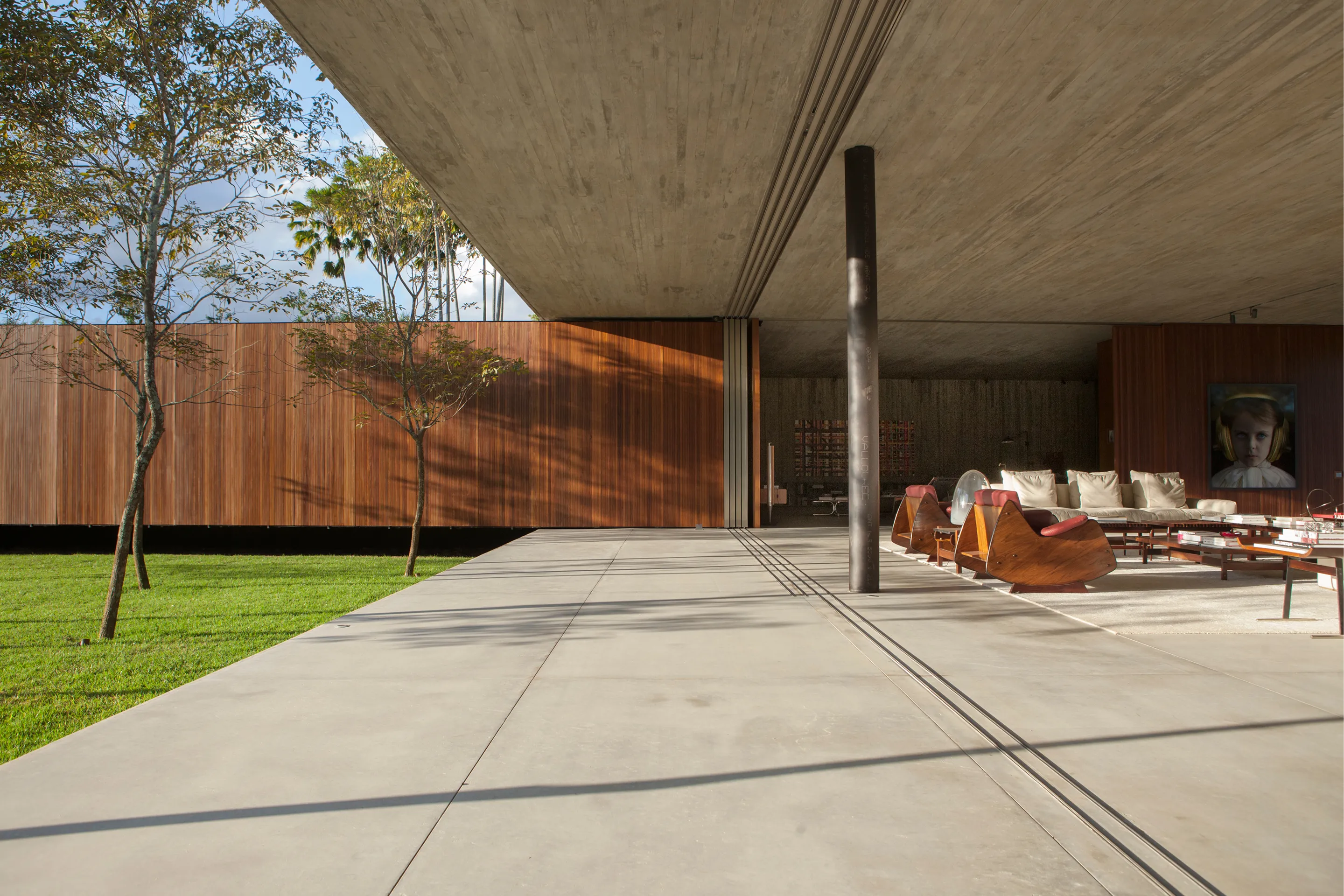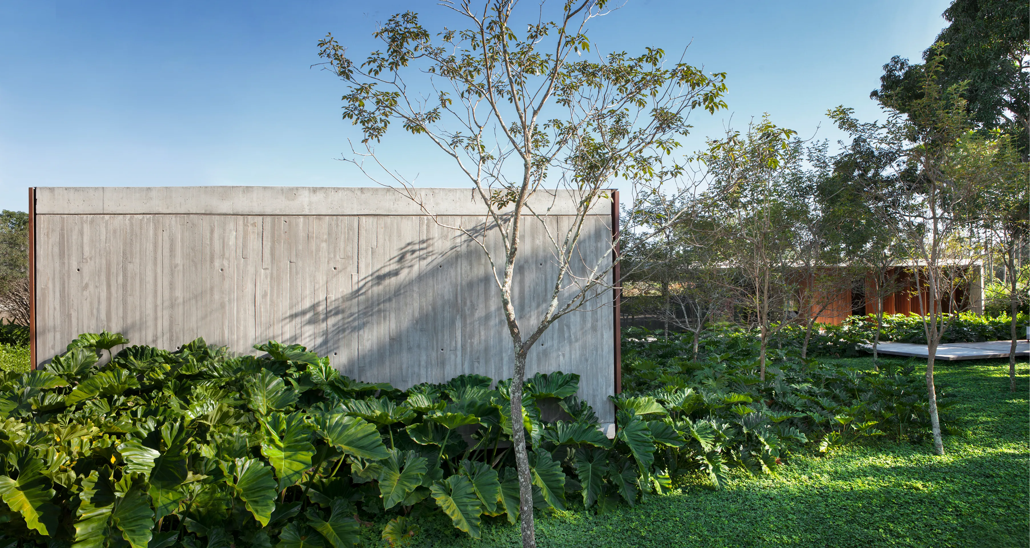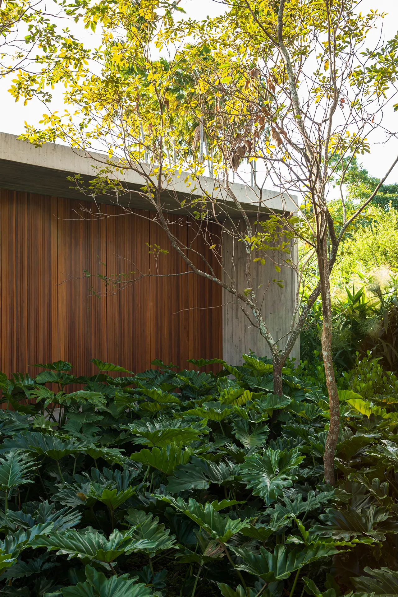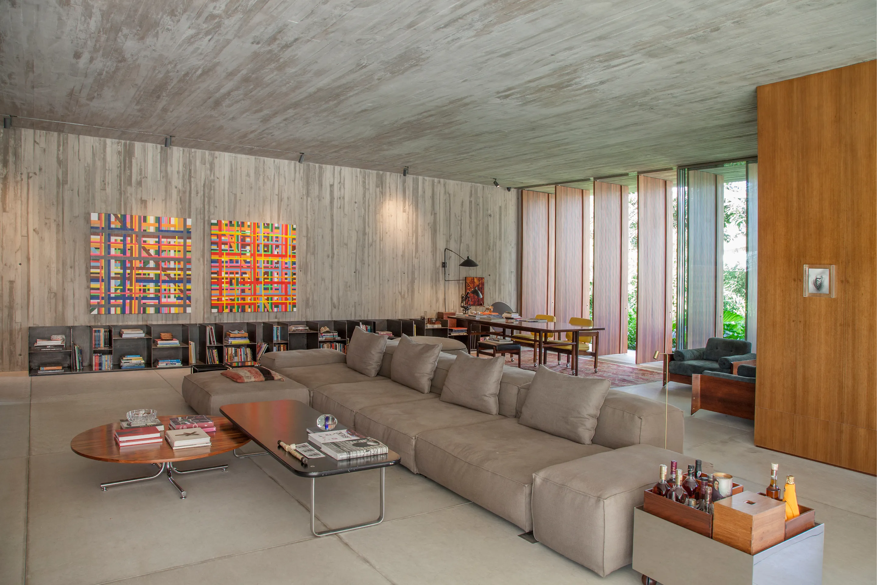 O entrelaçamento dos volumes ocorre através do encaixe dos blocos, laje com laje, deixando apenas o bloco central, destinado aos espaços sociais, aberto e integrado aos jardins. Ademais, a escolha do concreto aparente, que confere peso e estética à casa, contrasta com a leveza da laje do piso suspenso, um elemento planejado desde os primeiros esboços.