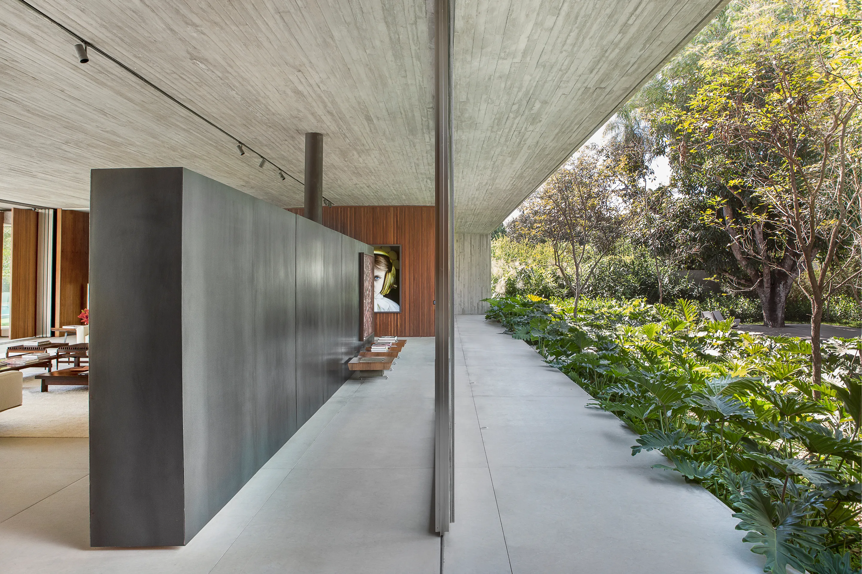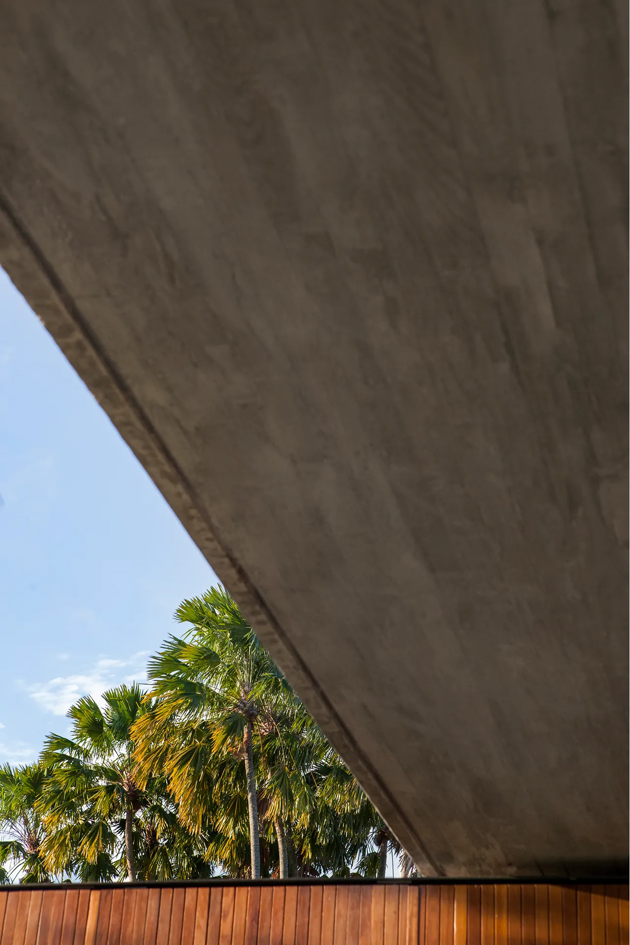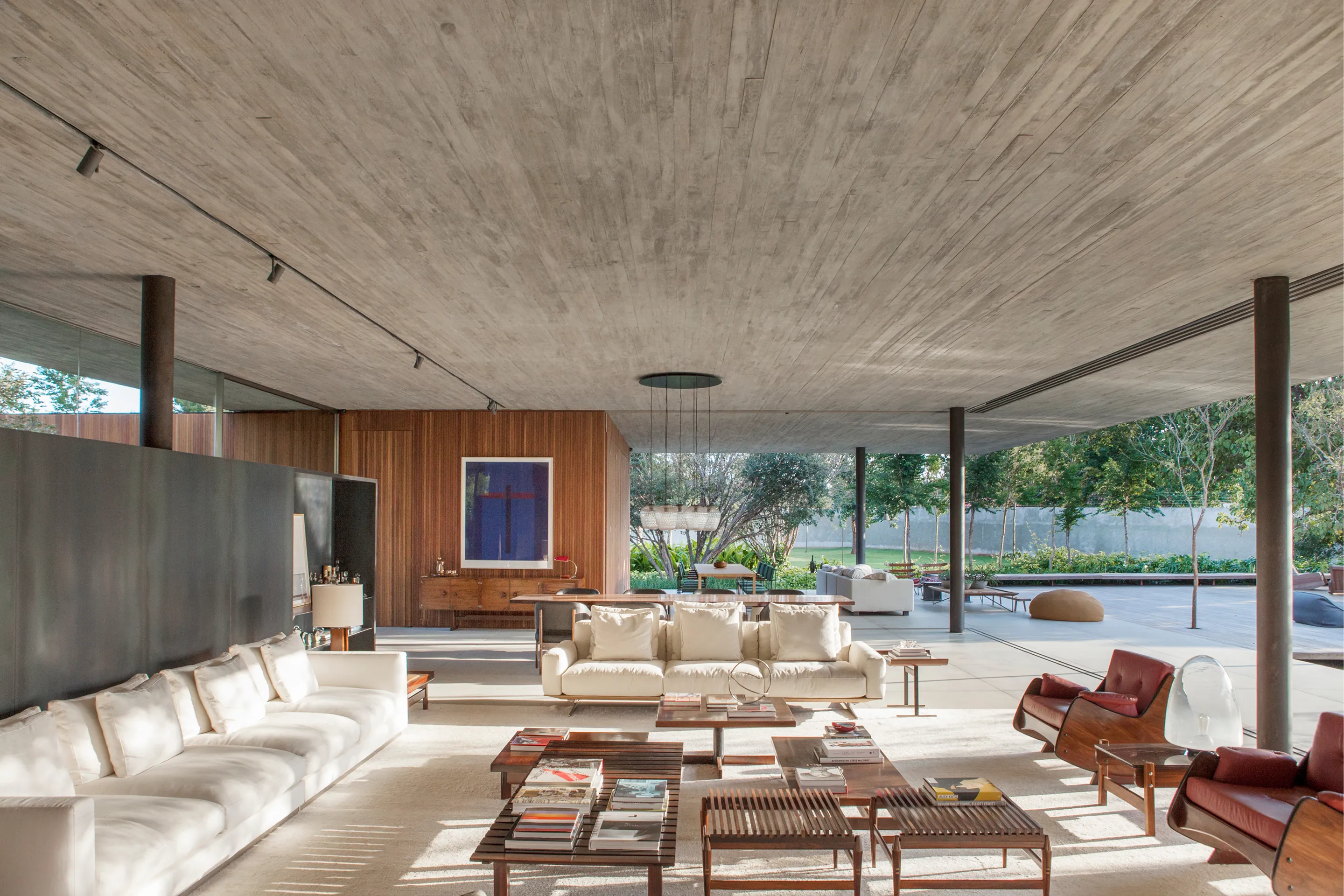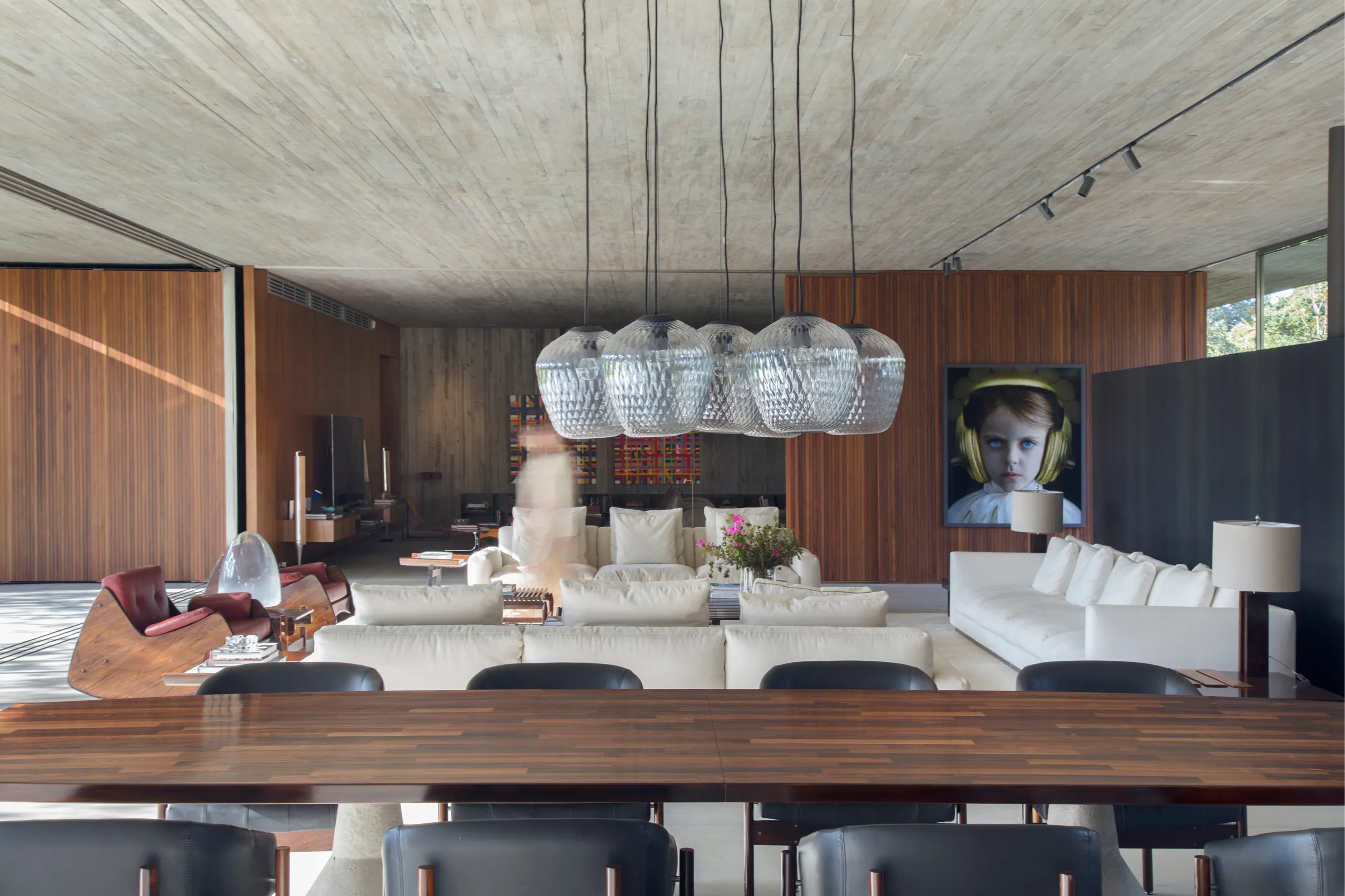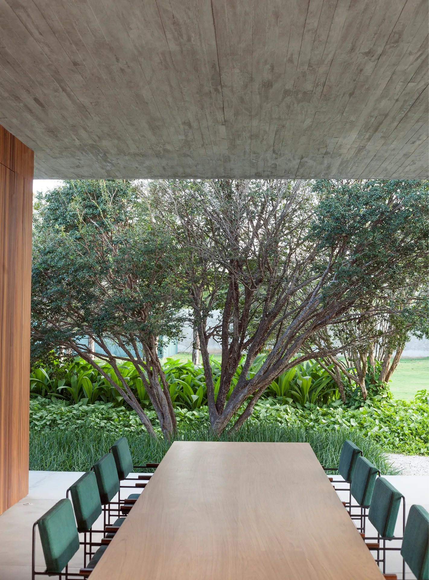 O entrelaçamento dos volumes ocorre através do encaixe dos blocos, laje com laje, deixando apenas o bloco central, destinado aos espaços sociais, aberto e integrado aos jardins. Ademais, a escolha do concreto aparente, que confere peso e estética à casa, contrasta com a leveza da laje do piso suspenso, um elemento planejado desde os primeiros esboços.