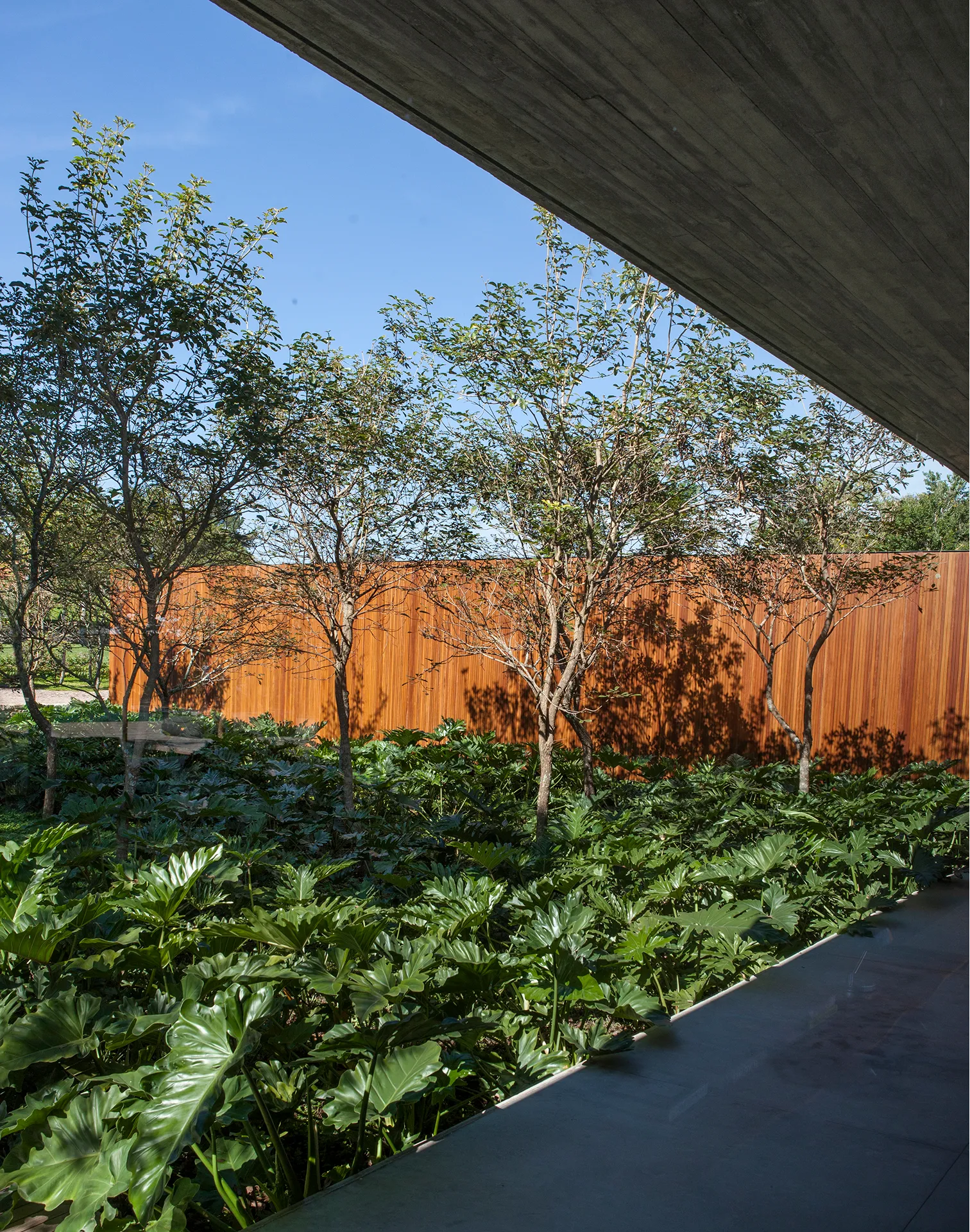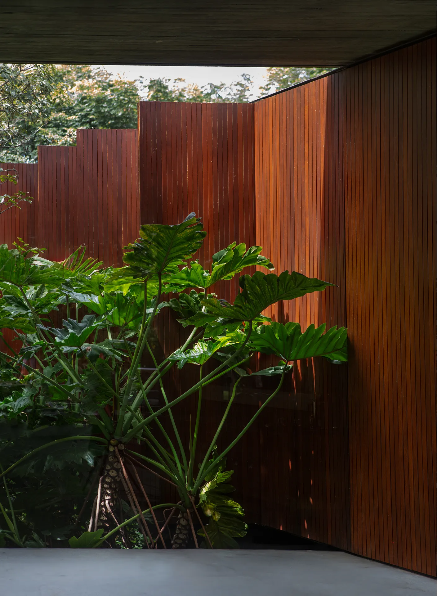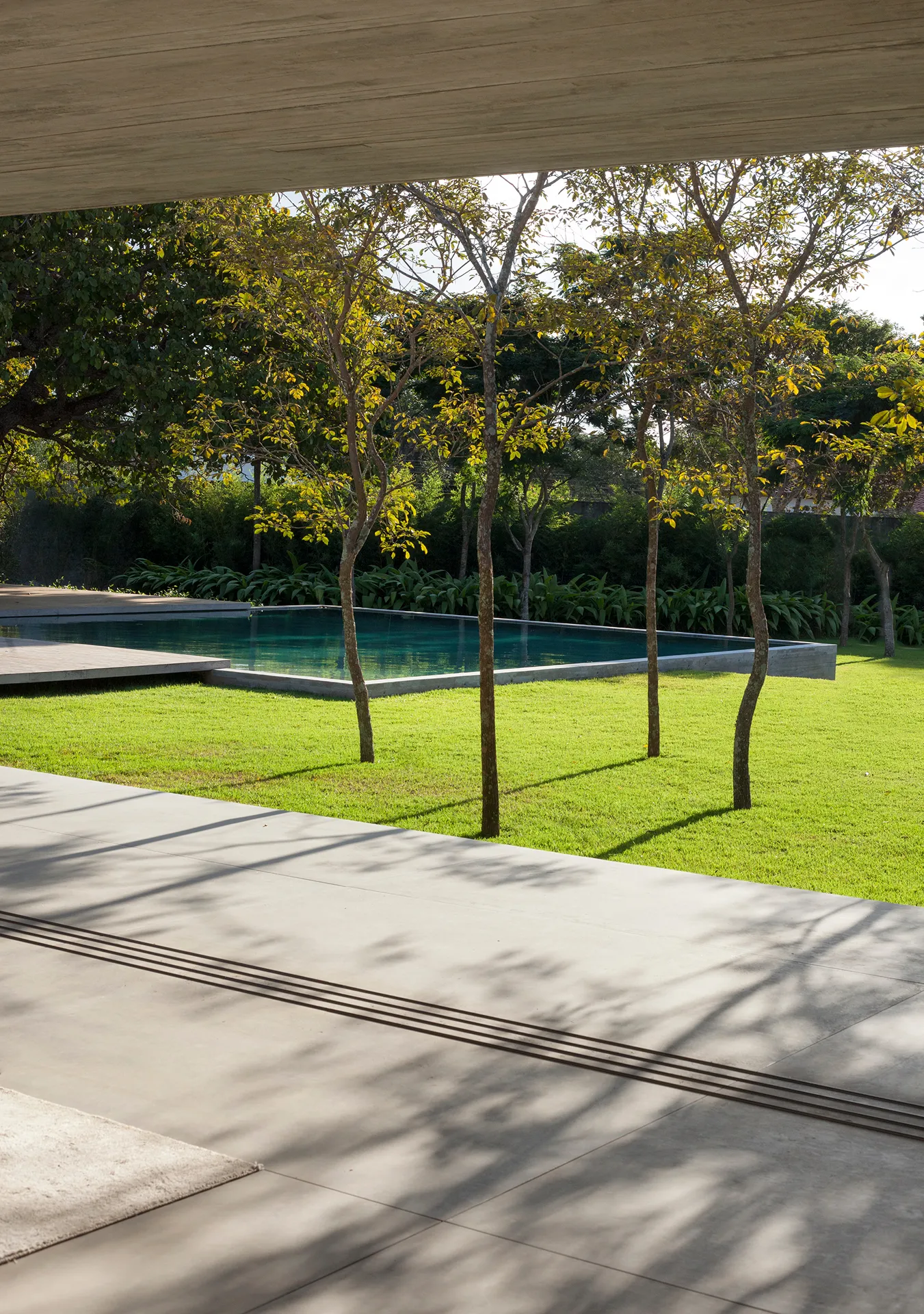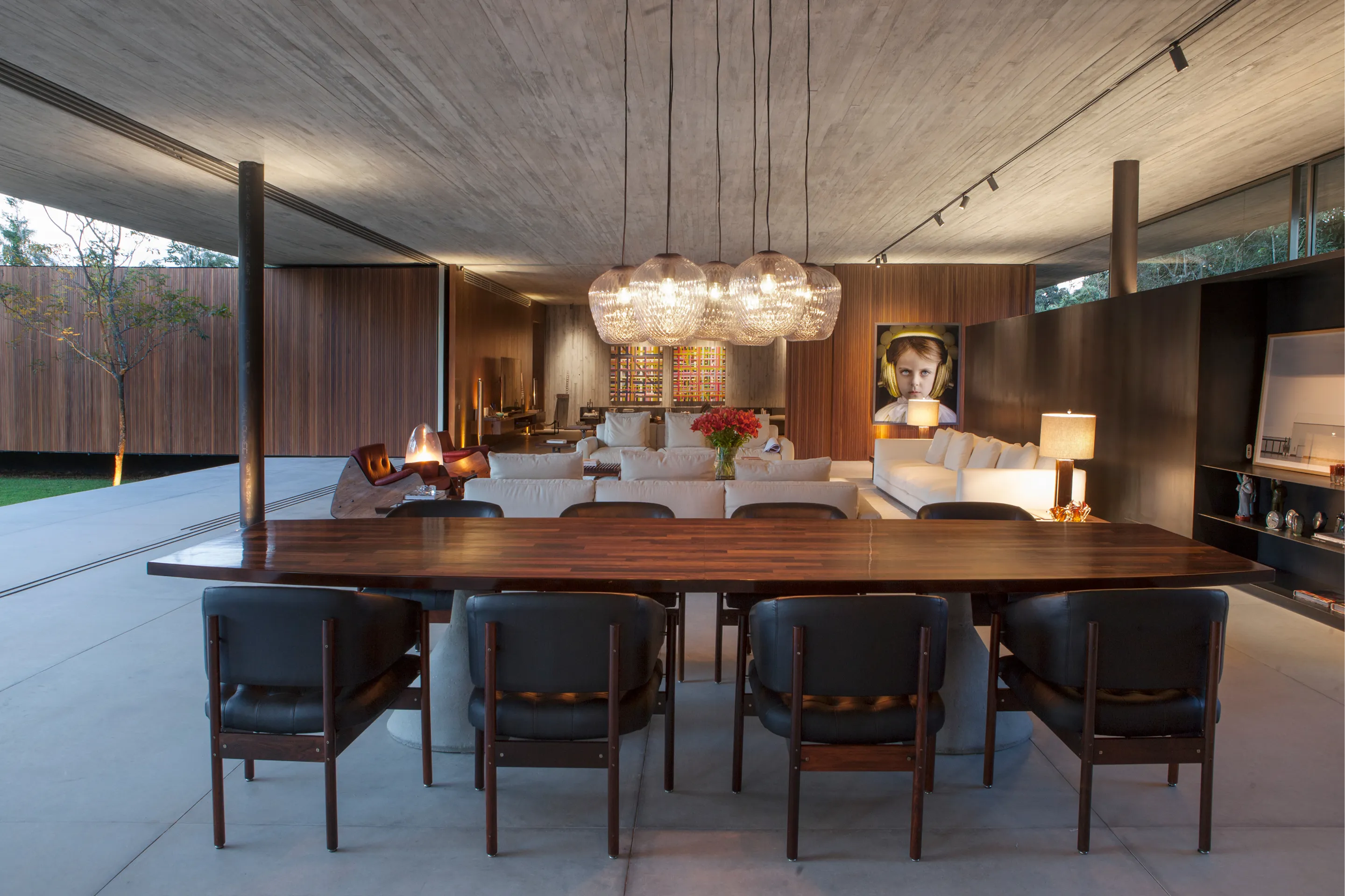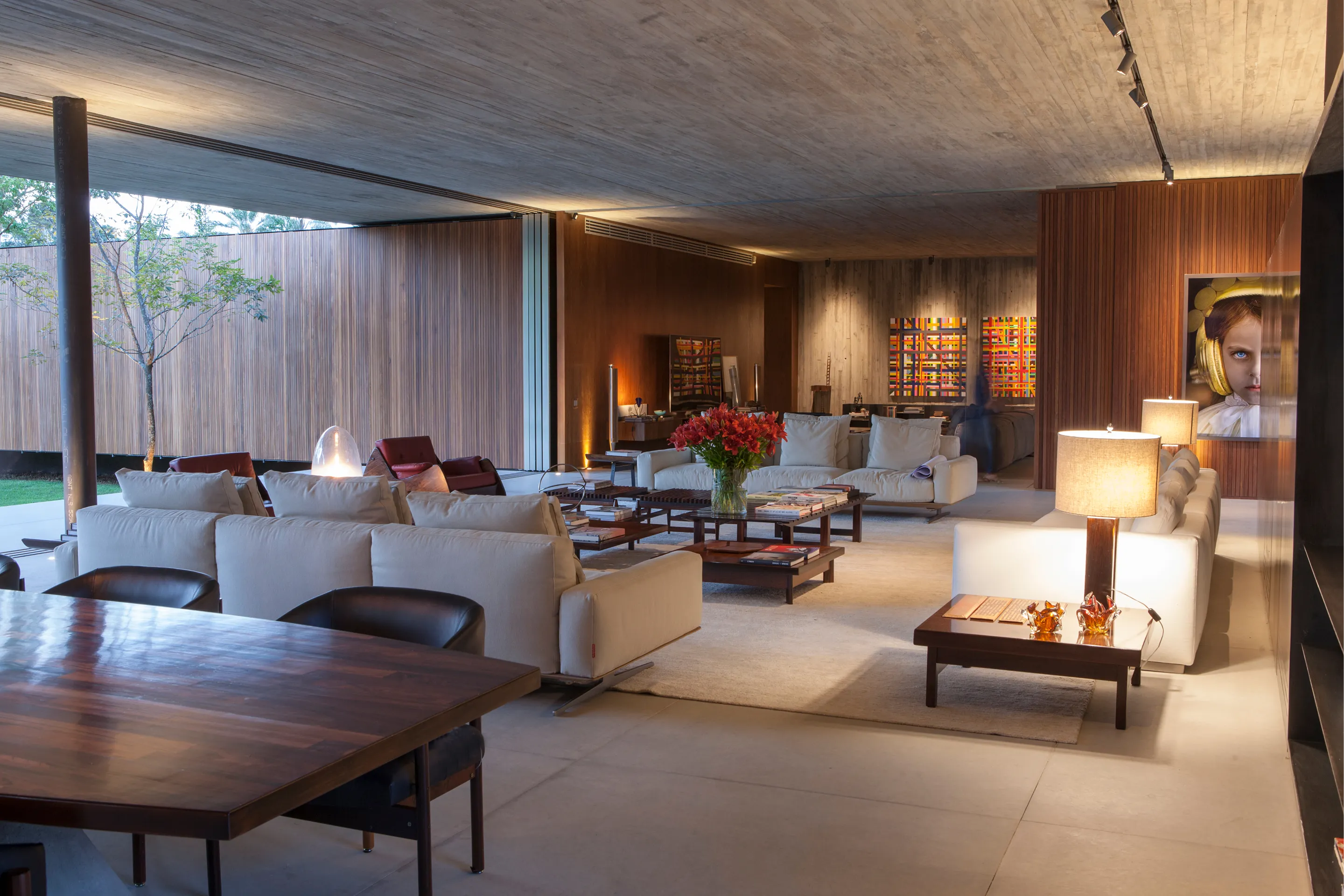 O entrelaçamento dos volumes ocorre através do encaixe dos blocos, laje com laje, deixando apenas o bloco central, destinado aos espaços sociais, aberto e integrado aos jardins. Ademais, a escolha do concreto aparente, que confere peso e estética à casa, contrasta com a leveza da laje do piso suspenso, um elemento planejado desde os primeiros esboços.