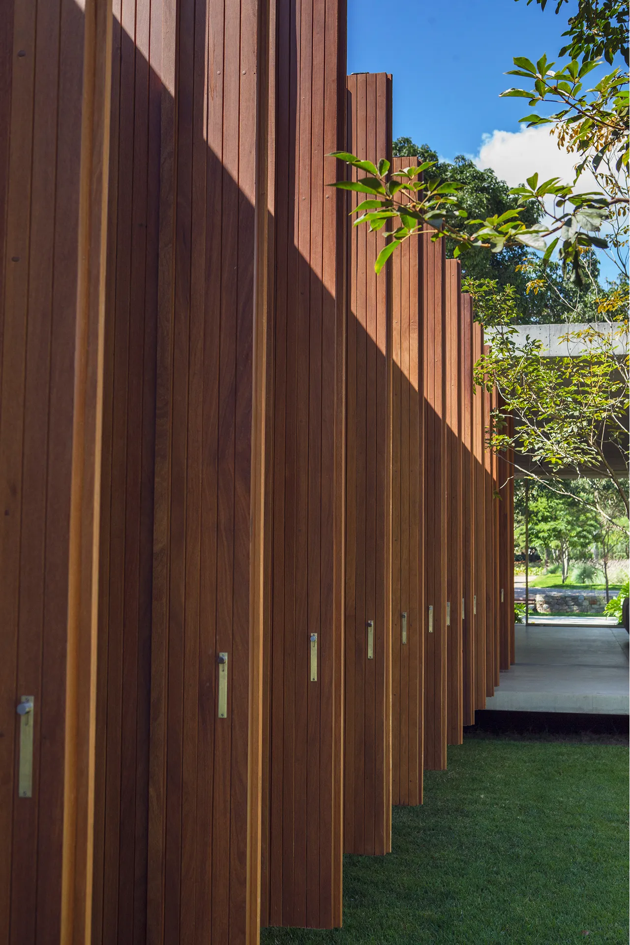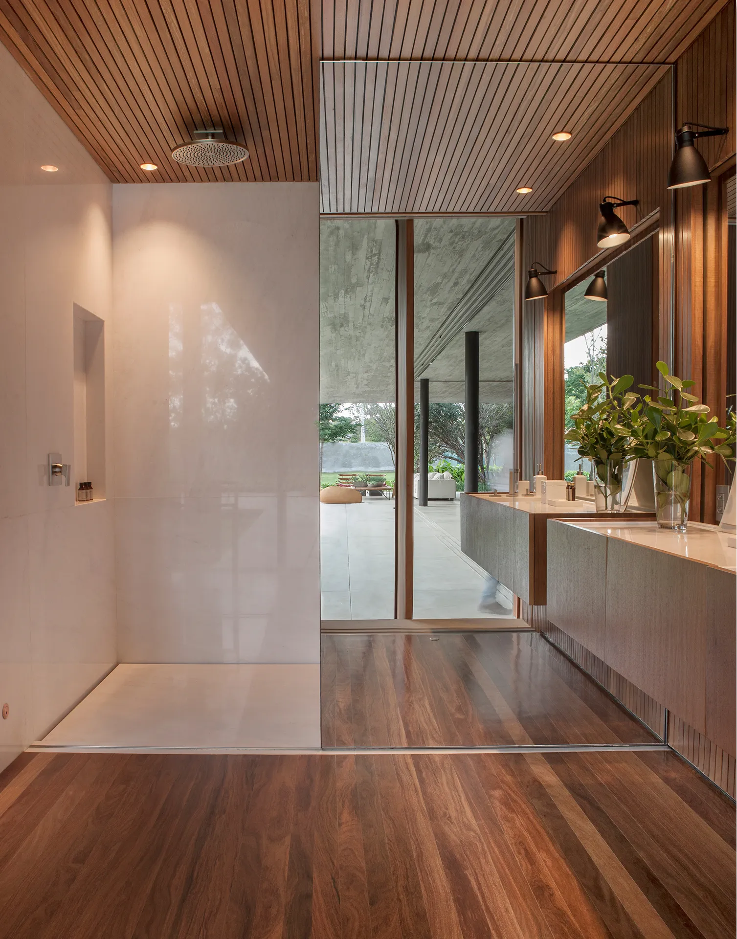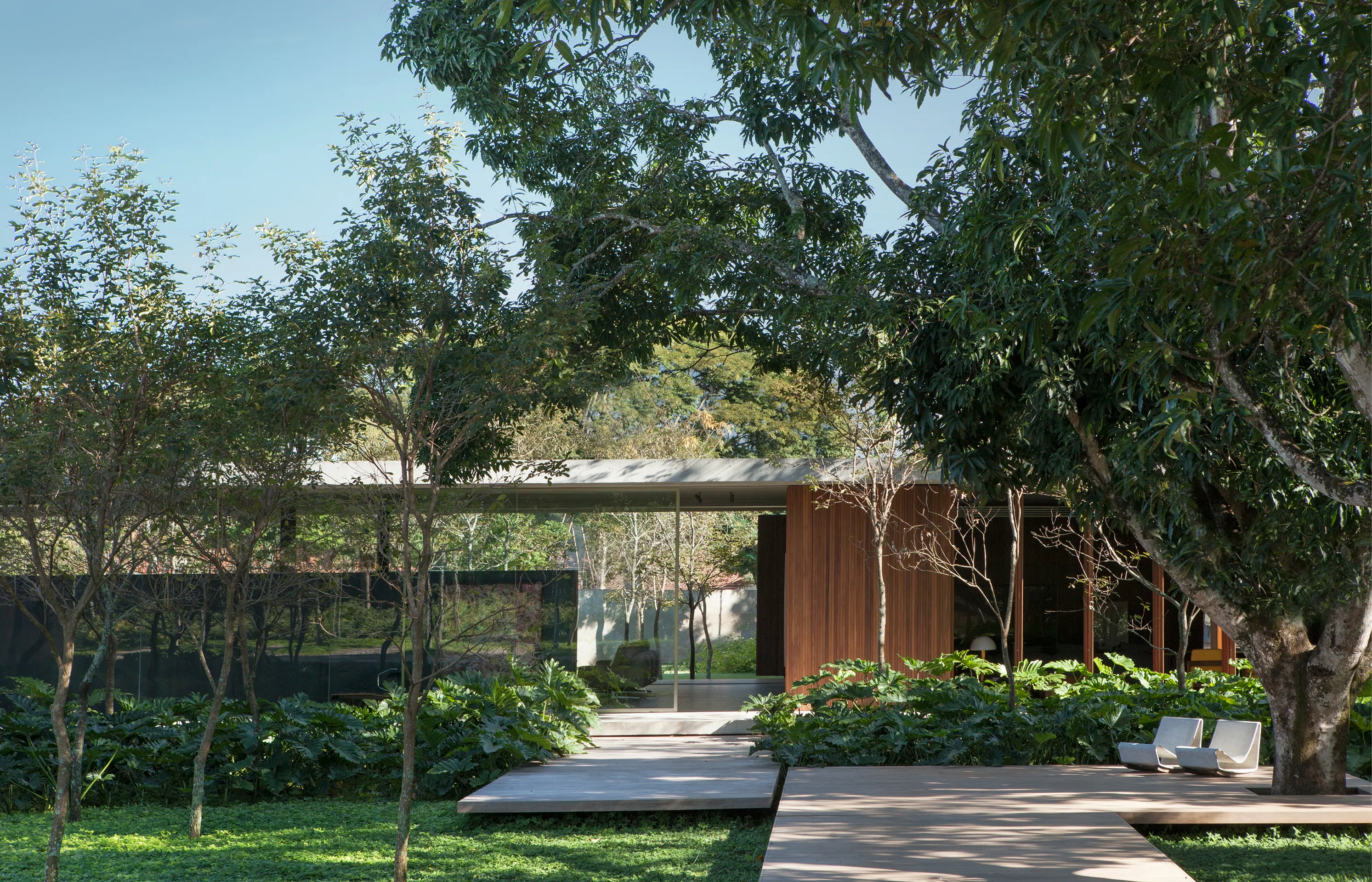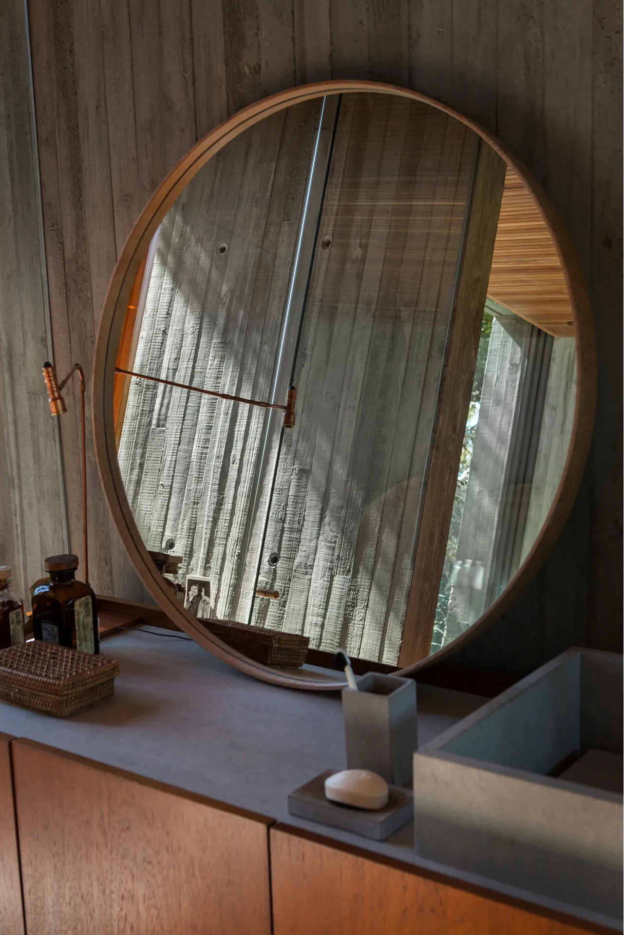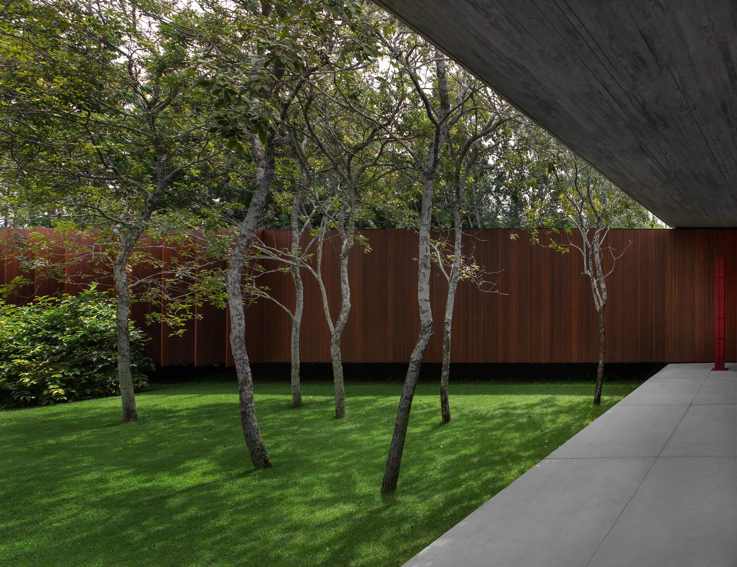 O entrelaçamento dos volumes ocorre através do encaixe dos blocos, laje com laje, deixando apenas o bloco central, destinado aos espaços sociais, aberto e integrado aos jardins. Ademais, a escolha do concreto aparente, que confere peso e estética à casa, contrasta com a leveza da laje do piso suspenso, um elemento planejado desde os primeiros esboços.