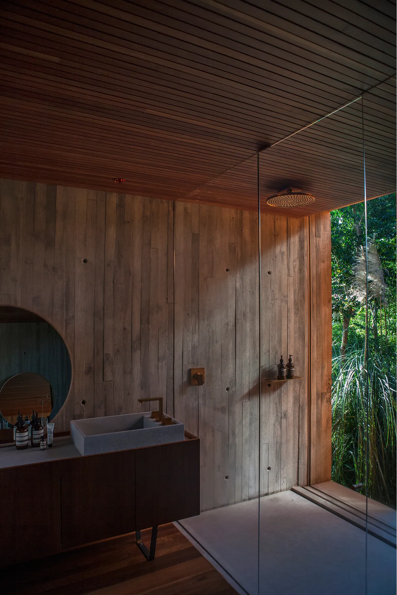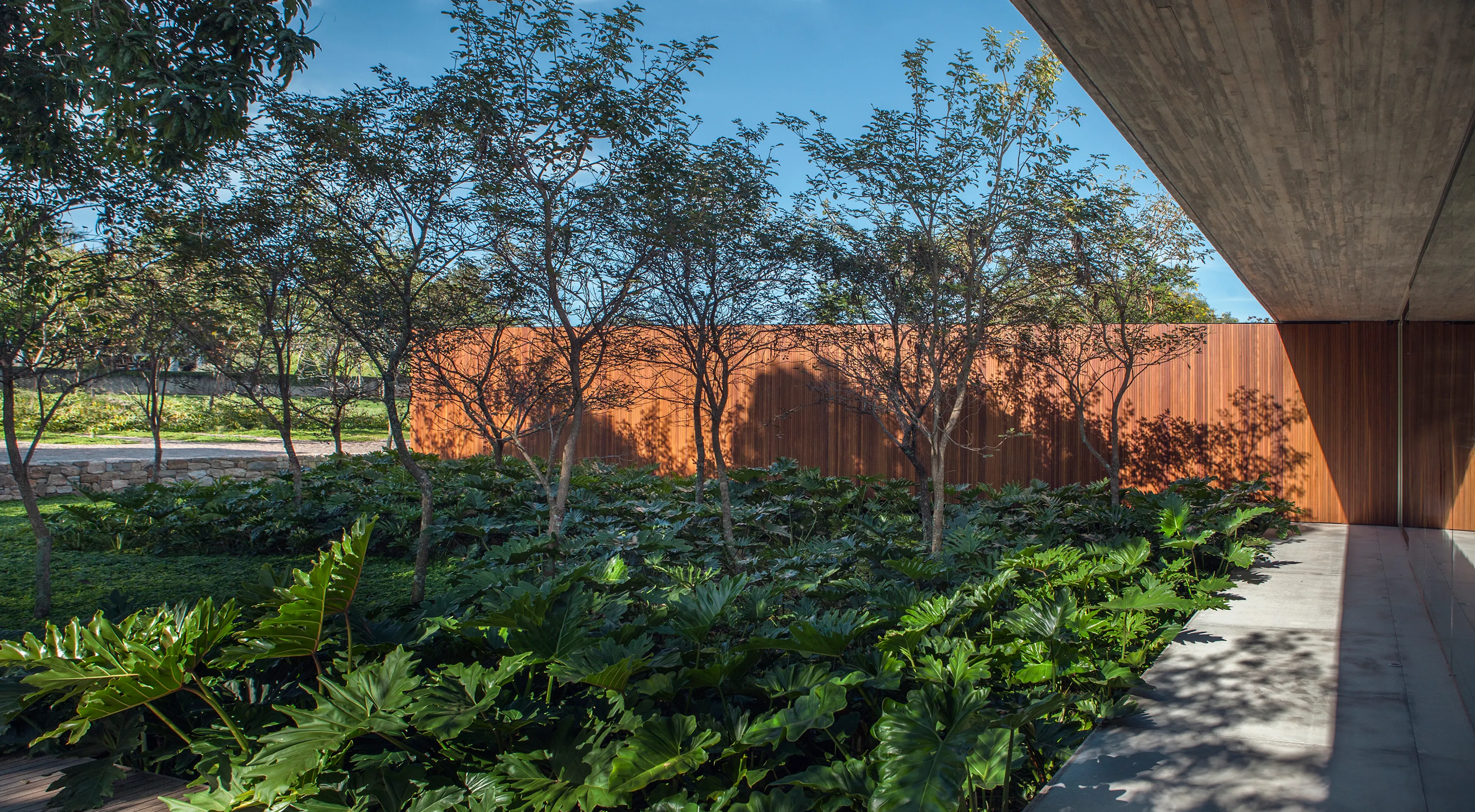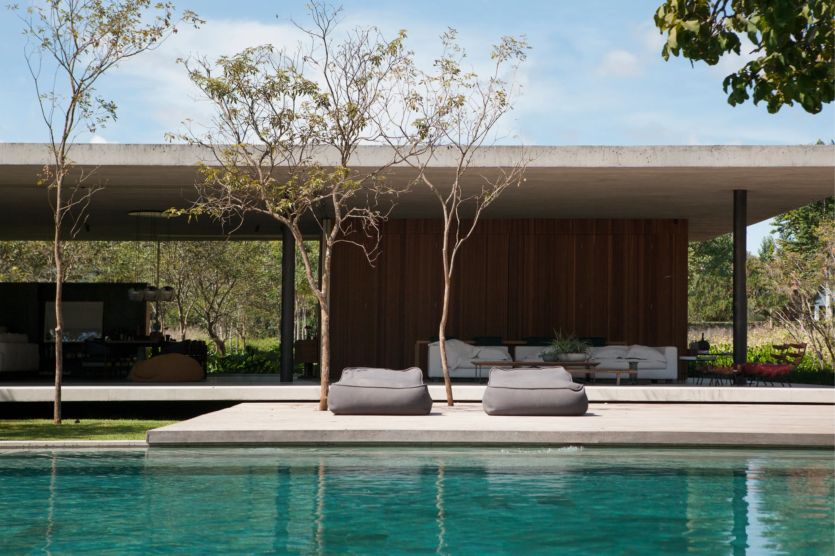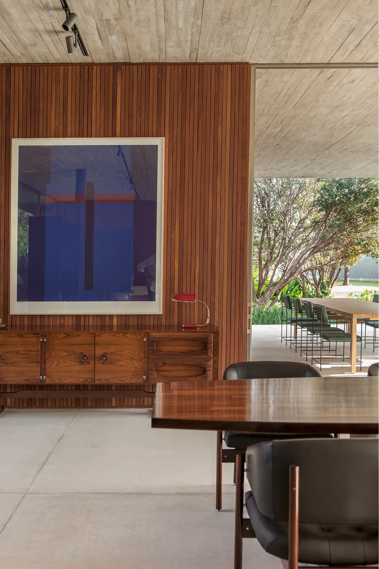 O entrelaçamento dos volumes ocorre através do encaixe dos blocos, laje com laje, deixando apenas o bloco central, destinado aos espaços sociais, aberto e integrado aos jardins. Ademais, a escolha do concreto aparente, que confere peso e estética à casa, contrasta com a leveza da laje do piso suspenso, um elemento planejado desde os primeiros esboços.